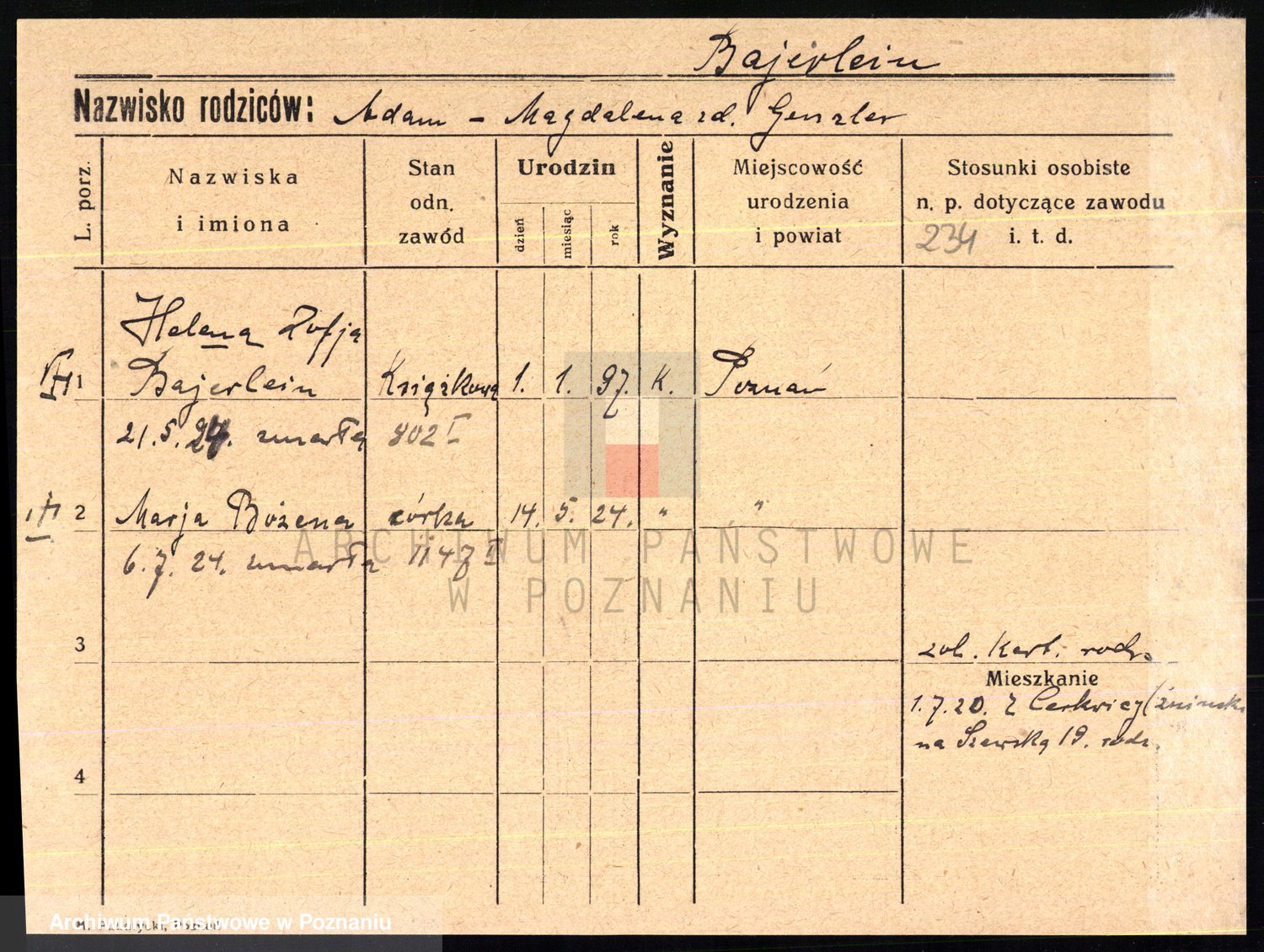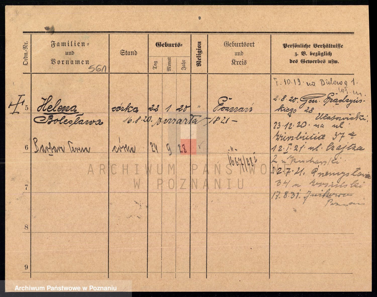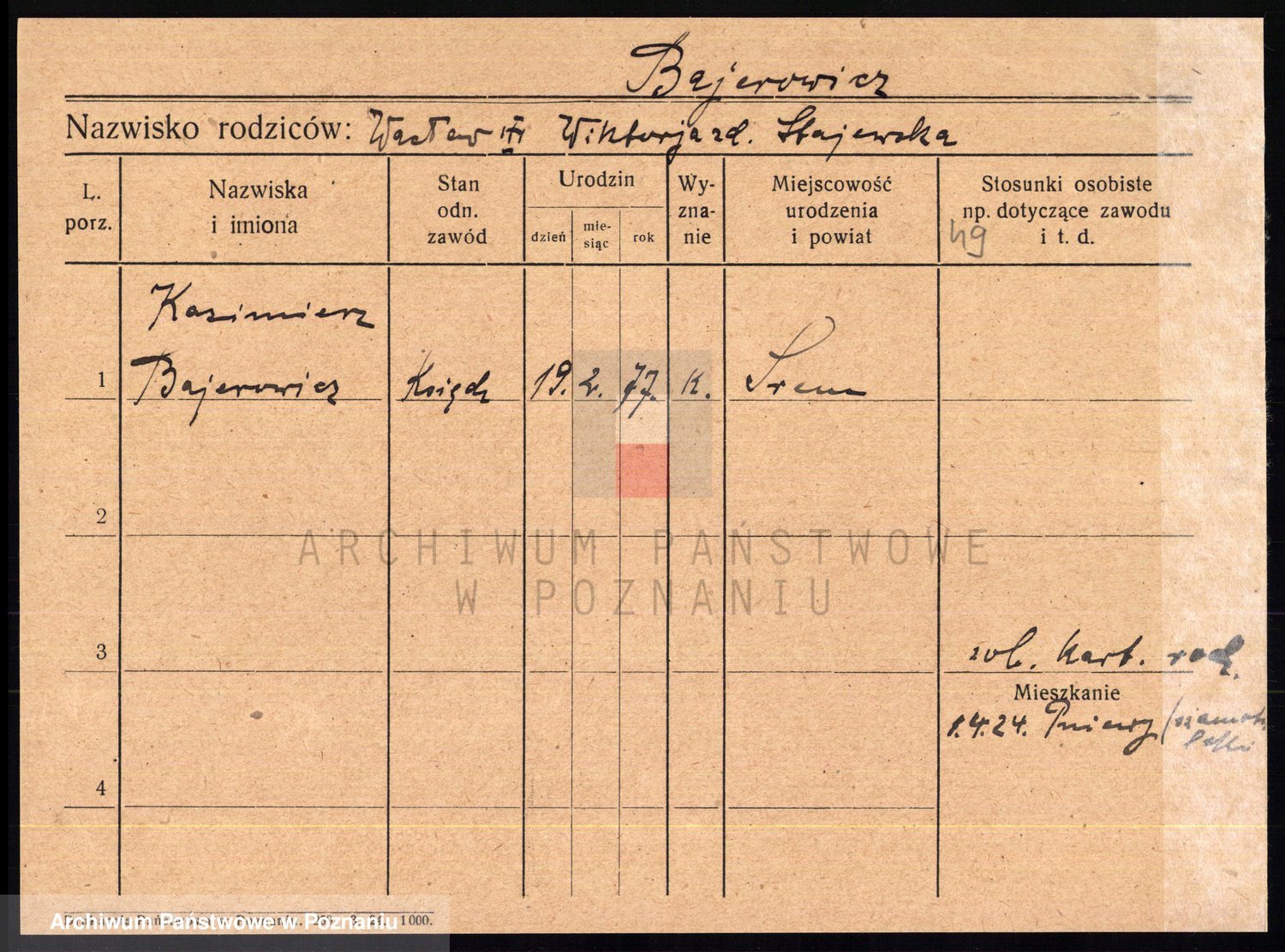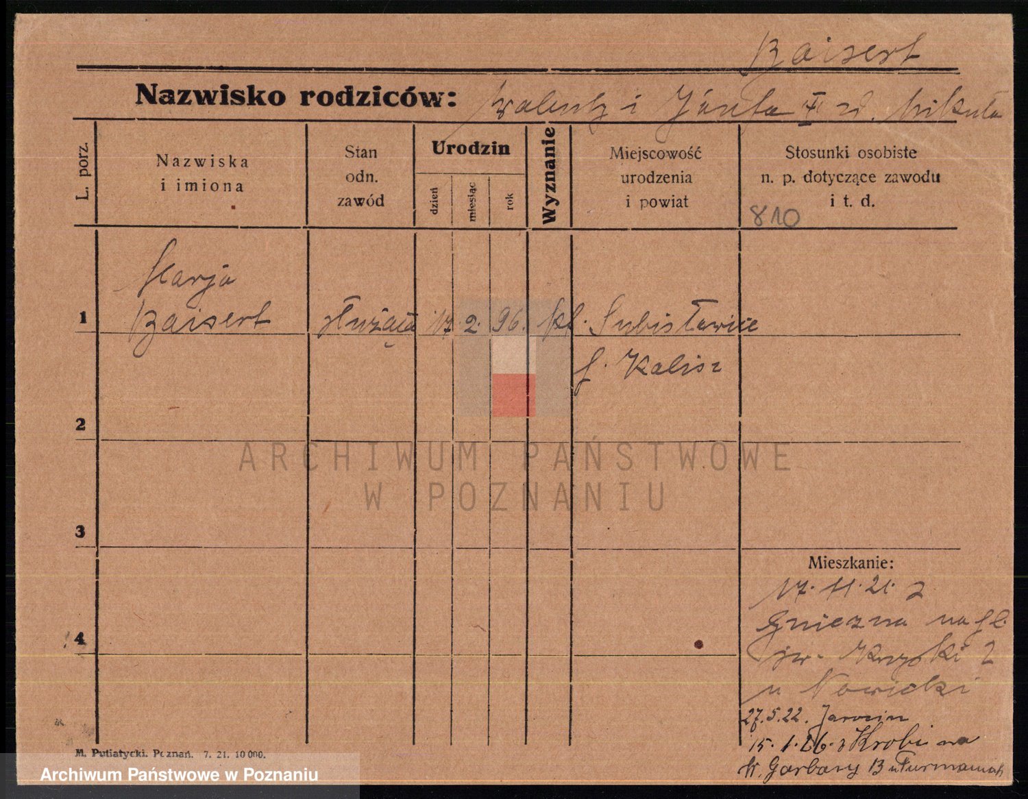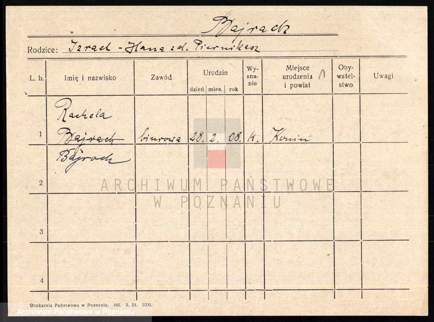 Podgląd karty osobowej dostępny jest po kliknięciu na nazwisko lub ikonkę karty. Można dokonywać powiększenia (ikony na górze) lub przechodzić między kolejnymi skanami (strzałki po bokach).