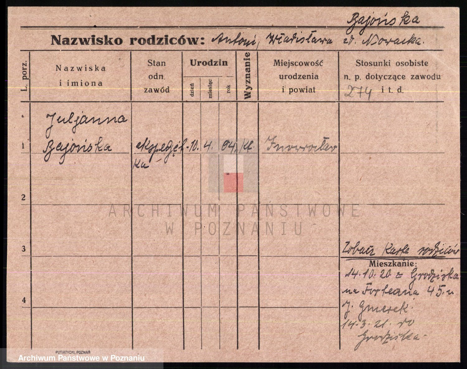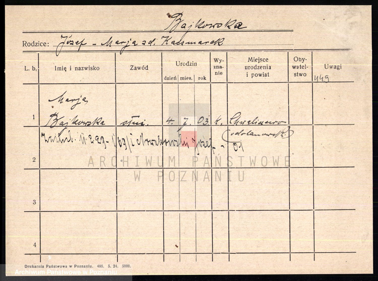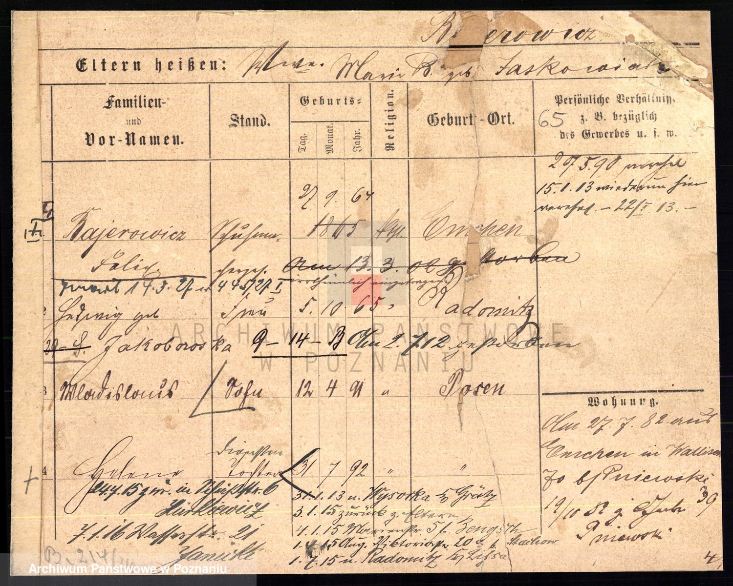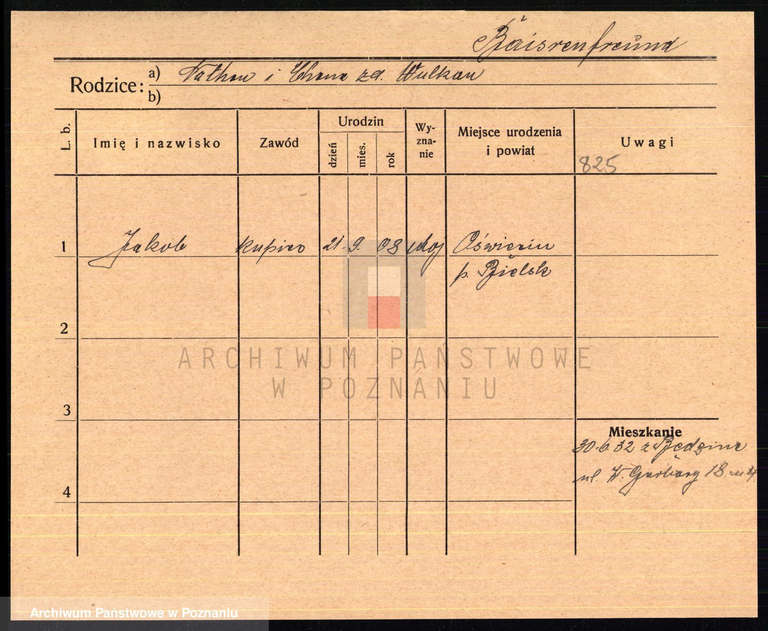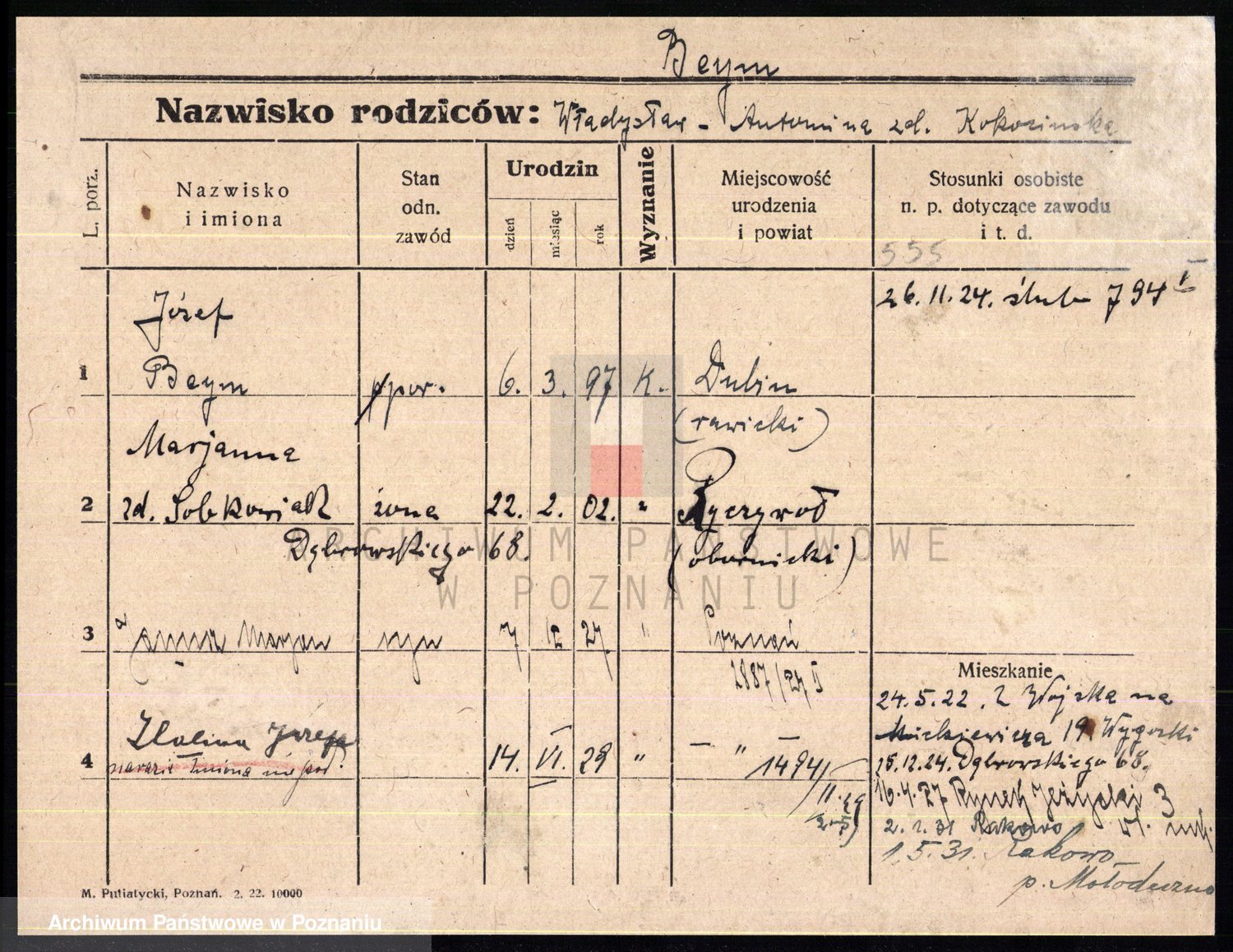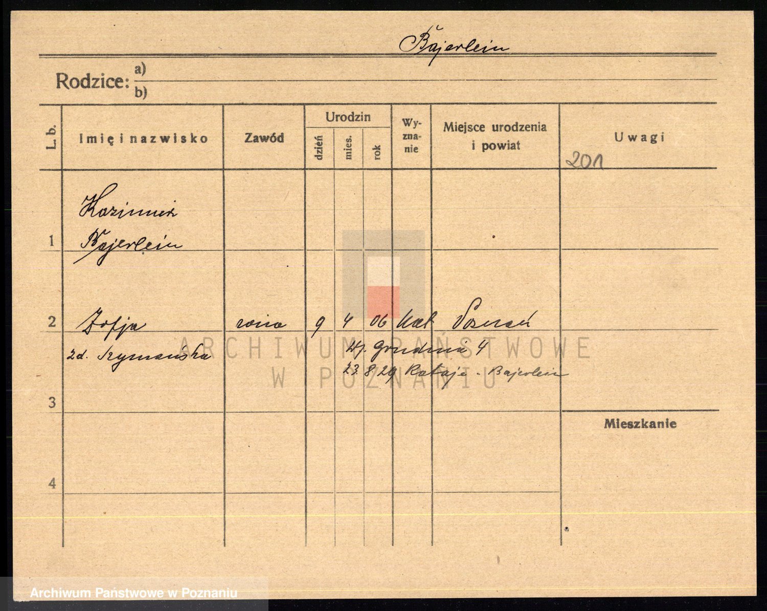 Podgląd karty osobowej dostępny jest po kliknięciu na nazwisko lub ikonkę karty. Można dokonywać powiększenia (ikony na górze) lub przechodzić między kolejnymi skanami (strzałki po bokach).