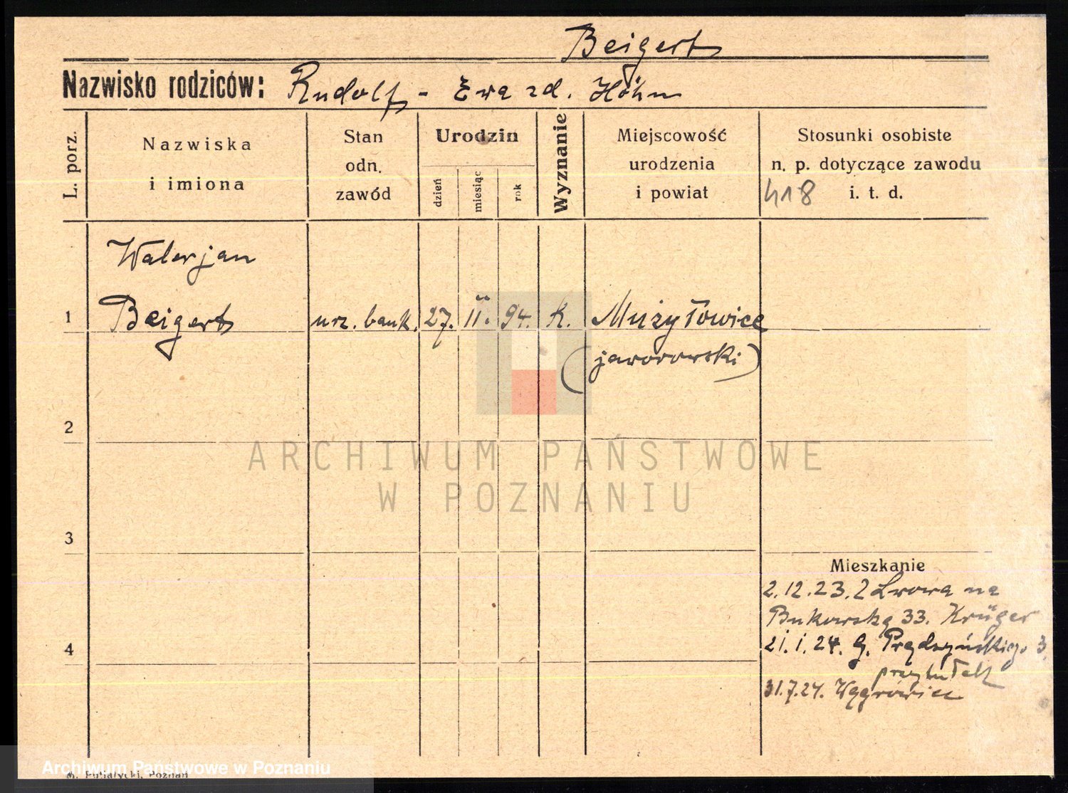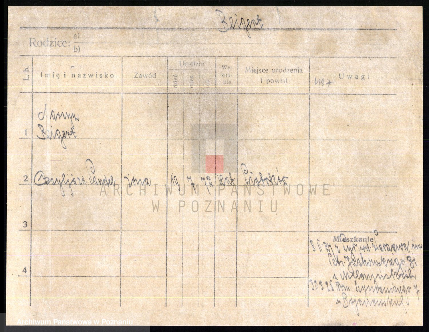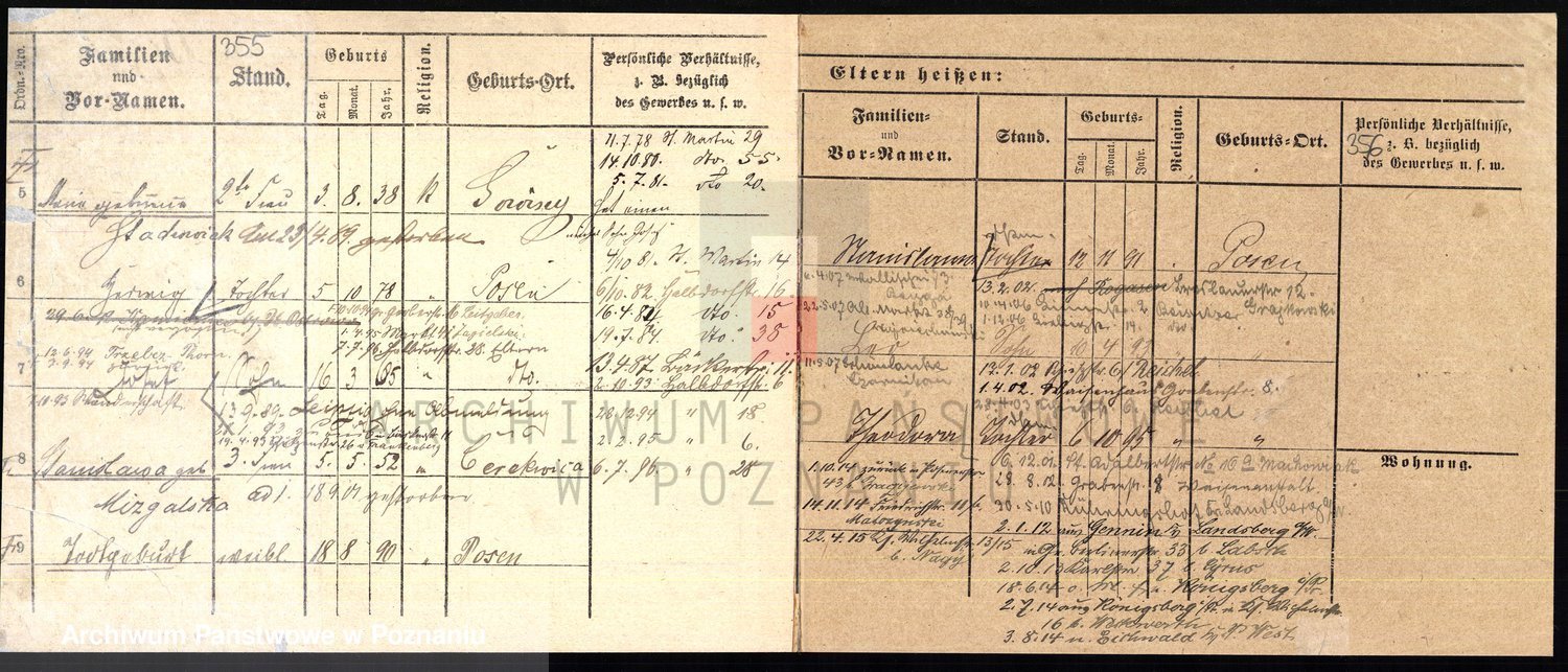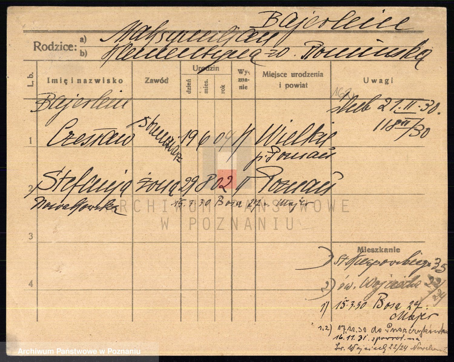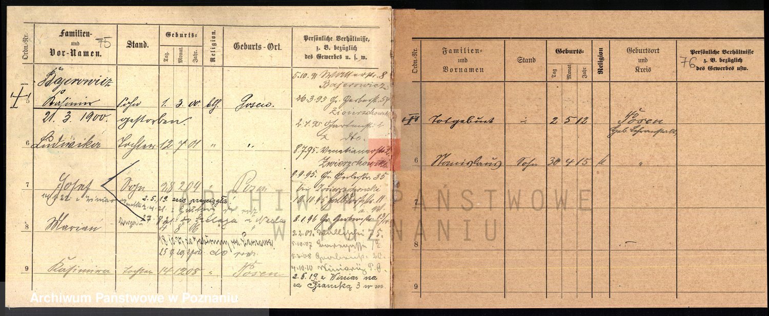 Podgląd karty osobowej dostępny jest po kliknięciu na nazwisko lub ikonkę karty. Można dokonywać powiększenia (ikony na górze) lub przechodzić między kolejnymi skanami (strzałki po bokach).