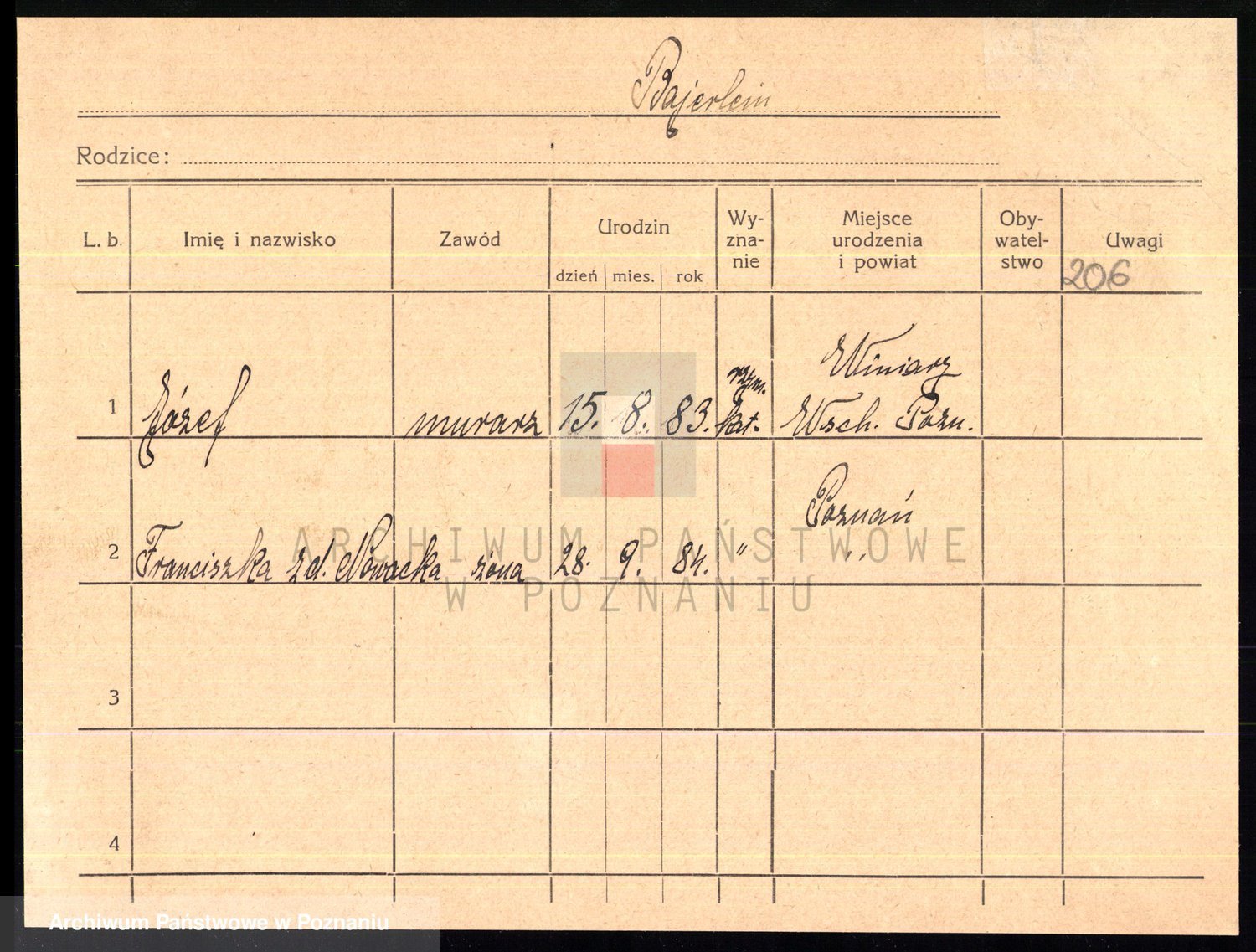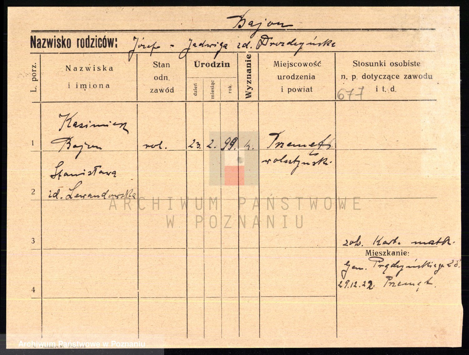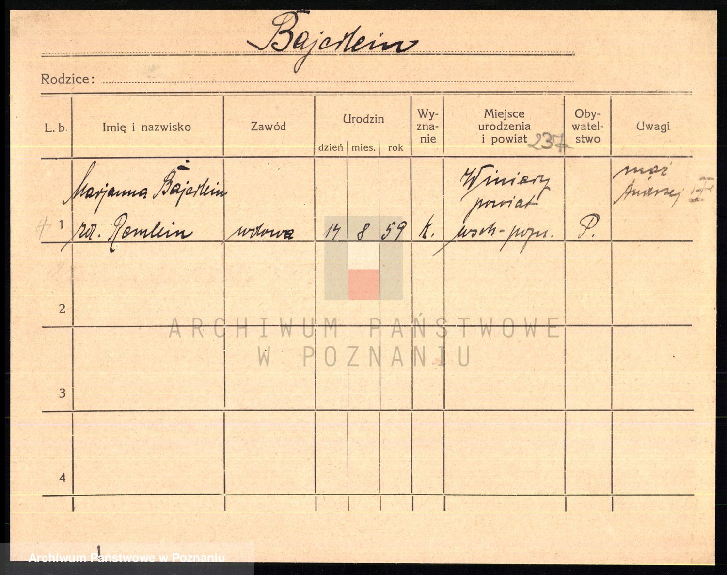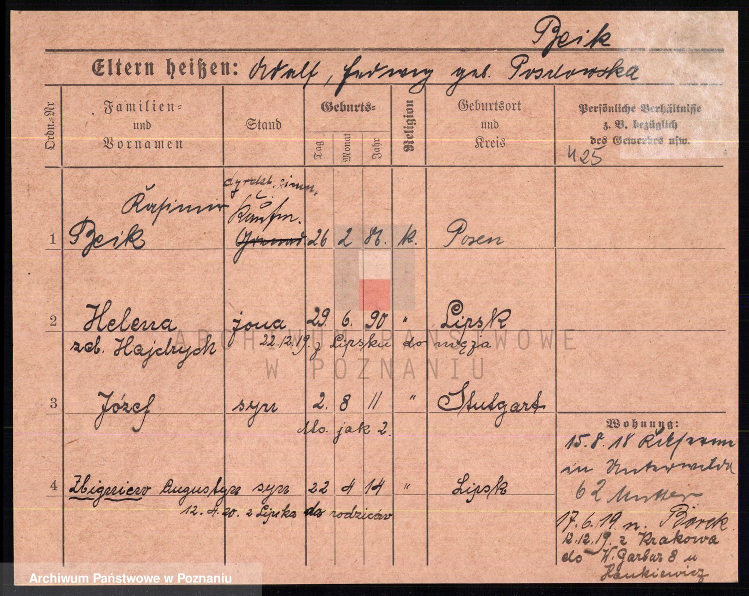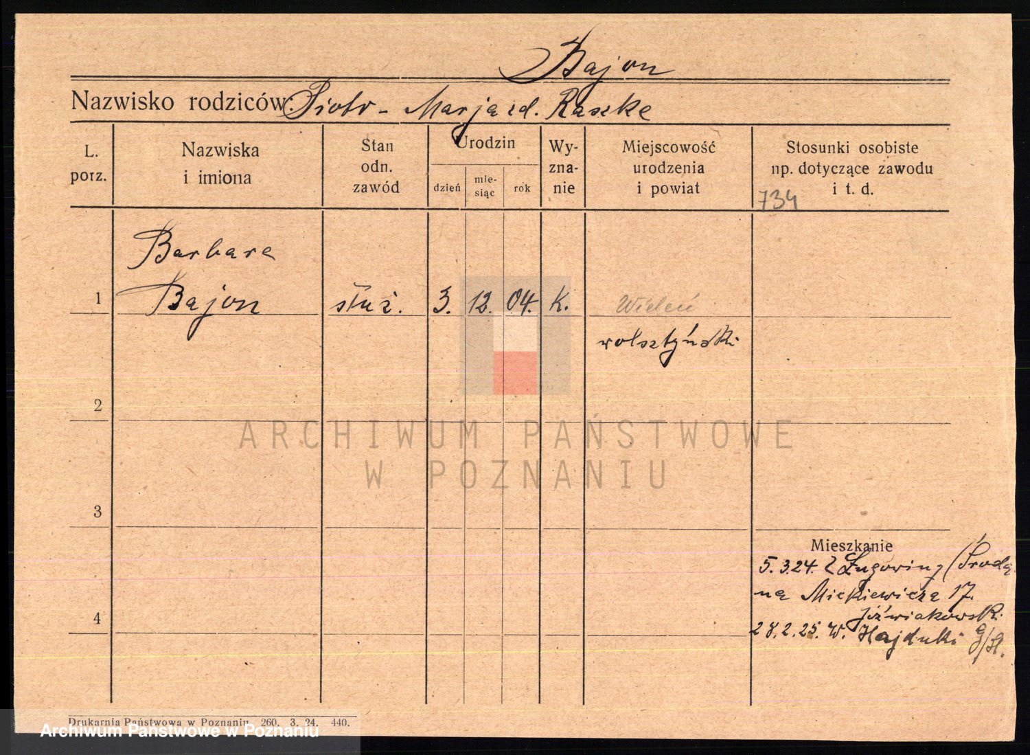 Podgląd karty osobowej dostępny jest po kliknięciu na nazwisko lub ikonkę karty. Można dokonywać powiększenia (ikony na górze) lub przechodzić między kolejnymi skanami (strzałki po bokach).