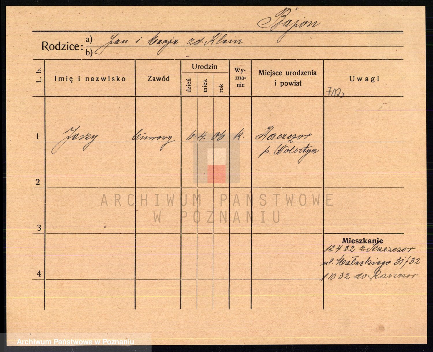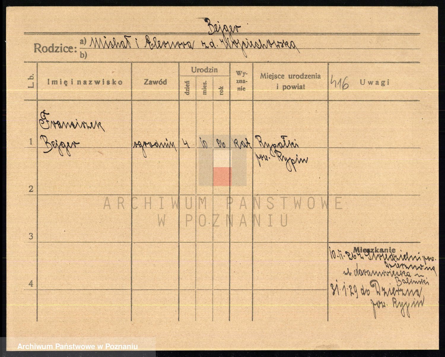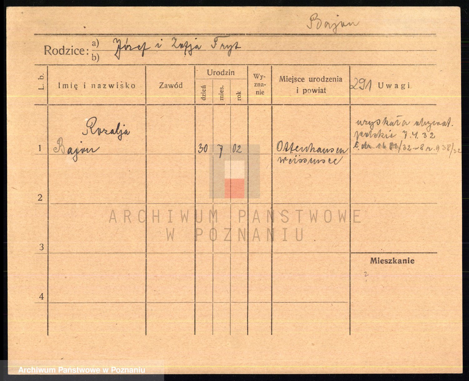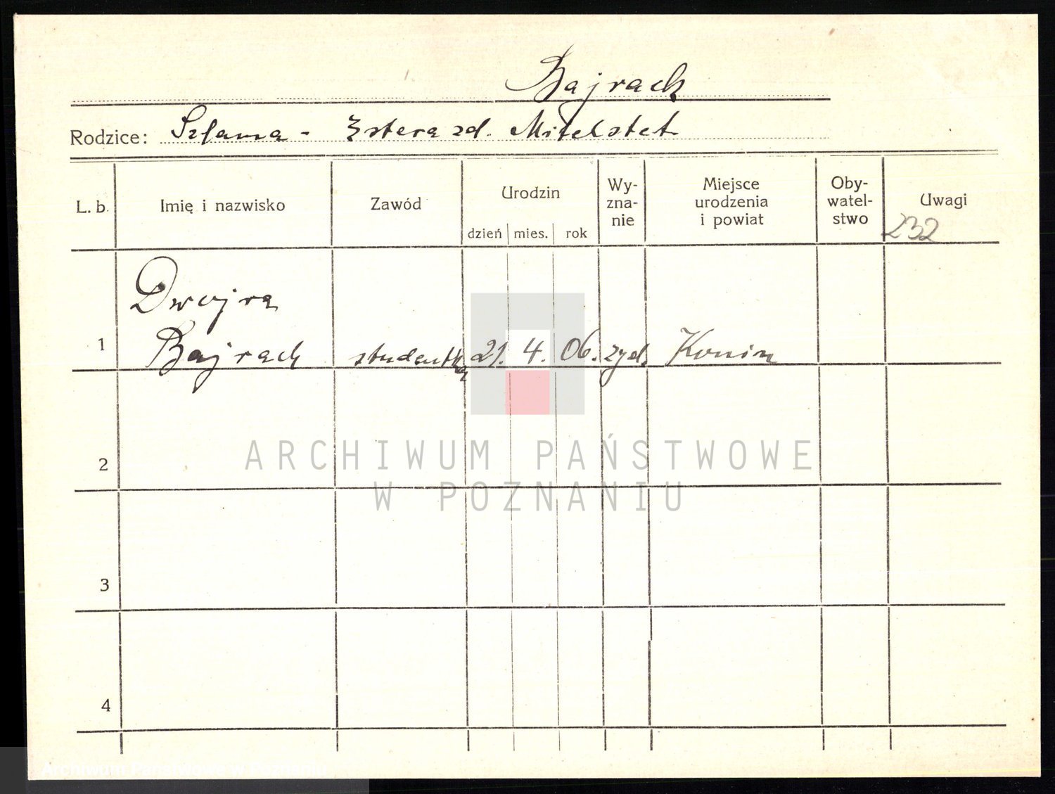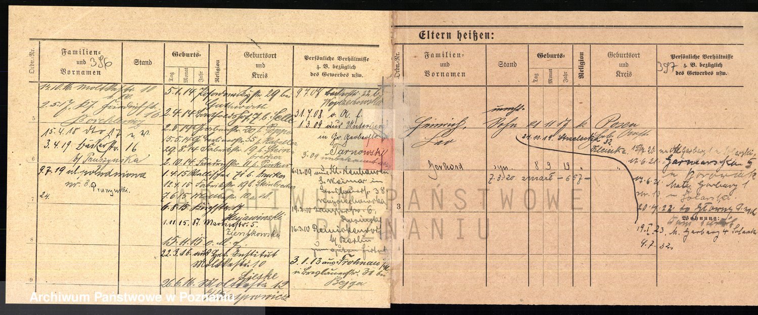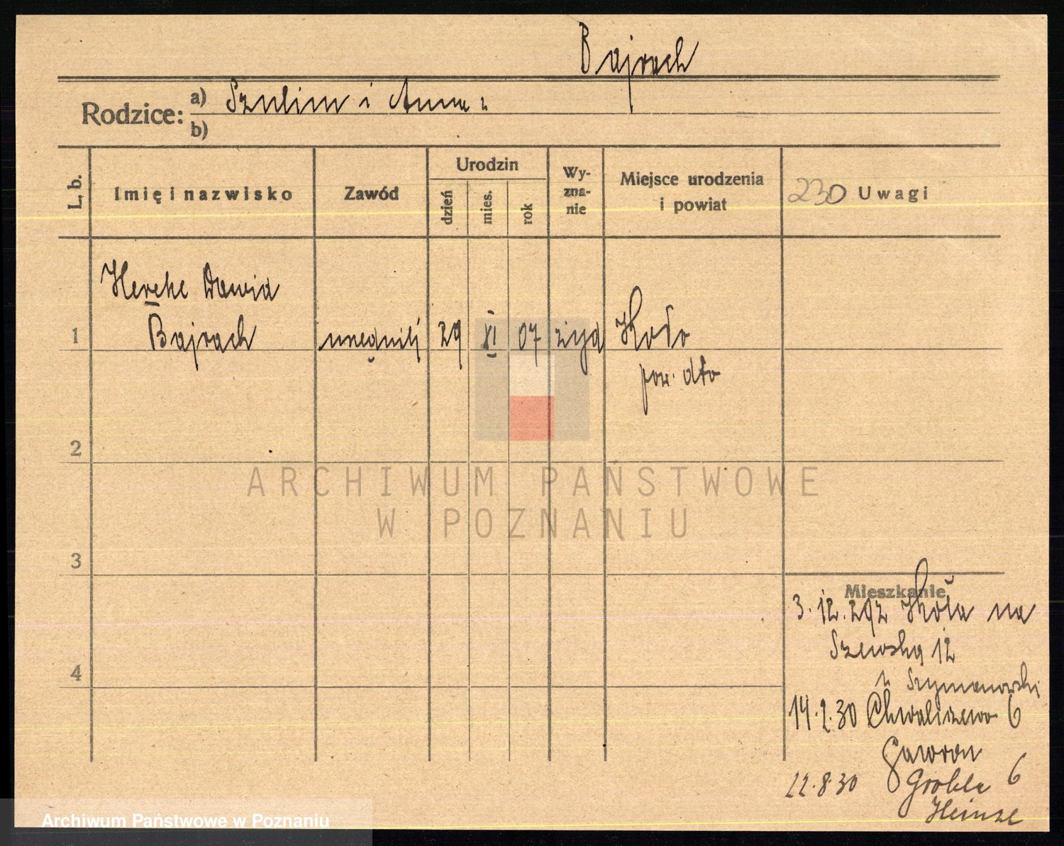 Podgląd karty osobowej dostępny jest po kliknięciu na nazwisko lub ikonkę karty. Można dokonywać powiększenia (ikony na górze) lub przechodzić między kolejnymi skanami (strzałki po bokach).