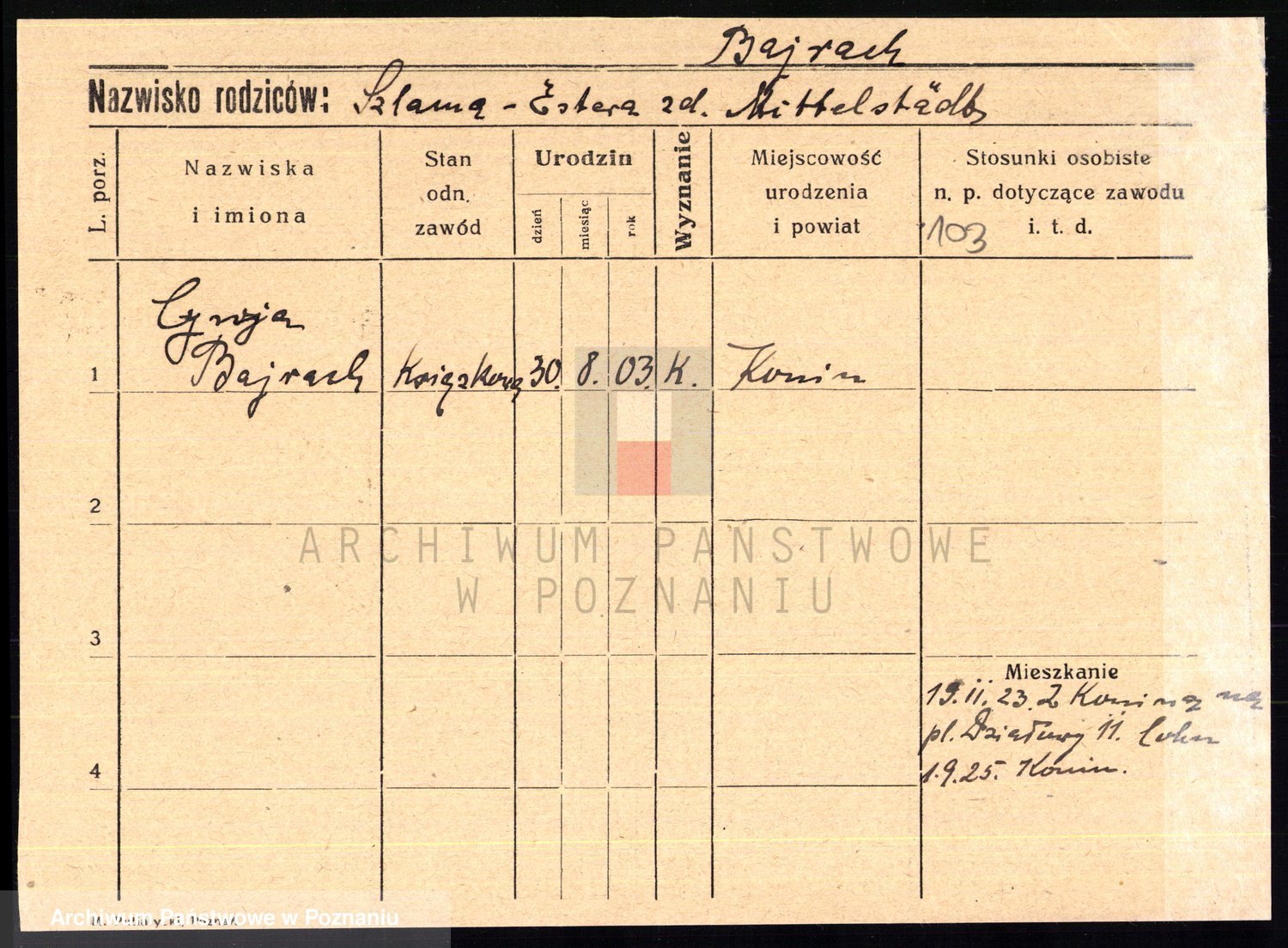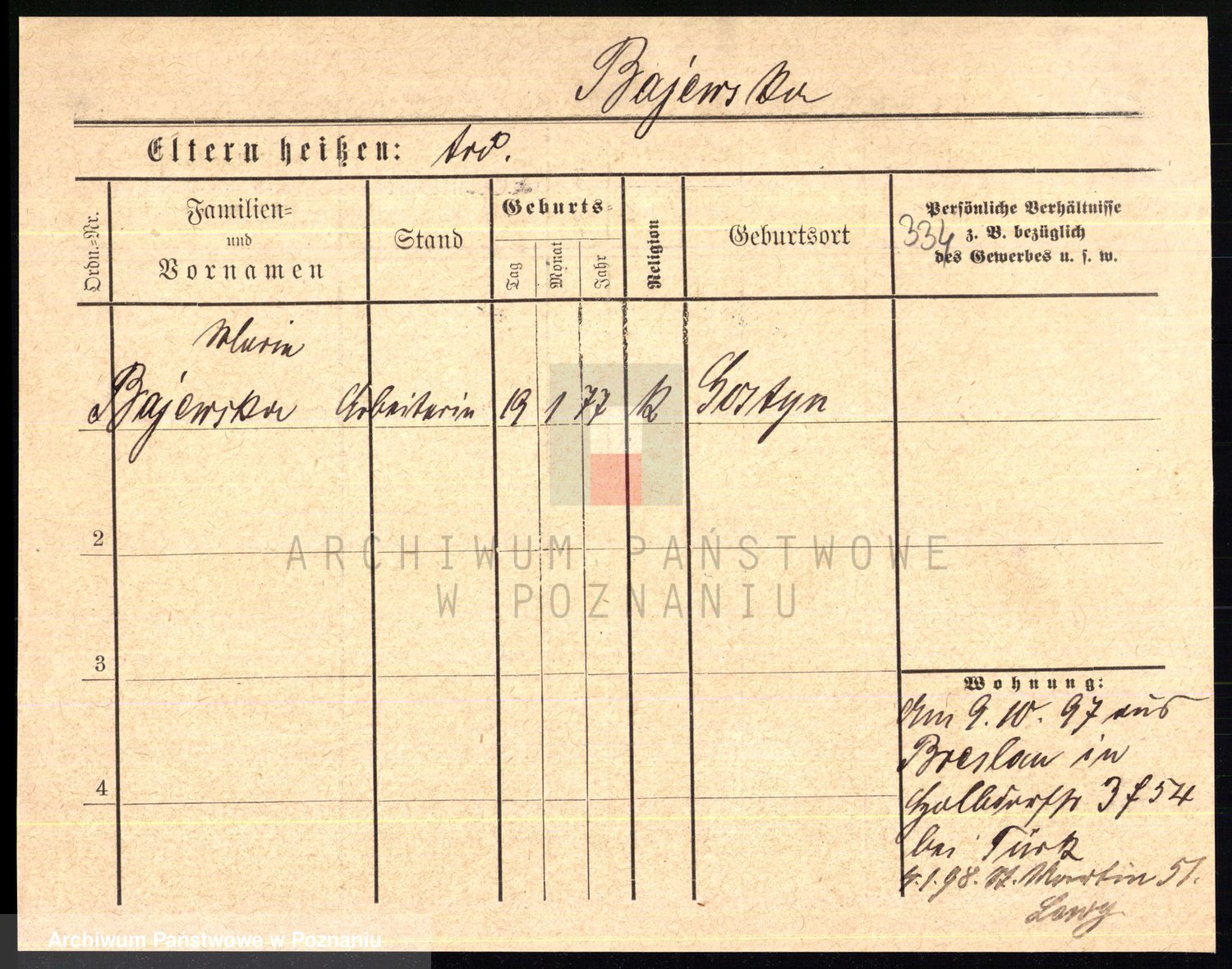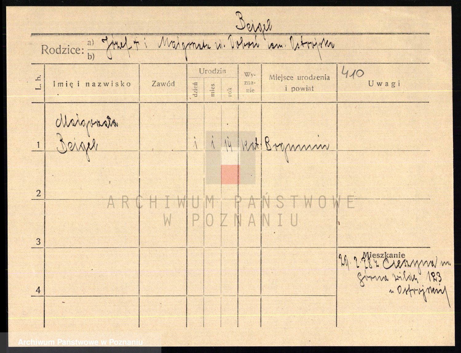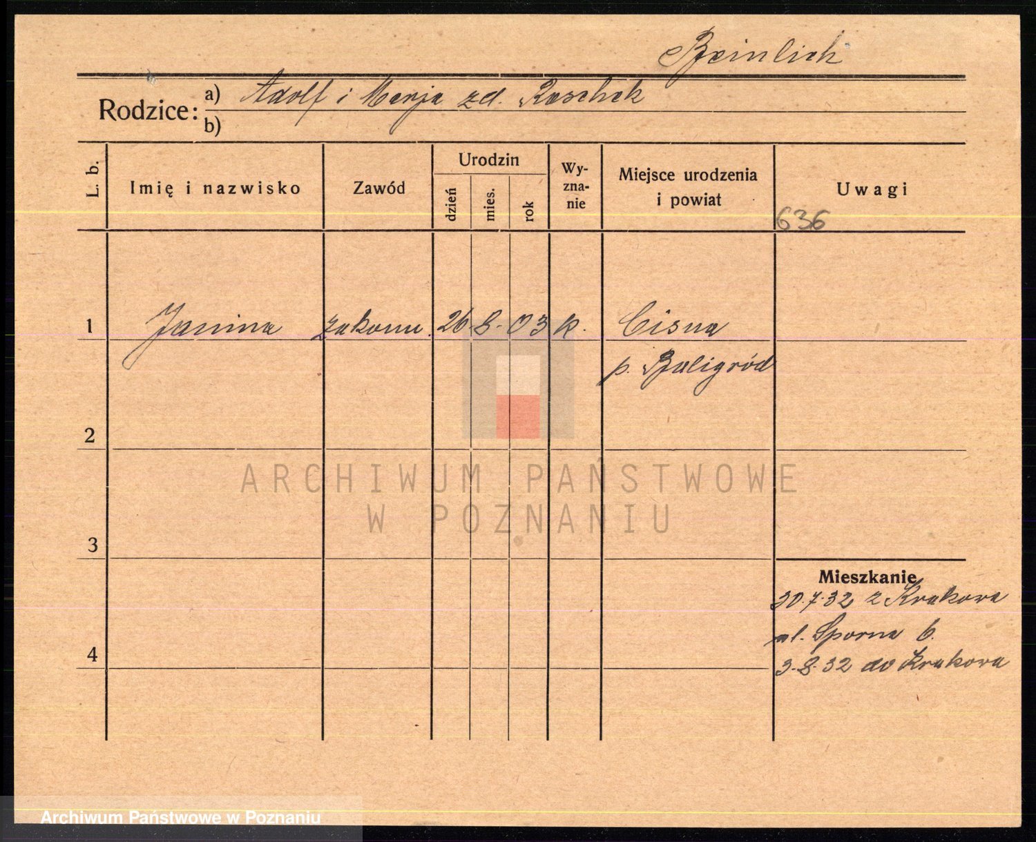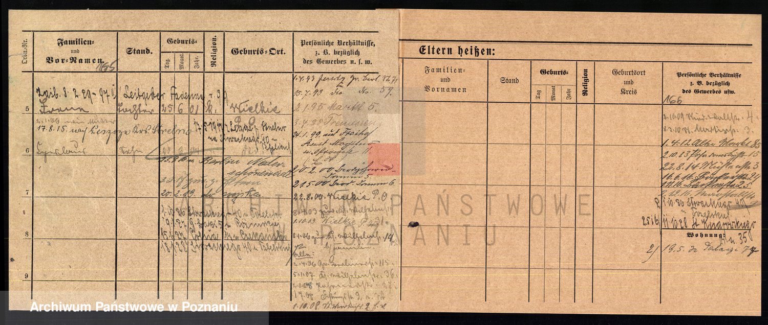 Podgląd karty osobowej dostępny jest po kliknięciu na nazwisko lub ikonkę karty. Można dokonywać powiększenia (ikony na górze) lub przechodzić między kolejnymi skanami (strzałki po bokach).