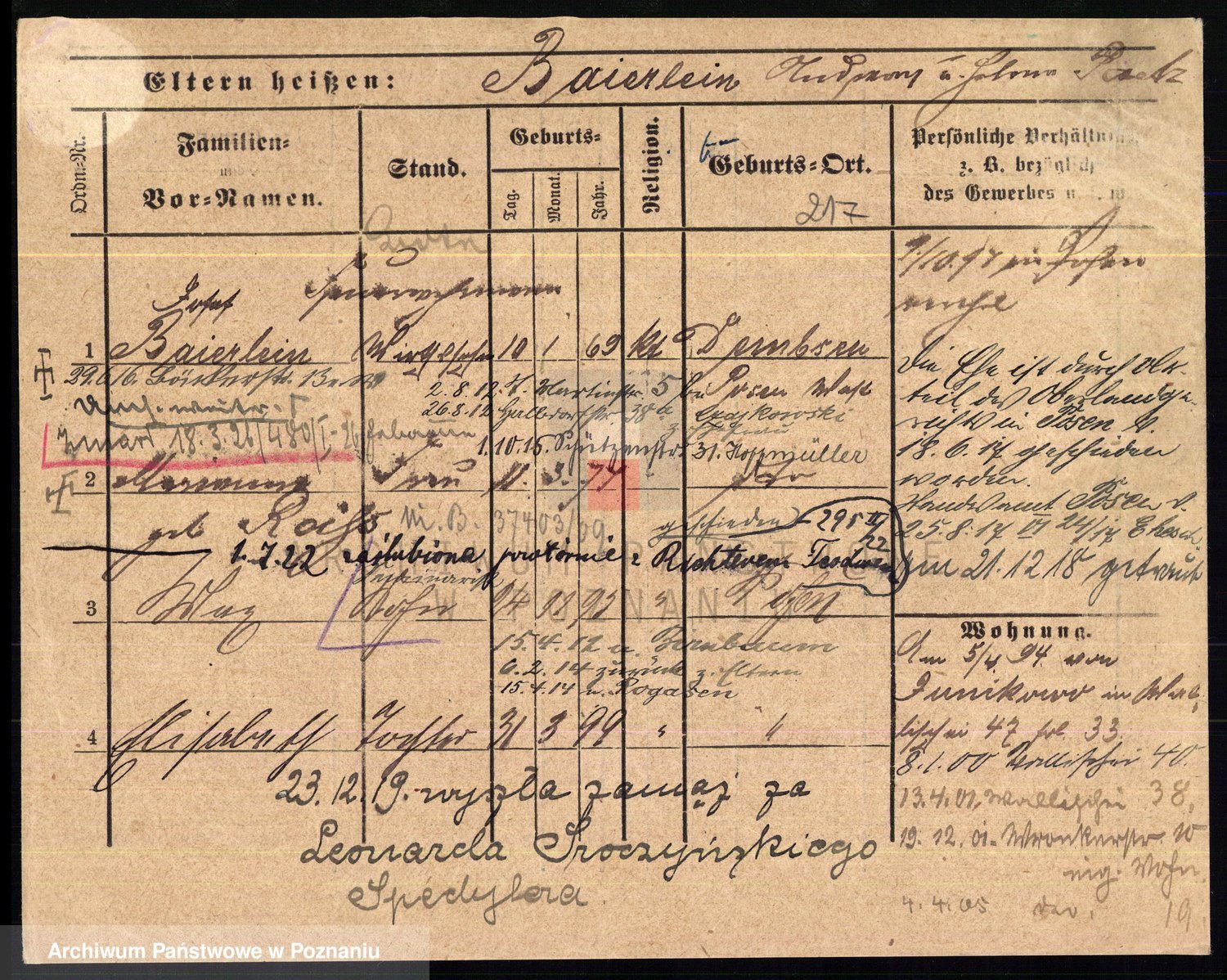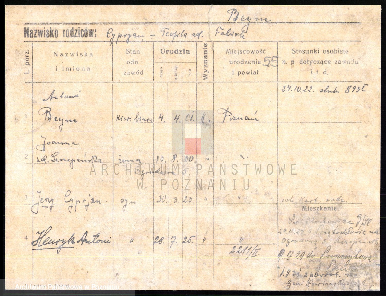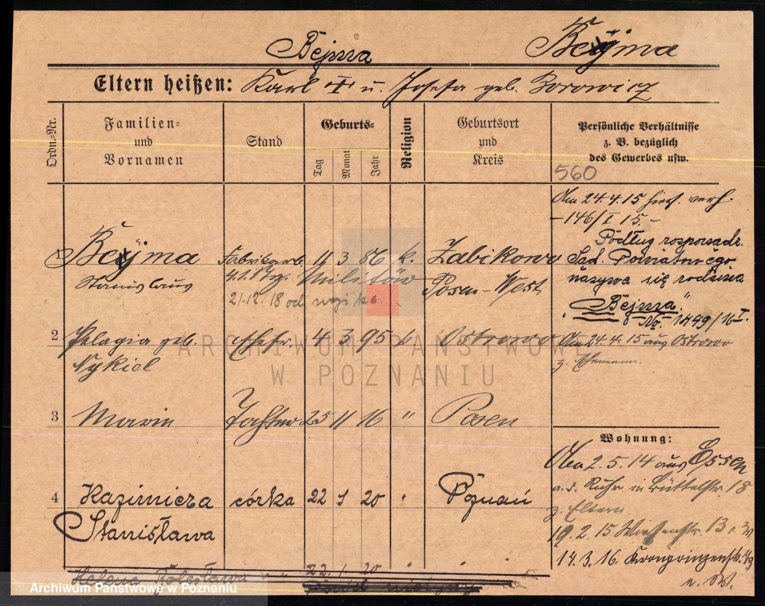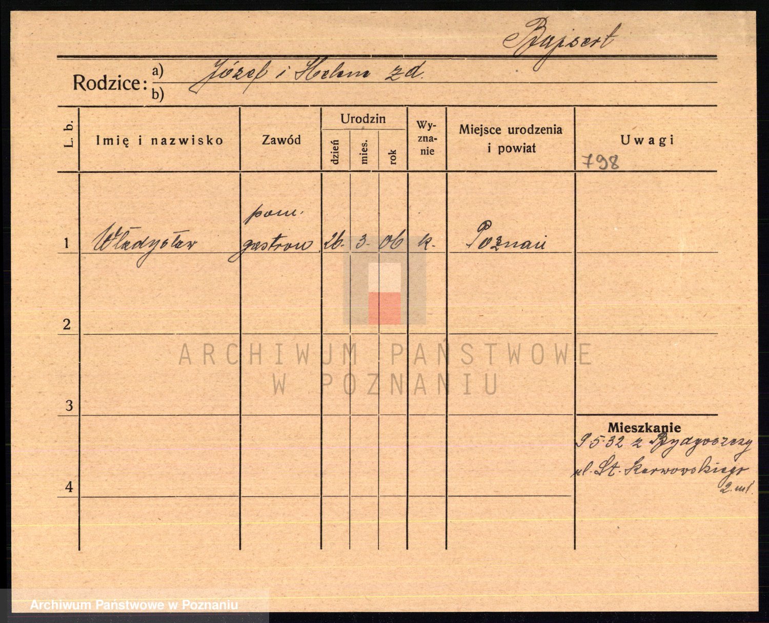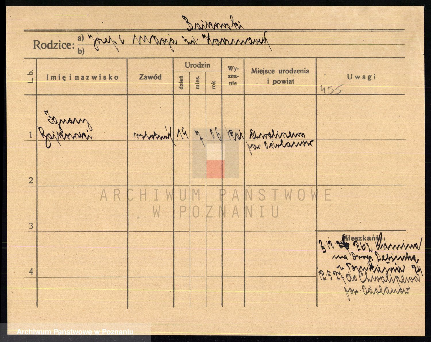 Podgląd karty osobowej dostępny jest po kliknięciu na nazwisko lub ikonkę karty. Można dokonywać powiększenia (ikony na górze) lub przechodzić między kolejnymi skanami (strzałki po bokach).