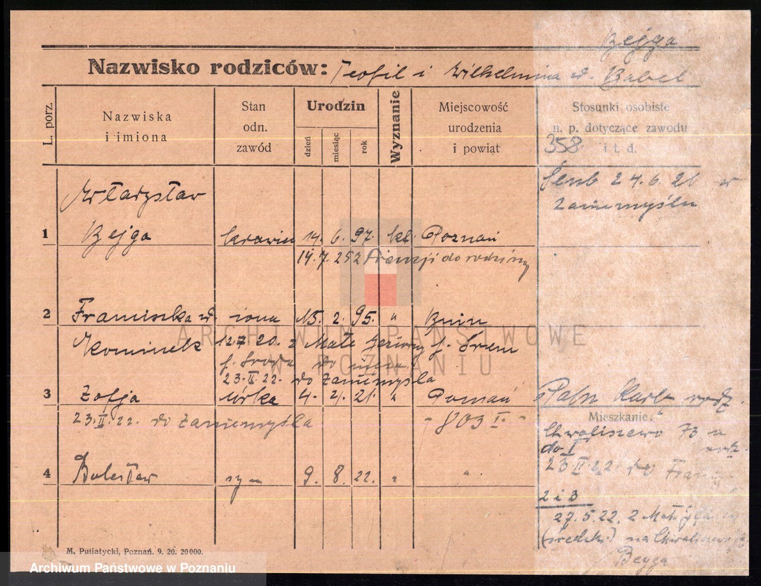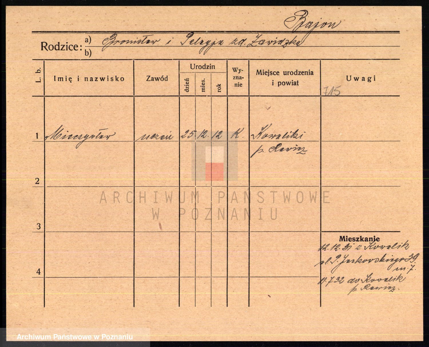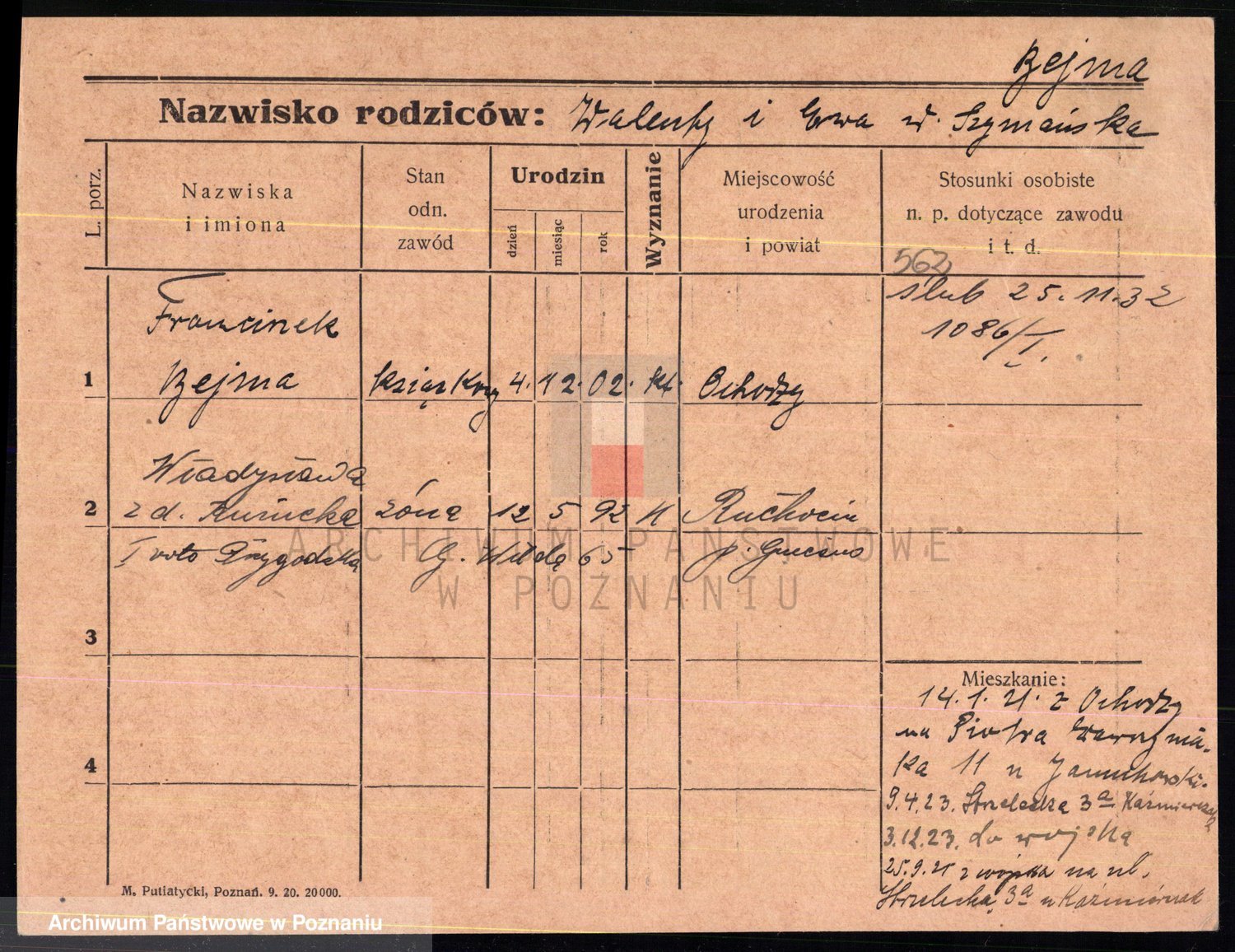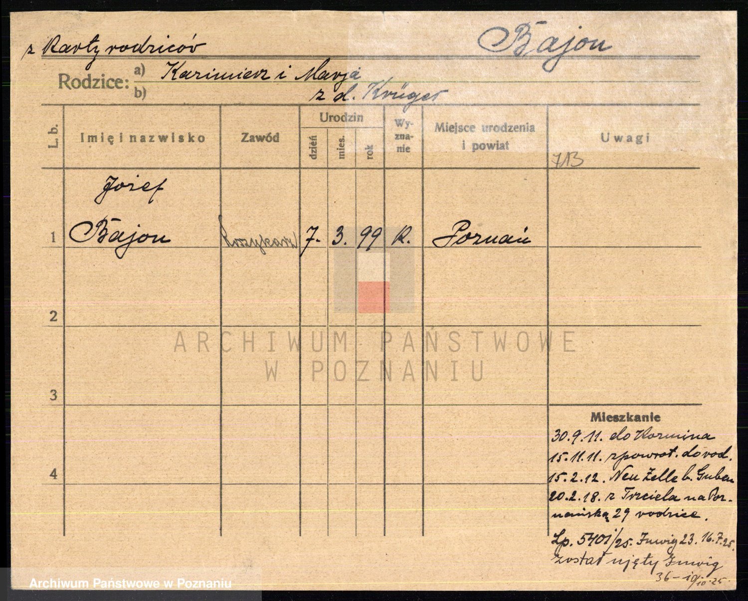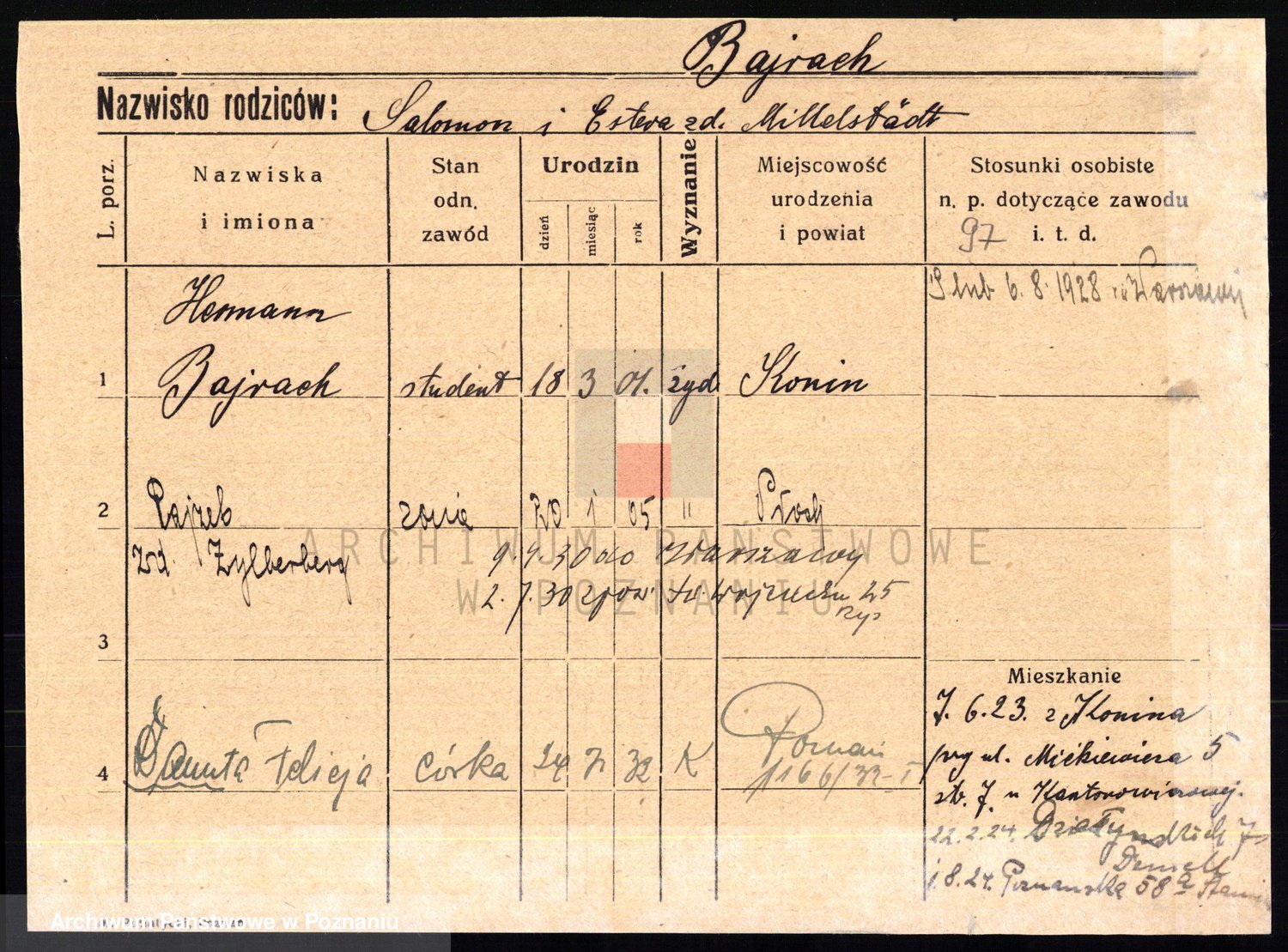 Podgląd karty osobowej dostępny jest po kliknięciu na nazwisko lub ikonkę karty. Można dokonywać powiększenia (ikony na górze) lub przechodzić między kolejnymi skanami (strzałki po bokach).
