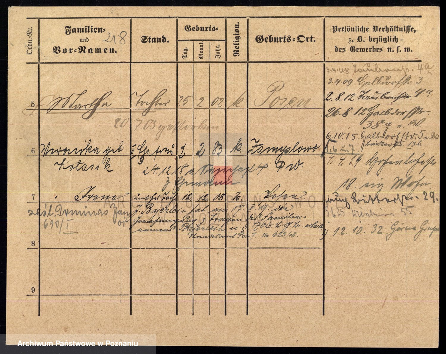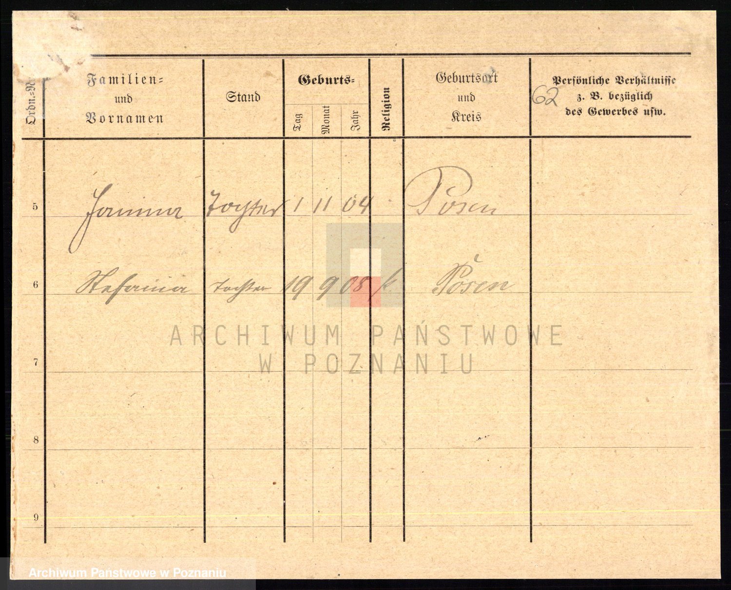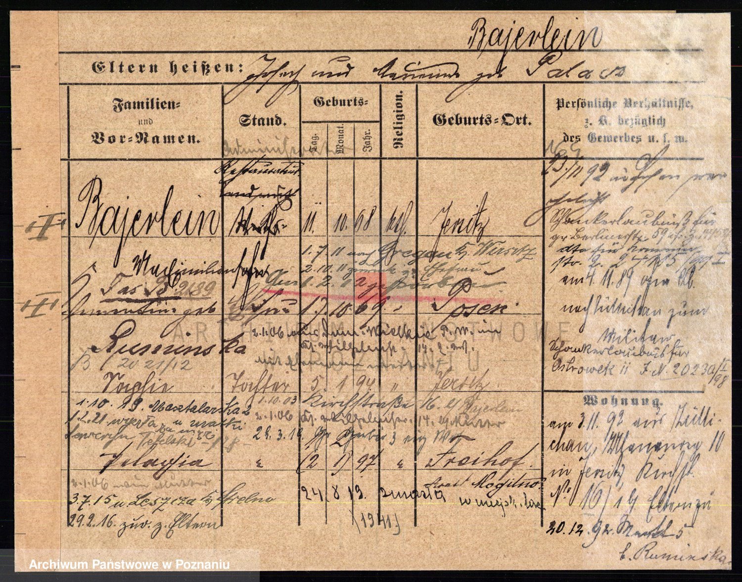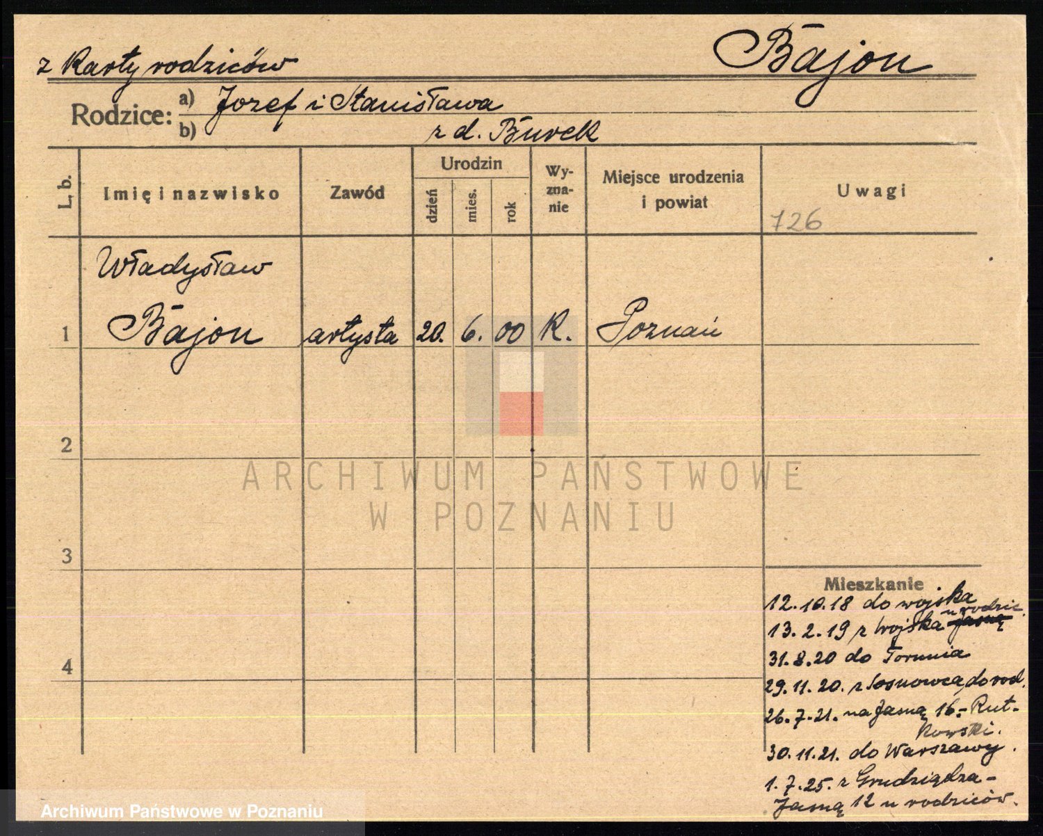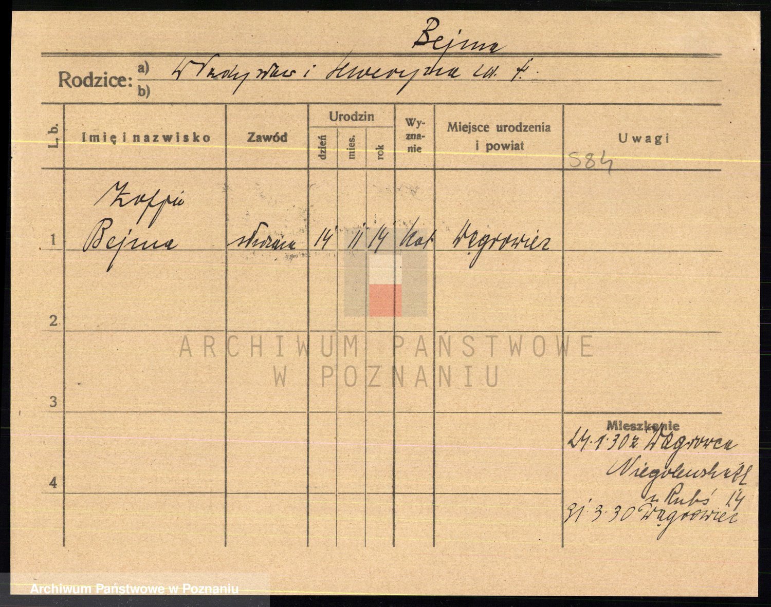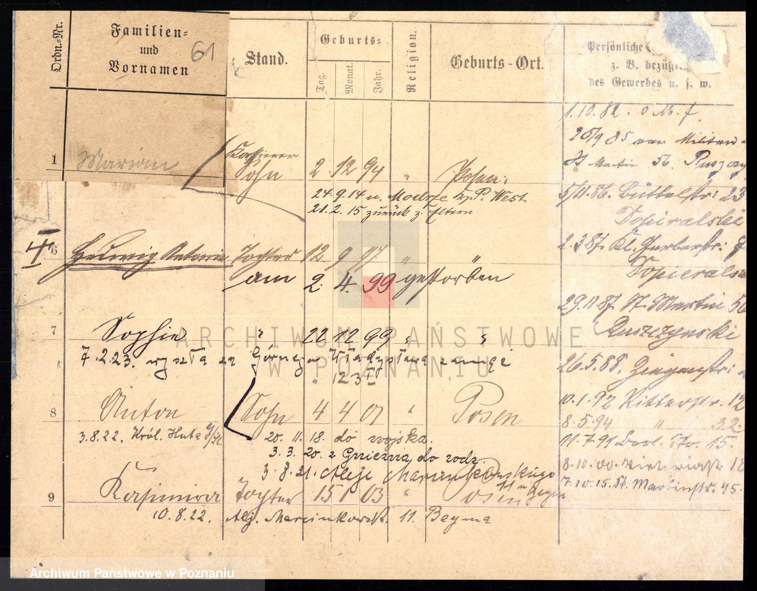 Podgląd karty osobowej dostępny jest po kliknięciu na nazwisko lub ikonkę karty. Można dokonywać powiększenia (ikony na górze) lub przechodzić między kolejnymi skanami (strzałki po bokach).