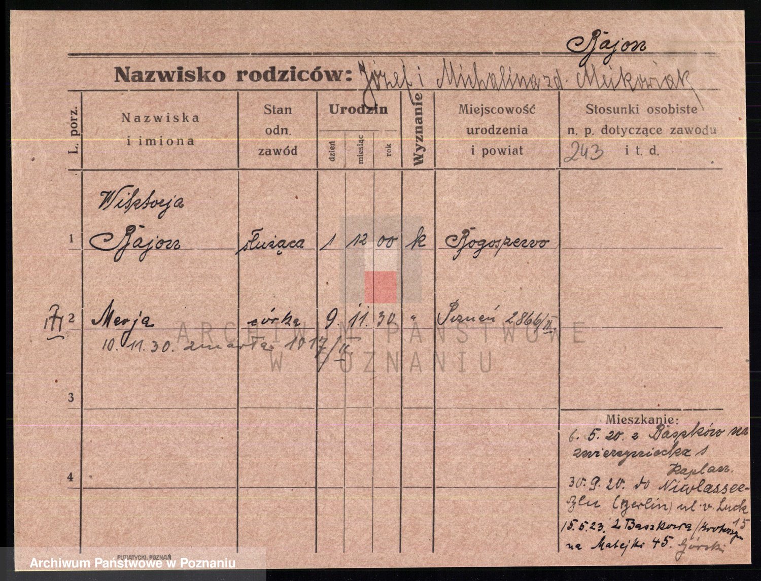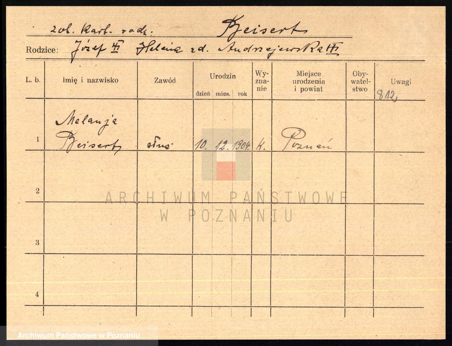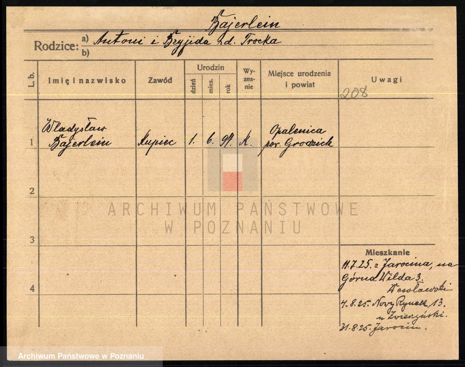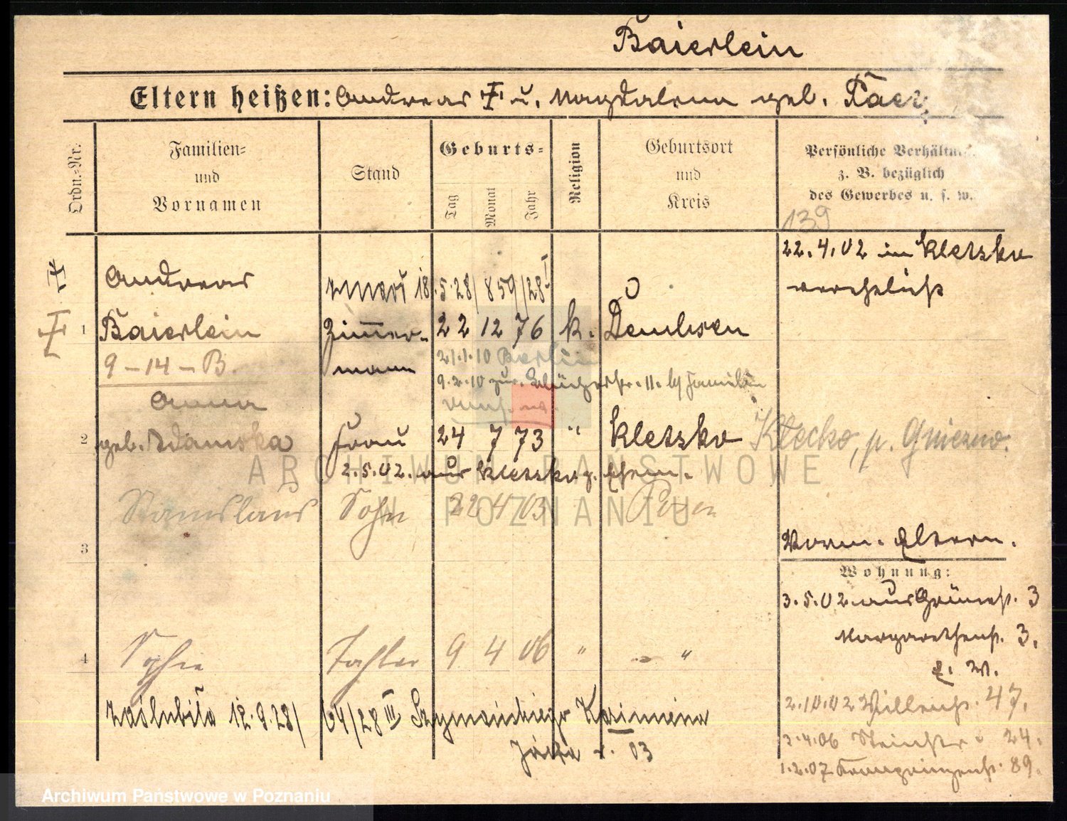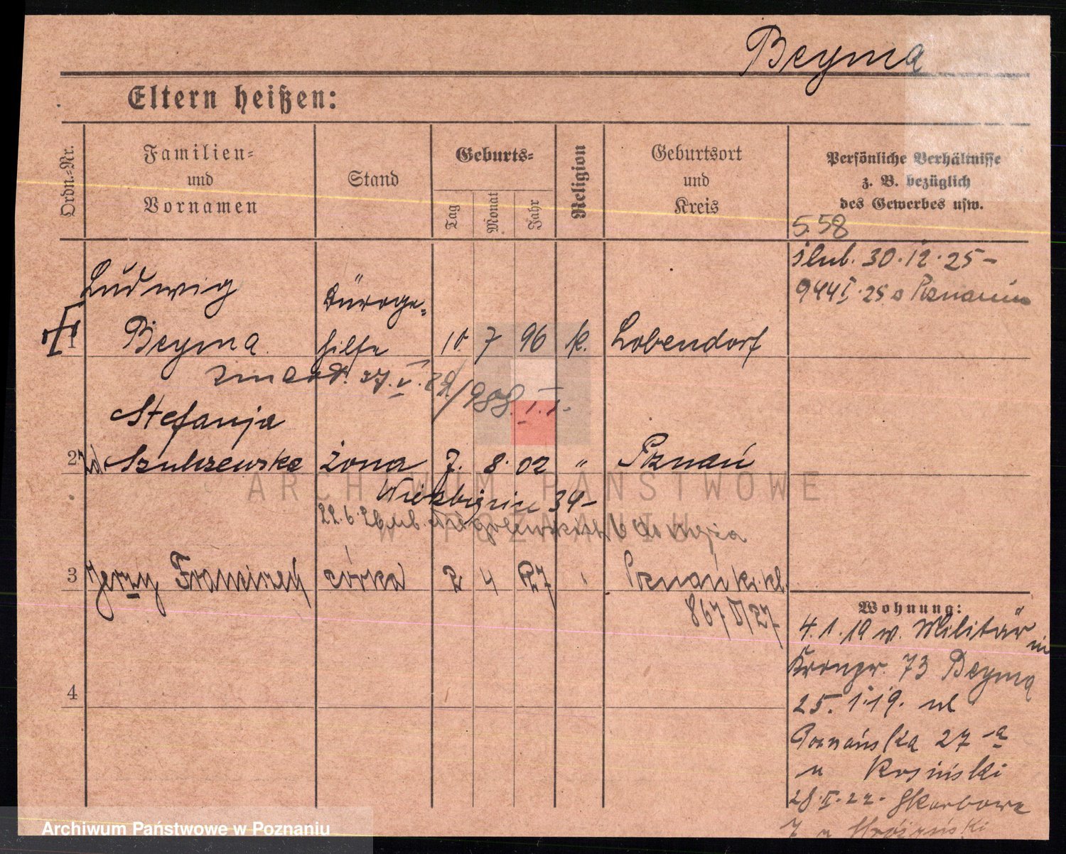 Podgląd karty osobowej dostępny jest po kliknięciu na nazwisko lub ikonkę karty. Można dokonywać powiększenia (ikony na górze) lub przechodzić między kolejnymi skanami (strzałki po bokach).