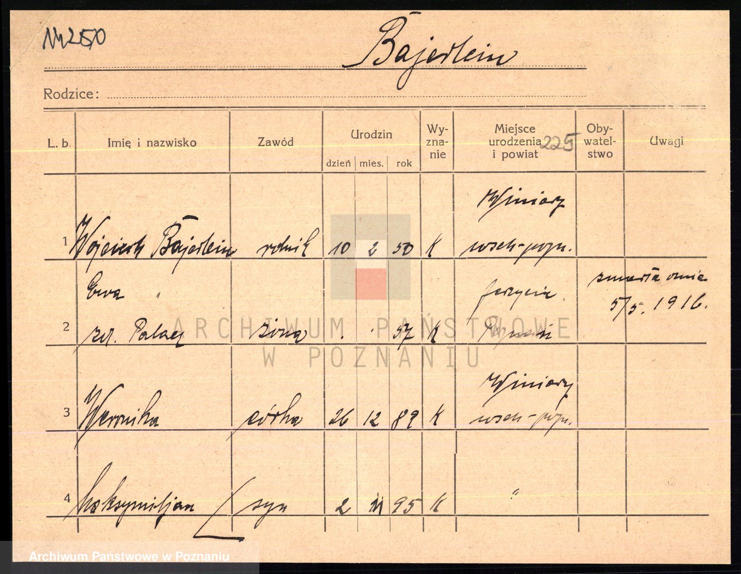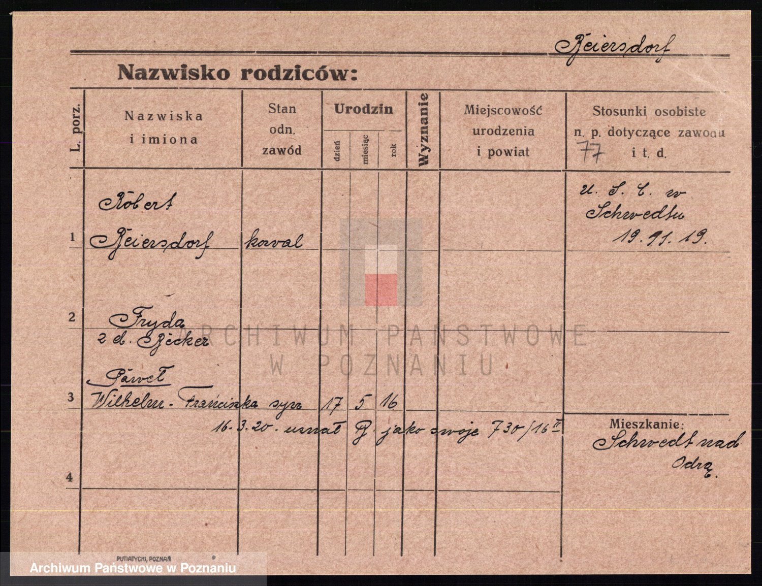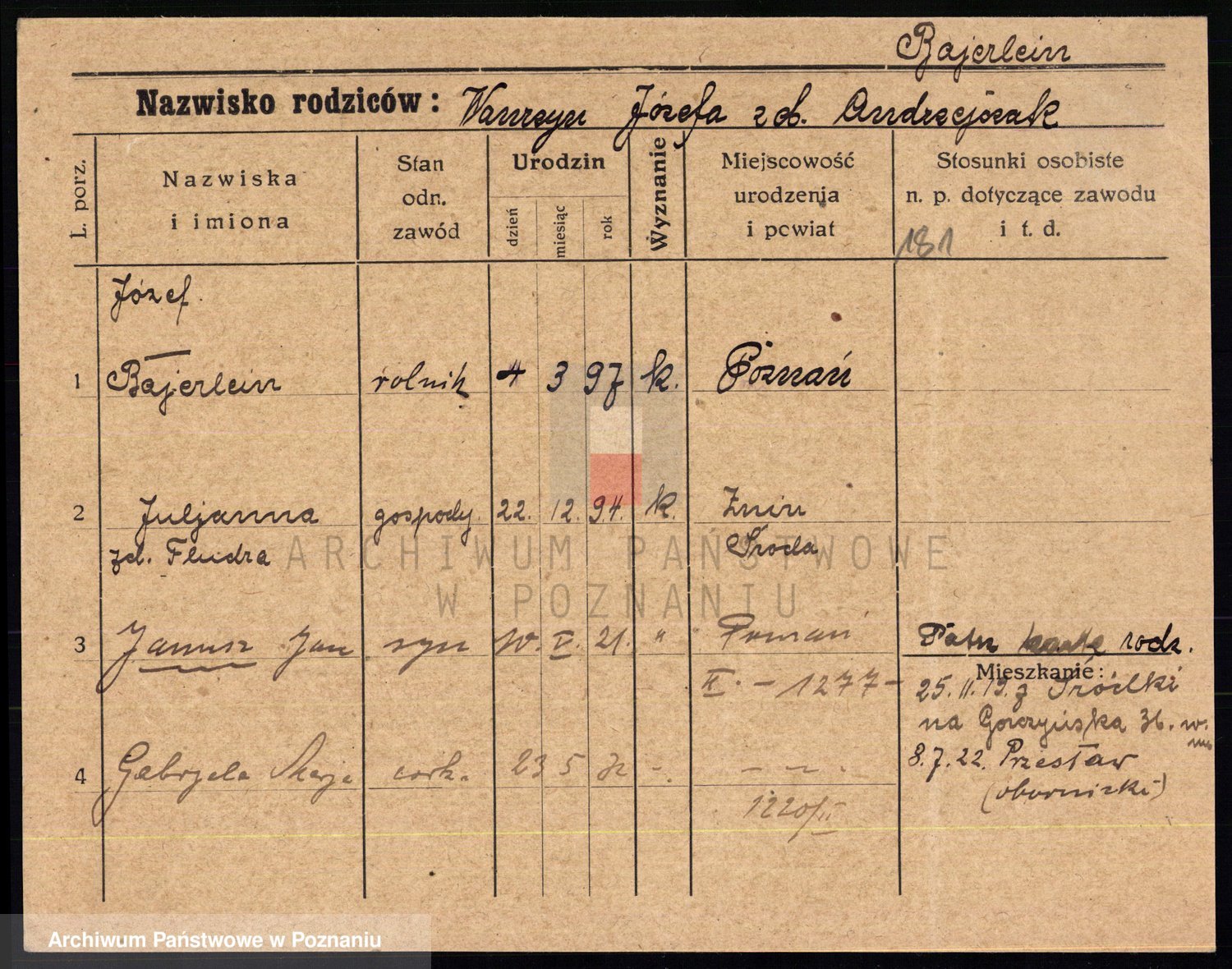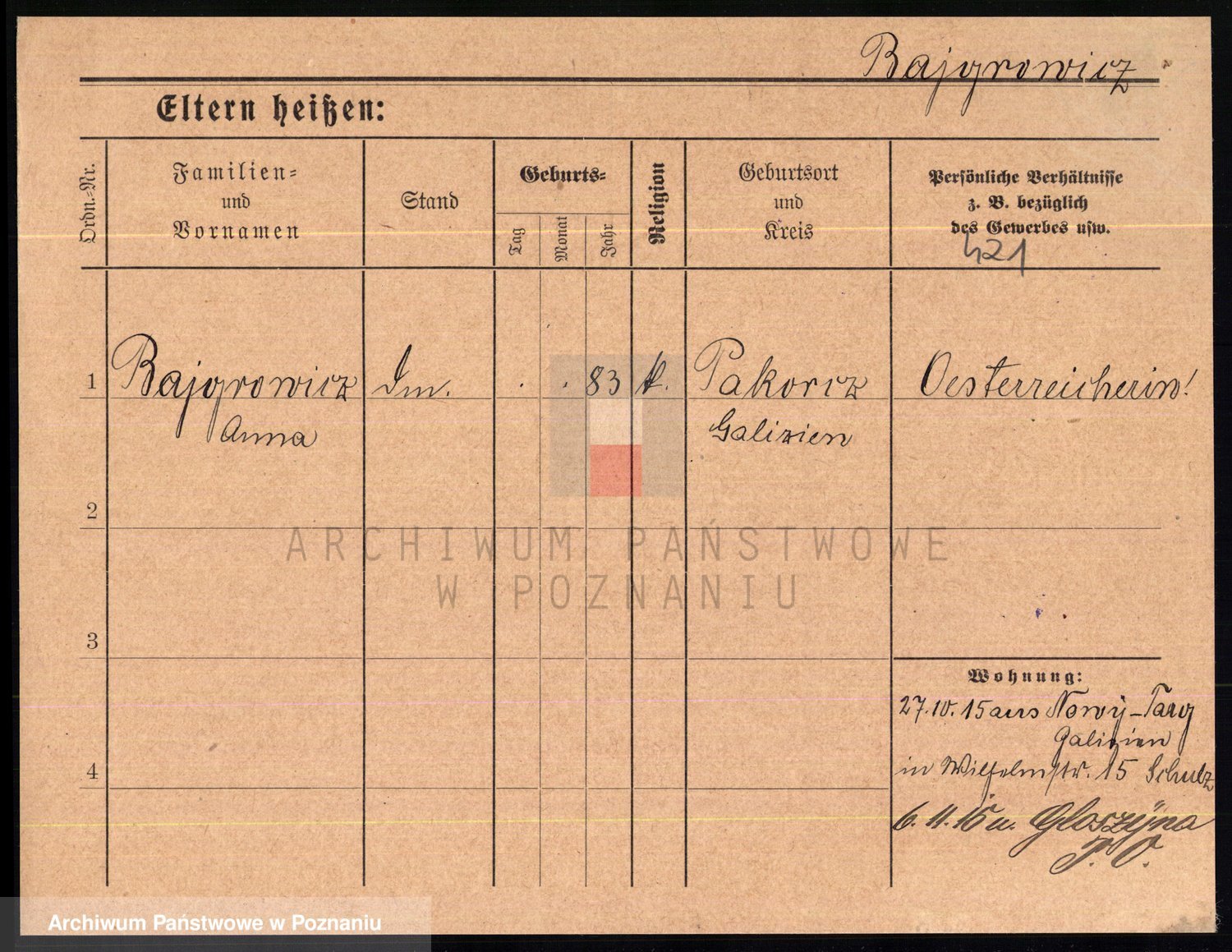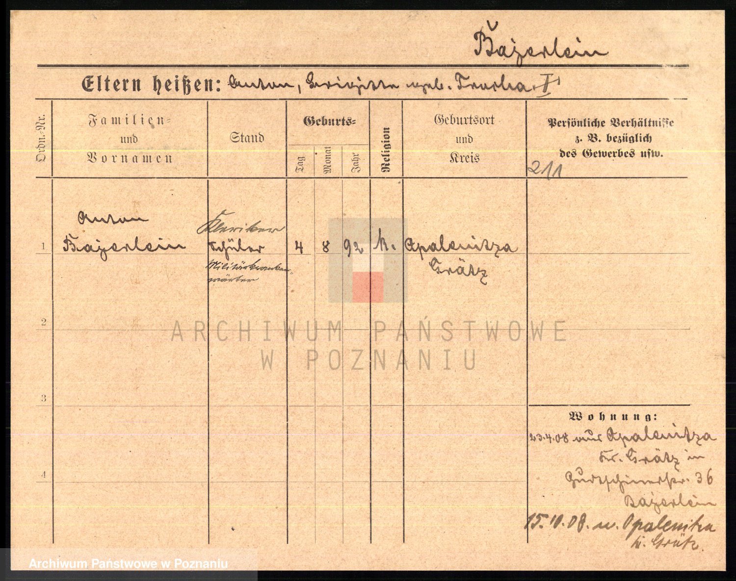 Podgląd karty osobowej dostępny jest po kliknięciu na nazwisko lub ikonkę karty. Można dokonywać powiększenia (ikony na górze) lub przechodzić między kolejnymi skanami (strzałki po bokach).