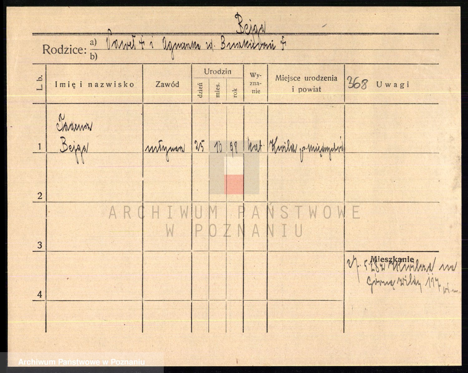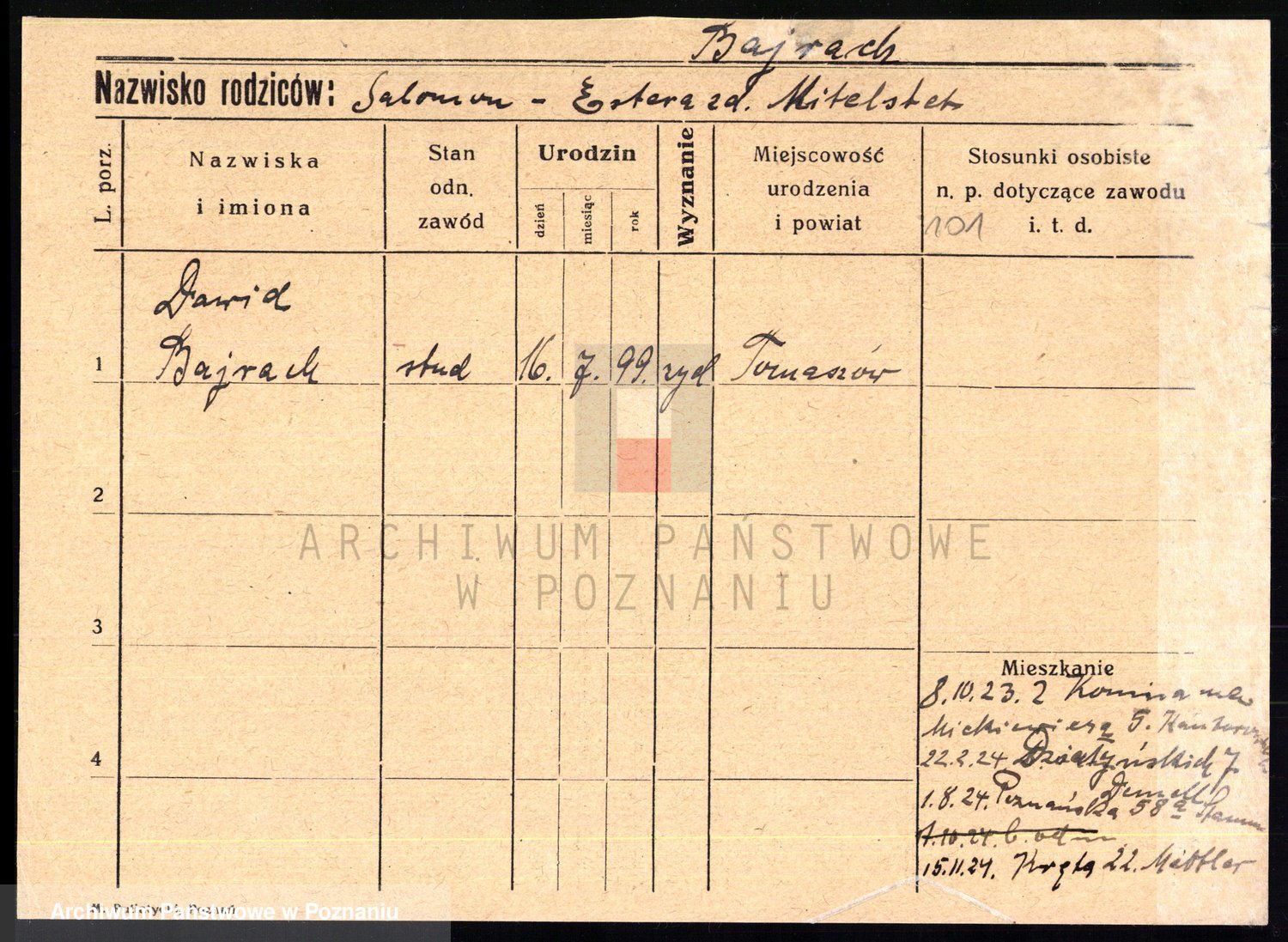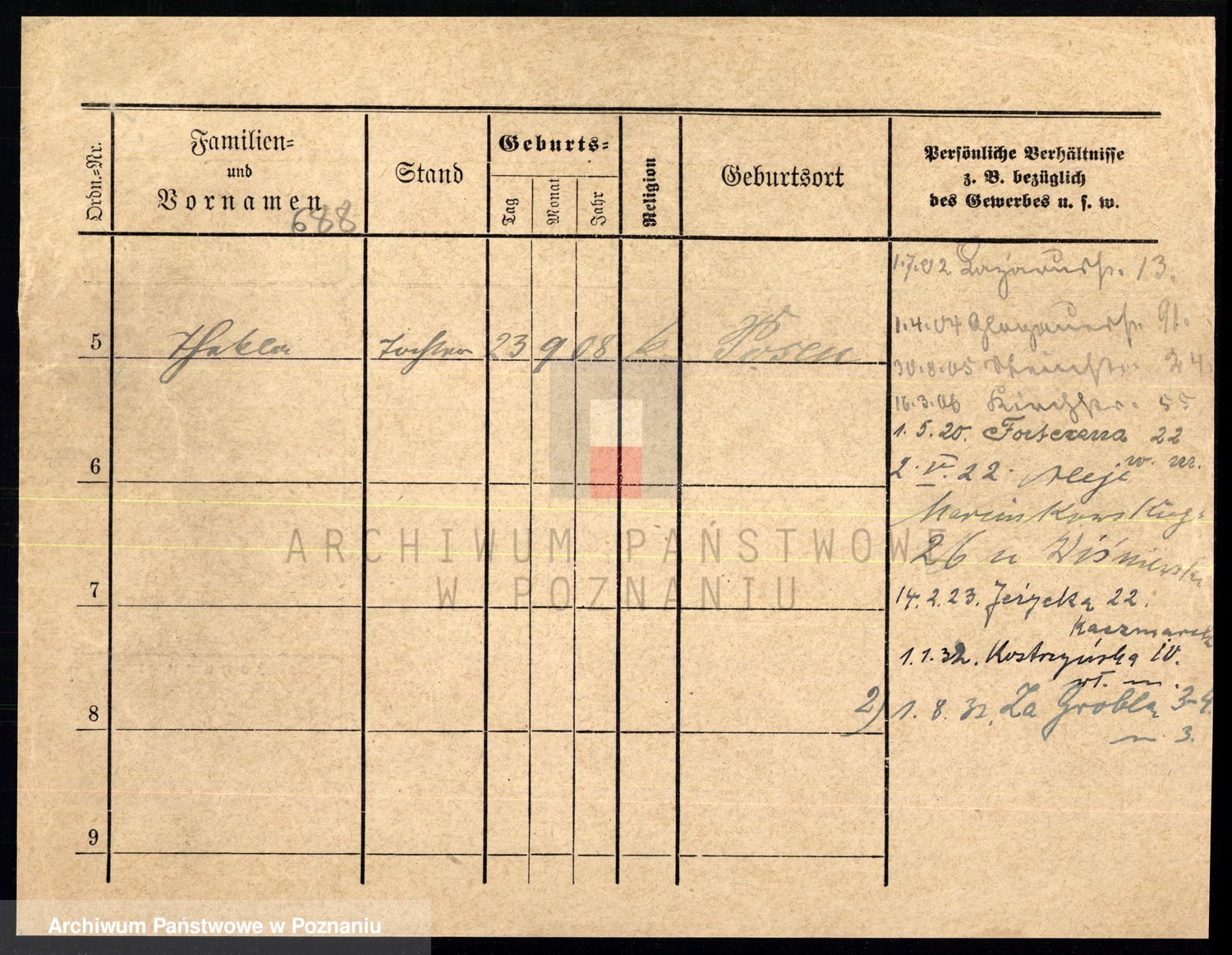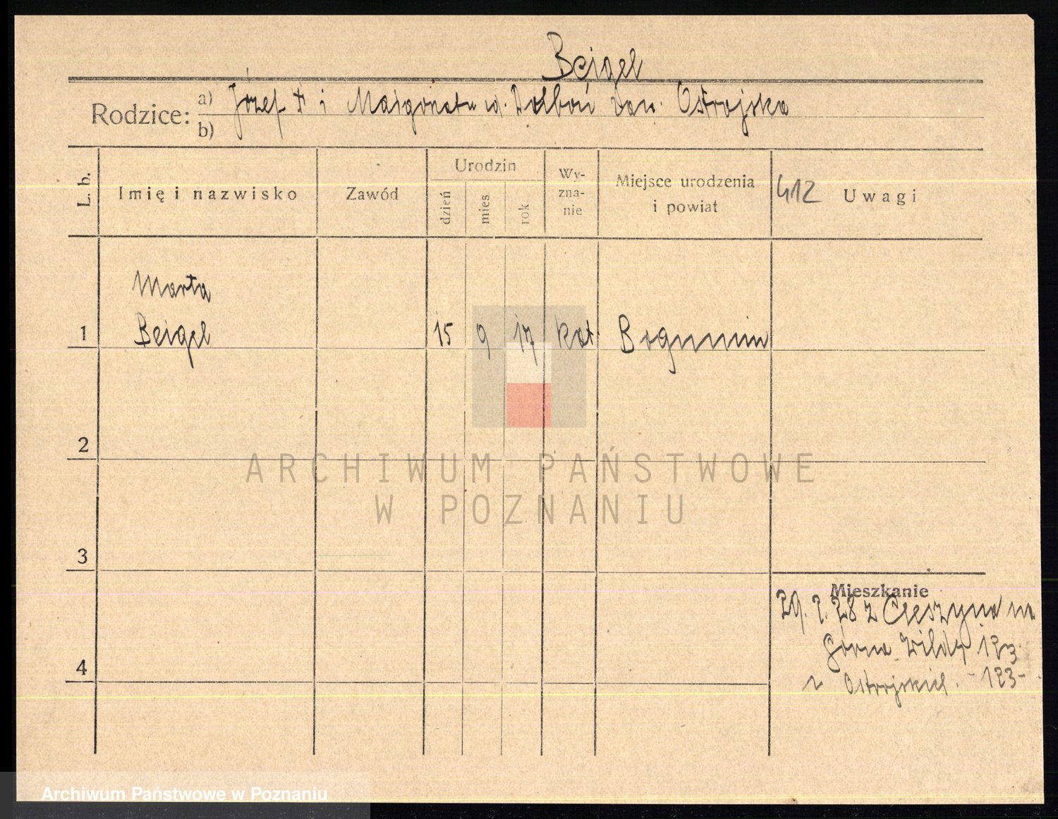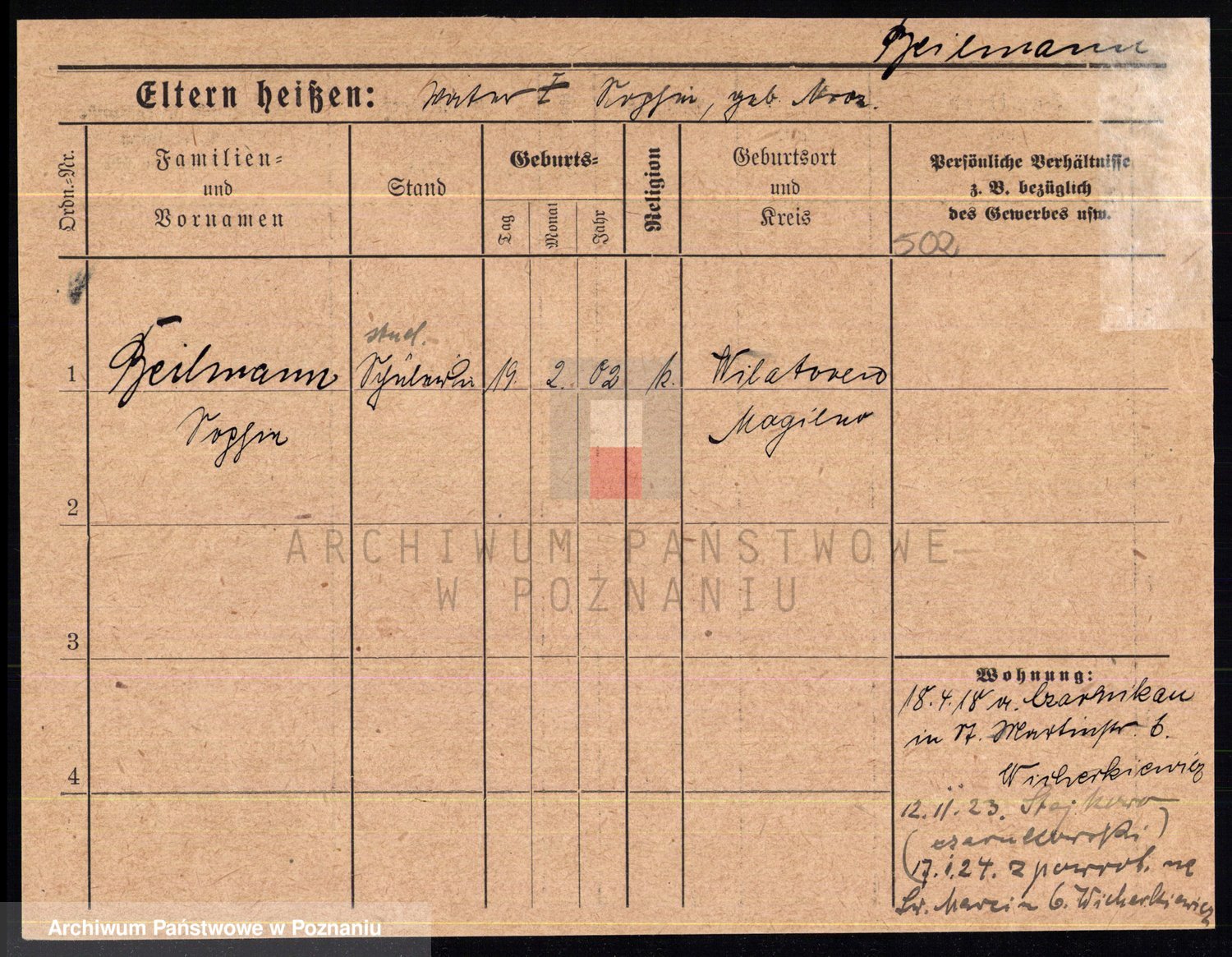 Podgląd karty osobowej dostępny jest po kliknięciu na nazwisko lub ikonkę karty. Można dokonywać powiększenia (ikony na górze) lub przechodzić między kolejnymi skanami (strzałki po bokach).