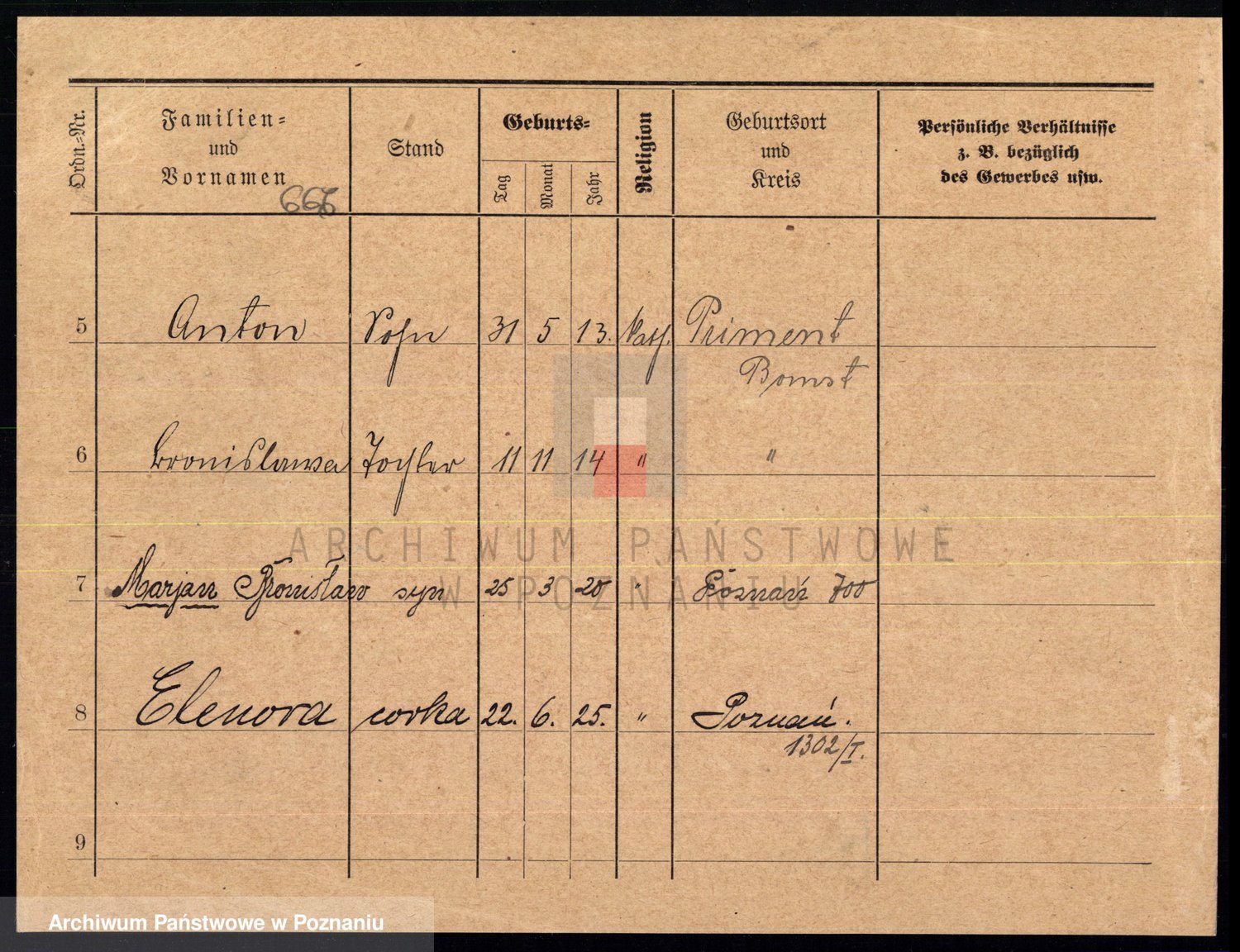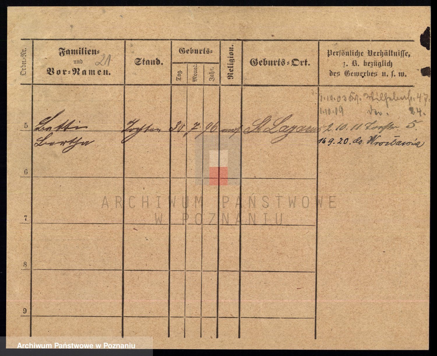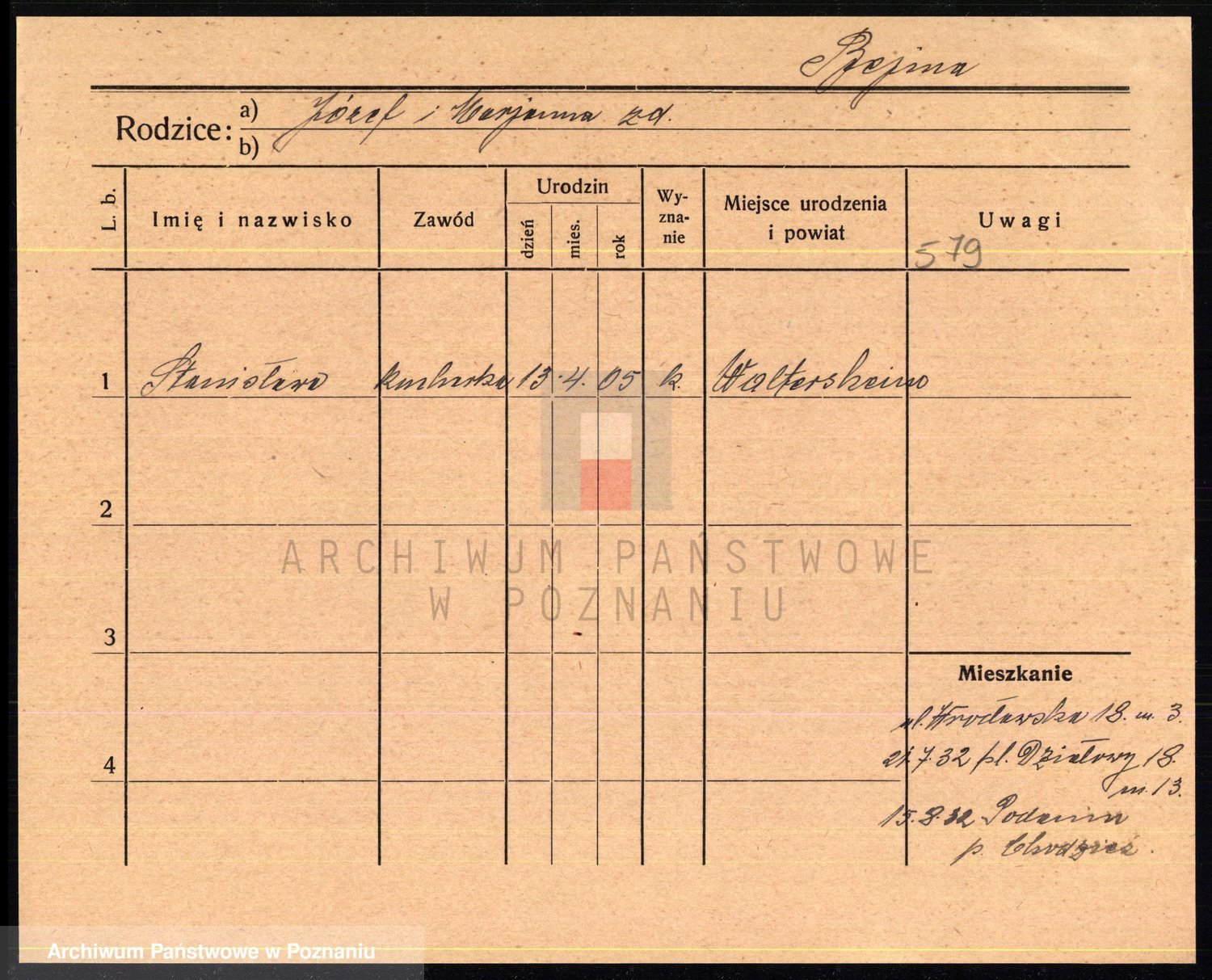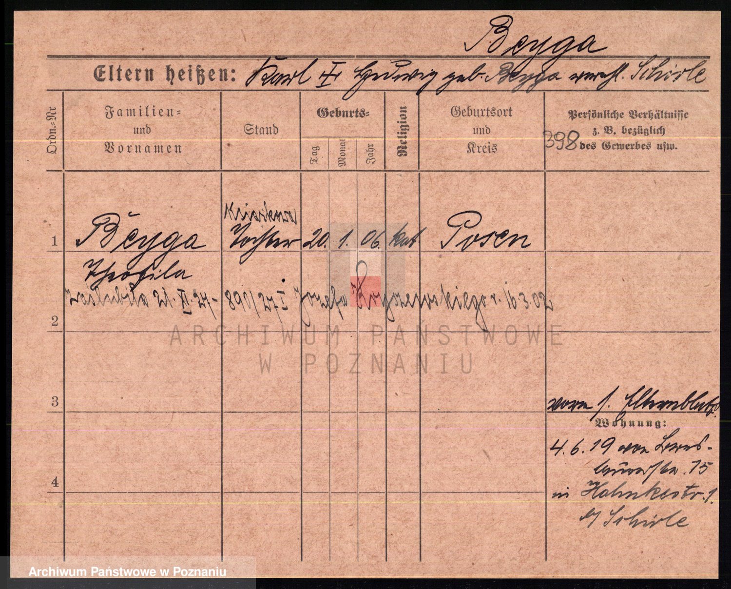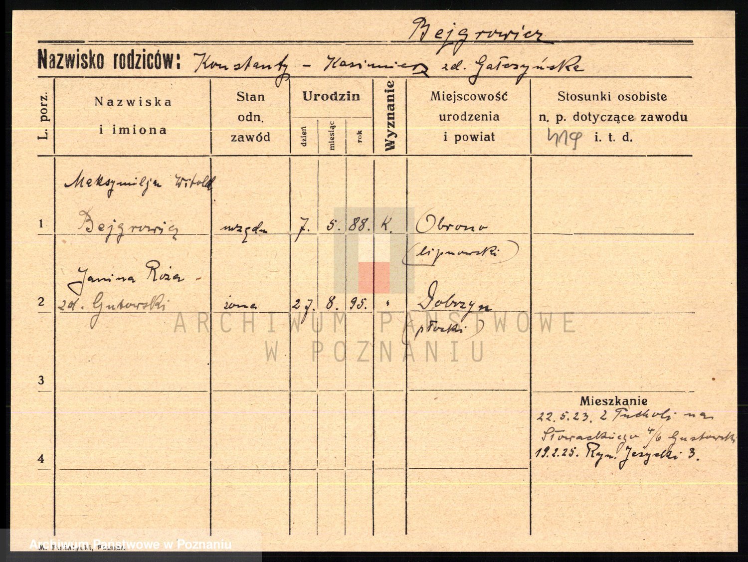 Podgląd karty osobowej dostępny jest po kliknięciu na nazwisko lub ikonkę karty. Można dokonywać powiększenia (ikony na górze) lub przechodzić między kolejnymi skanami (strzałki po bokach).