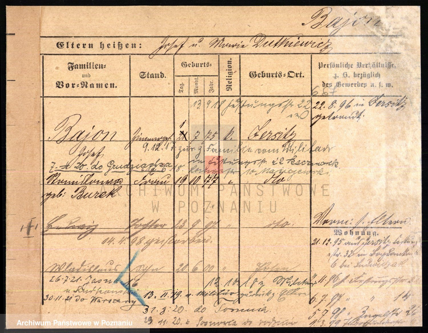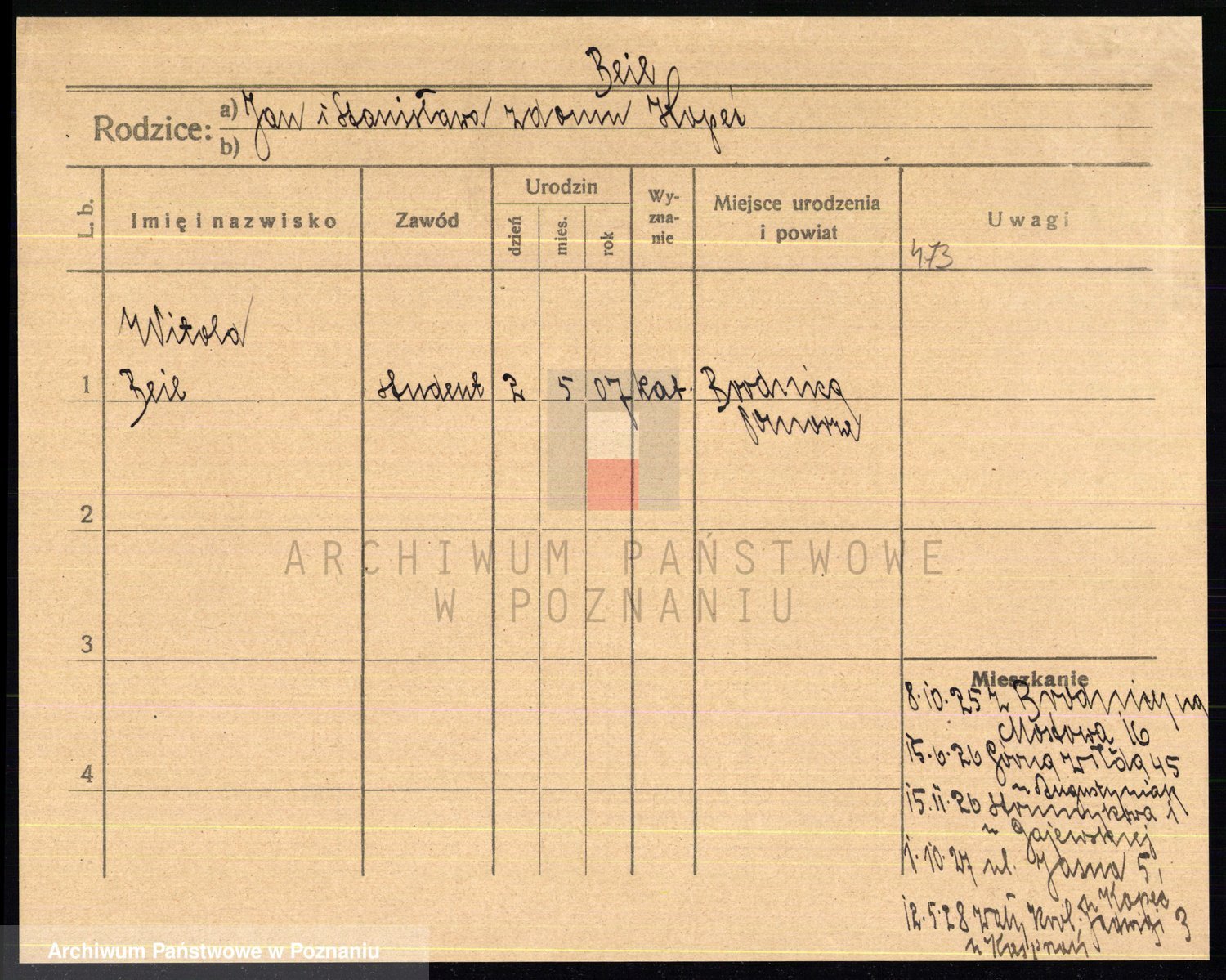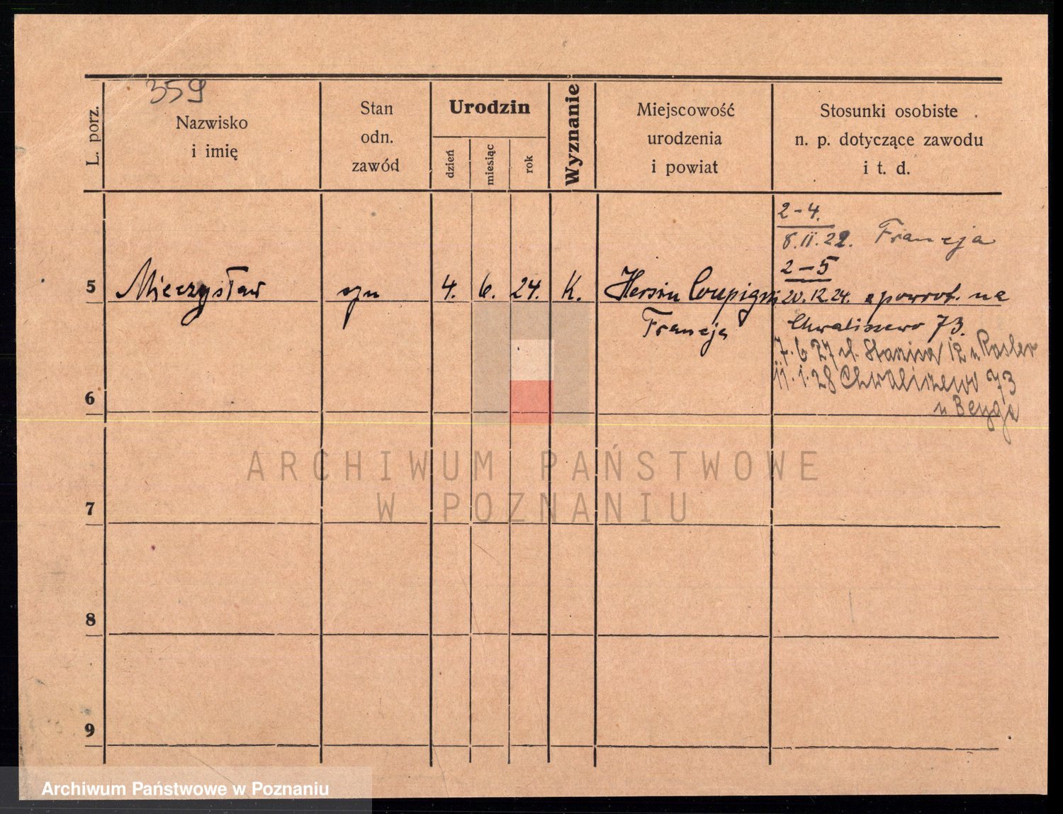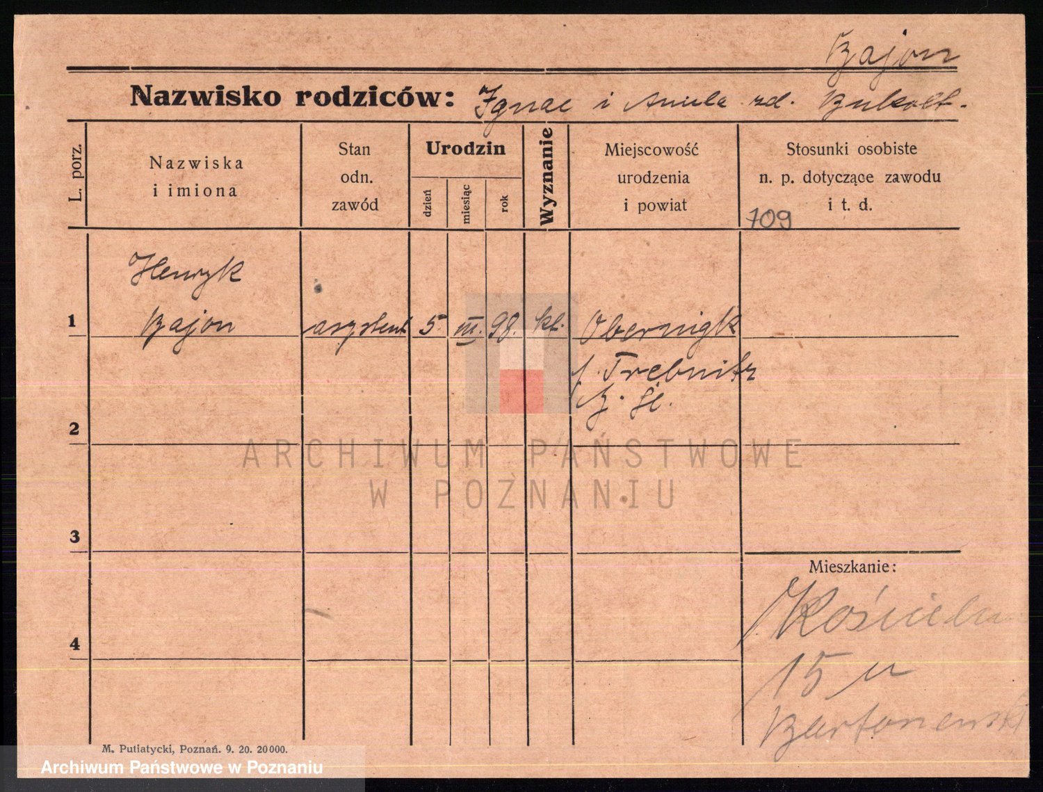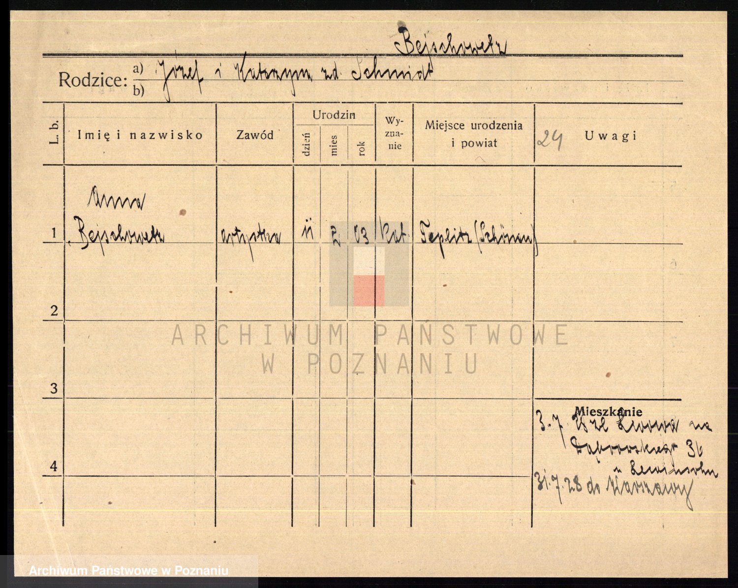 Podgląd karty osobowej dostępny jest po kliknięciu na nazwisko lub ikonkę karty. Można dokonywać powiększenia (ikony na górze) lub przechodzić między kolejnymi skanami (strzałki po bokach).