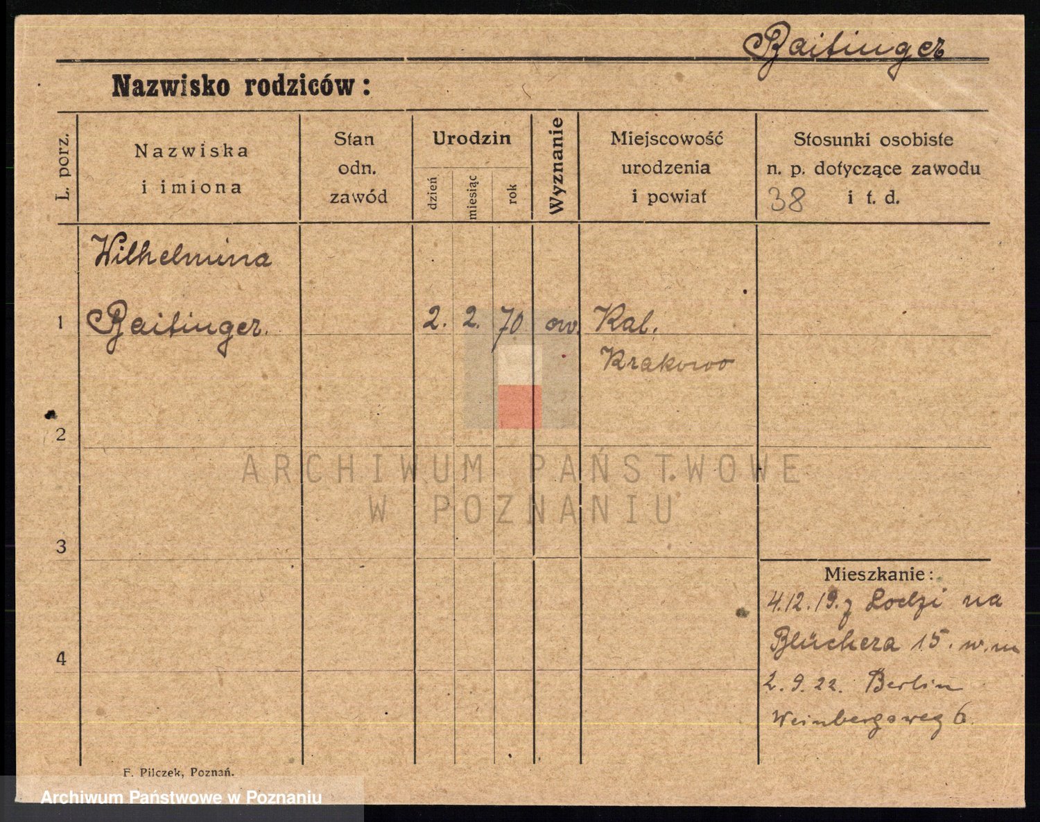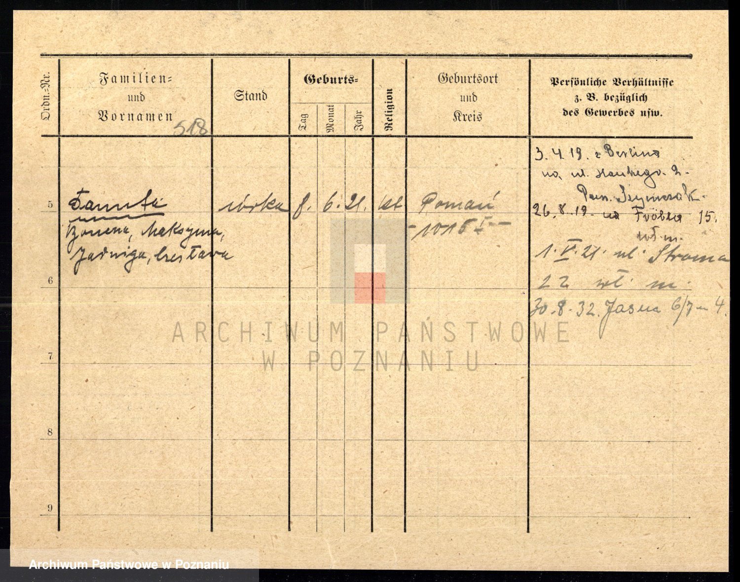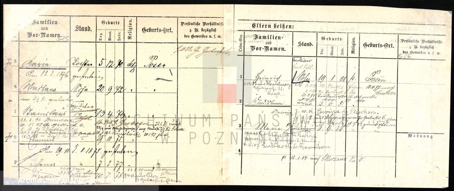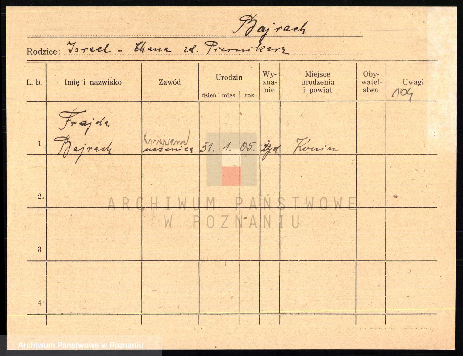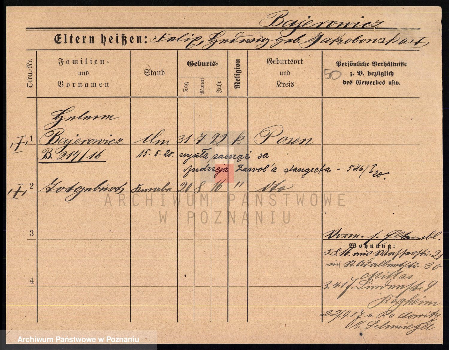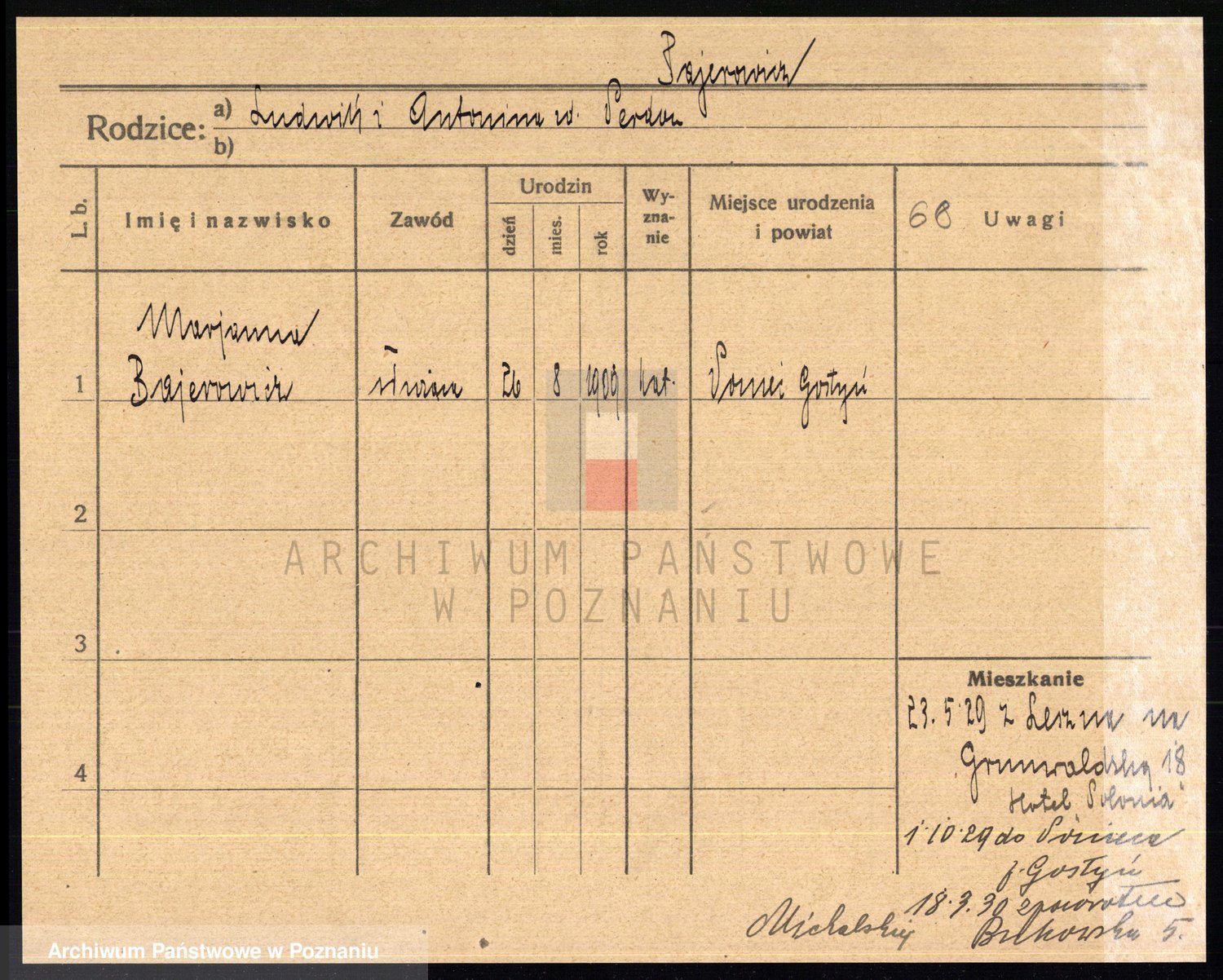 Podgląd karty osobowej dostępny jest po kliknięciu na nazwisko lub ikonkę karty. Można dokonywać powiększenia (ikony na górze) lub przechodzić między kolejnymi skanami (strzałki po bokach).