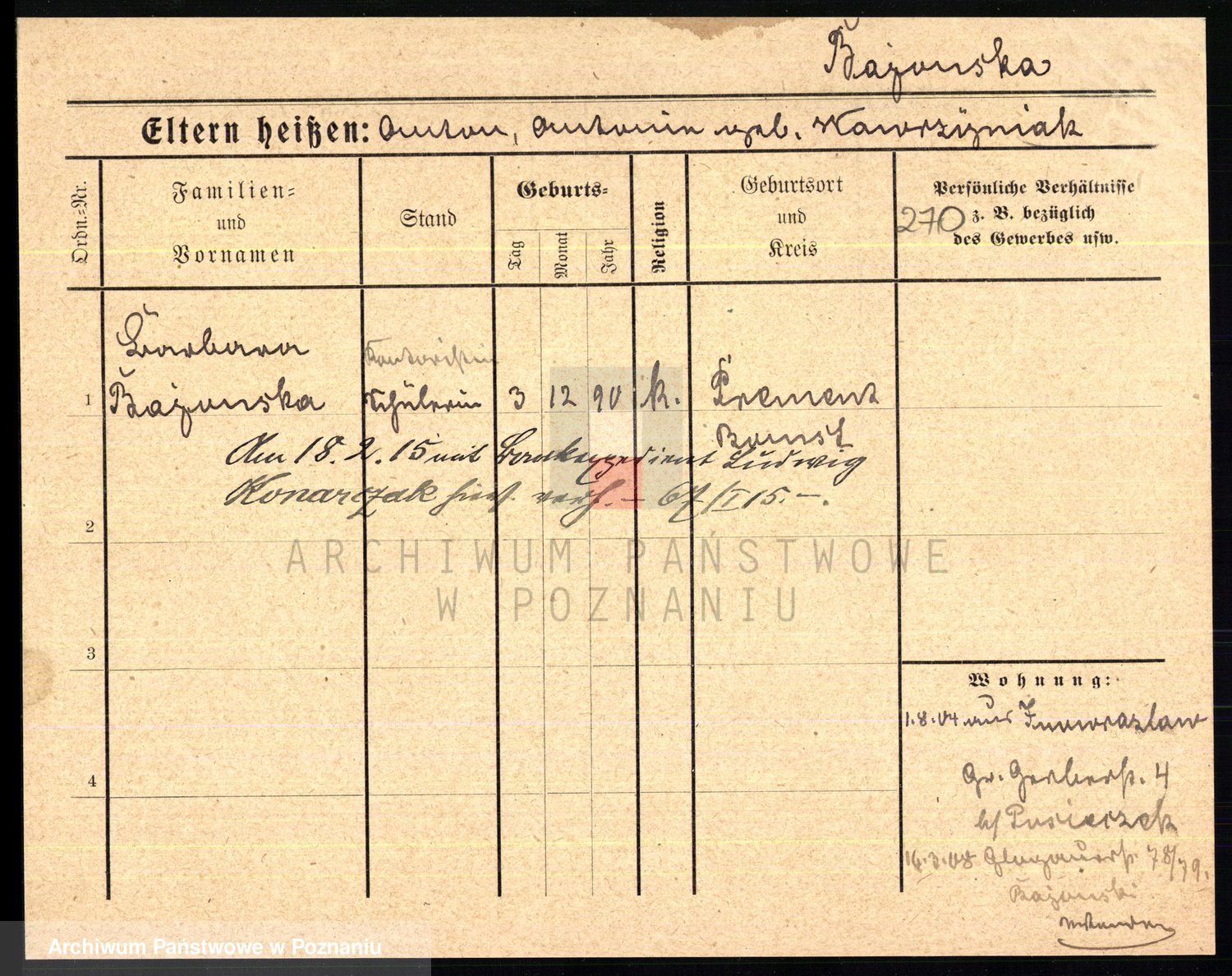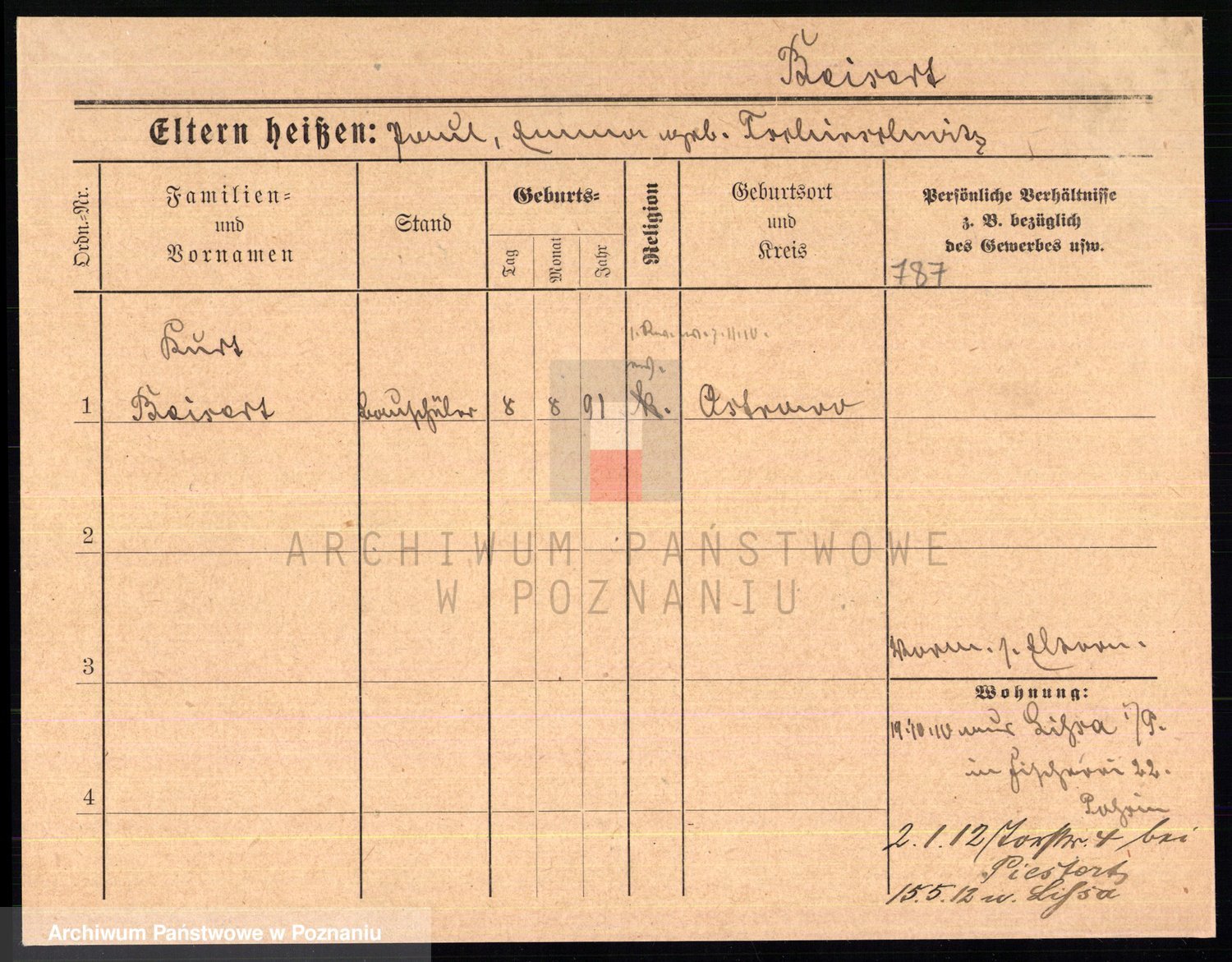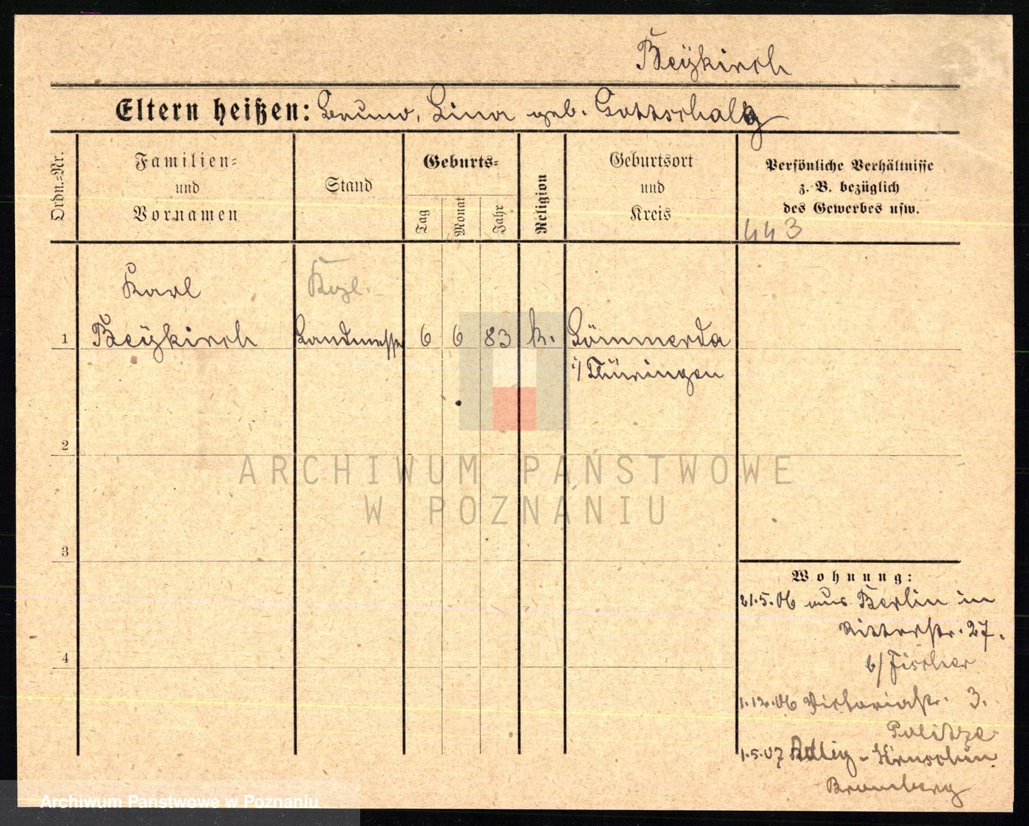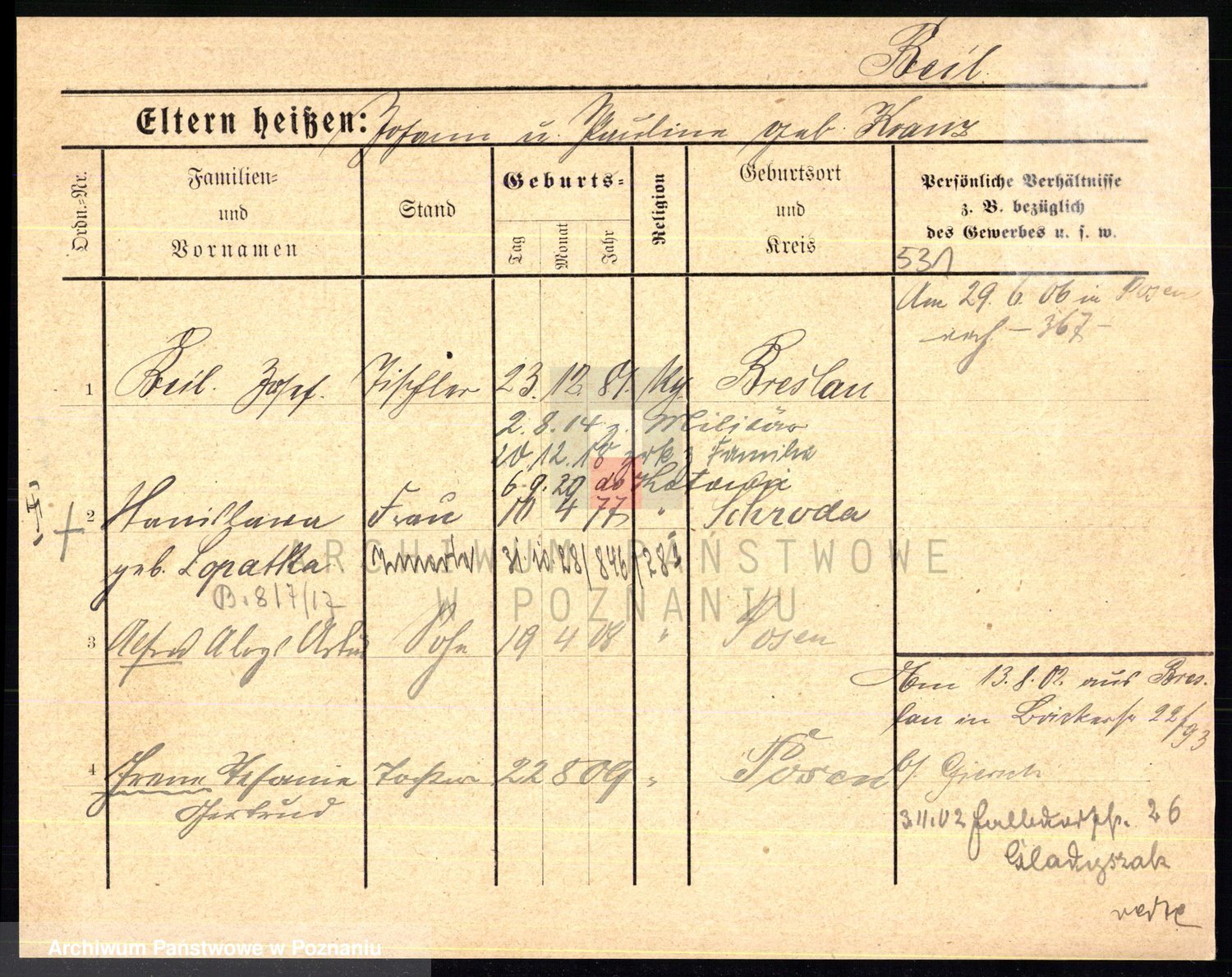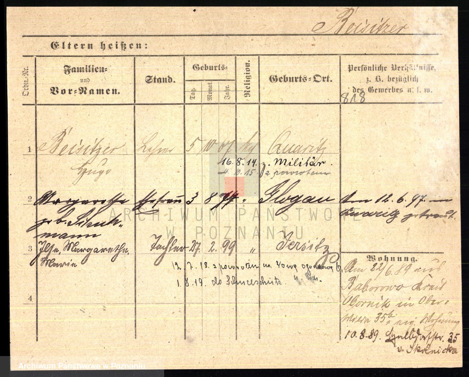 Podgląd karty osobowej dostępny jest po kliknięciu na nazwisko lub ikonkę karty. Można dokonywać powiększenia (ikony na górze) lub przechodzić między kolejnymi skanami (strzałki po bokach).