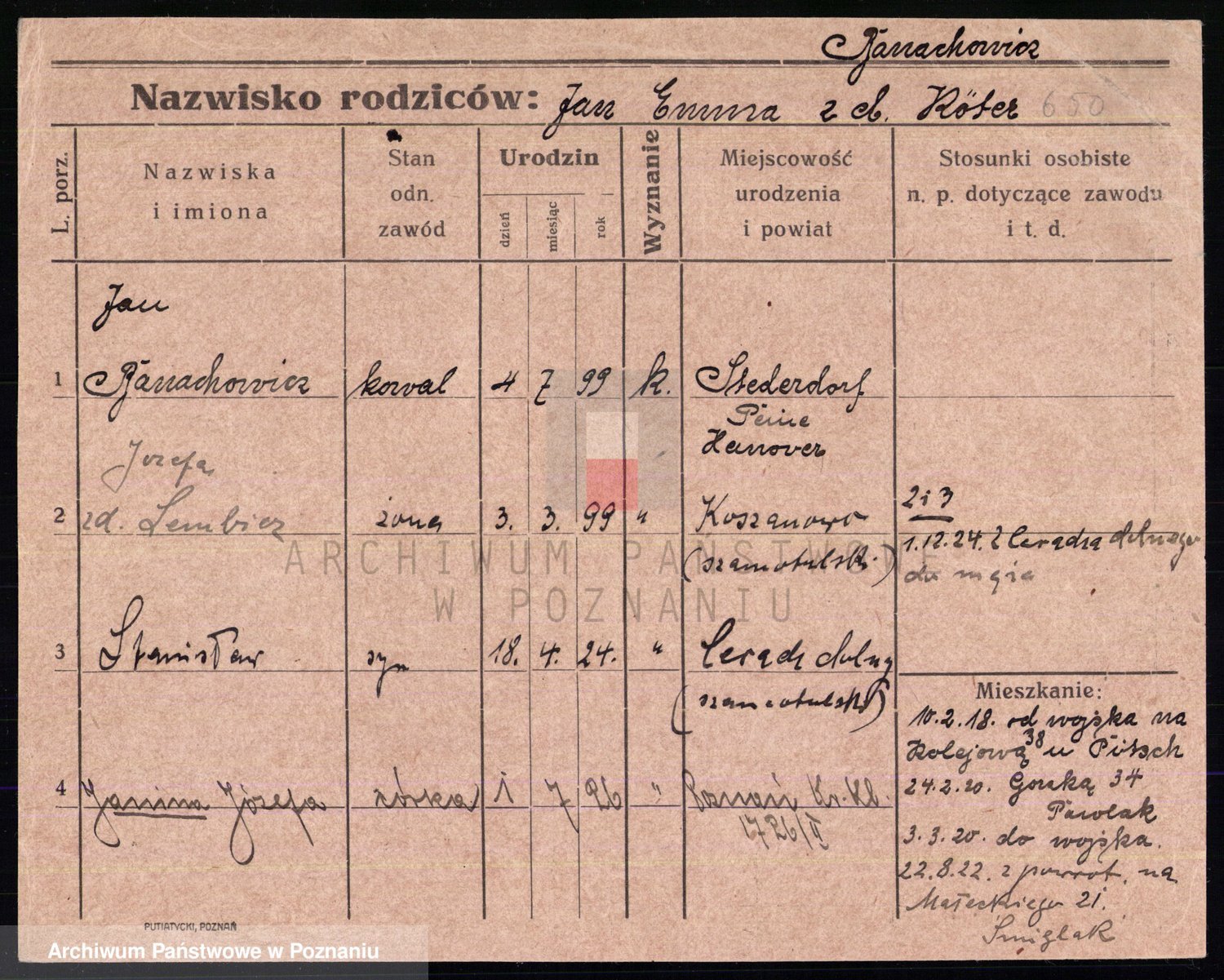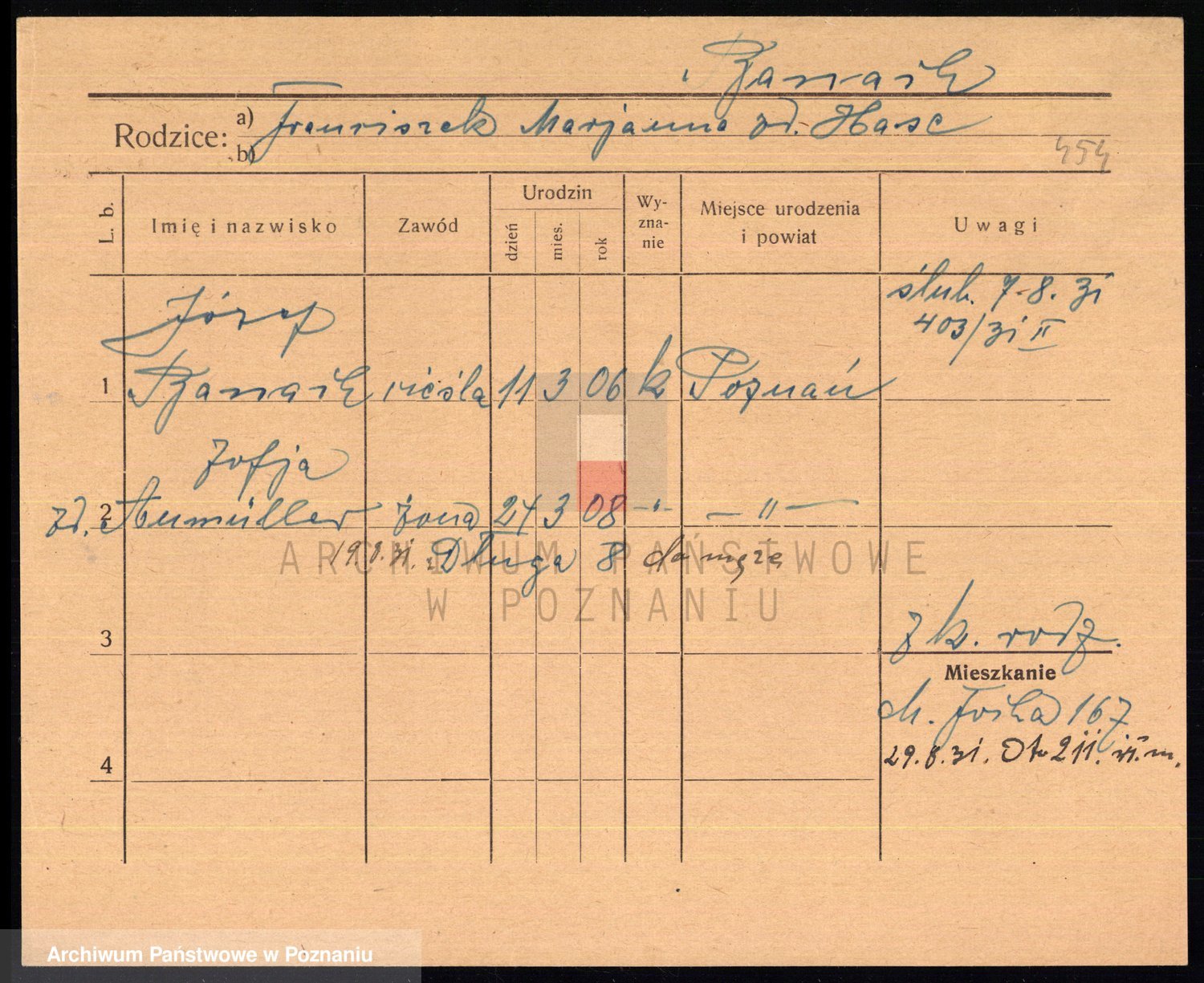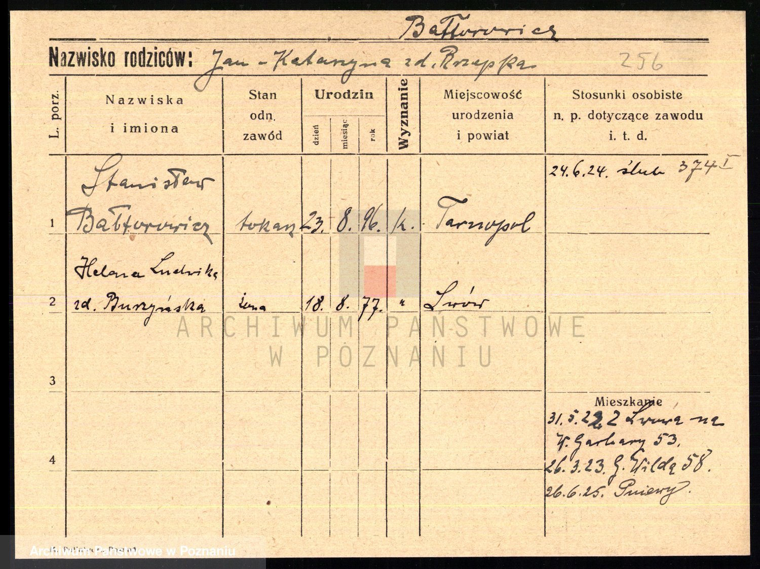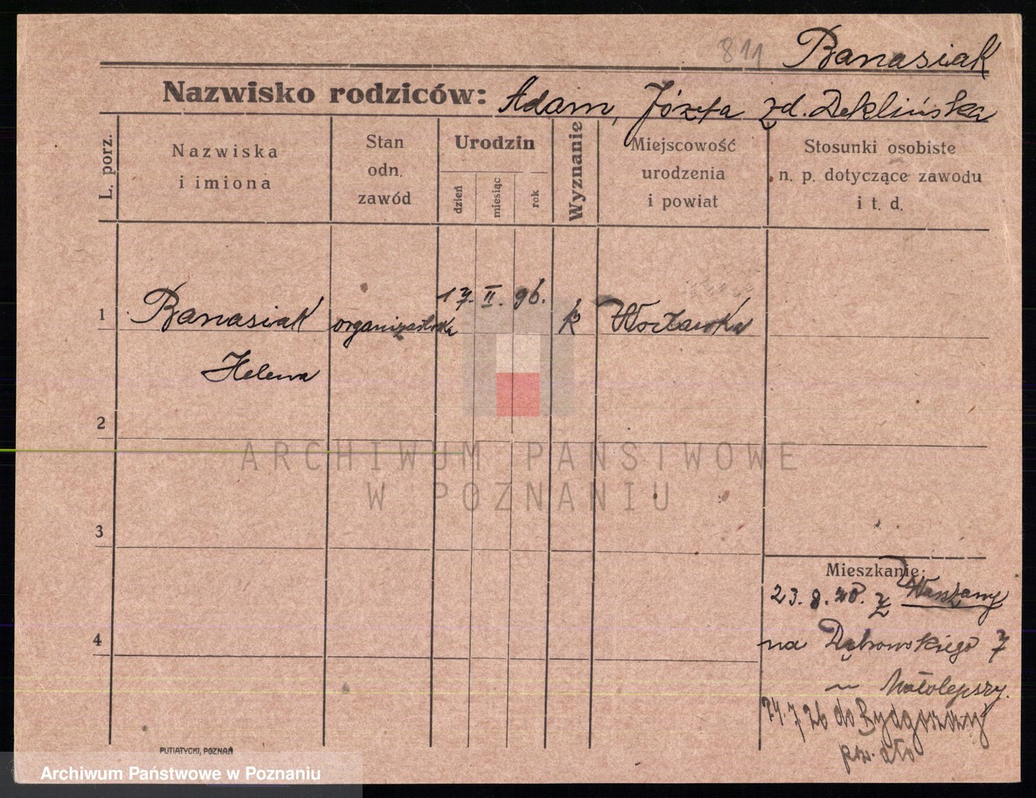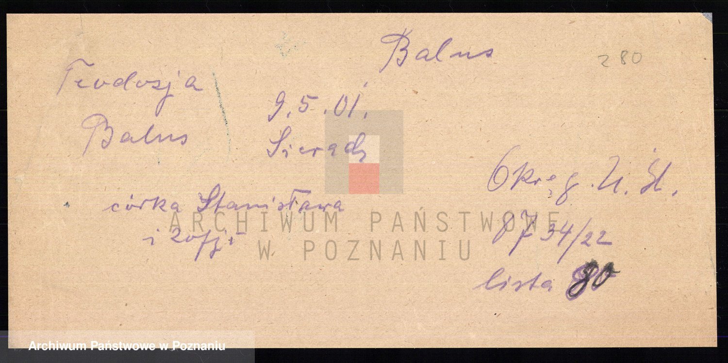 Podgląd karty osobowej dostępny jest po kliknięciu na nazwisko lub ikonkę karty. Można dokonywać powiększenia (ikony na górze) lub przechodzić między kolejnymi skanami (strzałki po bokach).