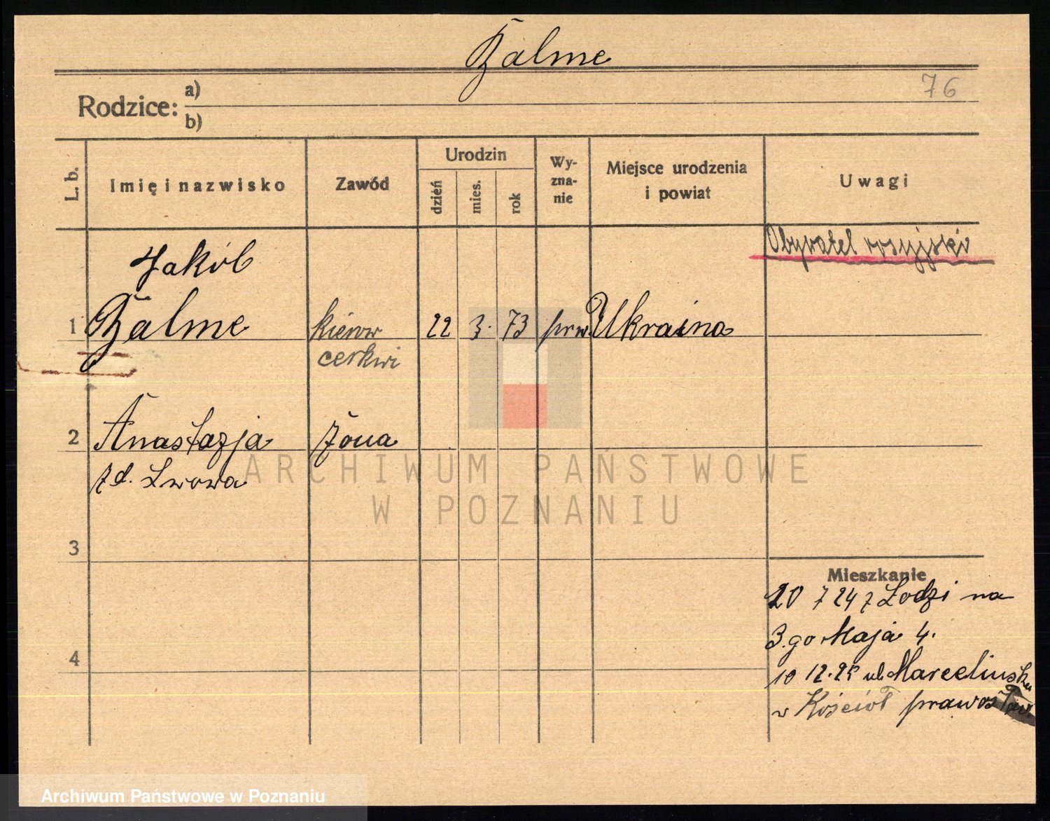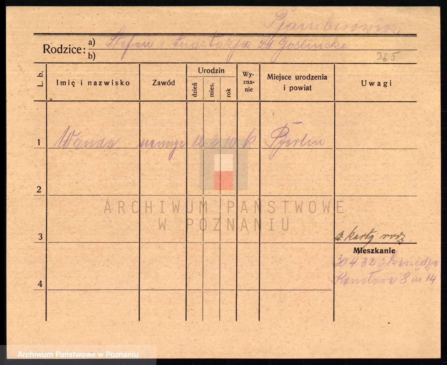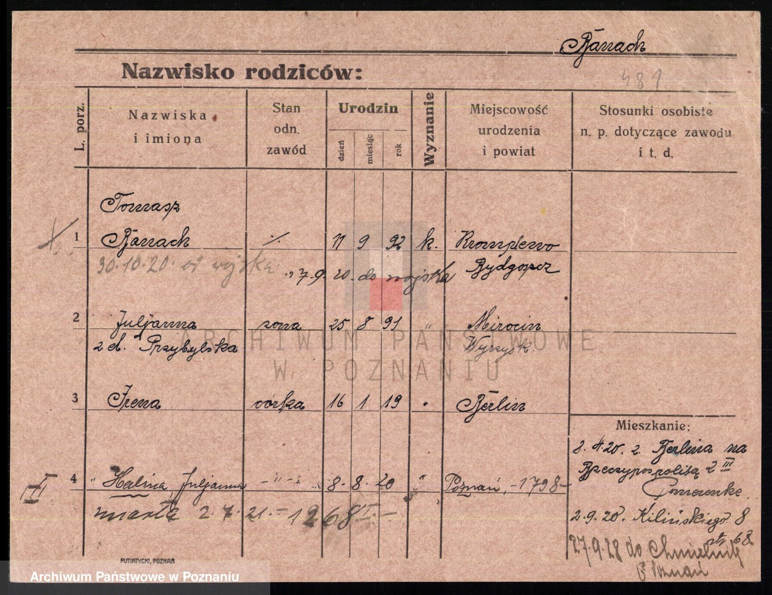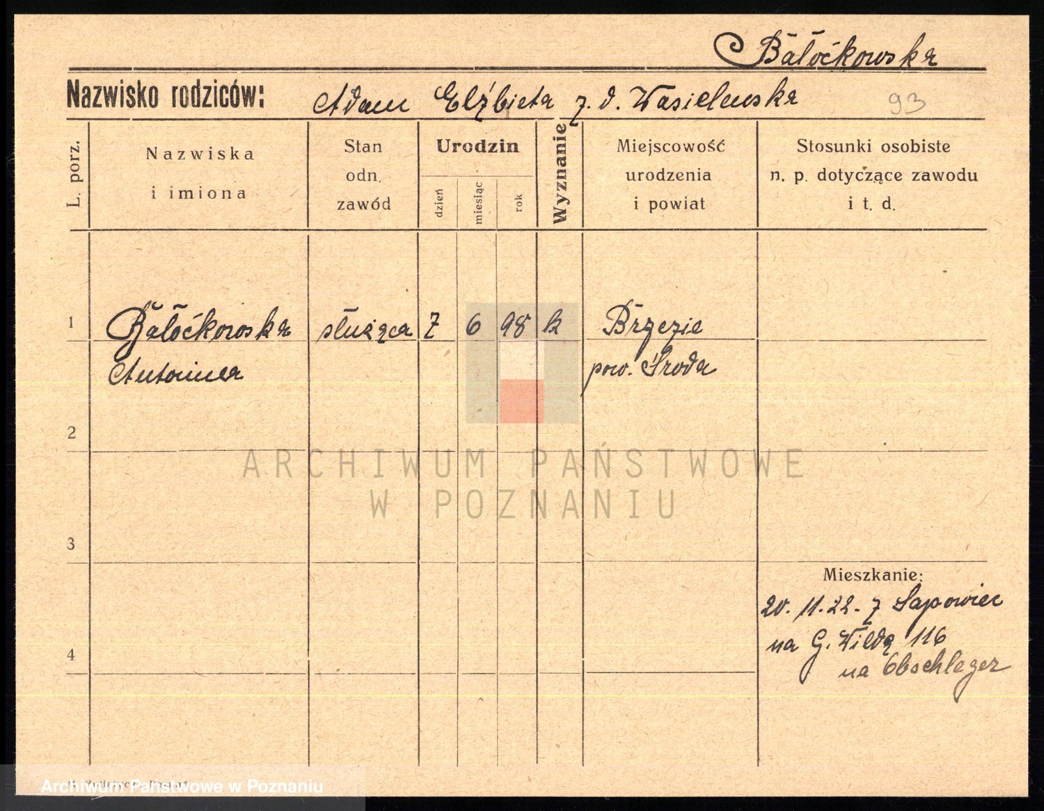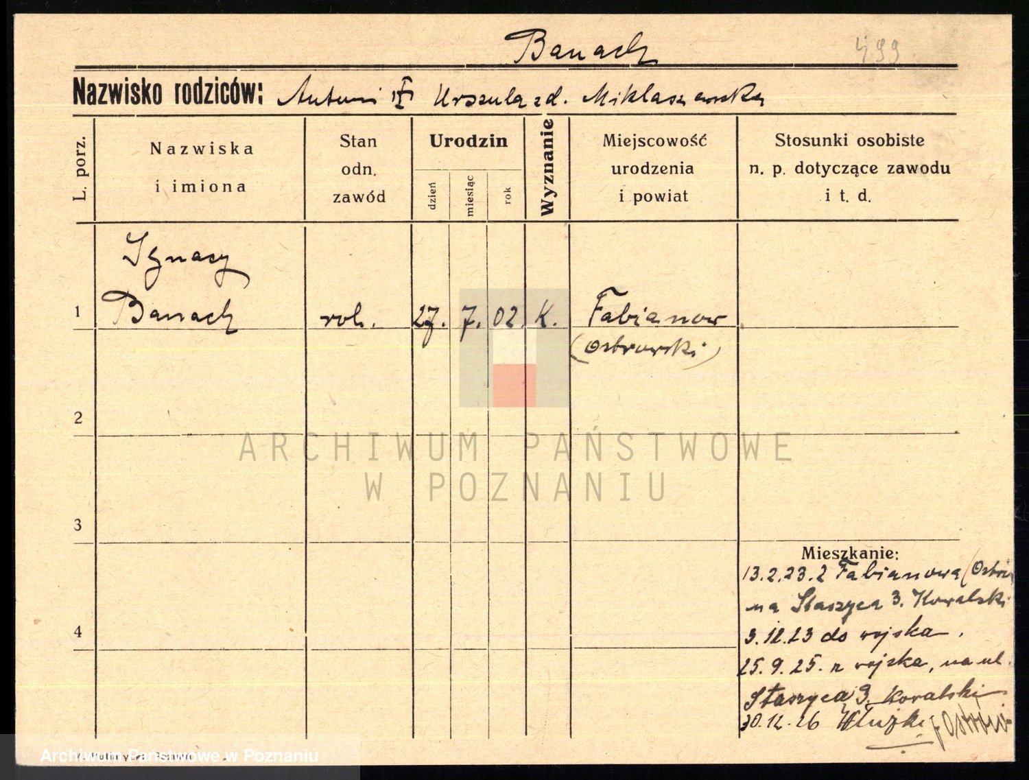 Podgląd karty osobowej dostępny jest po kliknięciu na nazwisko lub ikonkę karty. Można dokonywać powiększenia (ikony na górze) lub przechodzić między kolejnymi skanami (strzałki po bokach).