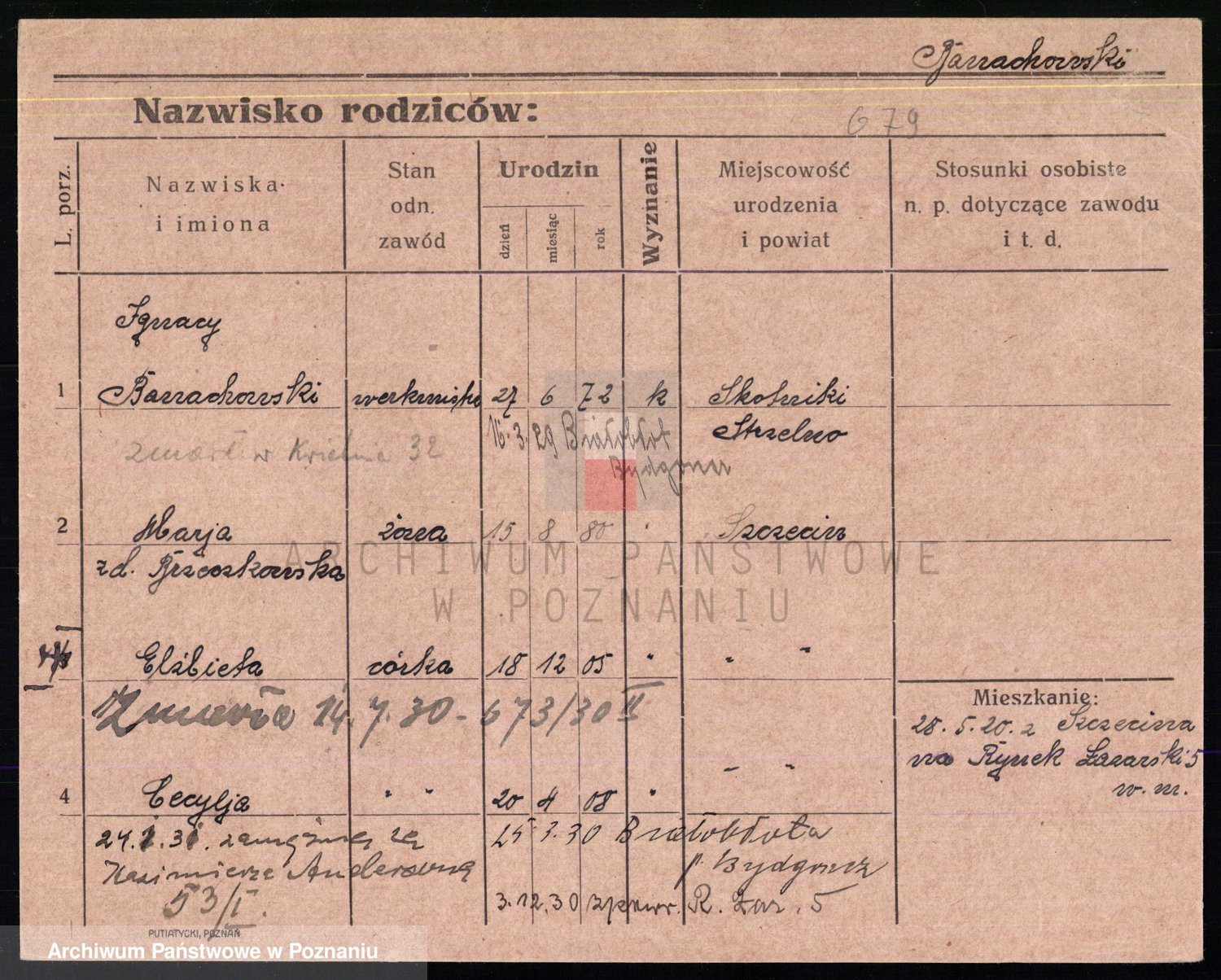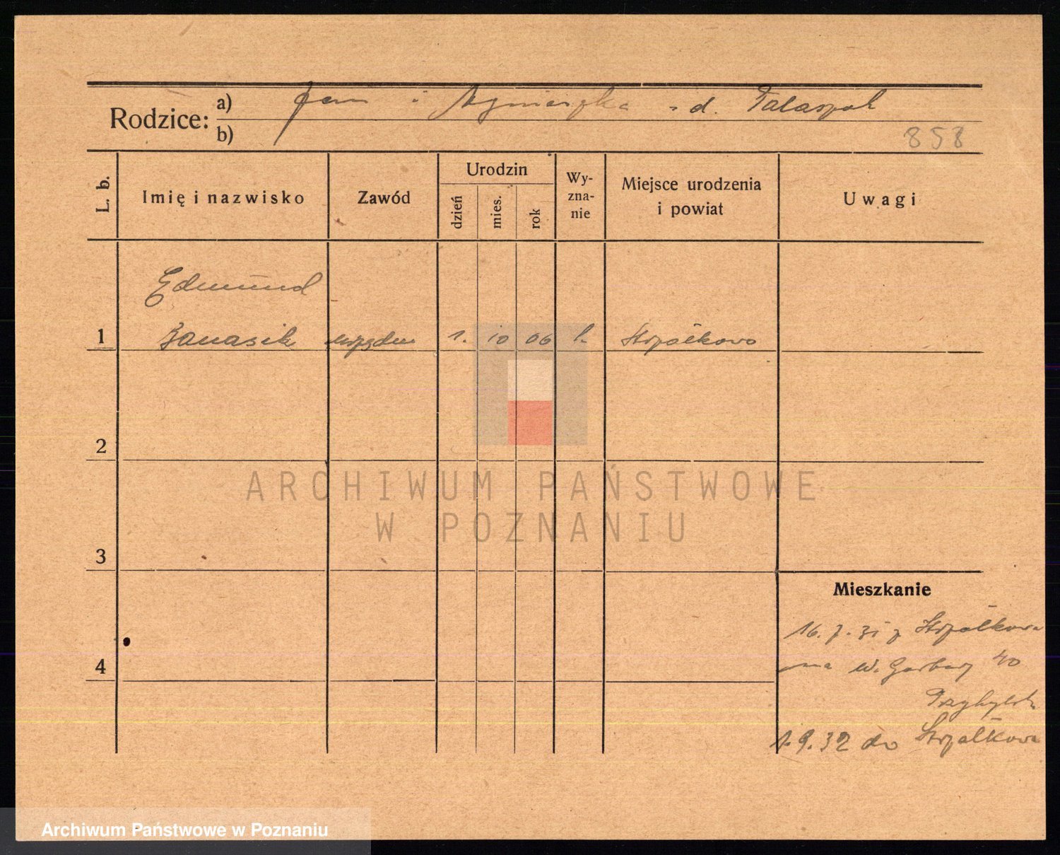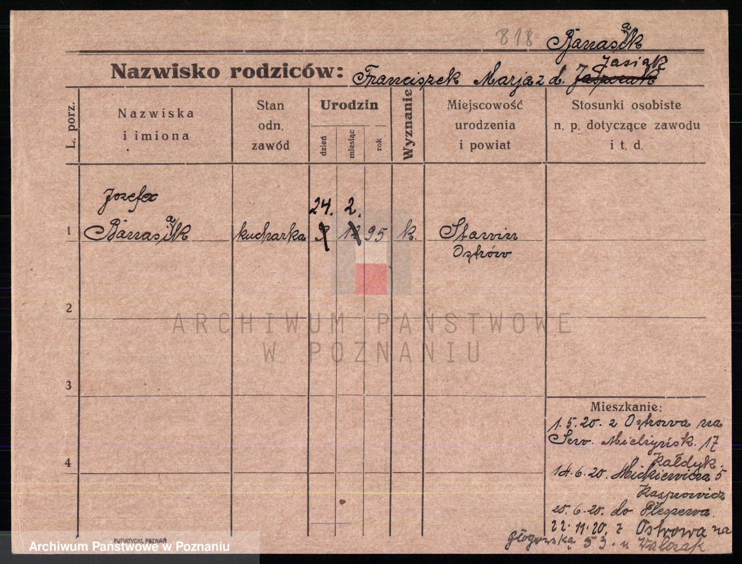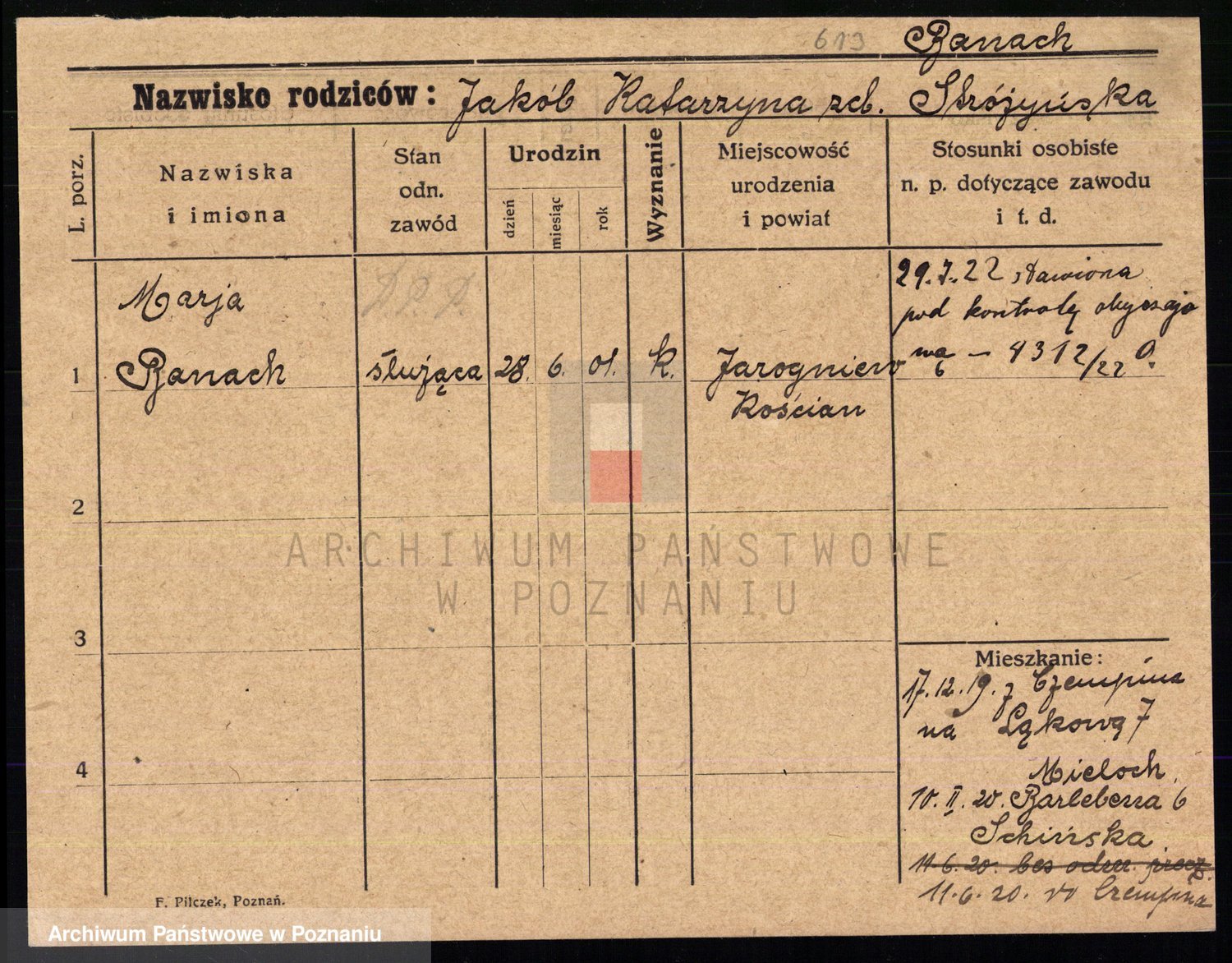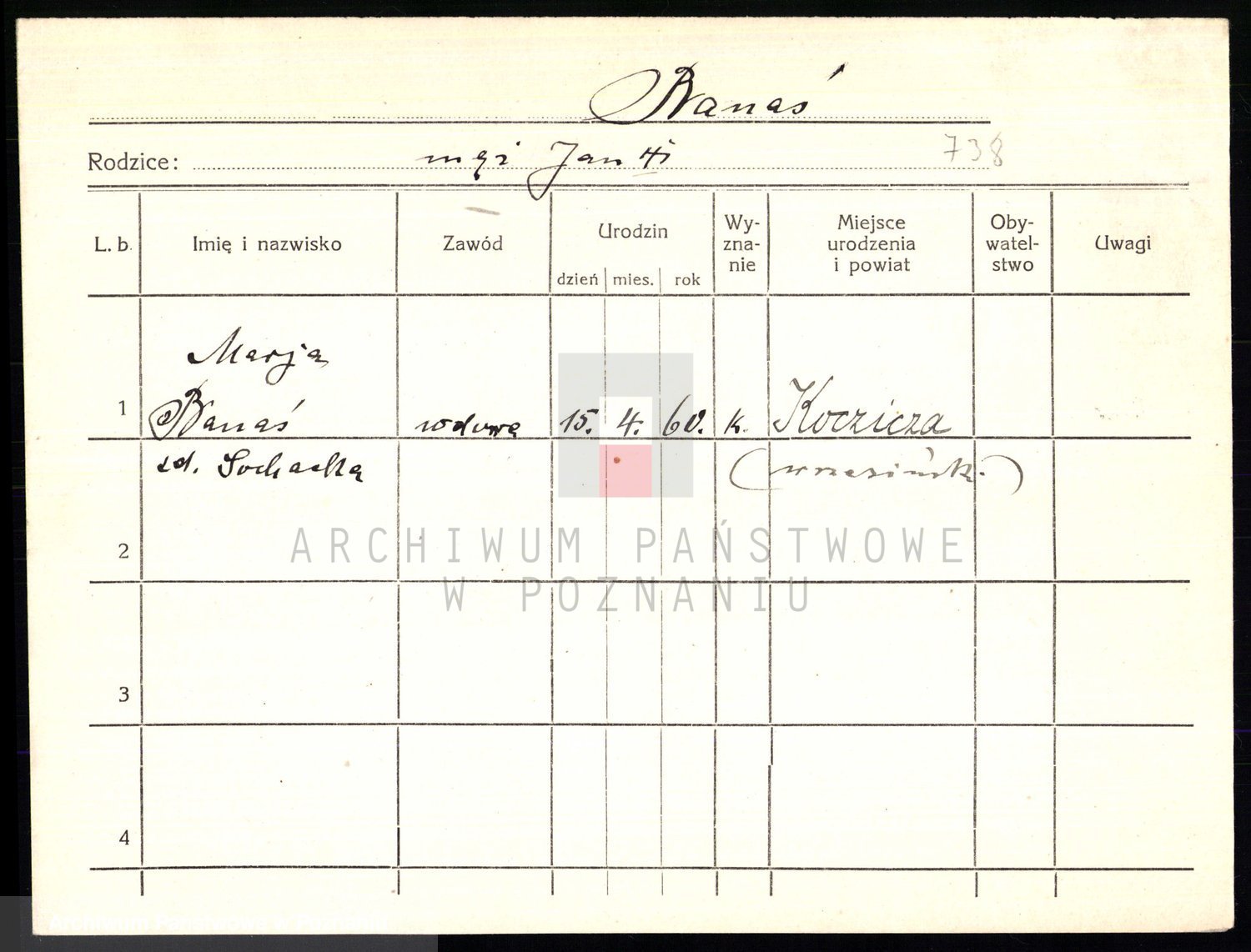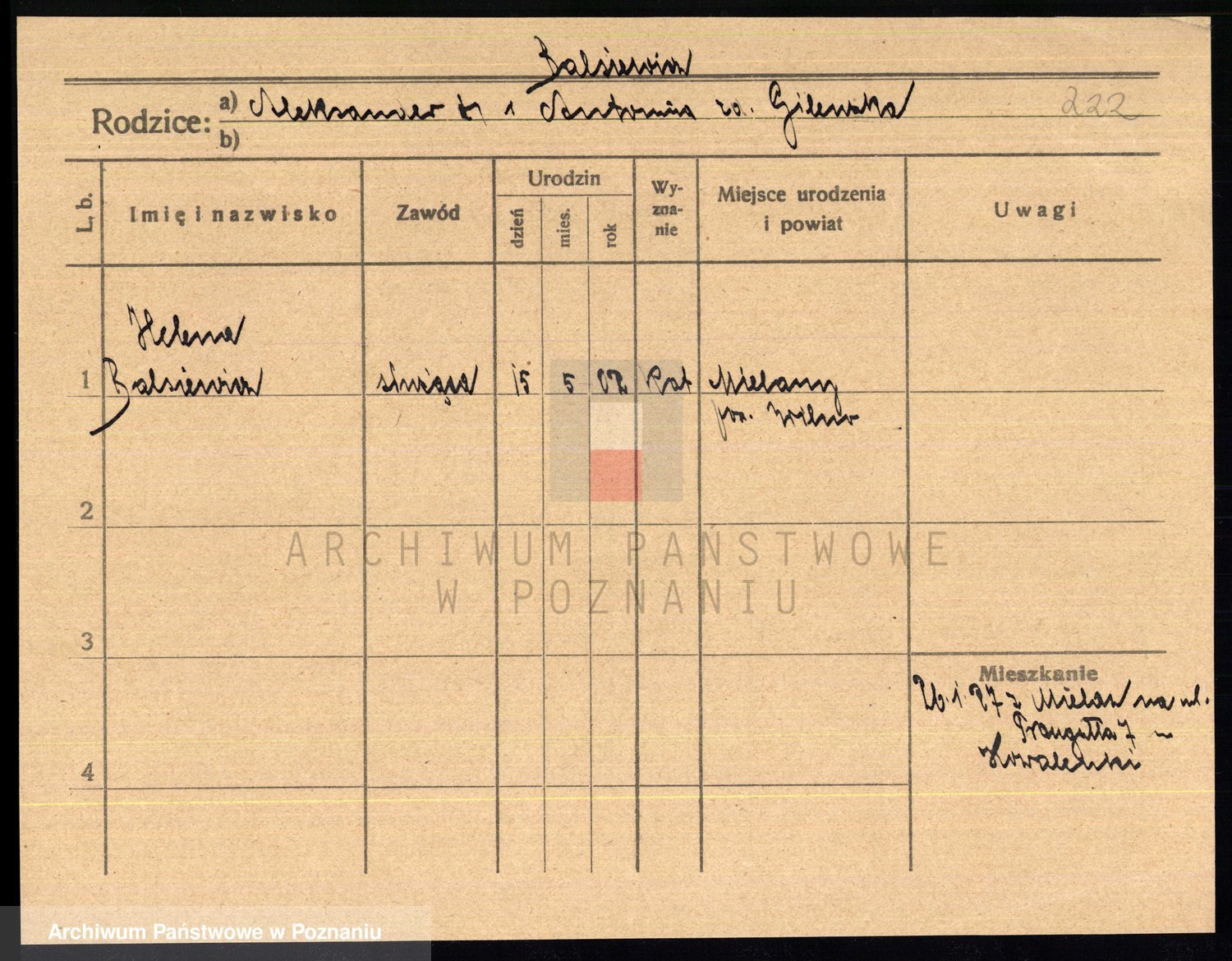Podgląd karty osobowej dostępny jest po kliknięciu na nazwisko lub ikonkę karty. Można dokonywać powiększenia (ikony na górze) lub przechodzić między kolejnymi skanami (strzałki po bokach).