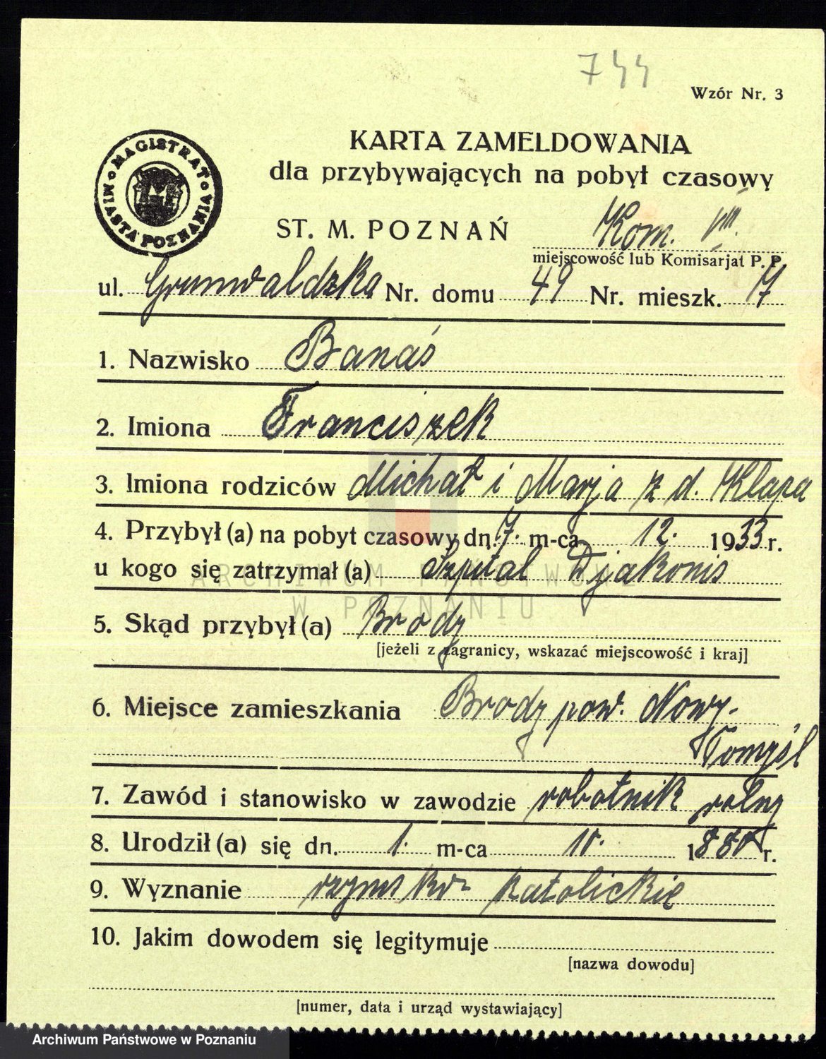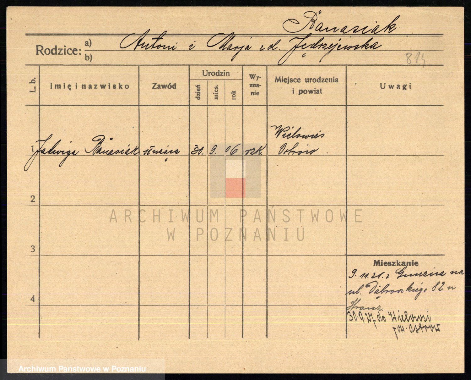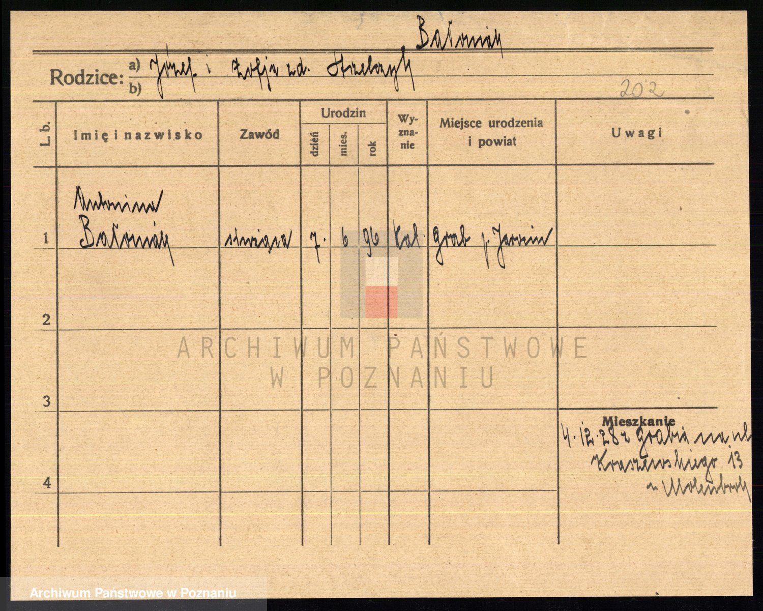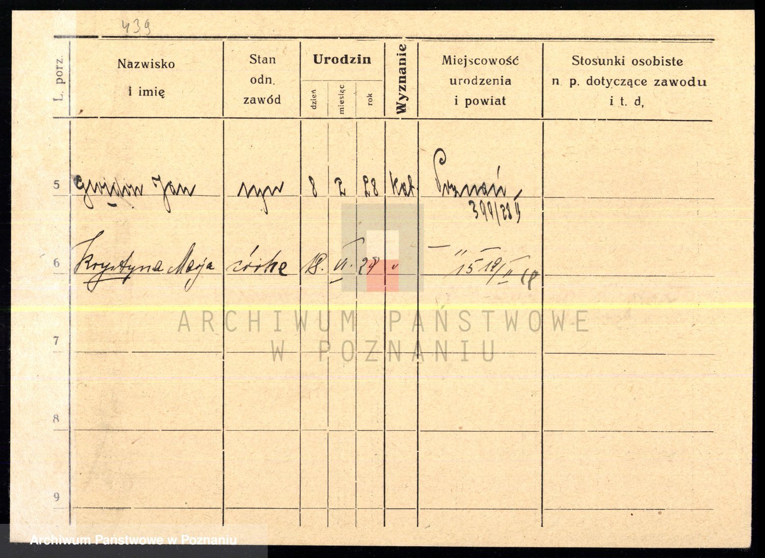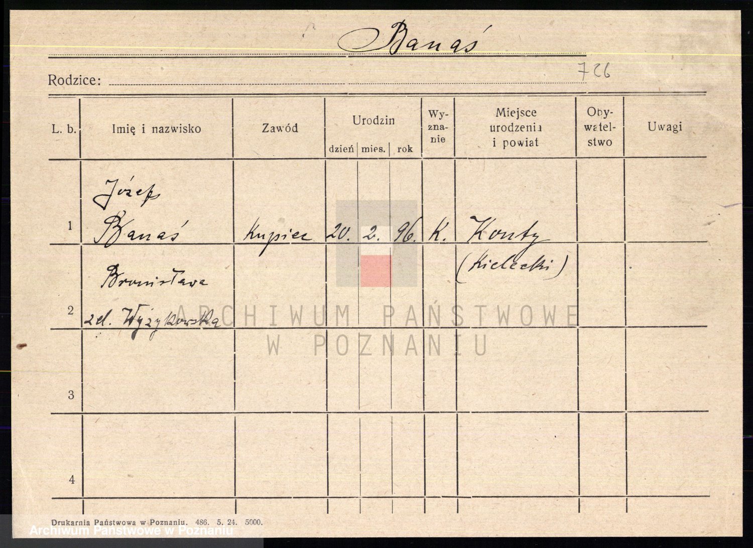 Podgląd karty osobowej dostępny jest po kliknięciu na nazwisko lub ikonkę karty. Można dokonywać powiększenia (ikony na górze) lub przechodzić między kolejnymi skanami (strzałki po bokach).