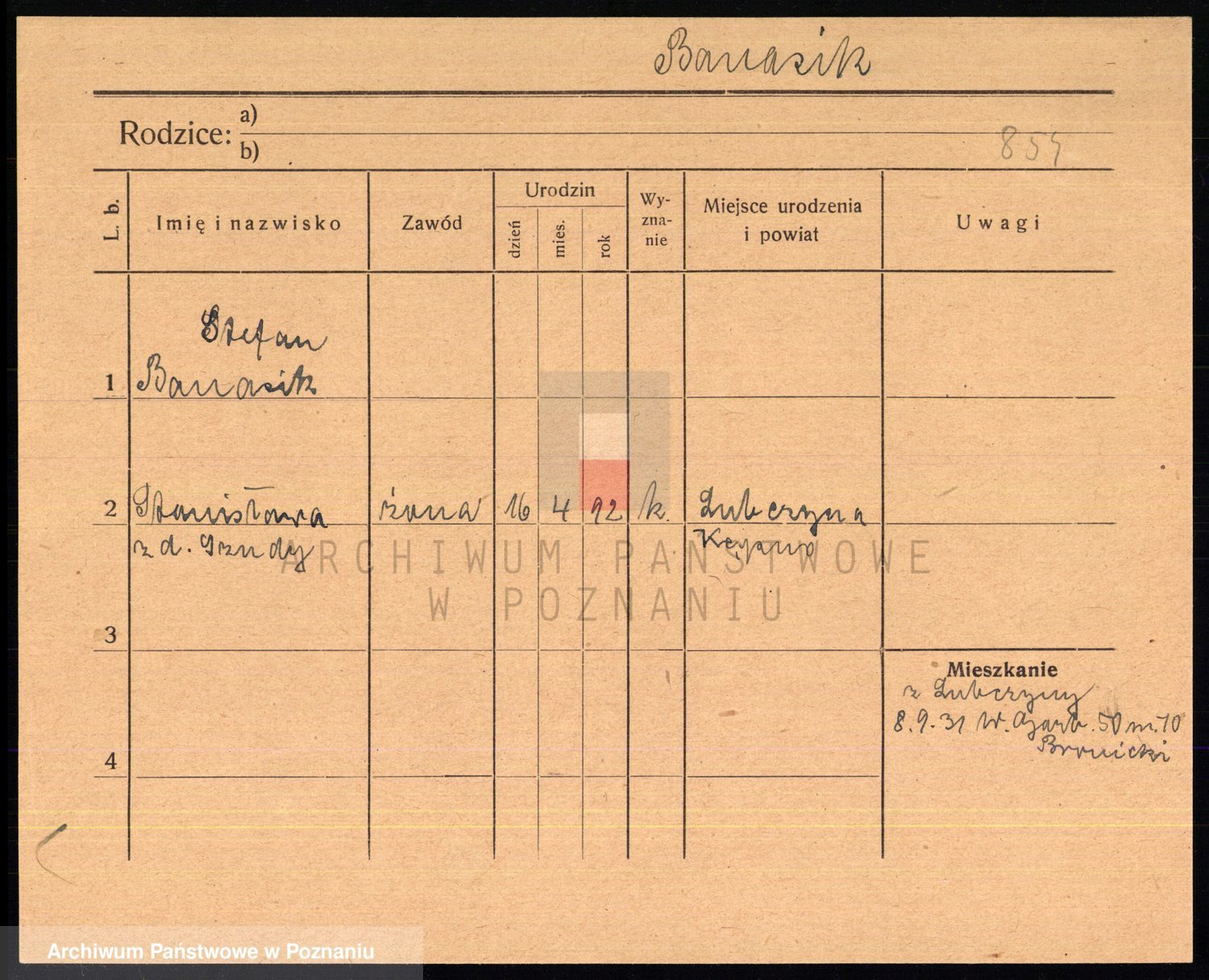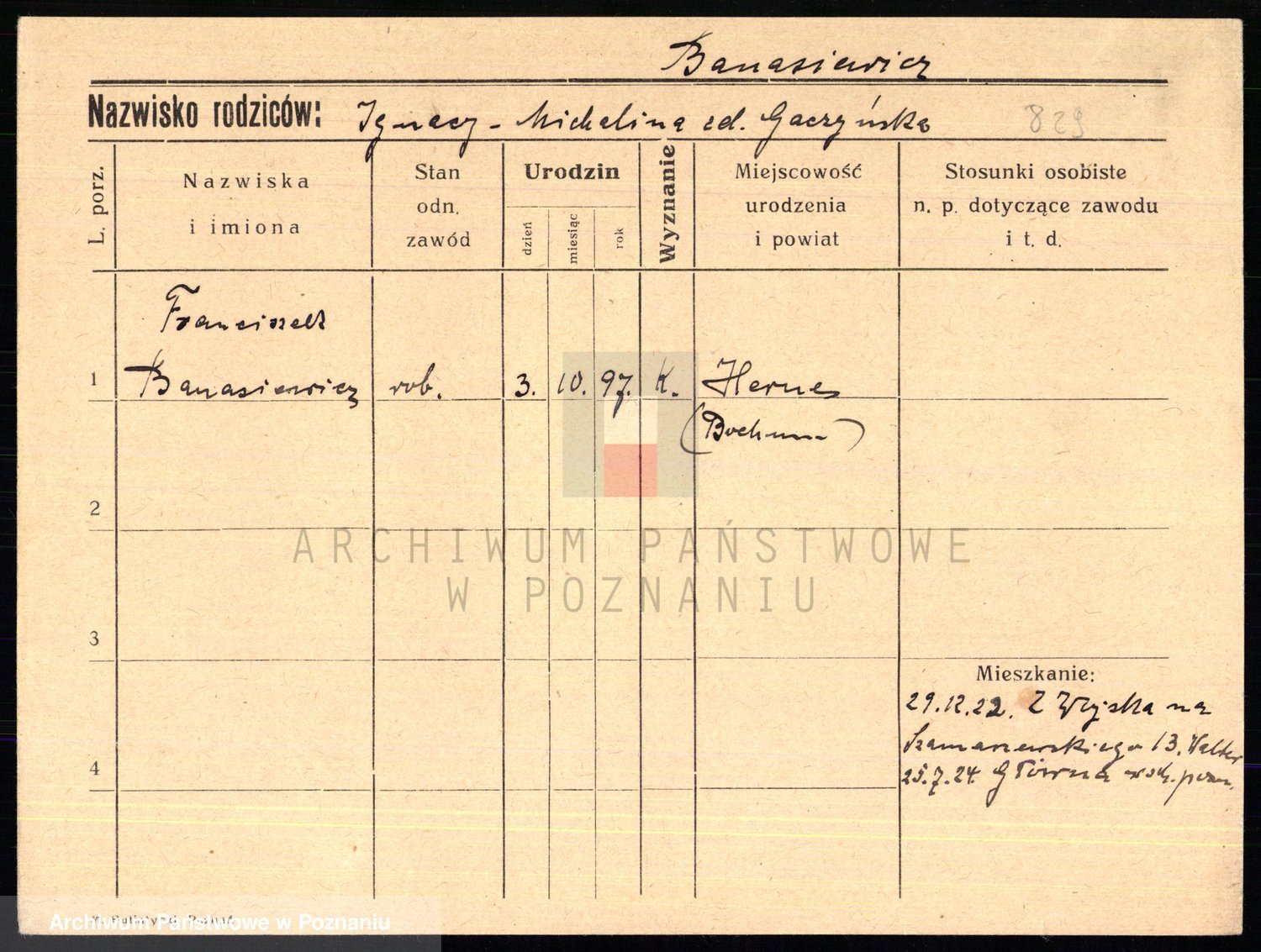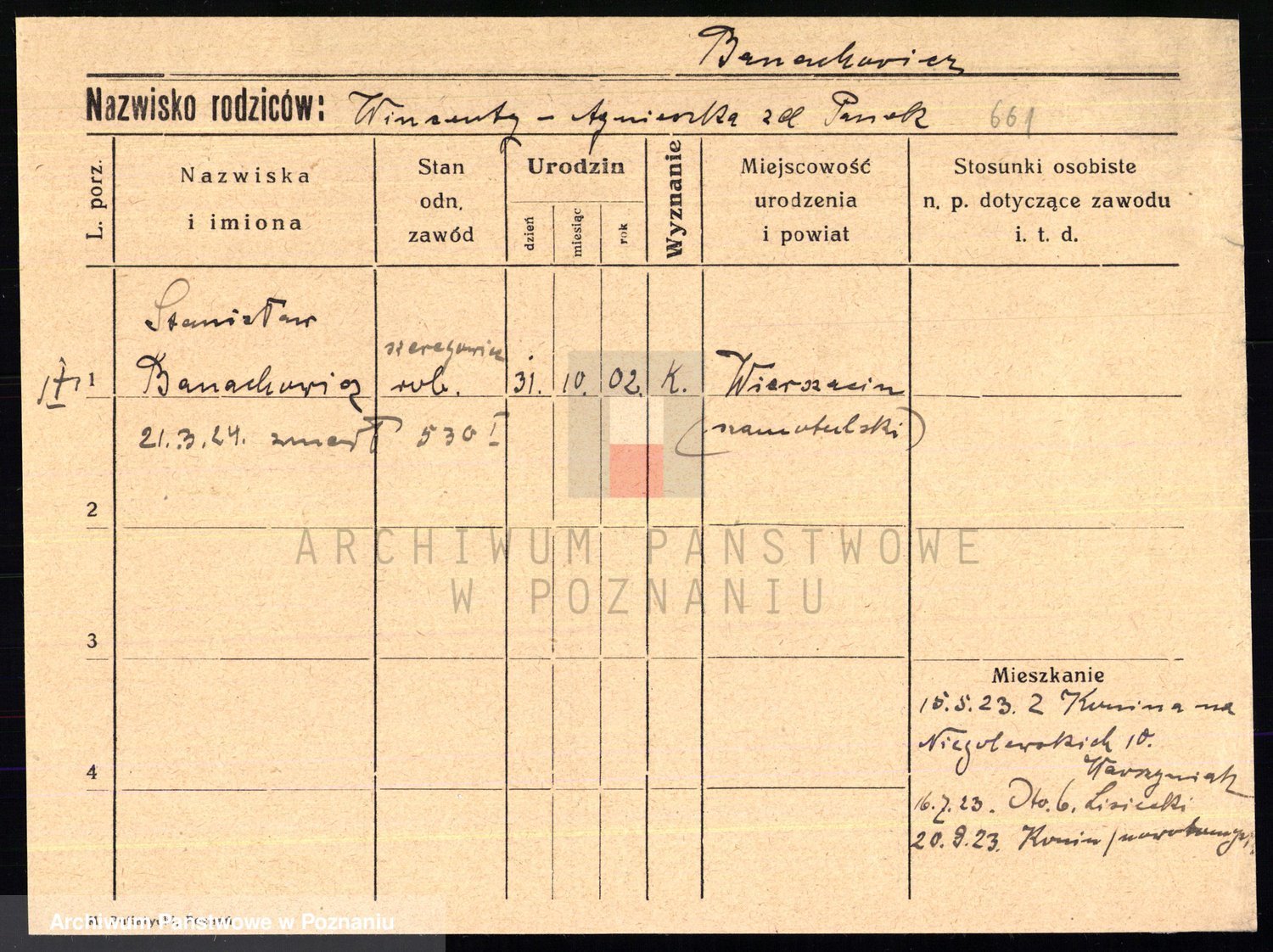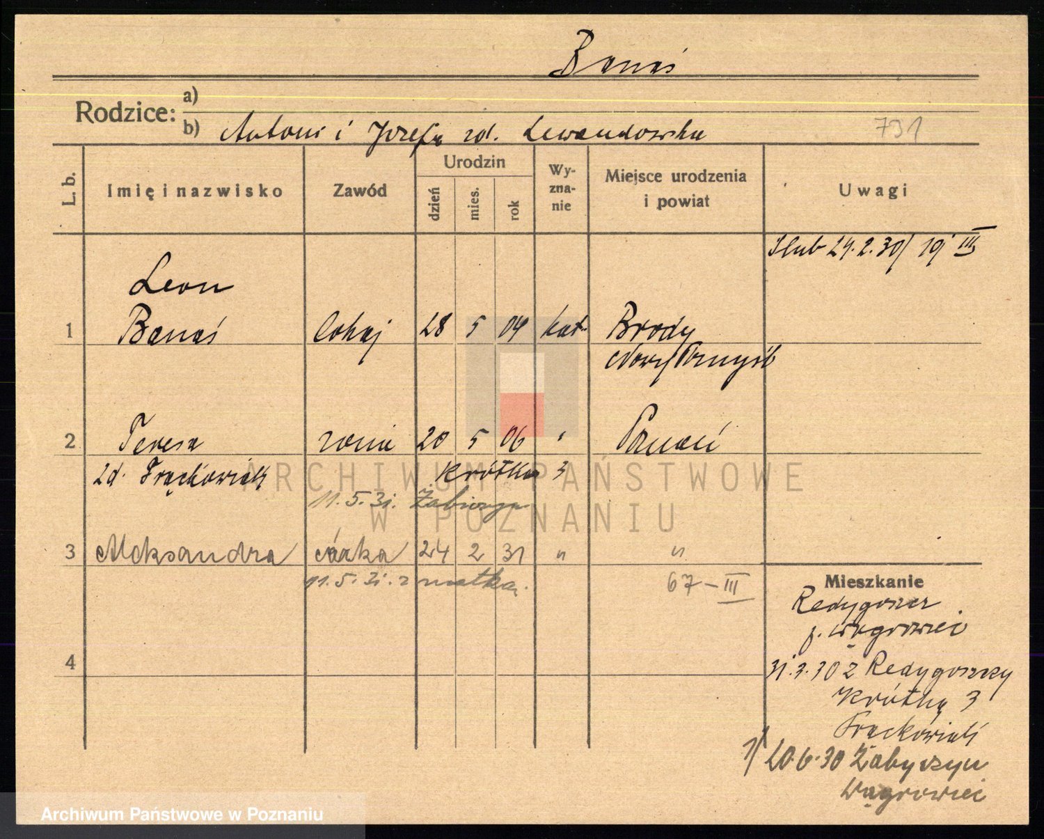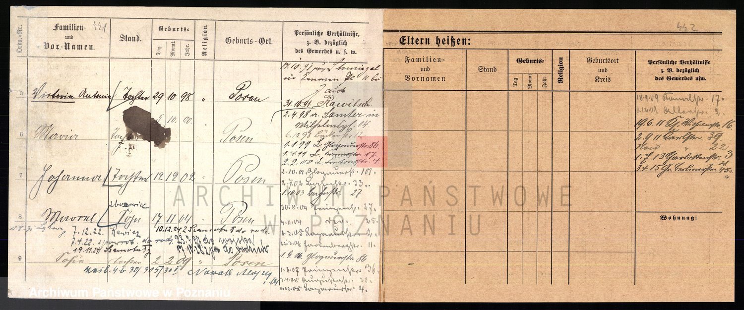 Podgląd karty osobowej dostępny jest po kliknięciu na nazwisko lub ikonkę karty. Można dokonywać powiększenia (ikony na górze) lub przechodzić między kolejnymi skanami (strzałki po bokach).