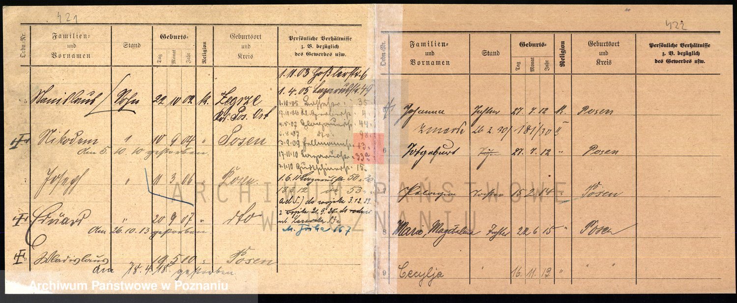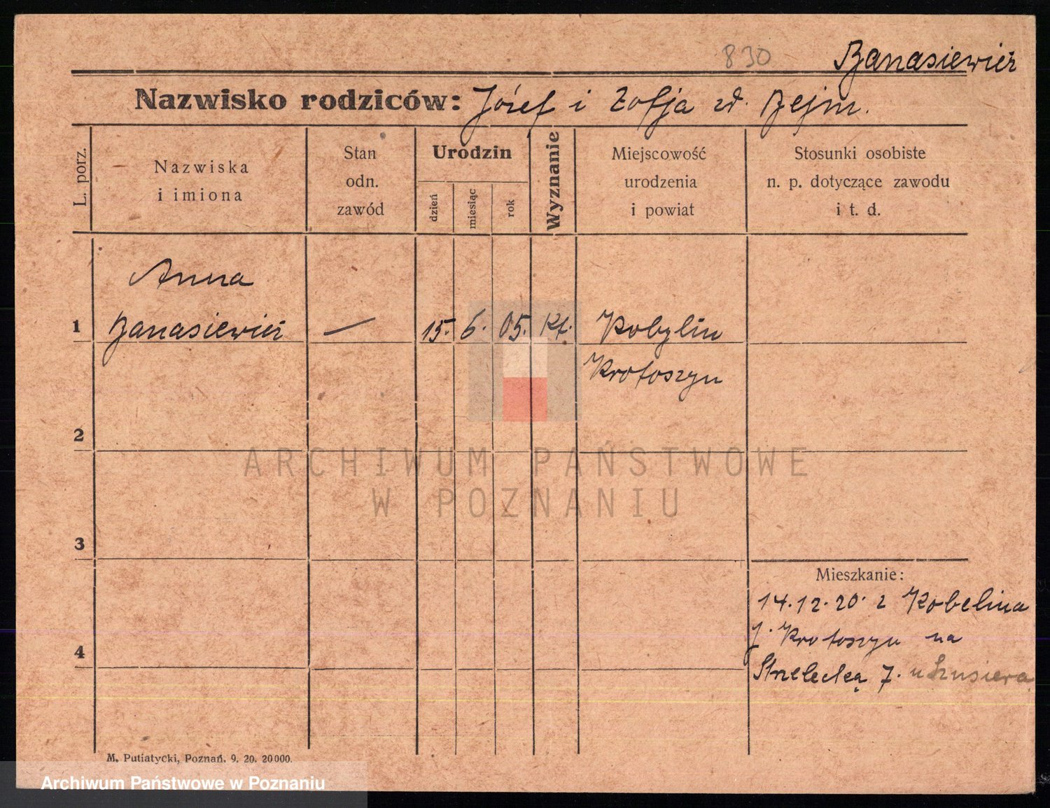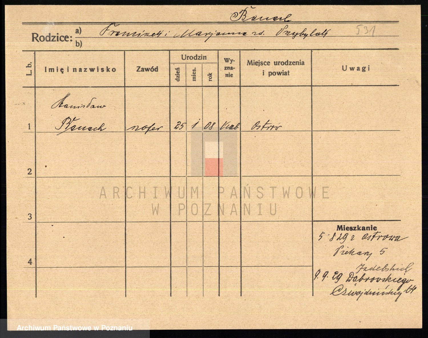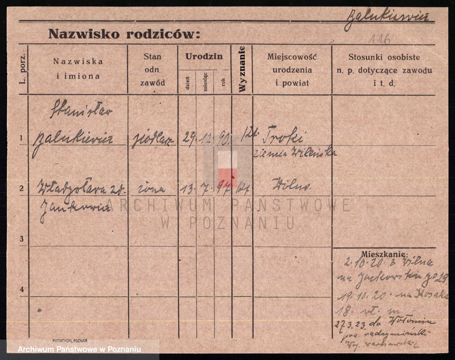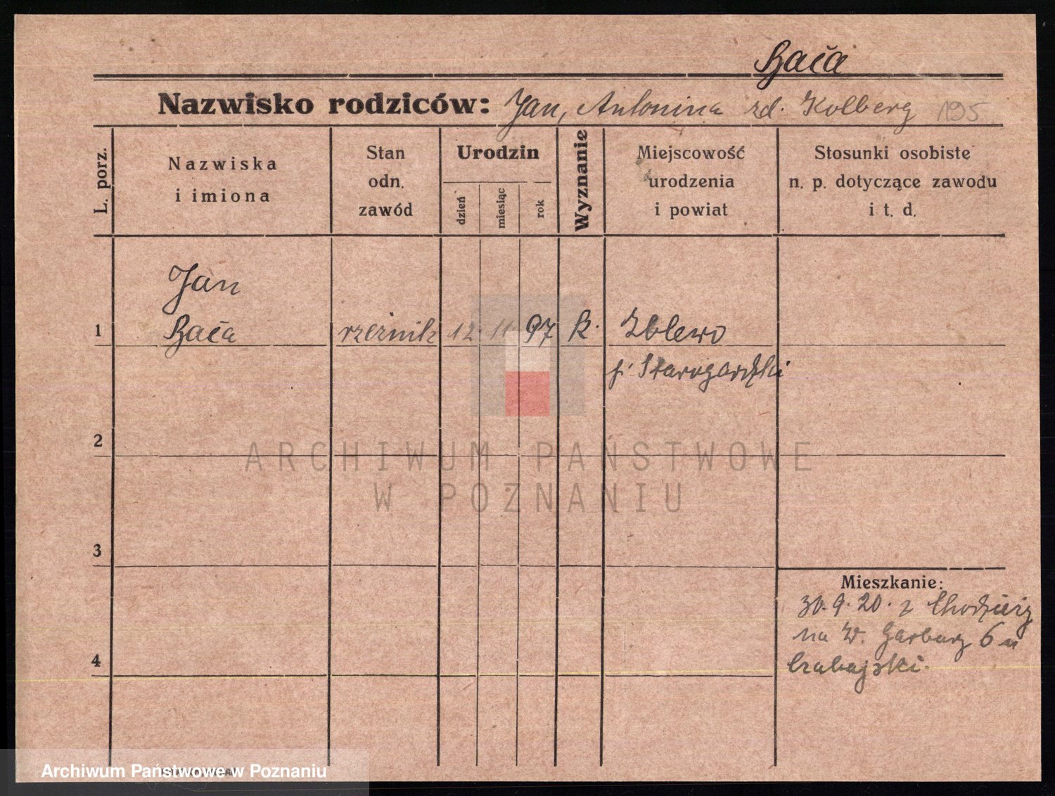 Podgląd karty osobowej dostępny jest po kliknięciu na nazwisko lub ikonkę karty. Można dokonywać powiększenia (ikony na górze) lub przechodzić między kolejnymi skanami (strzałki po bokach).