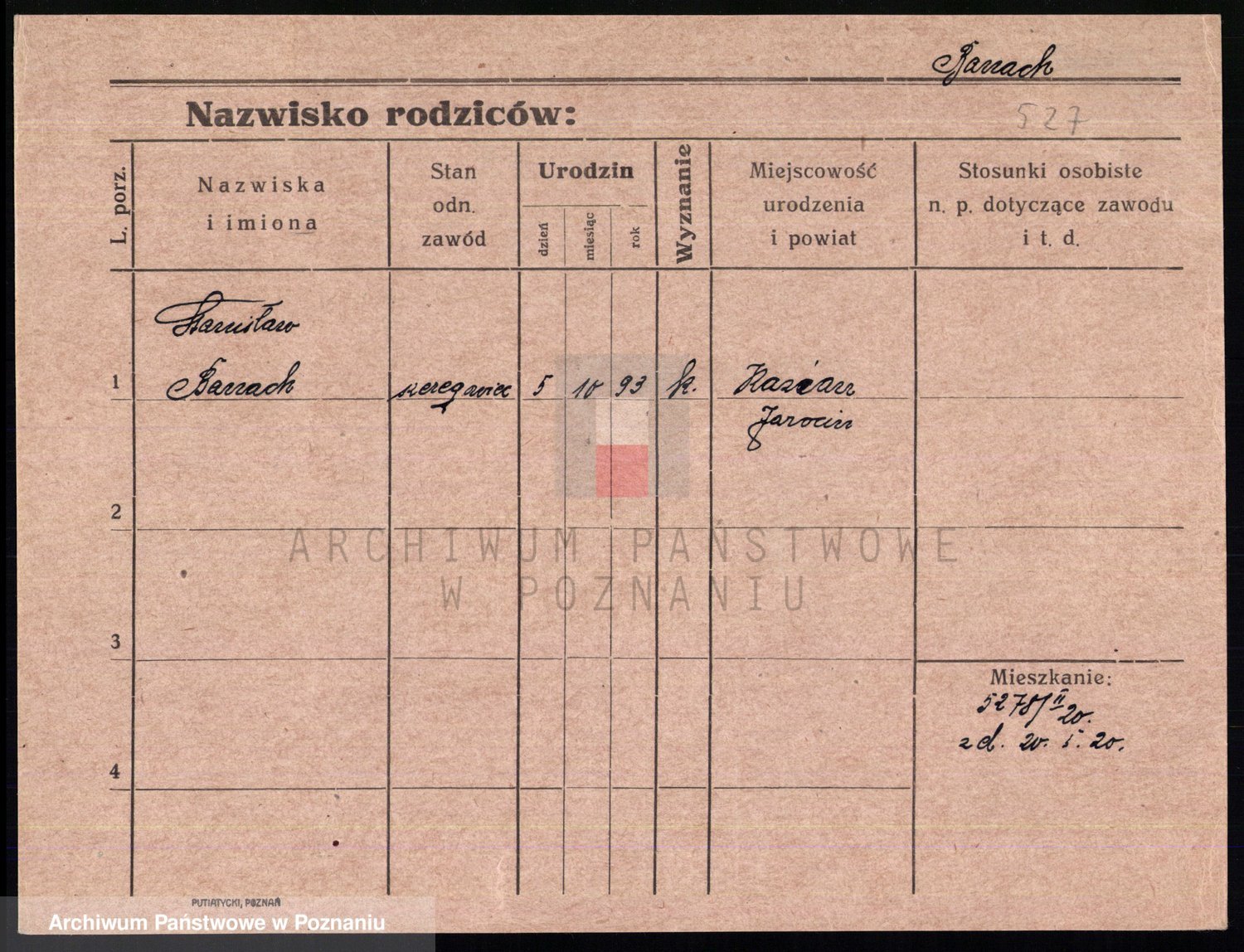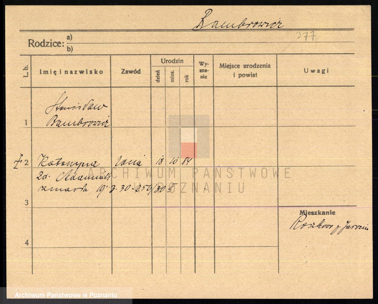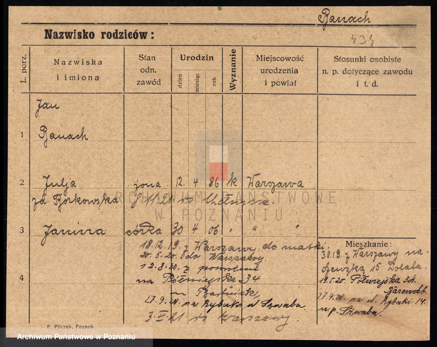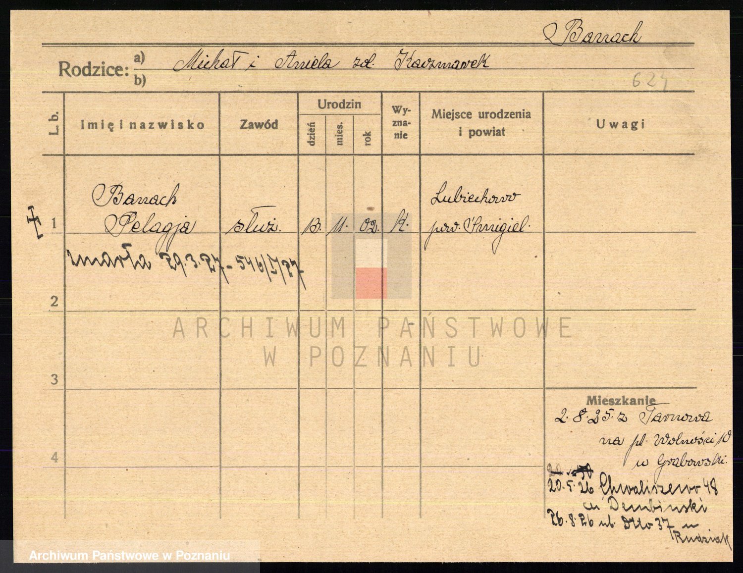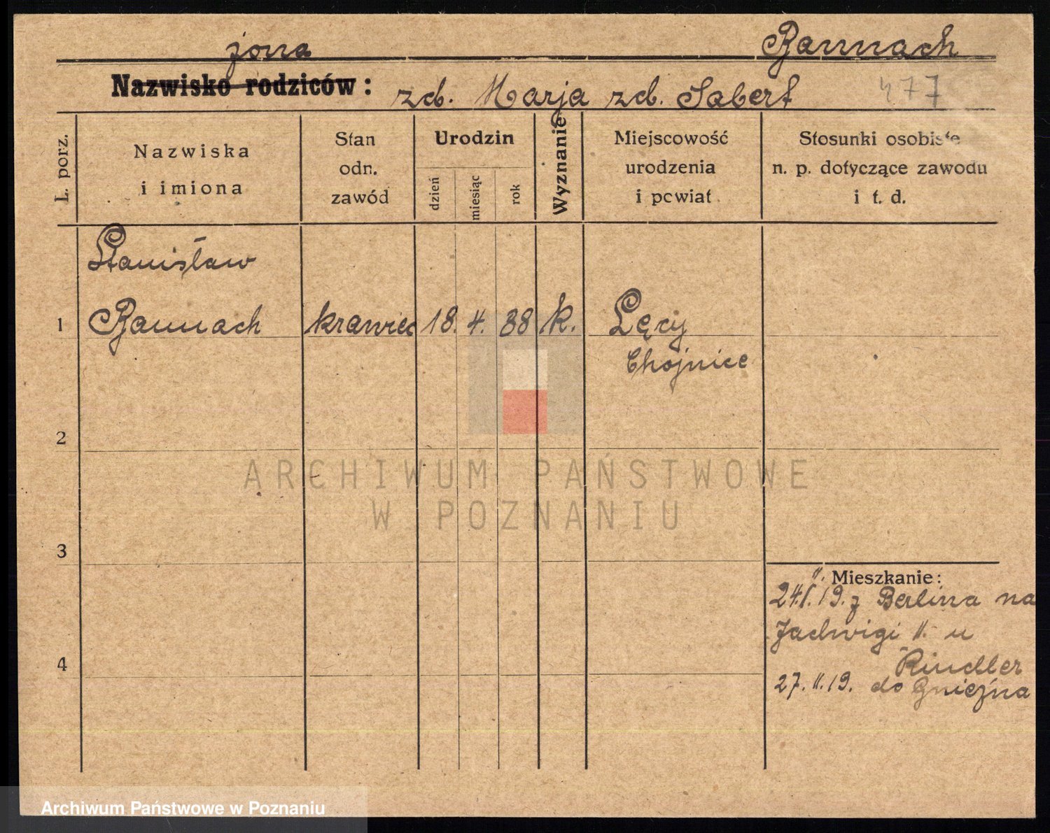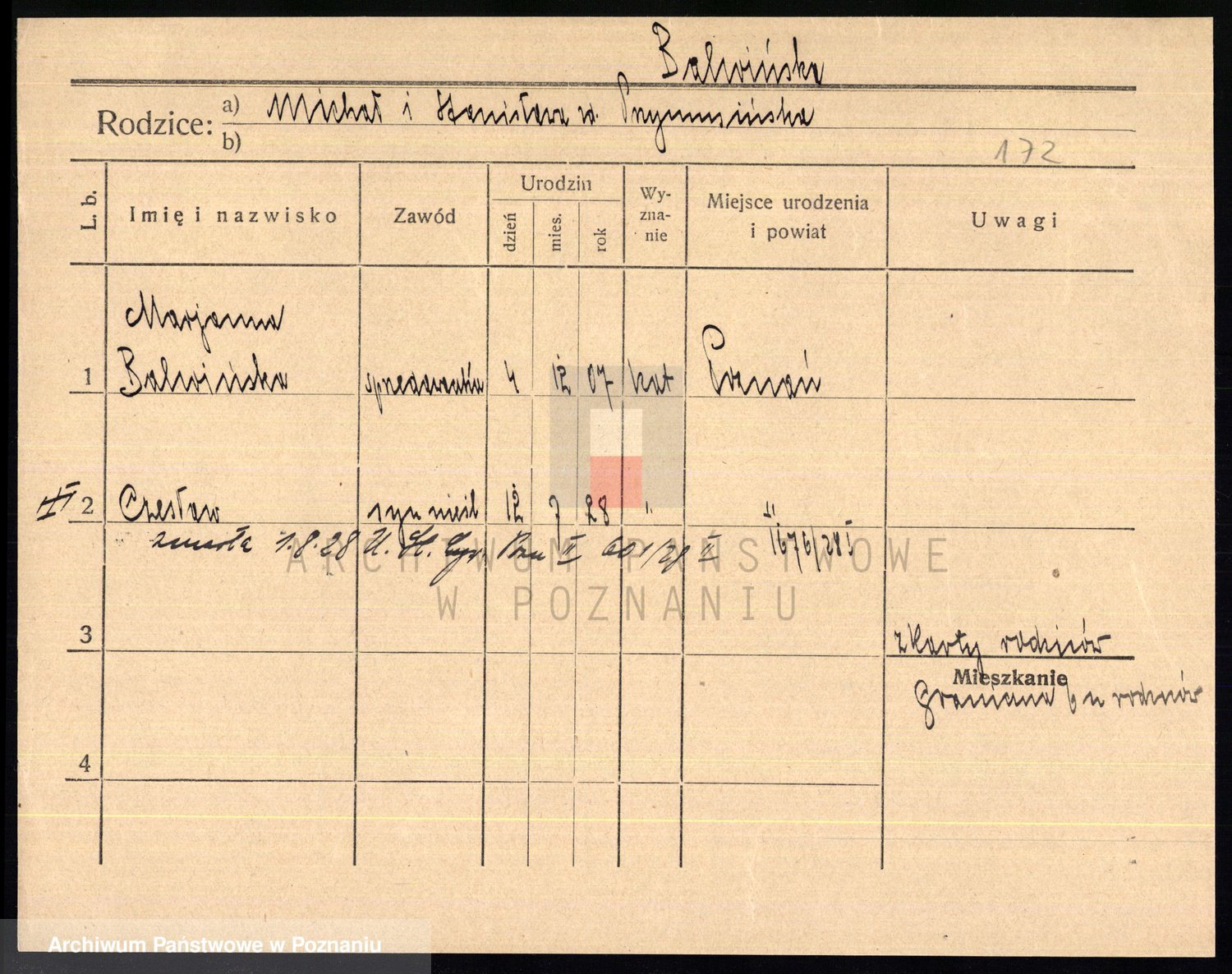 Podgląd karty osobowej dostępny jest po kliknięciu na nazwisko lub ikonkę karty. Można dokonywać powiększenia (ikony na górze) lub przechodzić między kolejnymi skanami (strzałki po bokach).