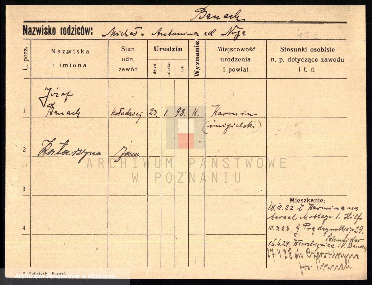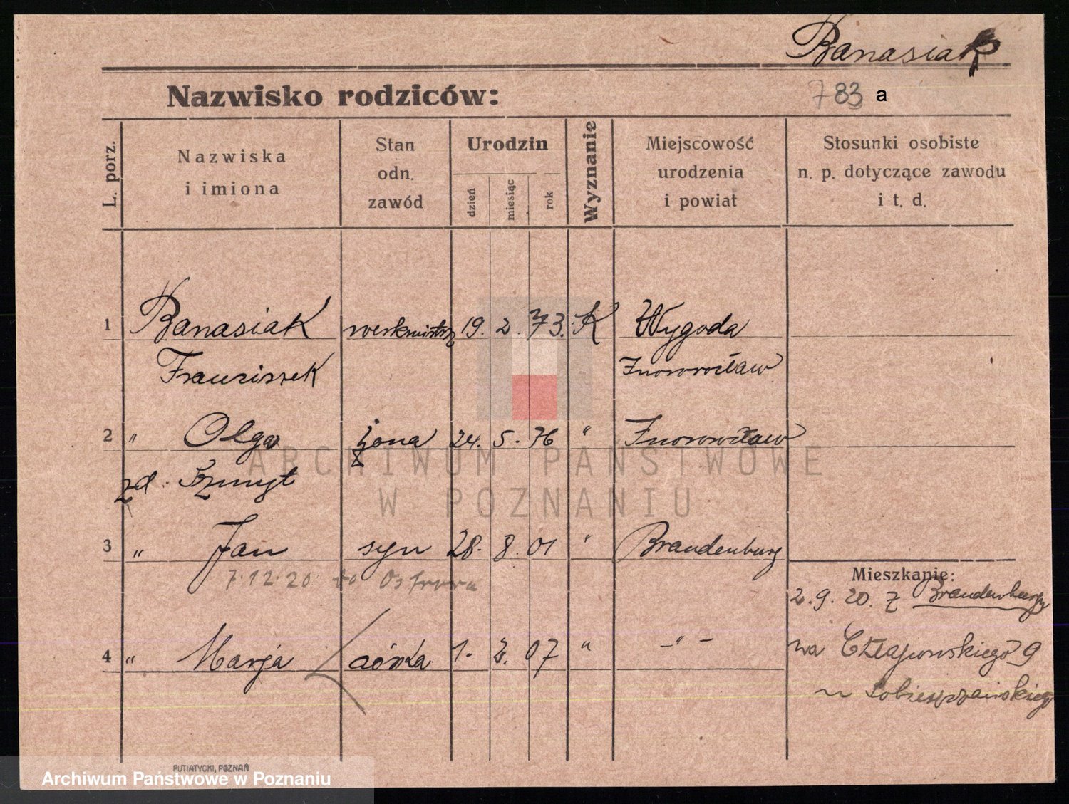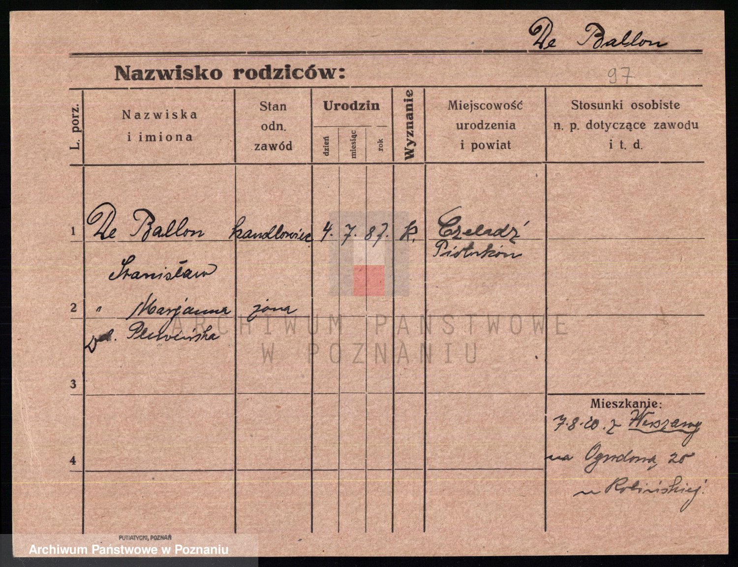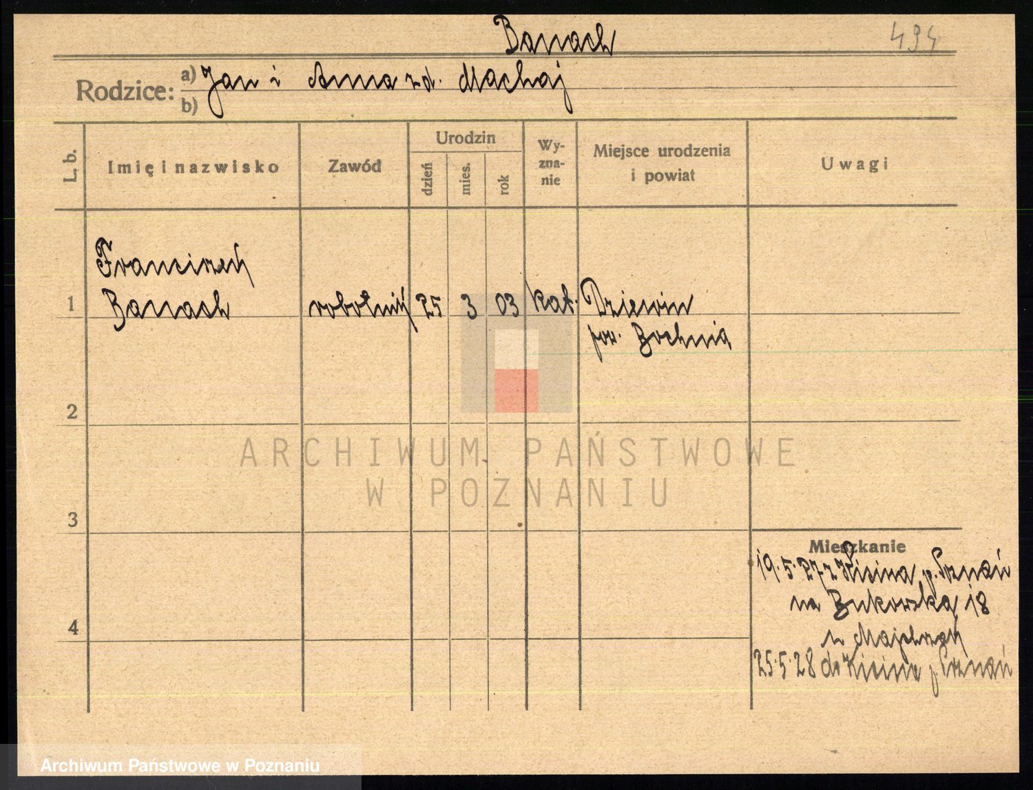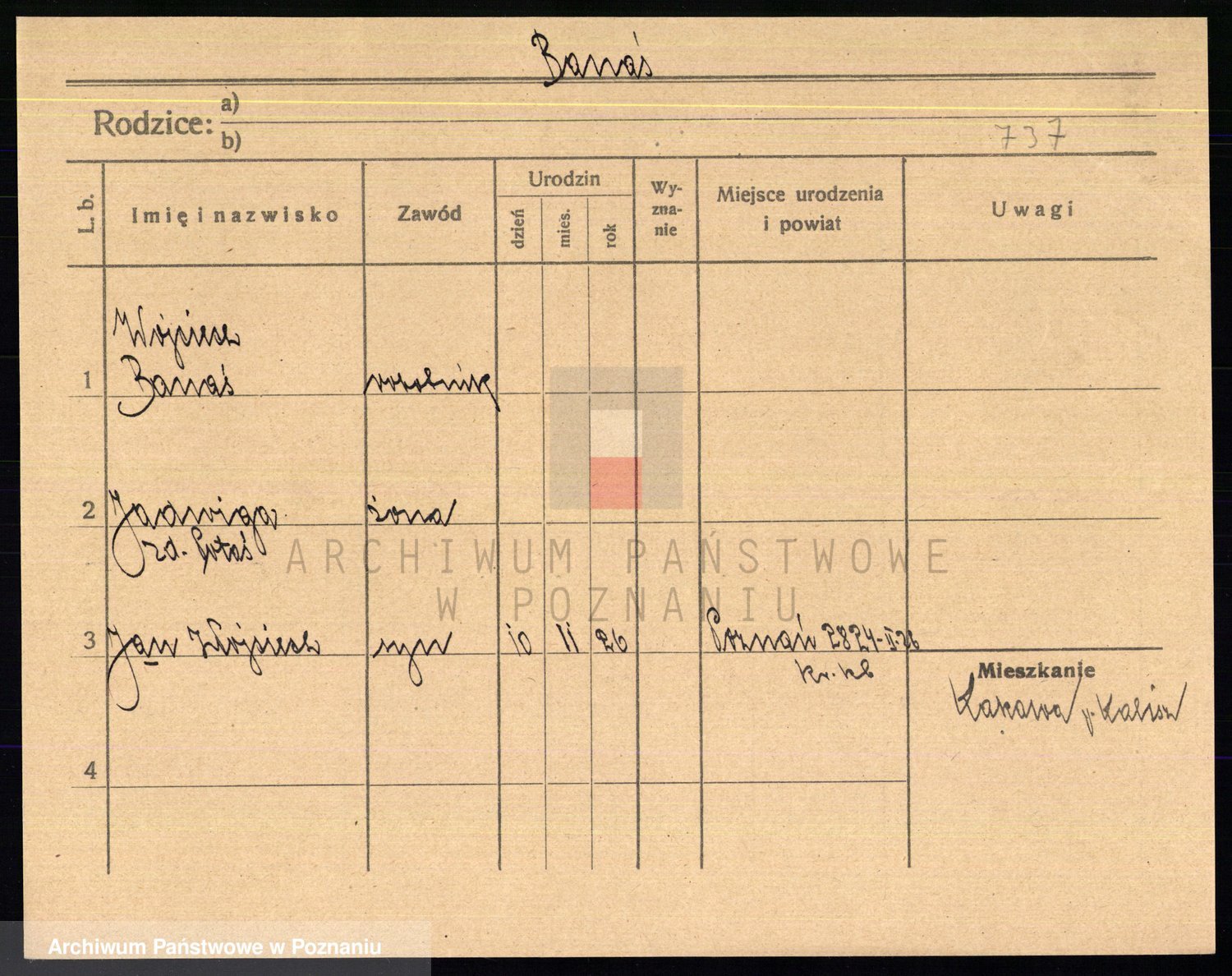 Podgląd karty osobowej dostępny jest po kliknięciu na nazwisko lub ikonkę karty. Można dokonywać powiększenia (ikony na górze) lub przechodzić między kolejnymi skanami (strzałki po bokach).
