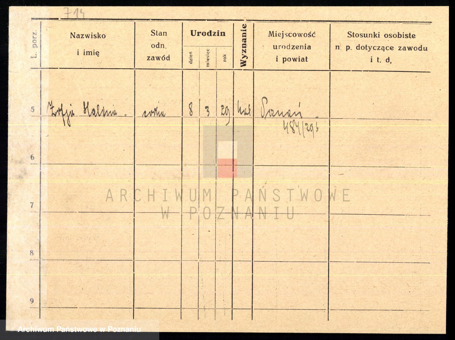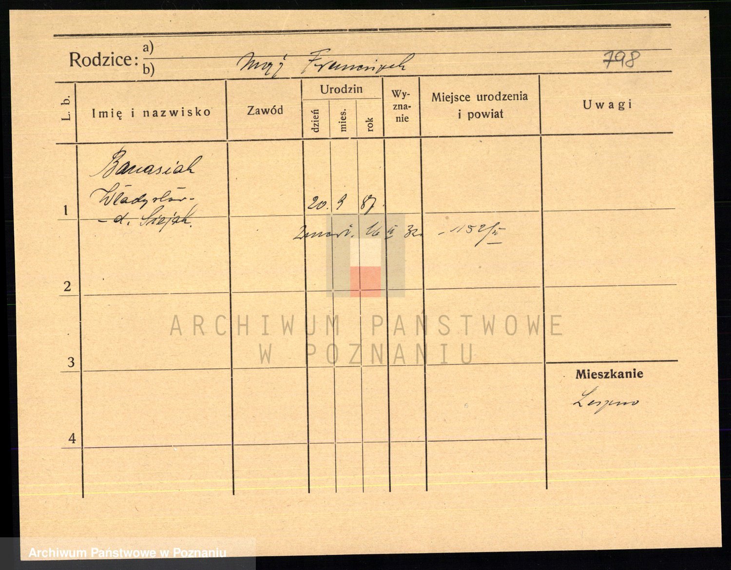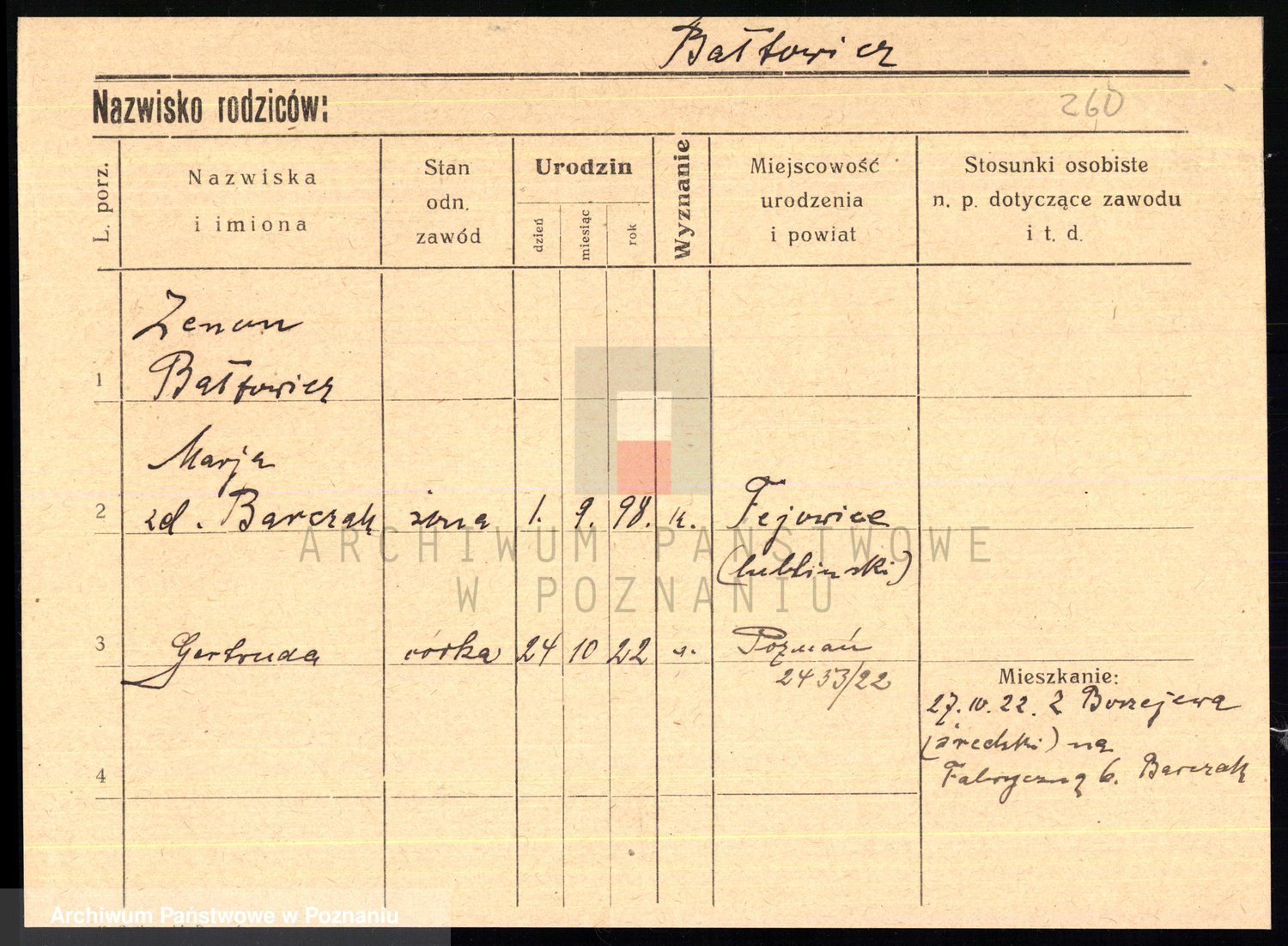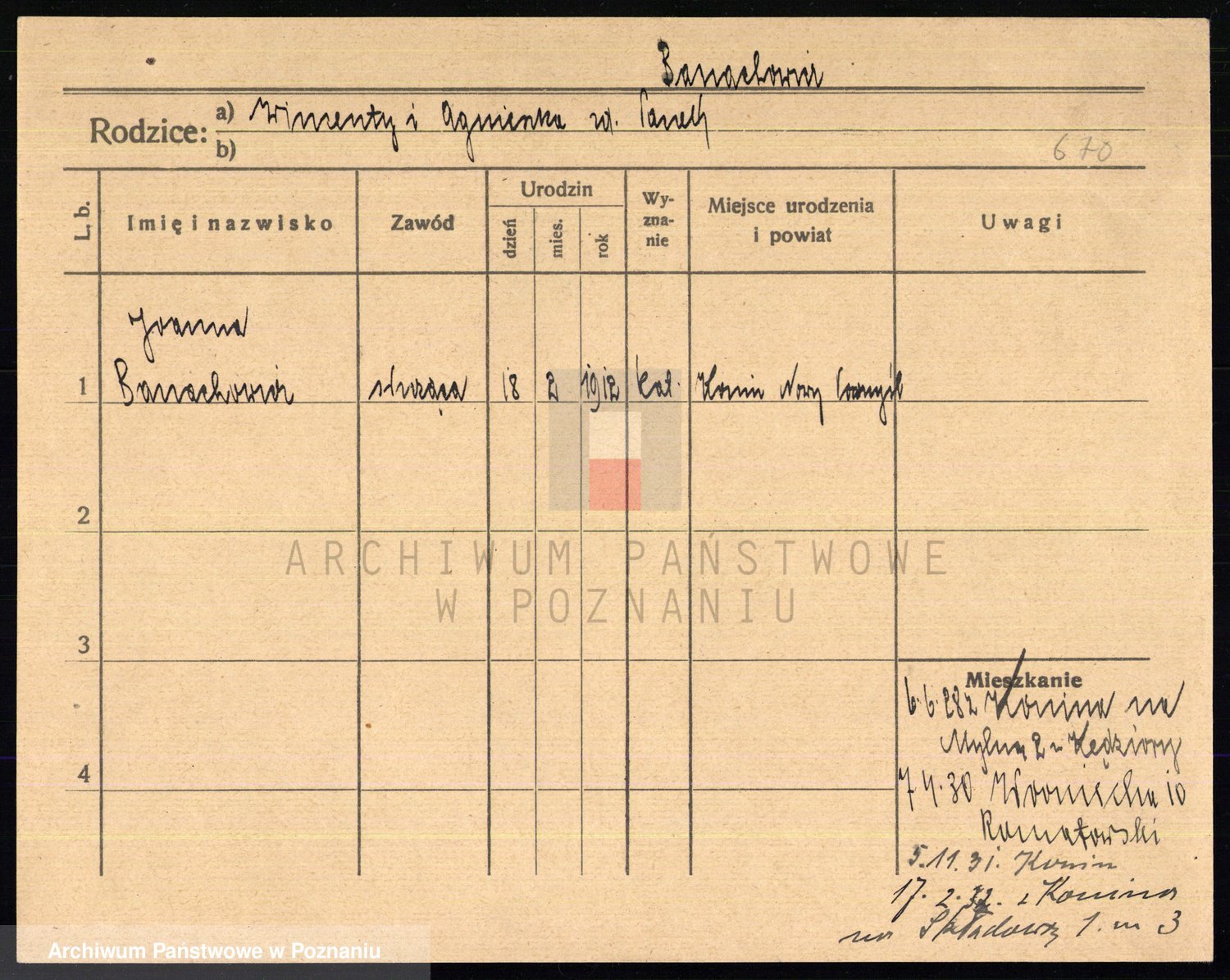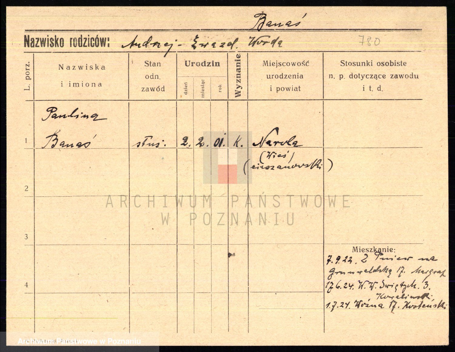 Podgląd karty osobowej dostępny jest po kliknięciu na nazwisko lub ikonkę karty. Można dokonywać powiększenia (ikony na górze) lub przechodzić między kolejnymi skanami (strzałki po bokach).
