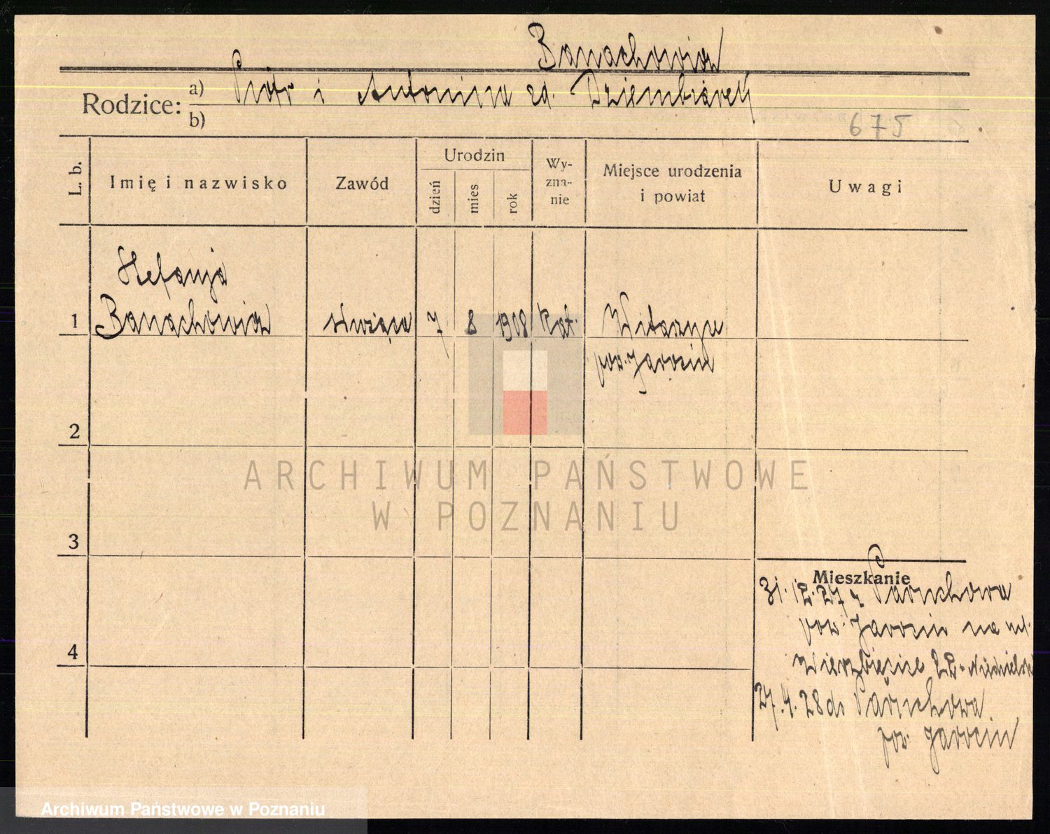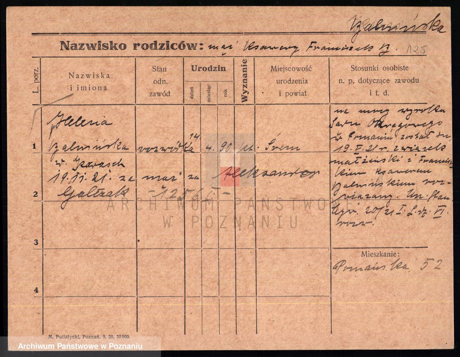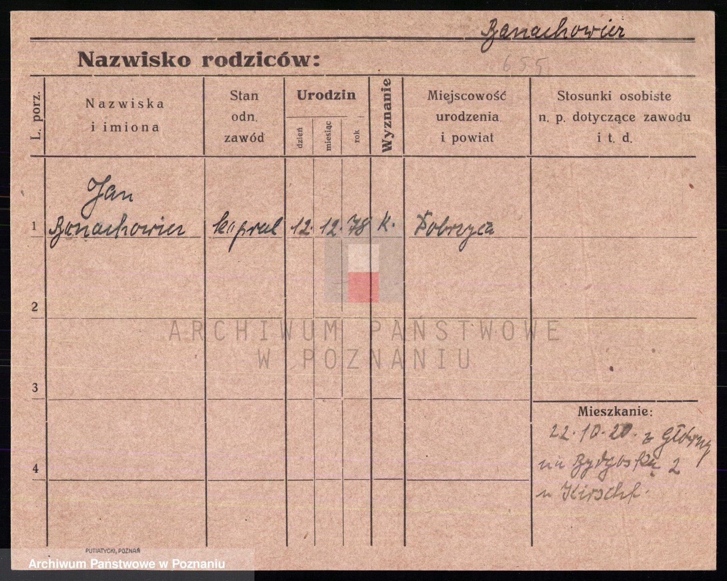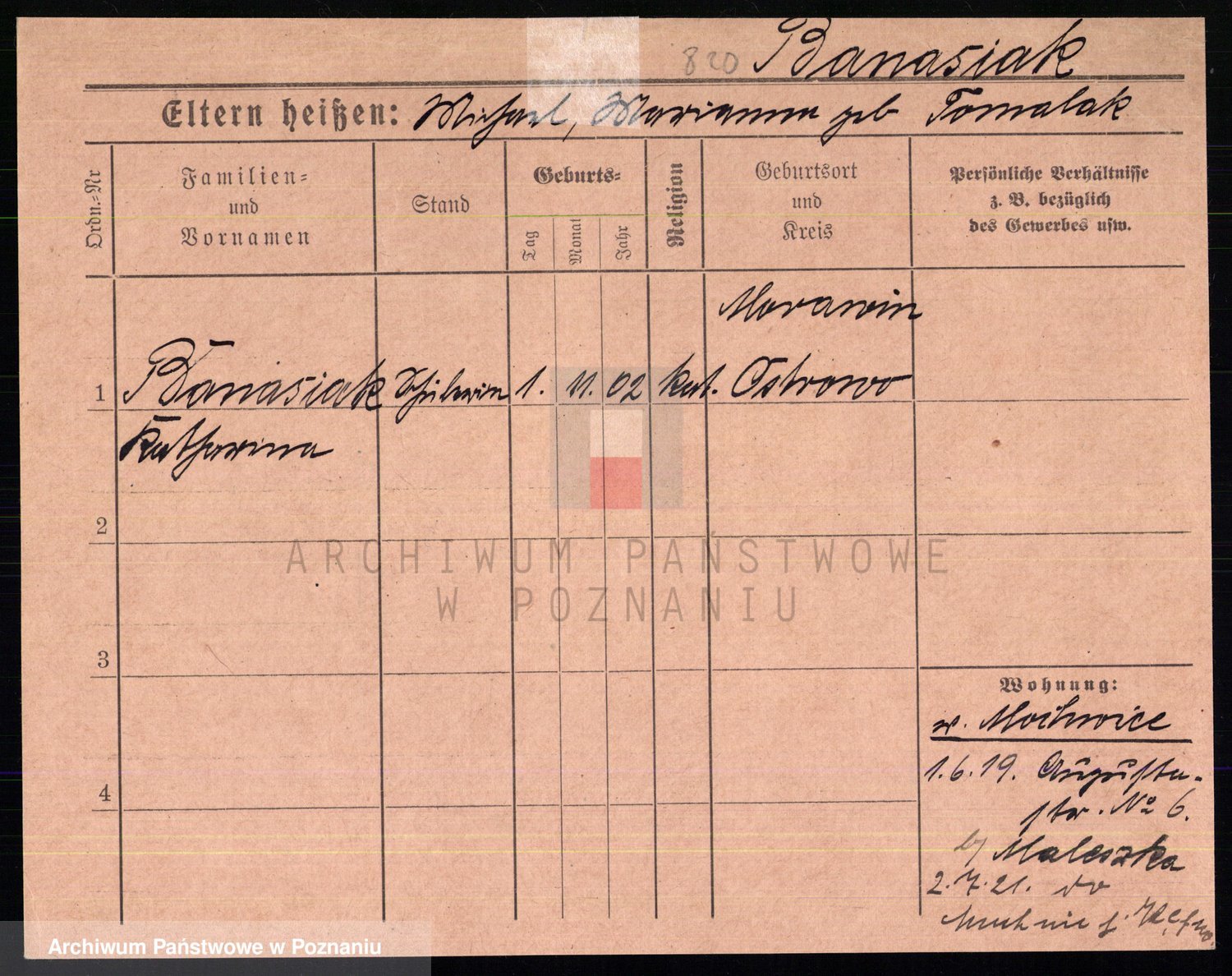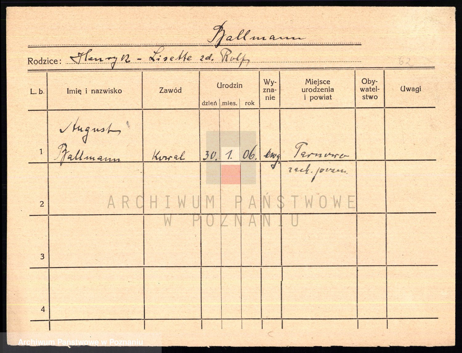 Podgląd karty osobowej dostępny jest po kliknięciu na nazwisko lub ikonkę karty. Można dokonywać powiększenia (ikony na górze) lub przechodzić między kolejnymi skanami (strzałki po bokach).