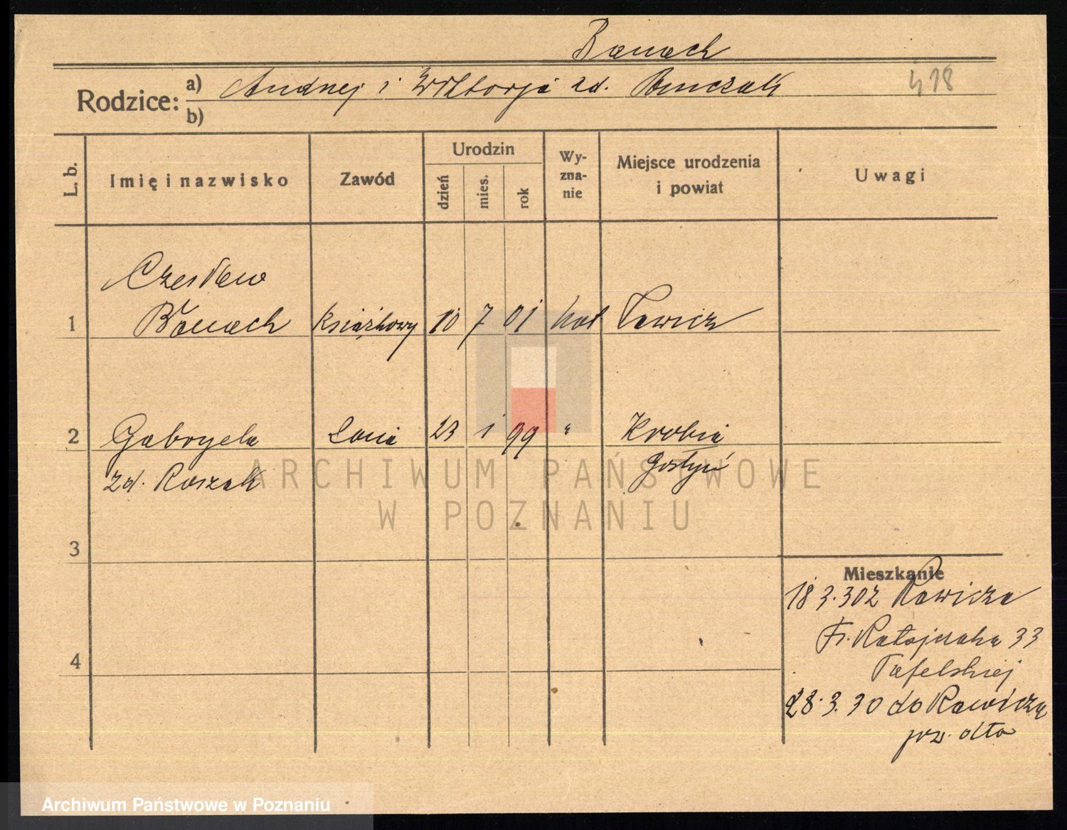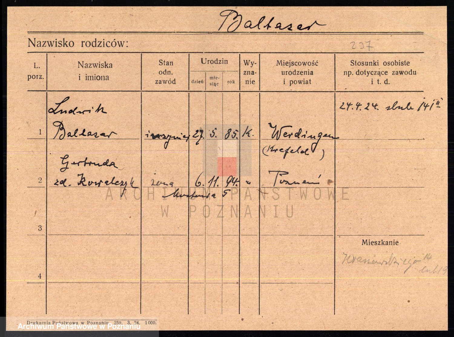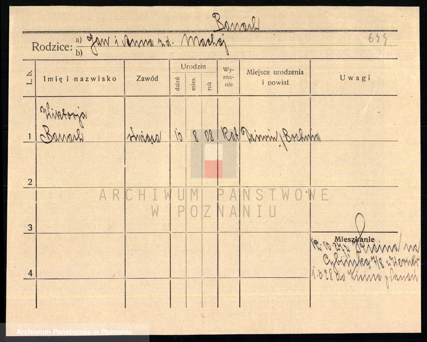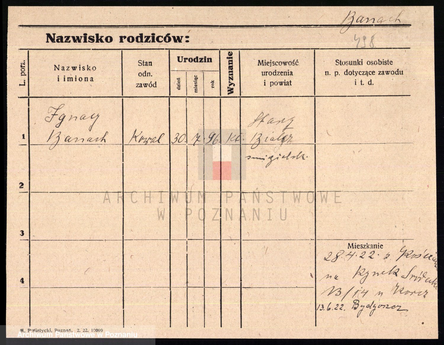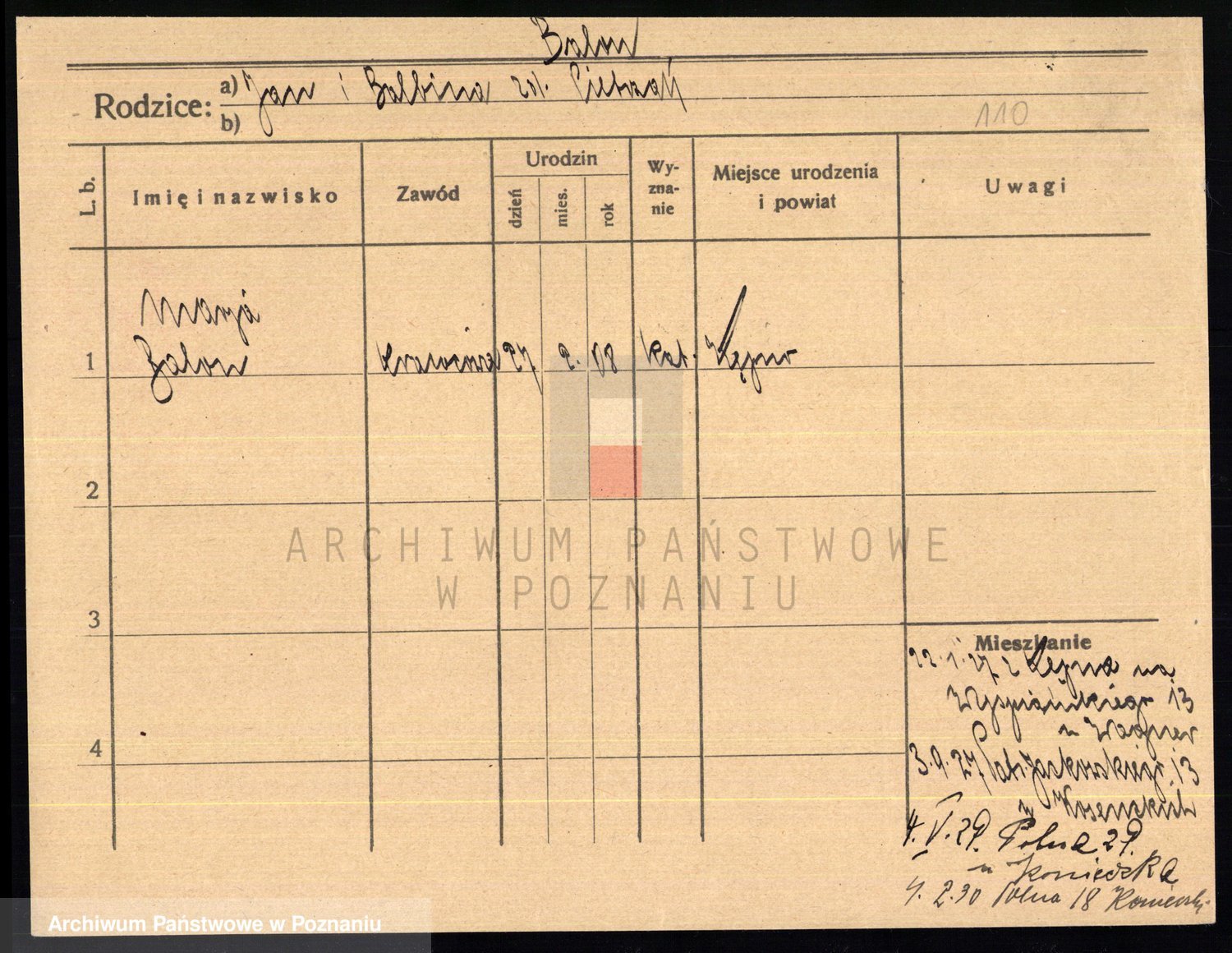 Podgląd karty osobowej dostępny jest po kliknięciu na nazwisko lub ikonkę karty. Można dokonywać powiększenia (ikony na górze) lub przechodzić między kolejnymi skanami (strzałki po bokach).