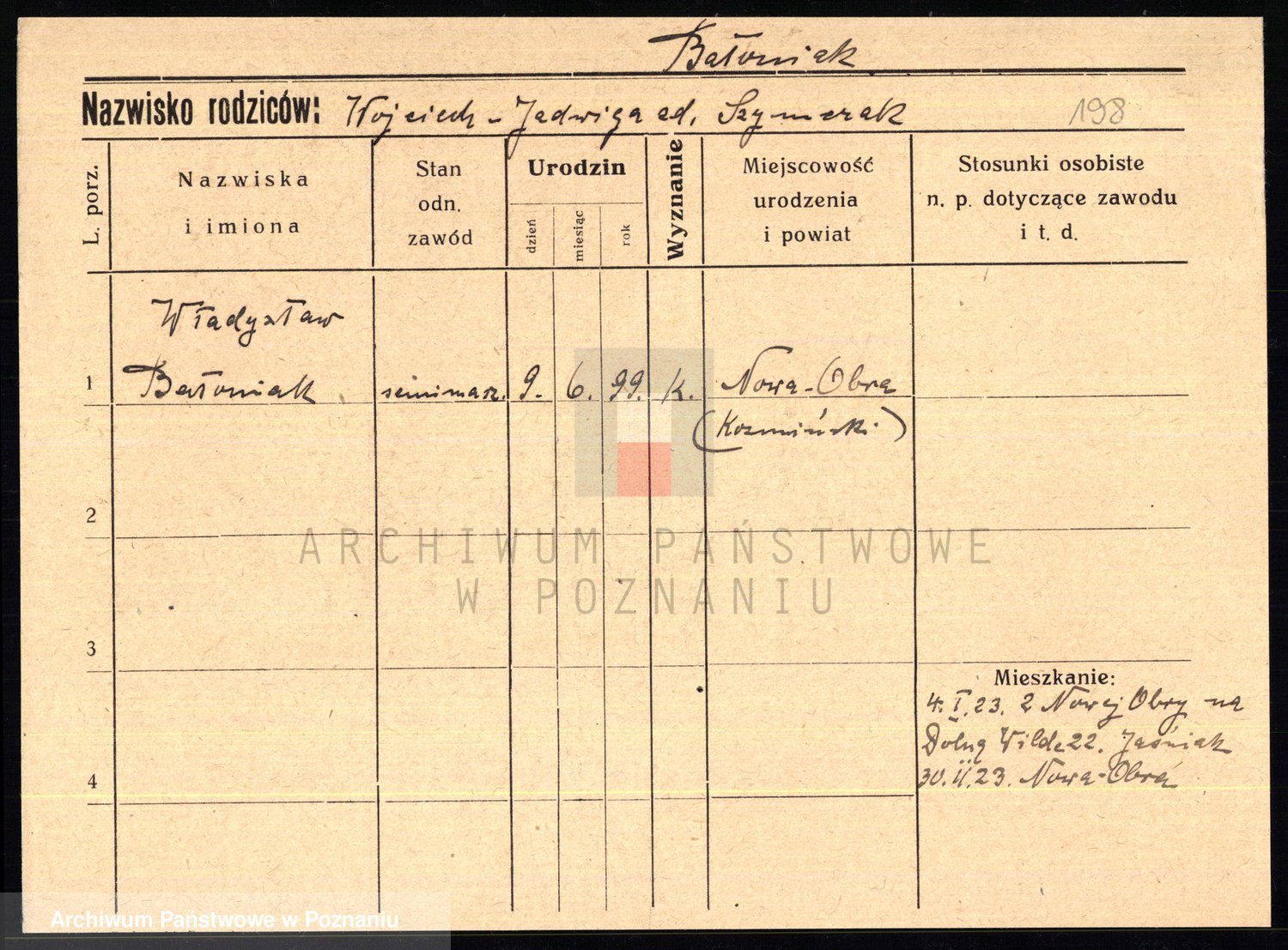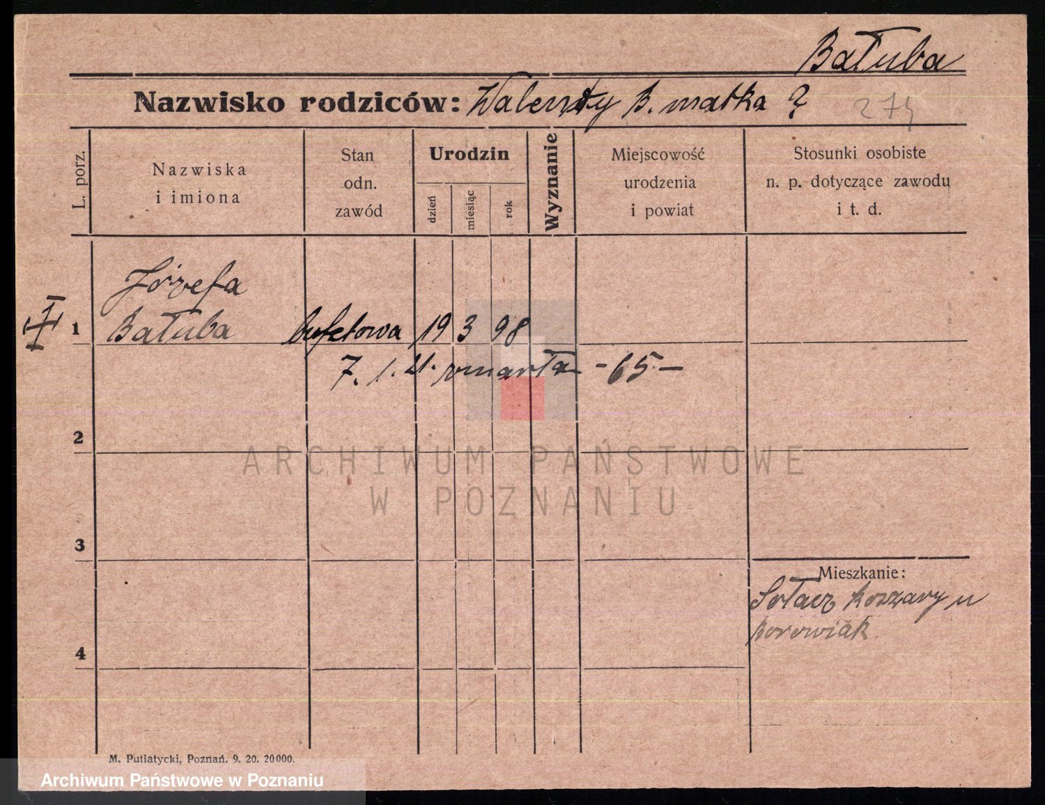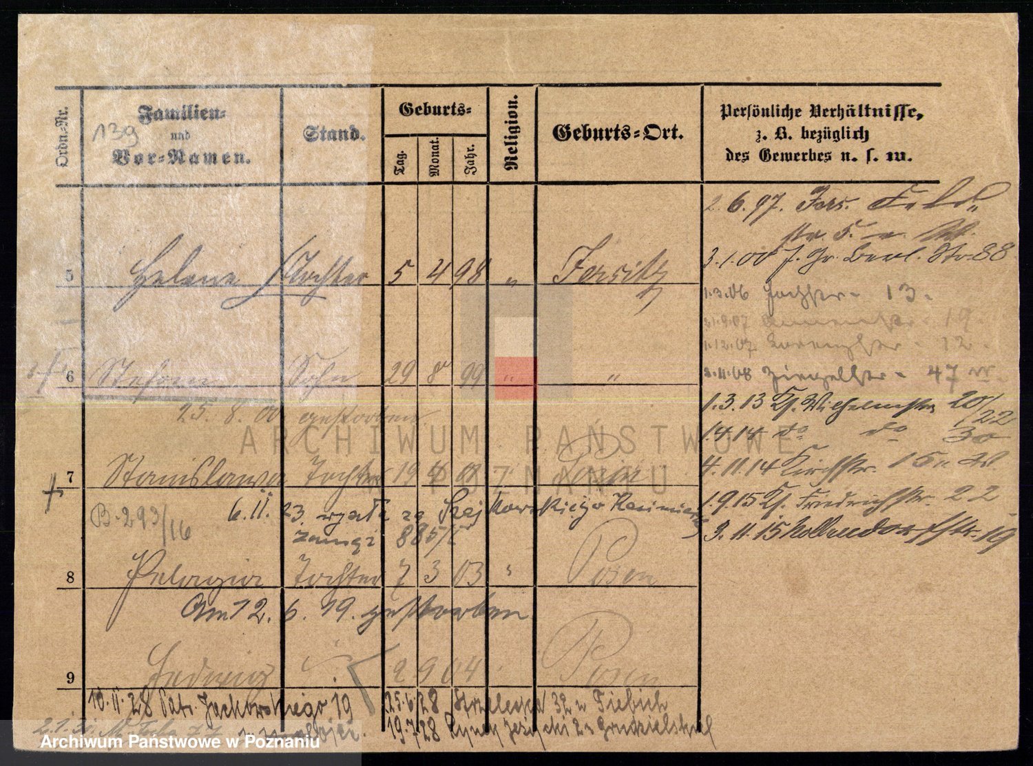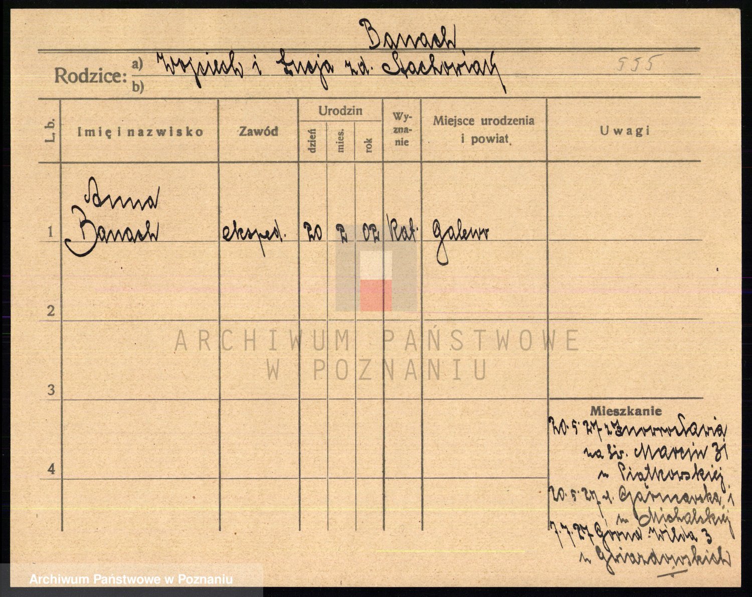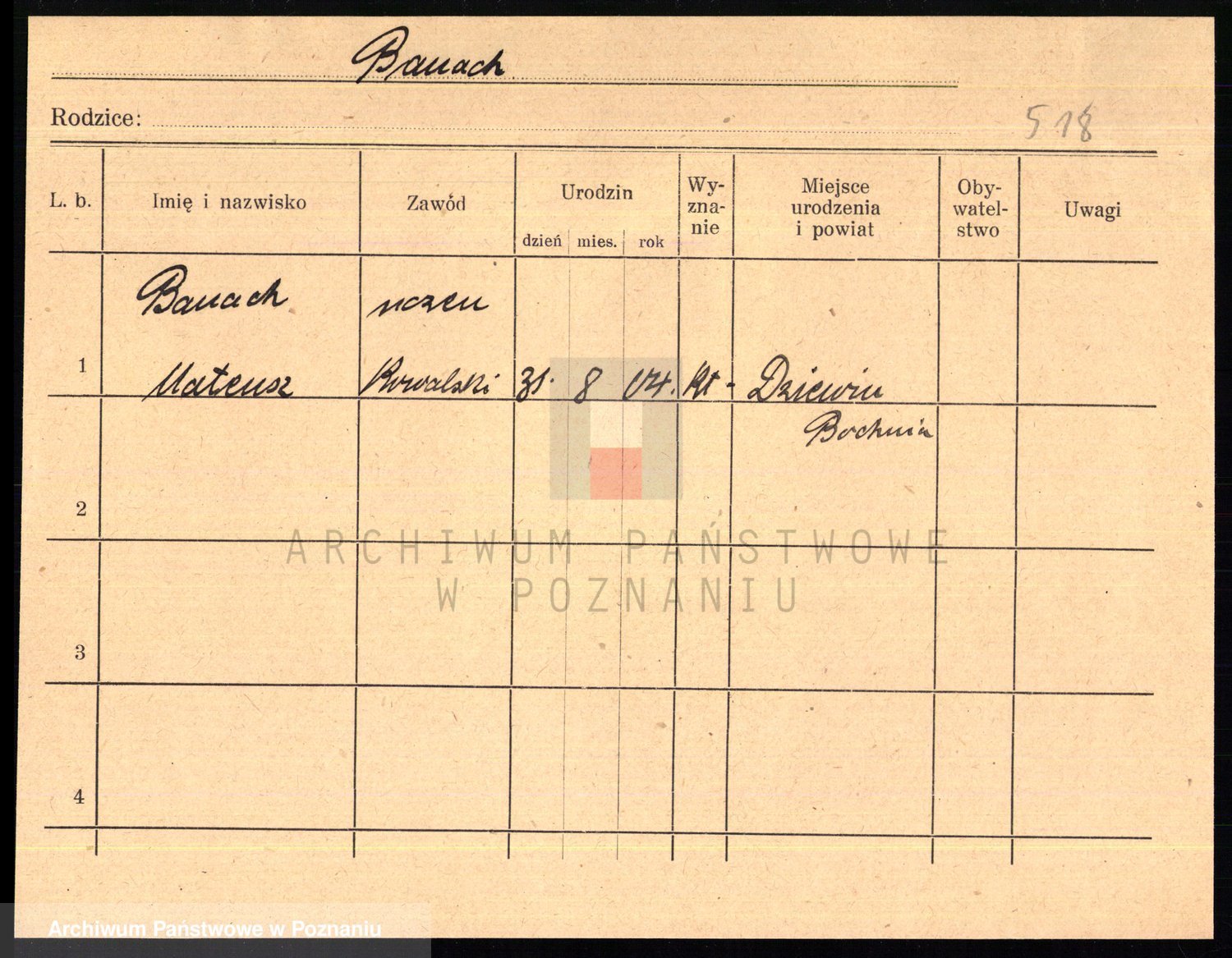 Podgląd karty osobowej dostępny jest po kliknięciu na nazwisko lub ikonkę karty. Można dokonywać powiększenia (ikony na górze) lub przechodzić między kolejnymi skanami (strzałki po bokach).