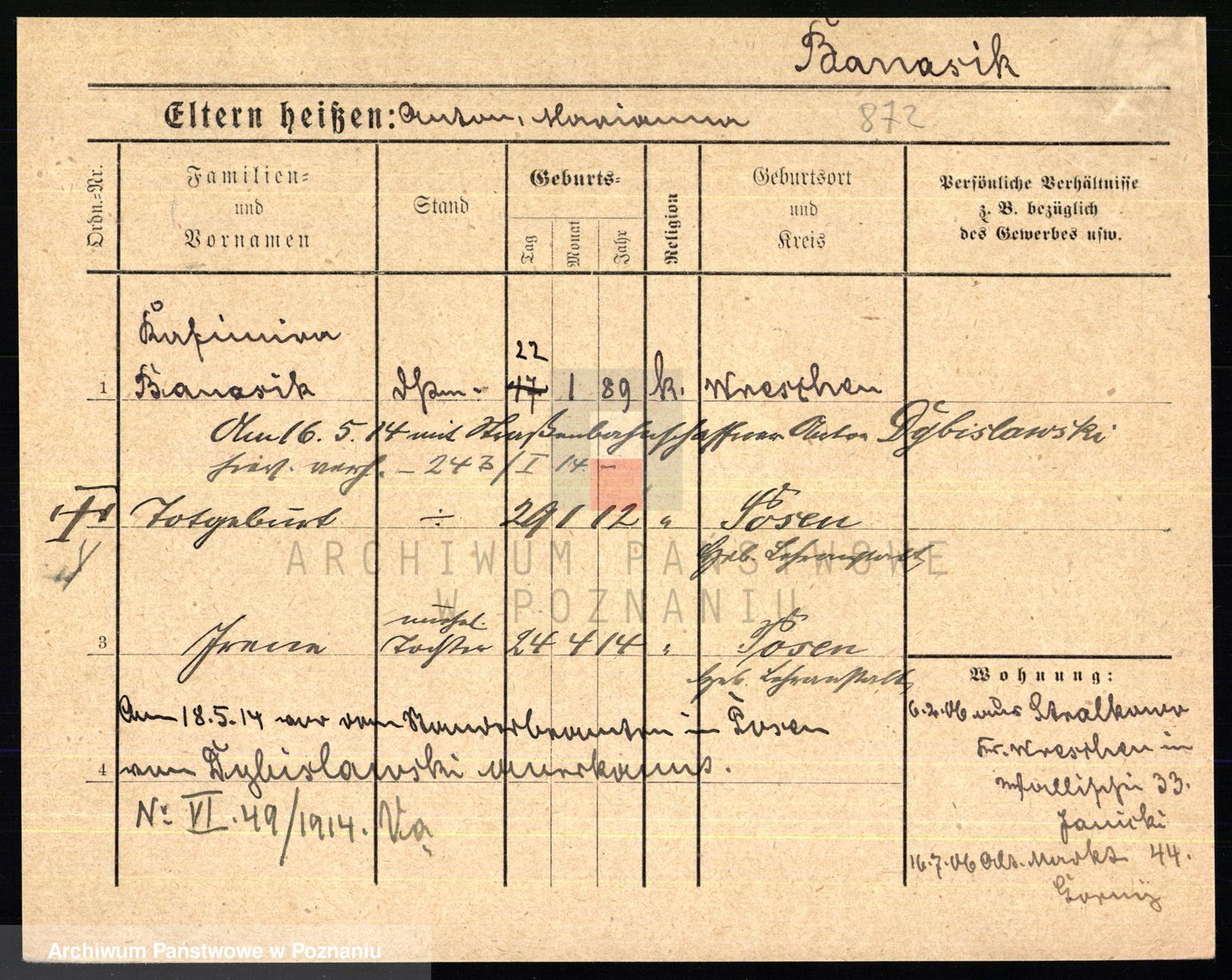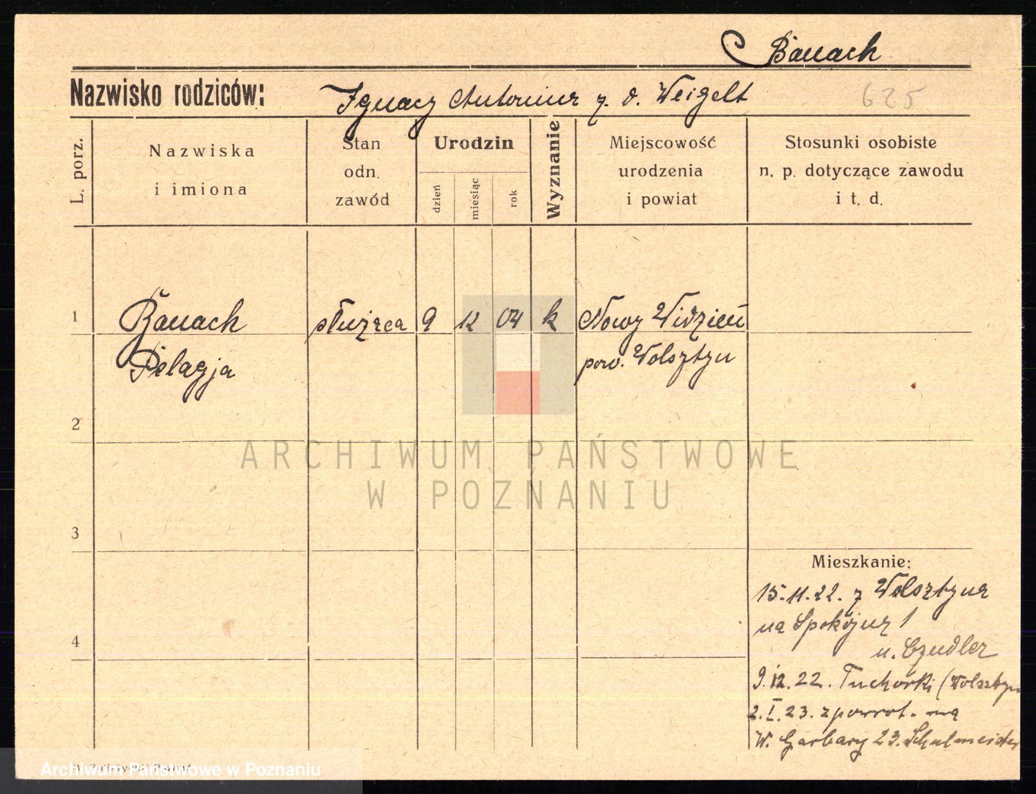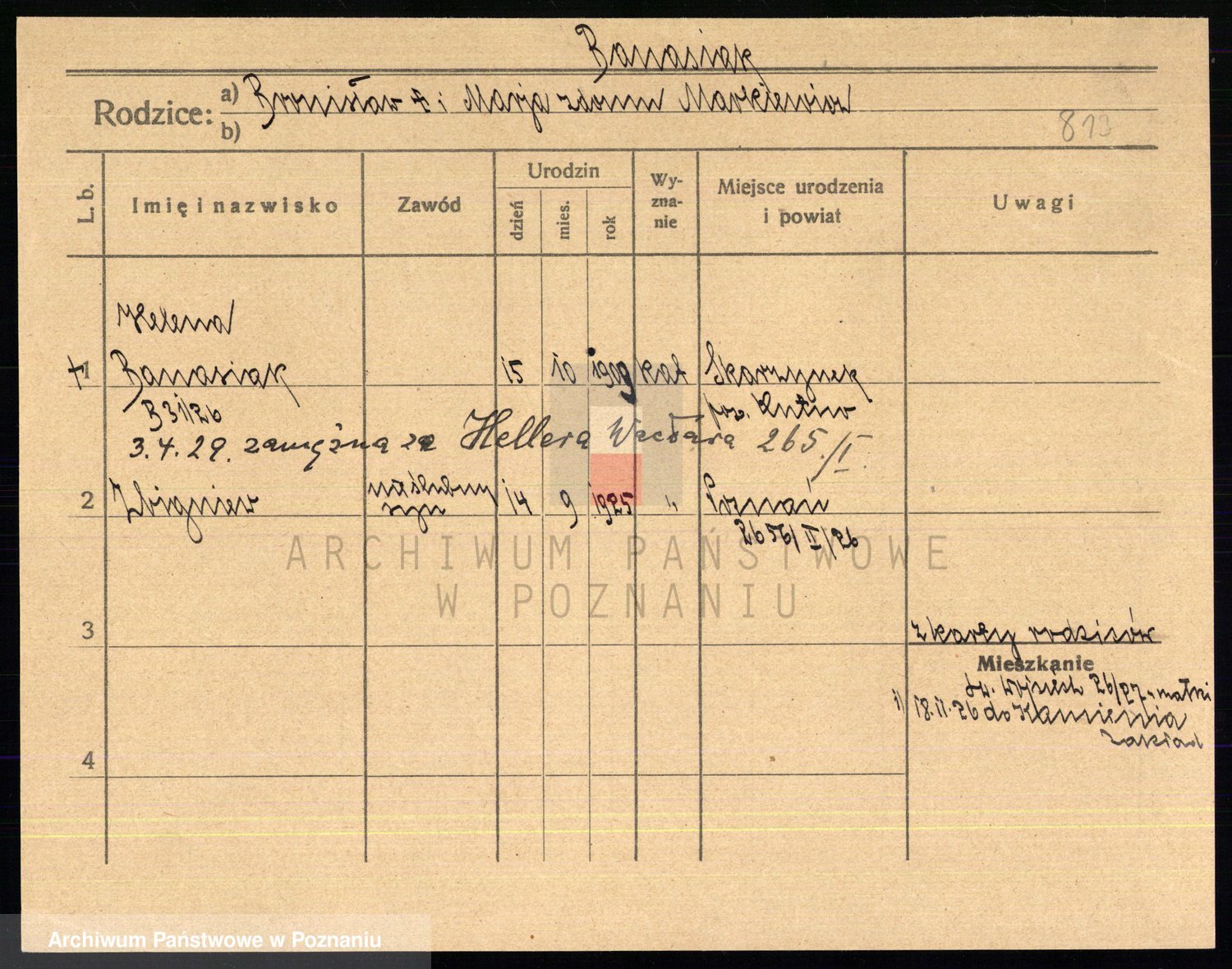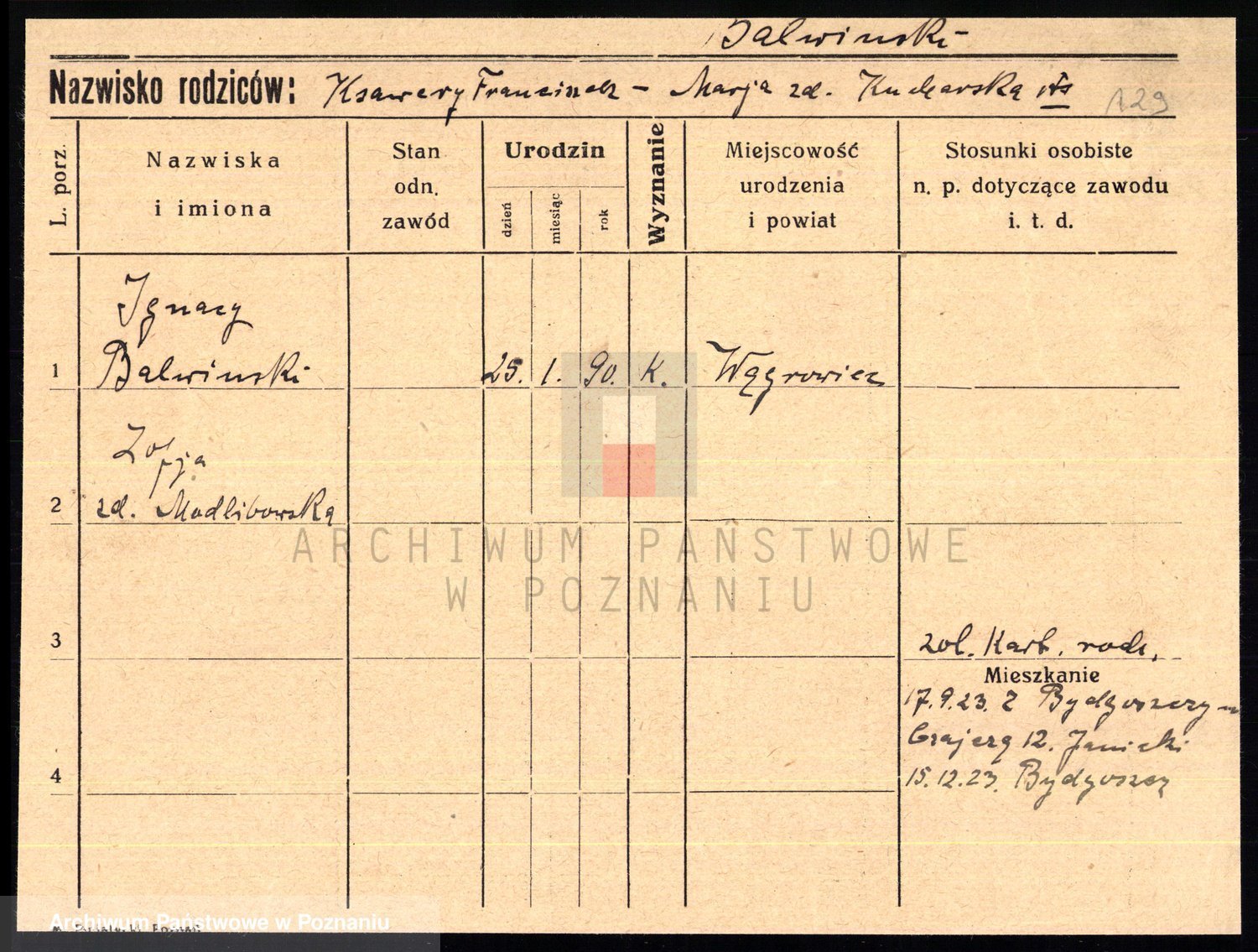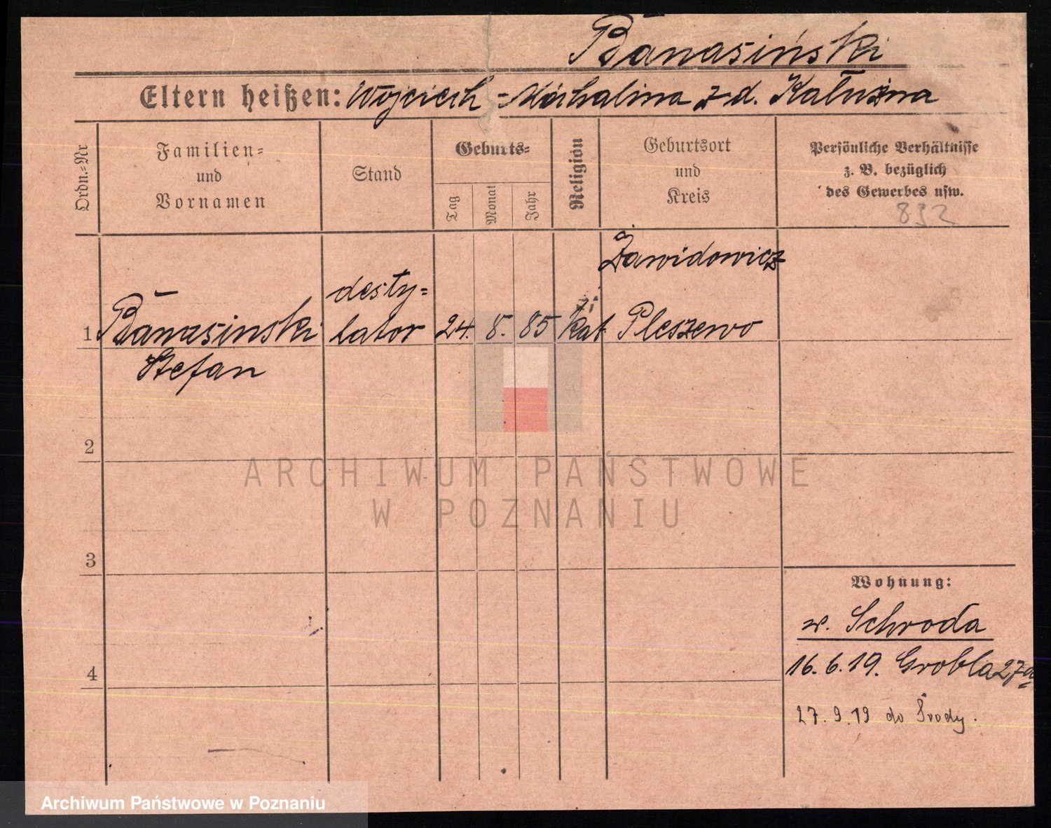 Podgląd karty osobowej dostępny jest po kliknięciu na nazwisko lub ikonkę karty. Można dokonywać powiększenia (ikony na górze) lub przechodzić między kolejnymi skanami (strzałki po bokach).