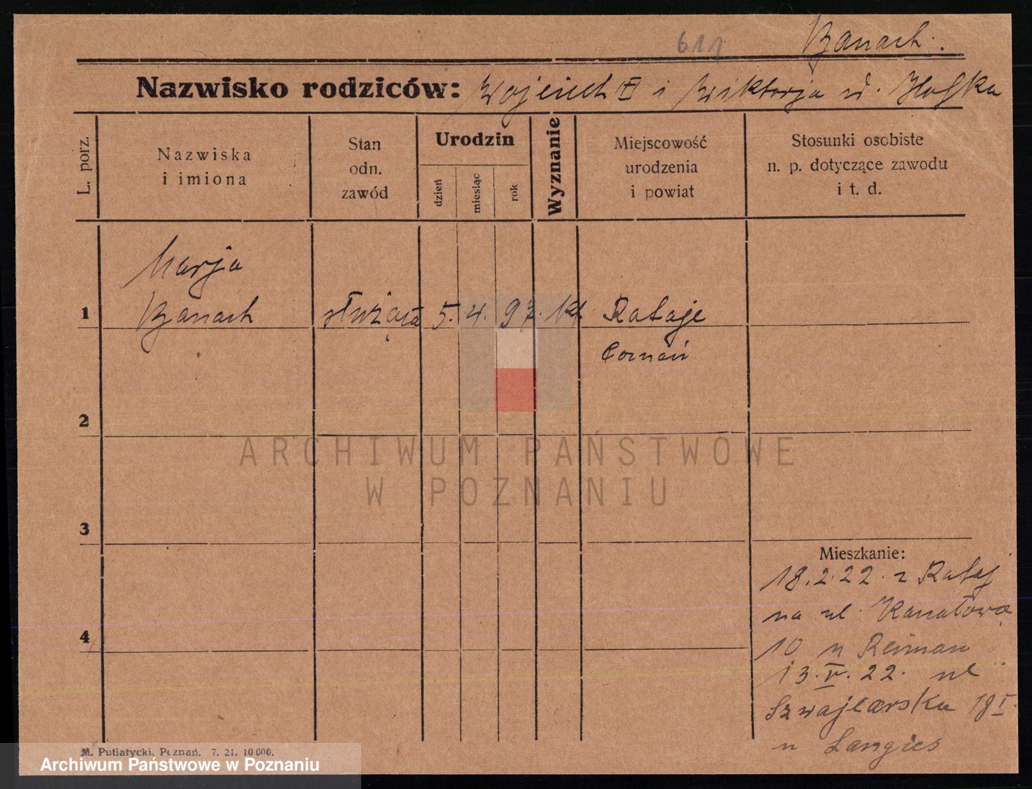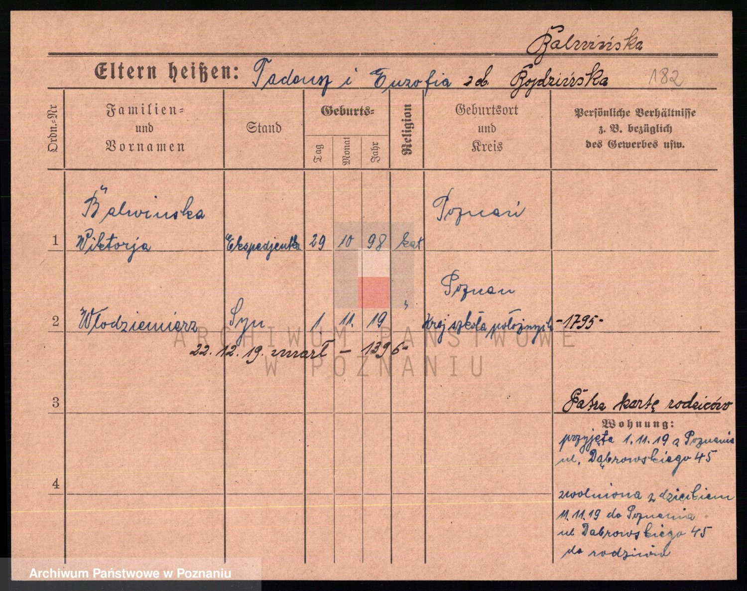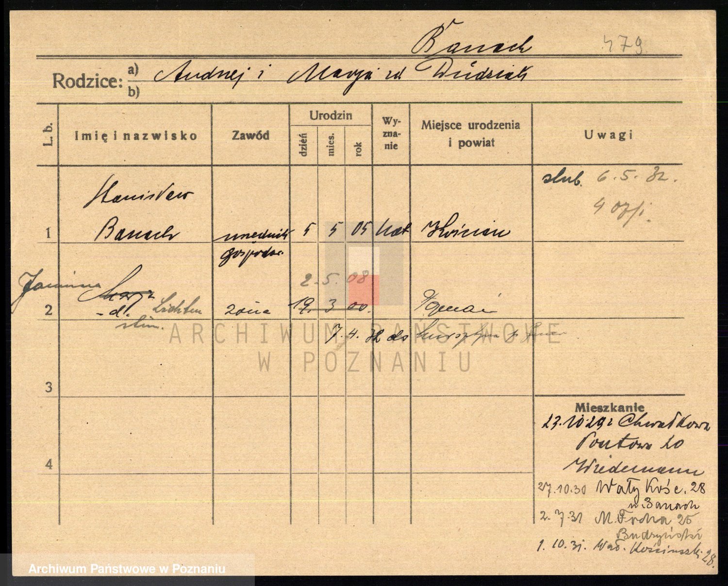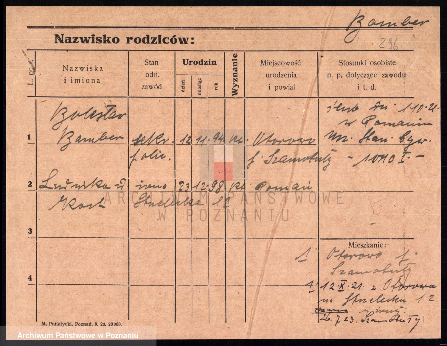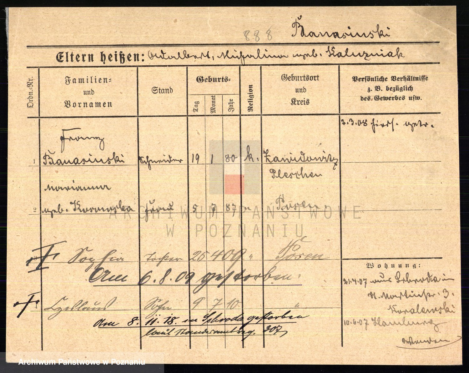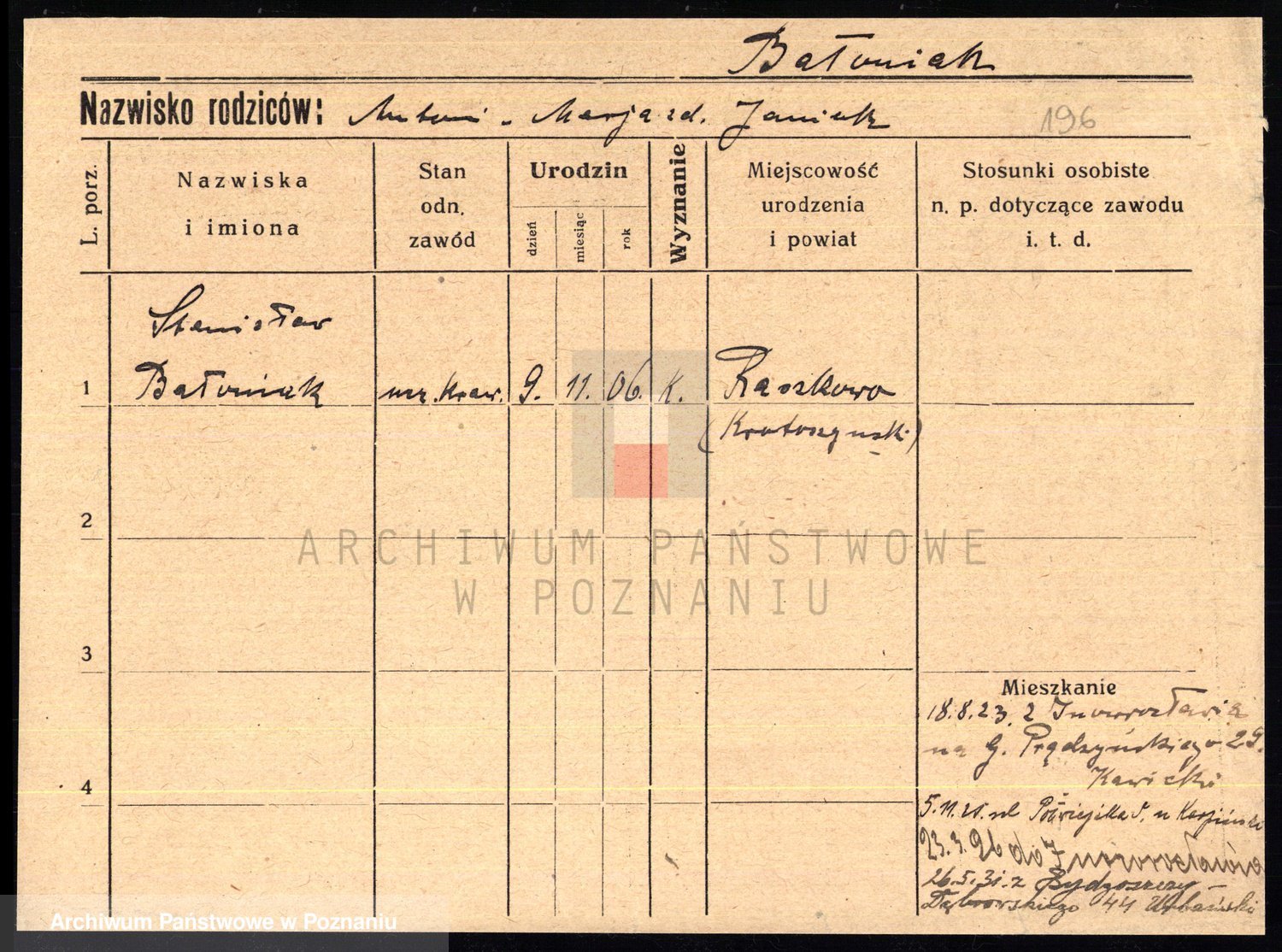 Podgląd karty osobowej dostępny jest po kliknięciu na nazwisko lub ikonkę karty. Można dokonywać powiększenia (ikony na górze) lub przechodzić między kolejnymi skanami (strzałki po bokach).