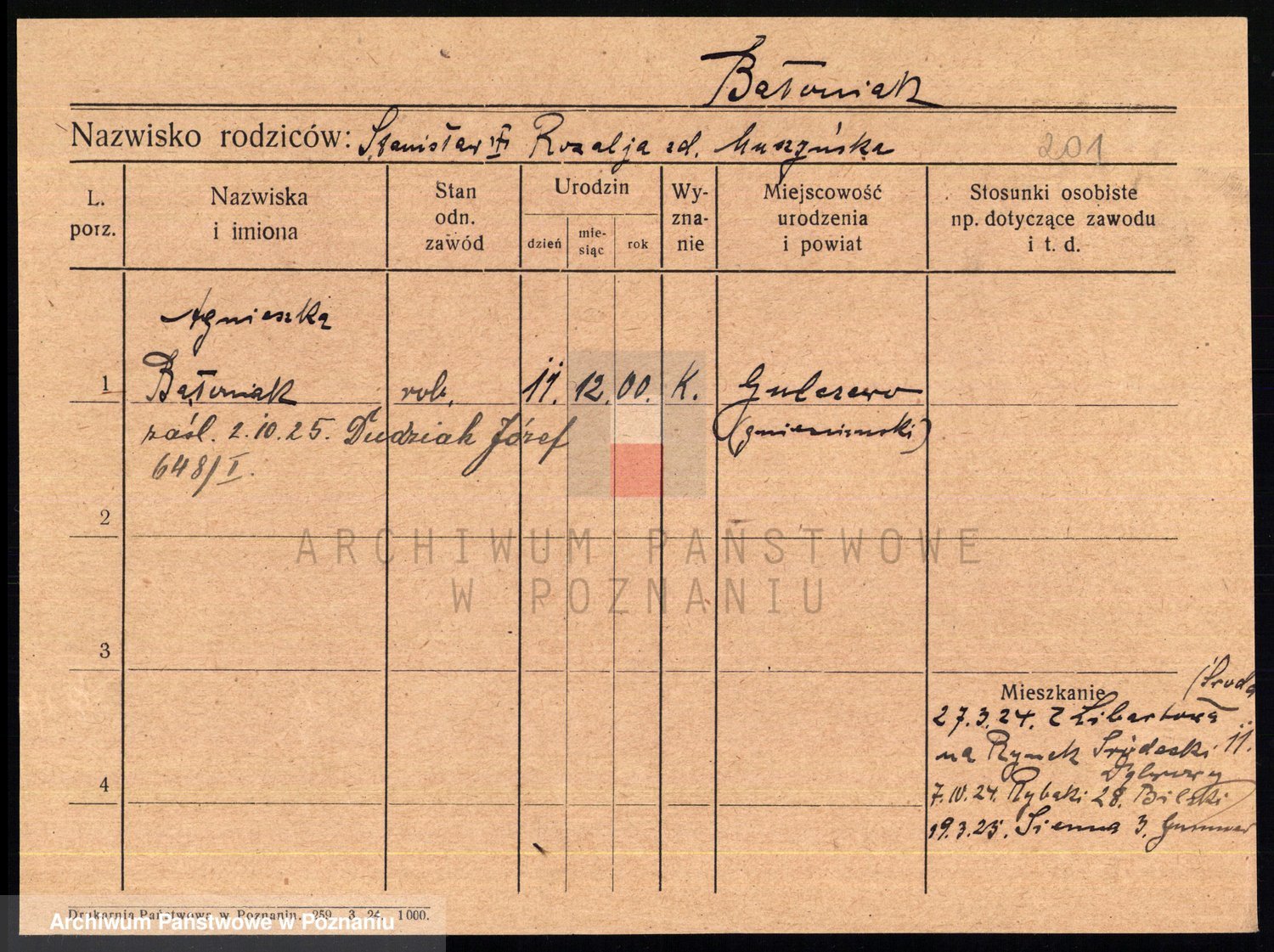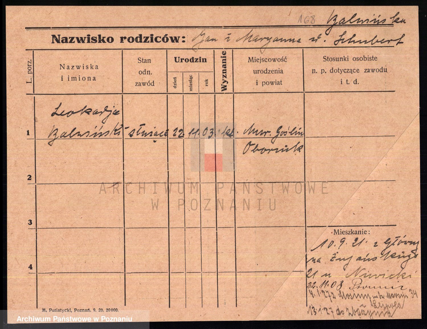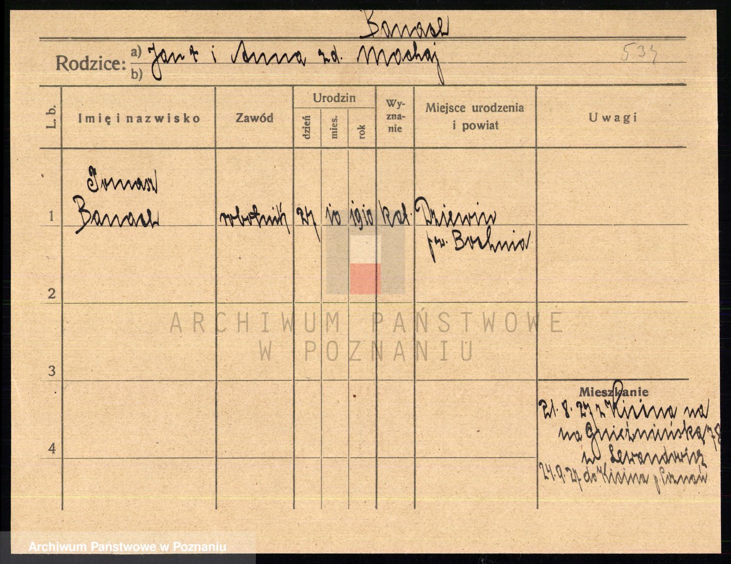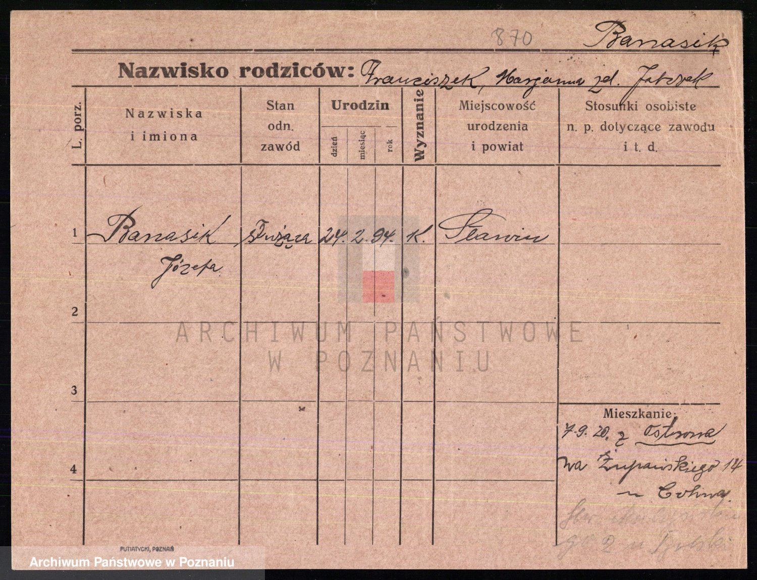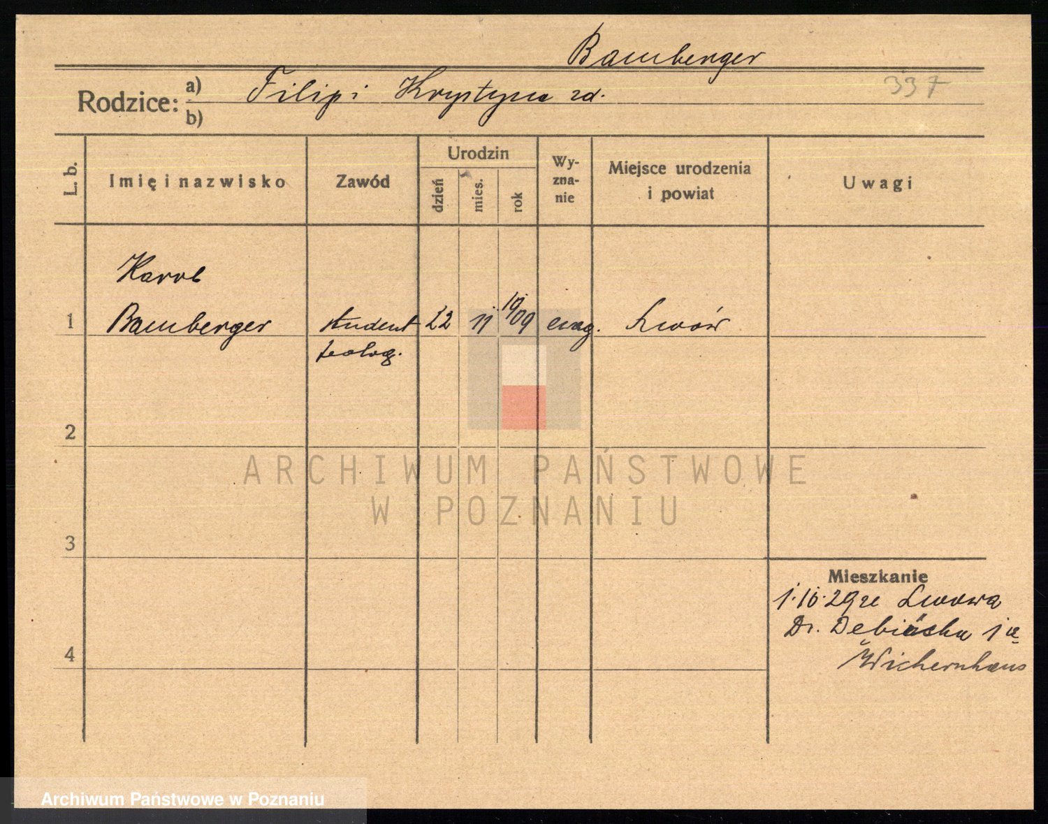 Podgląd karty osobowej dostępny jest po kliknięciu na nazwisko lub ikonkę karty. Można dokonywać powiększenia (ikony na górze) lub przechodzić między kolejnymi skanami (strzałki po bokach).