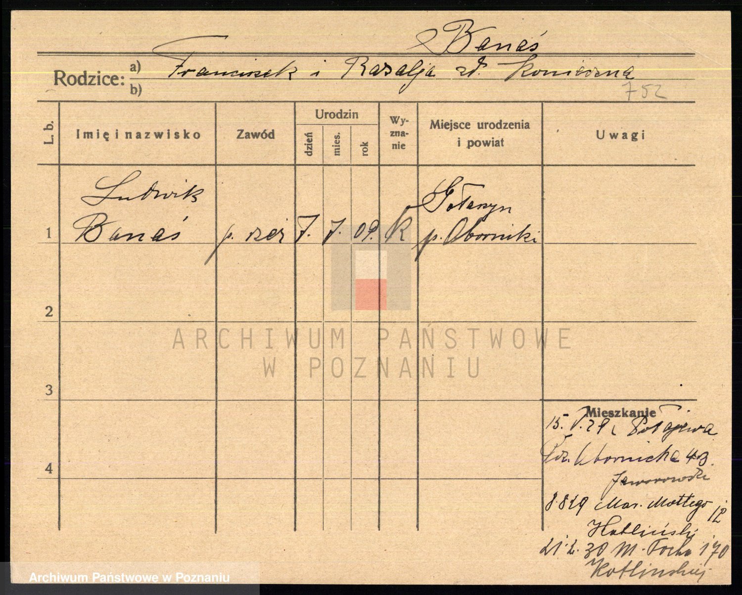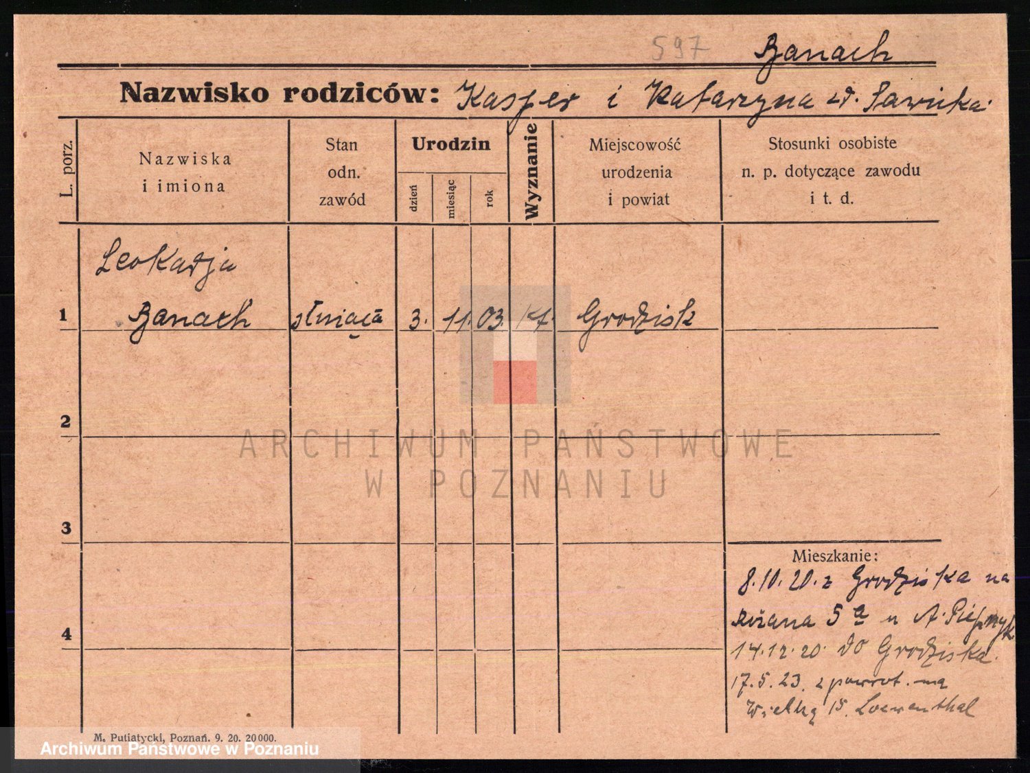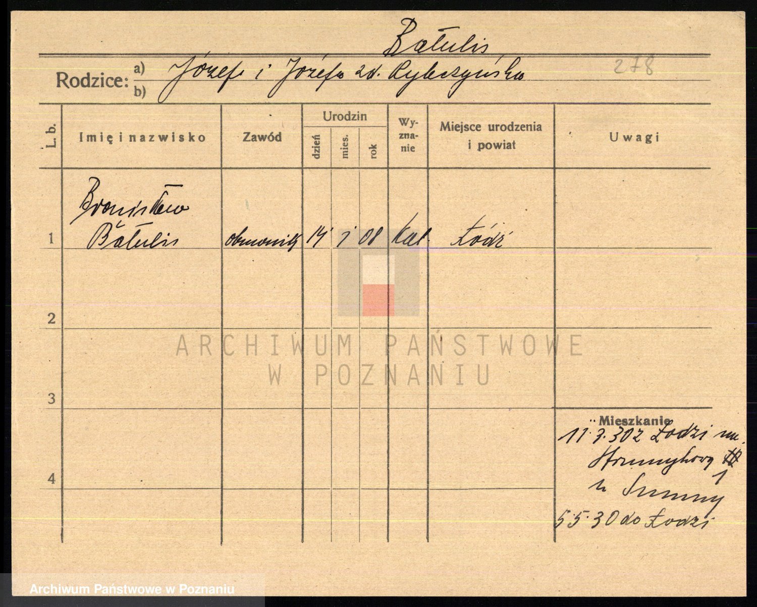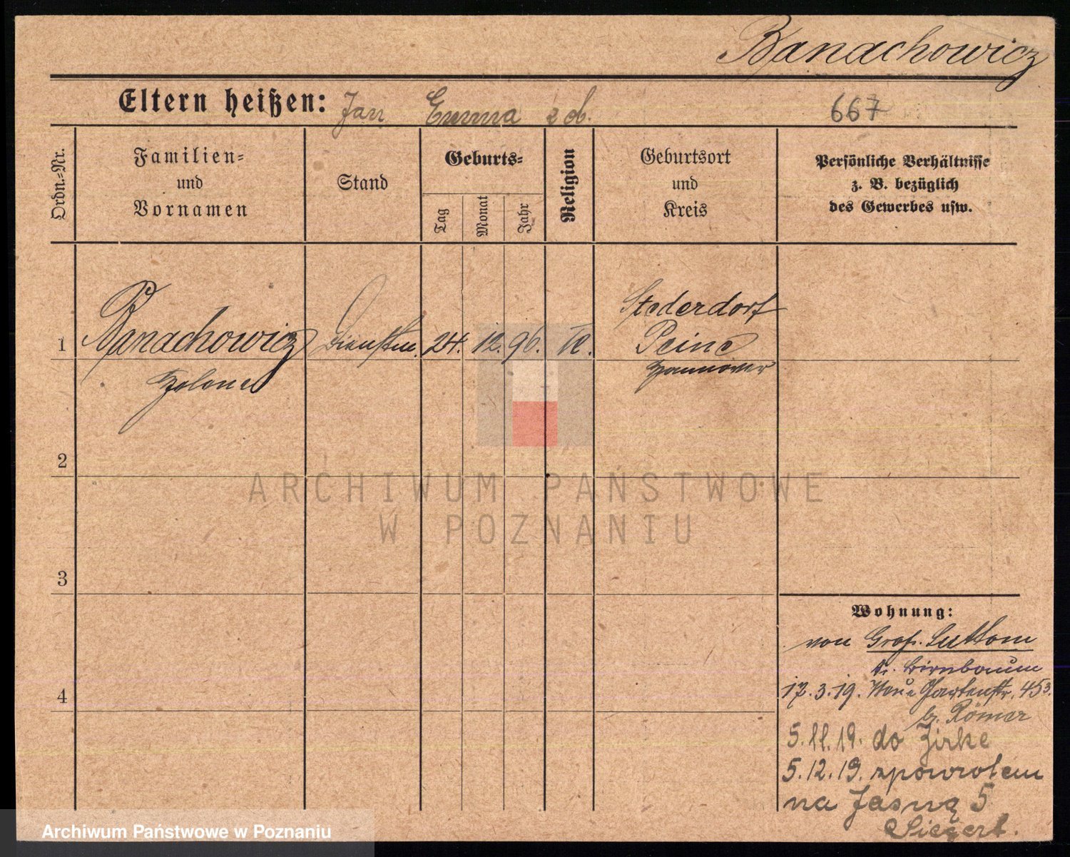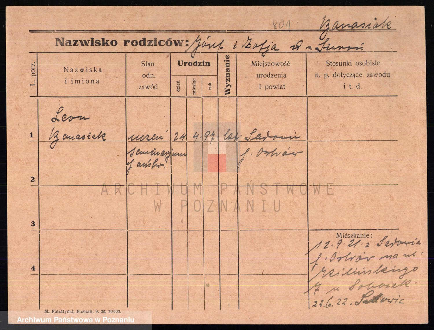 Podgląd karty osobowej dostępny jest po kliknięciu na nazwisko lub ikonkę karty. Można dokonywać powiększenia (ikony na górze) lub przechodzić między kolejnymi skanami (strzałki po bokach).