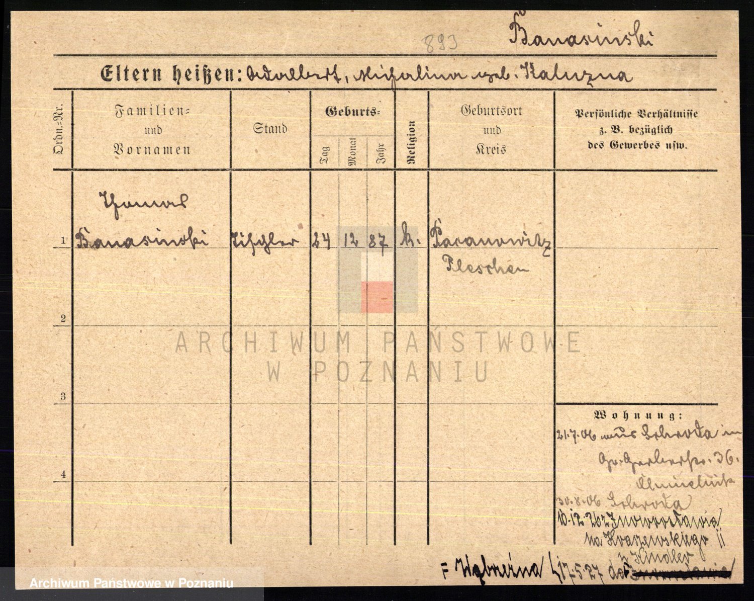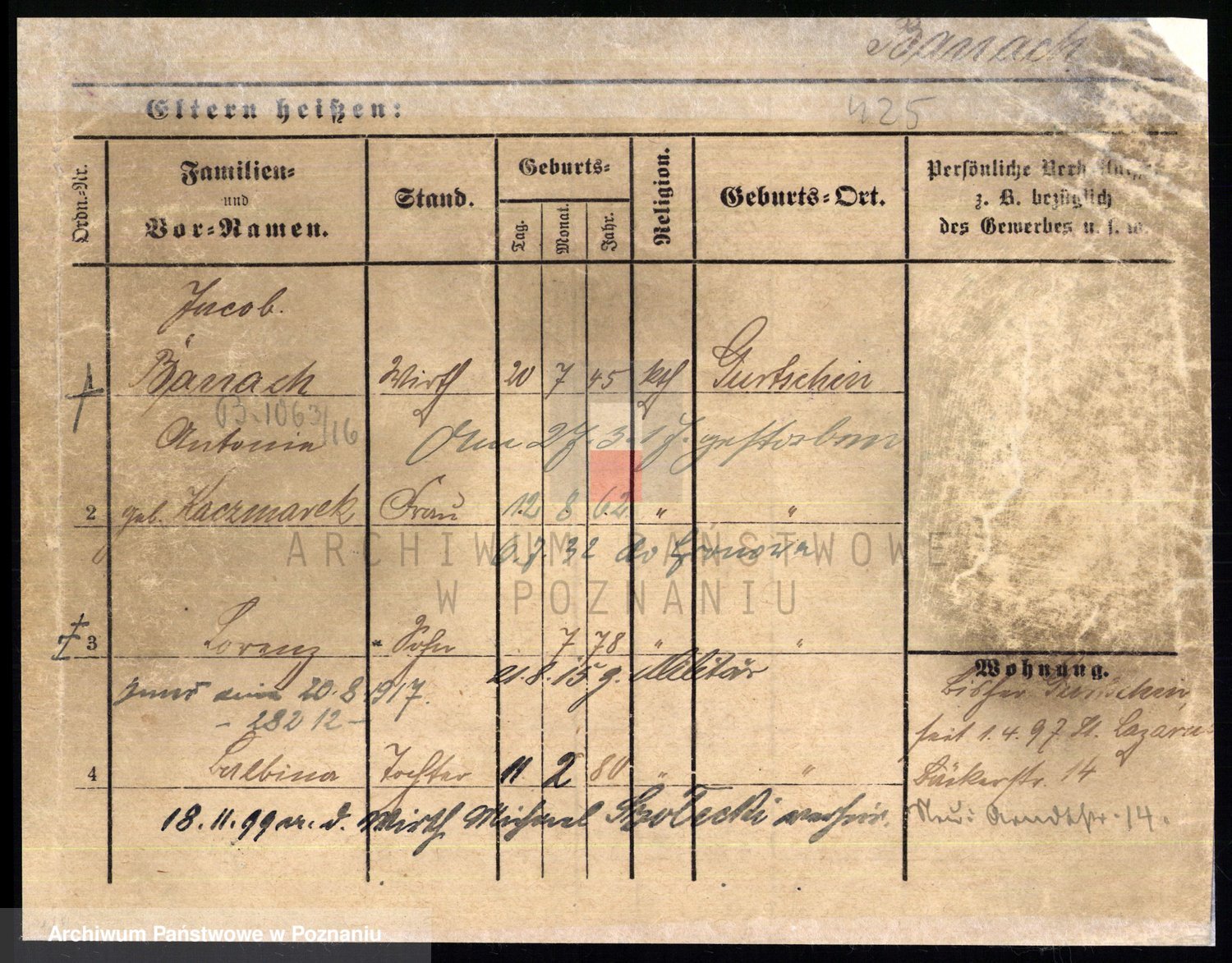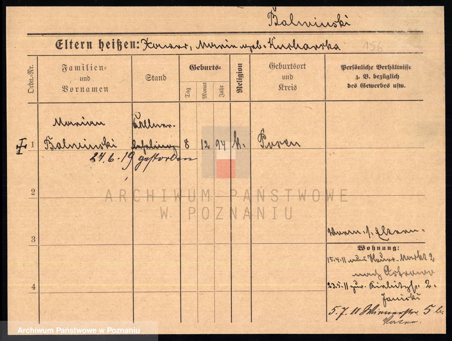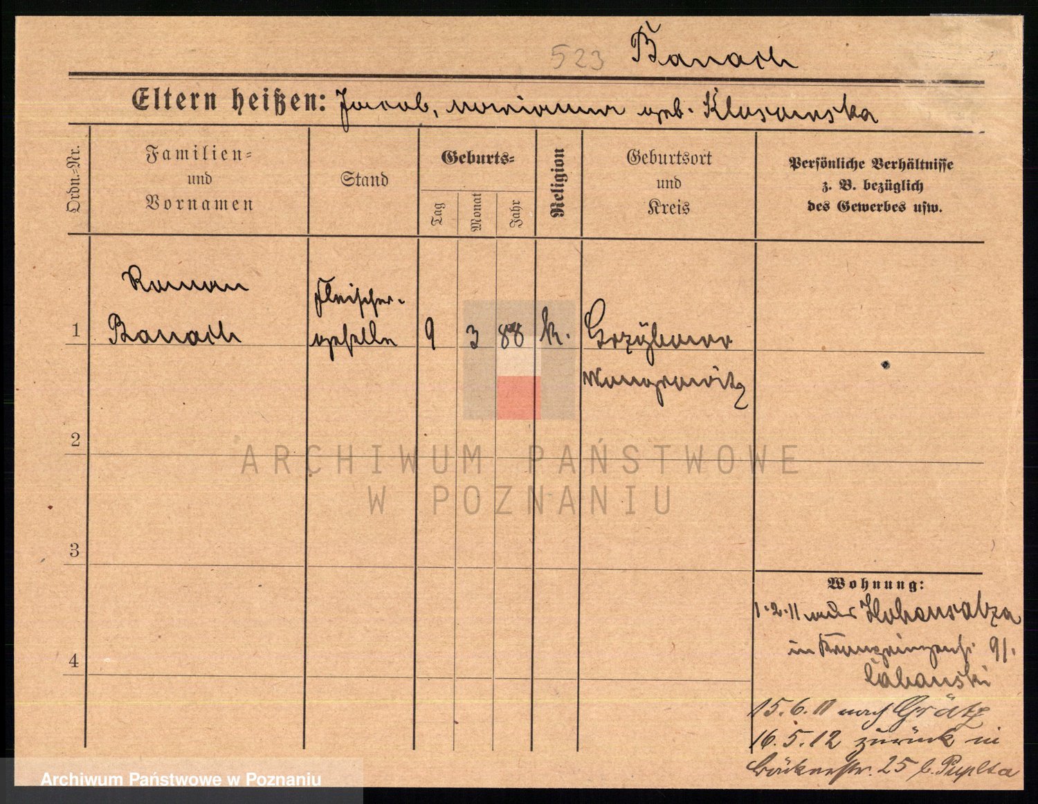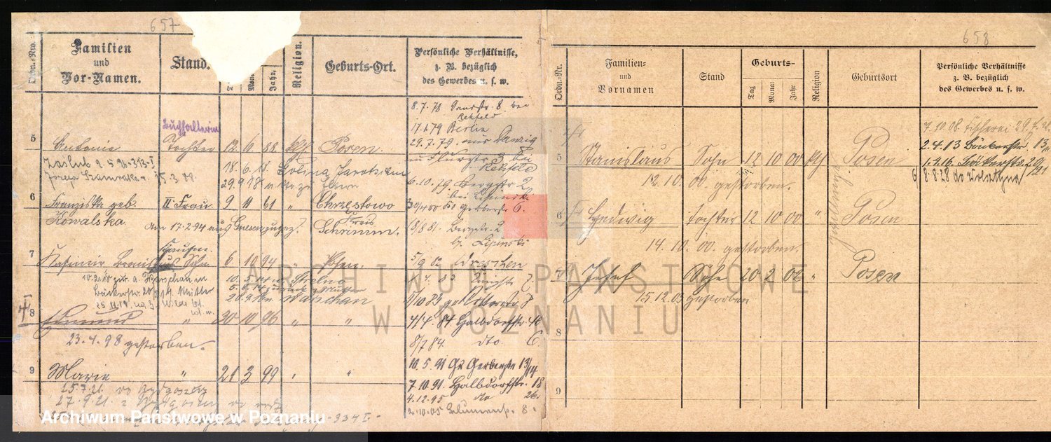 Podgląd karty osobowej dostępny jest po kliknięciu na nazwisko lub ikonkę karty. Można dokonywać powiększenia (ikony na górze) lub przechodzić między kolejnymi skanami (strzałki po bokach).