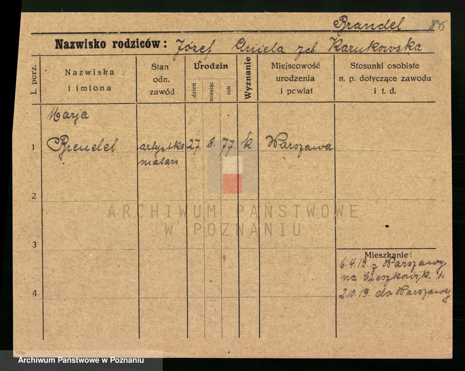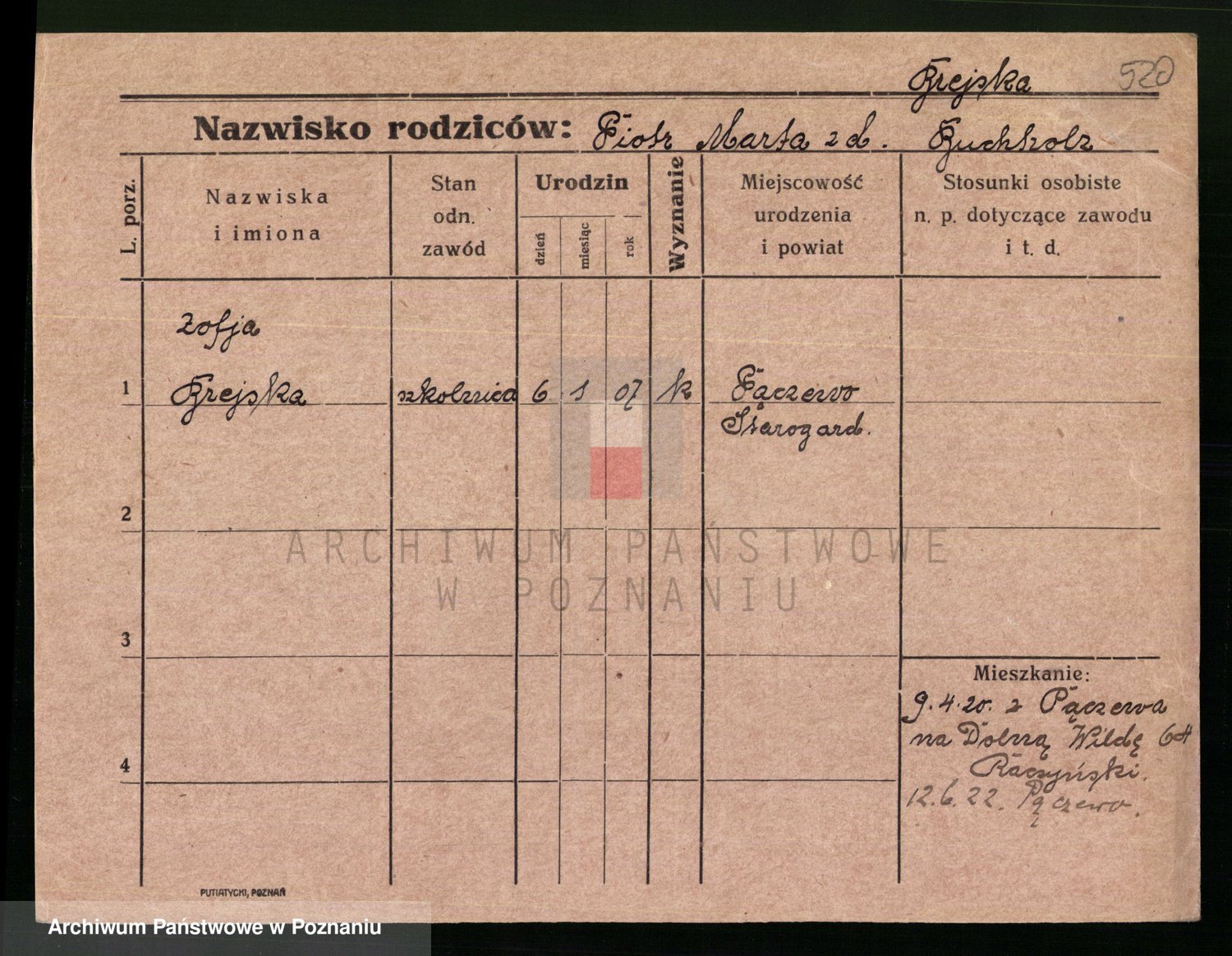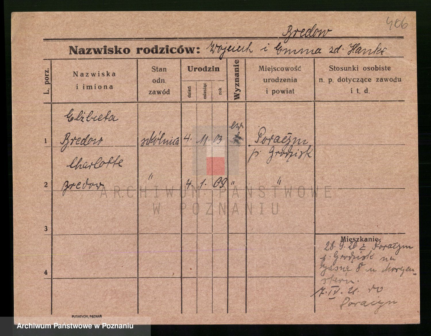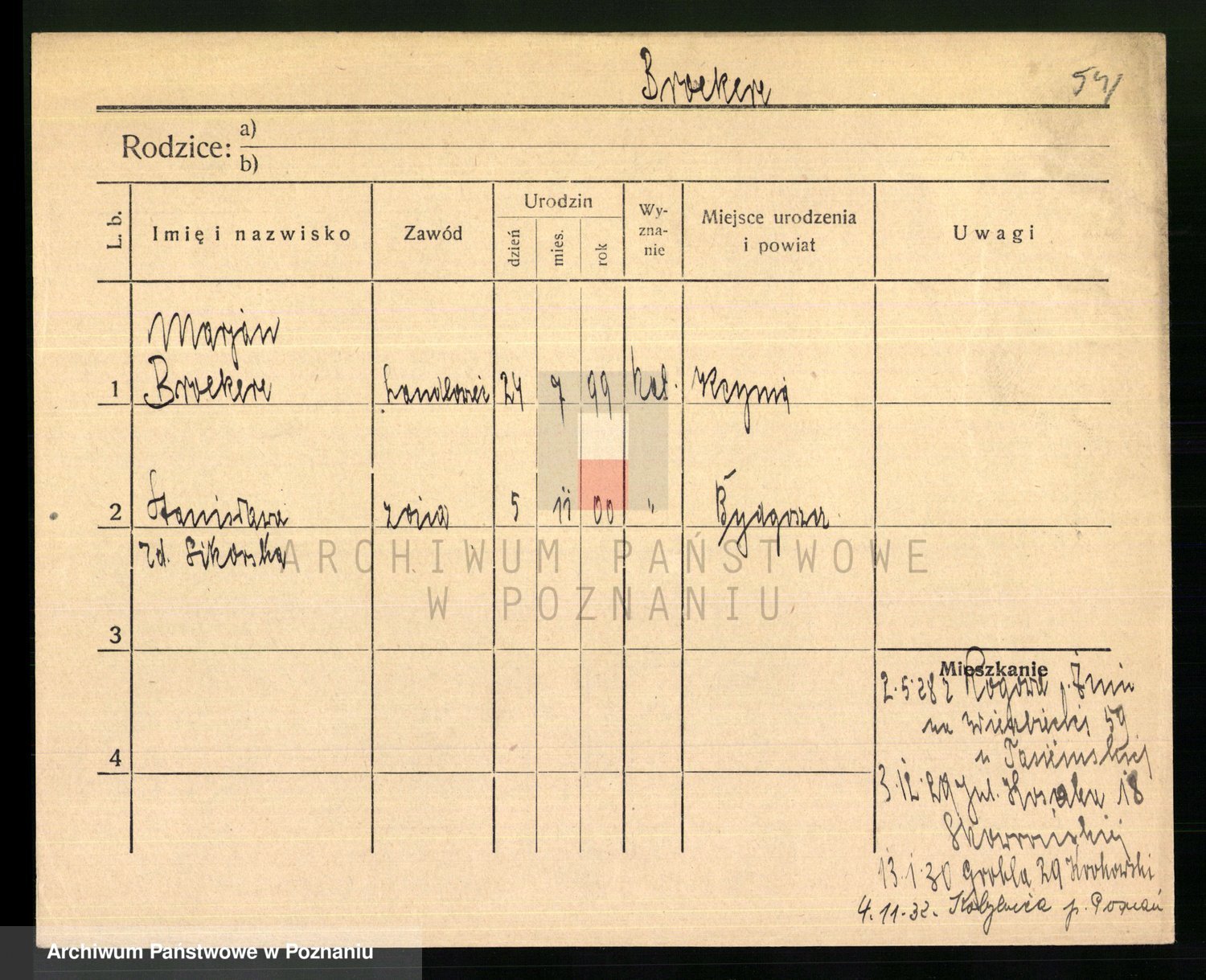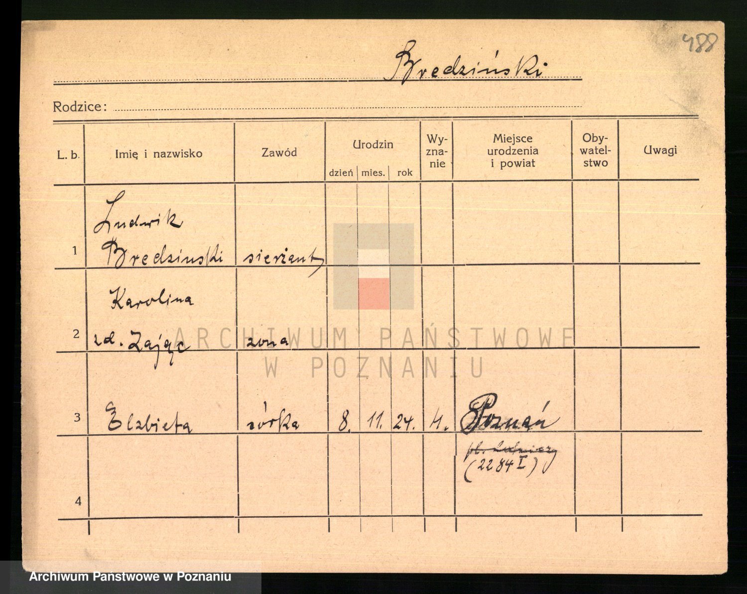 Podgląd karty osobowej dostępny jest po kliknięciu na nazwisko lub ikonkę karty. Można dokonywać powiększenia (ikony na górze) lub przechodzić między kolejnymi skanami (strzałki po bokach).