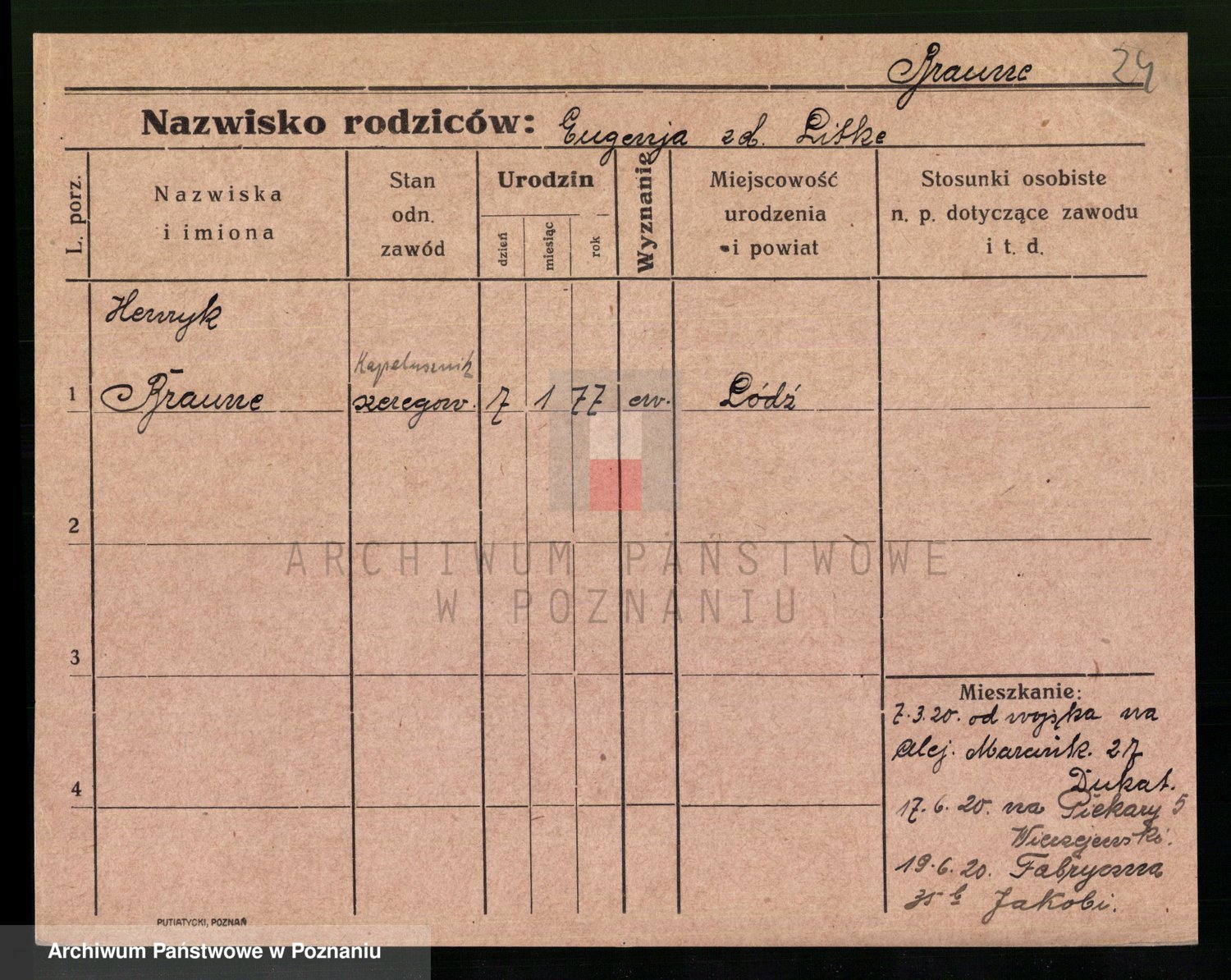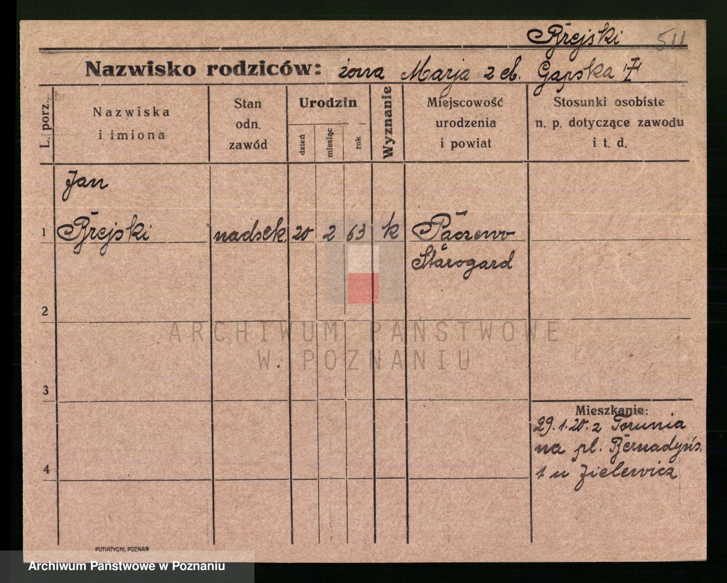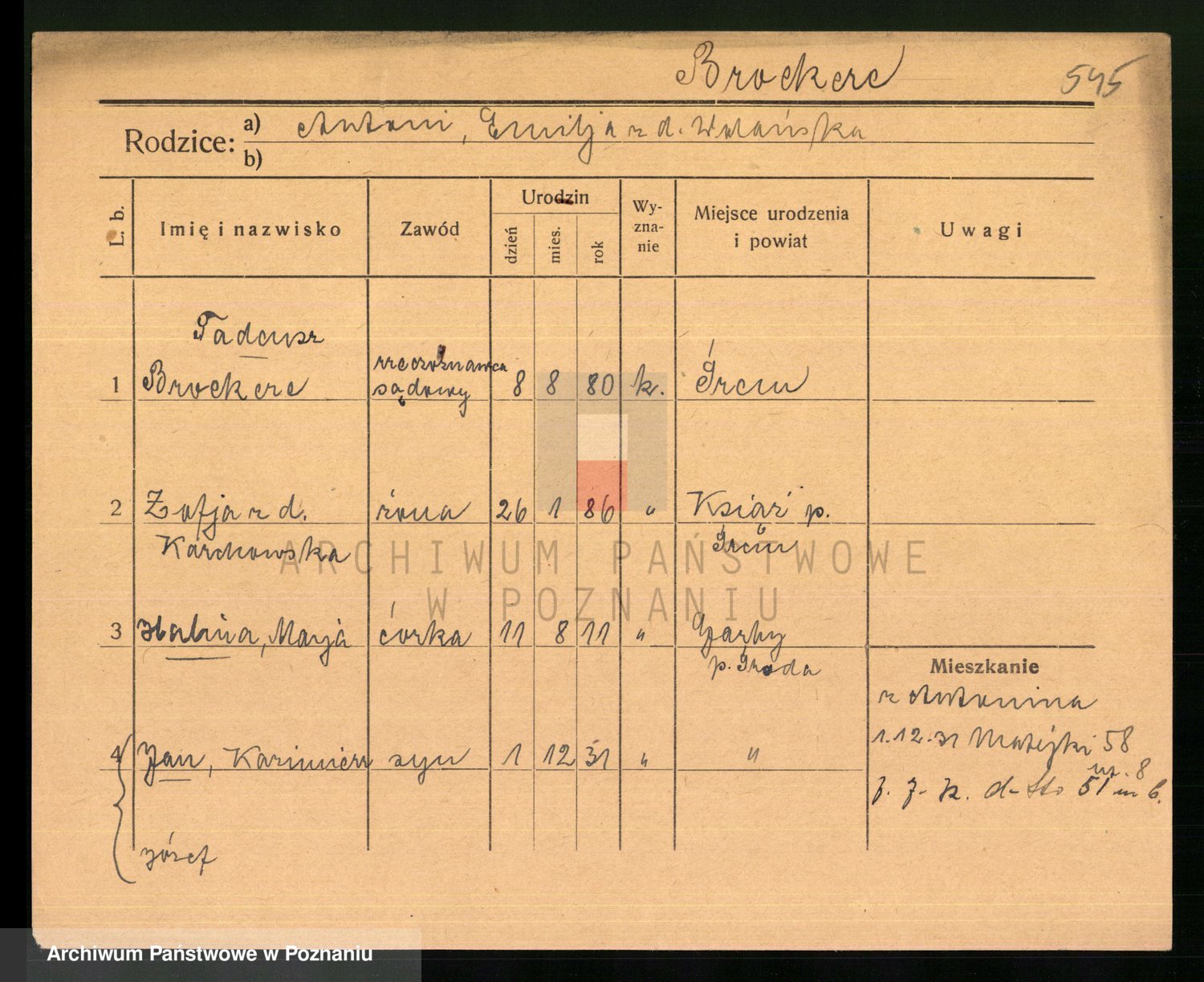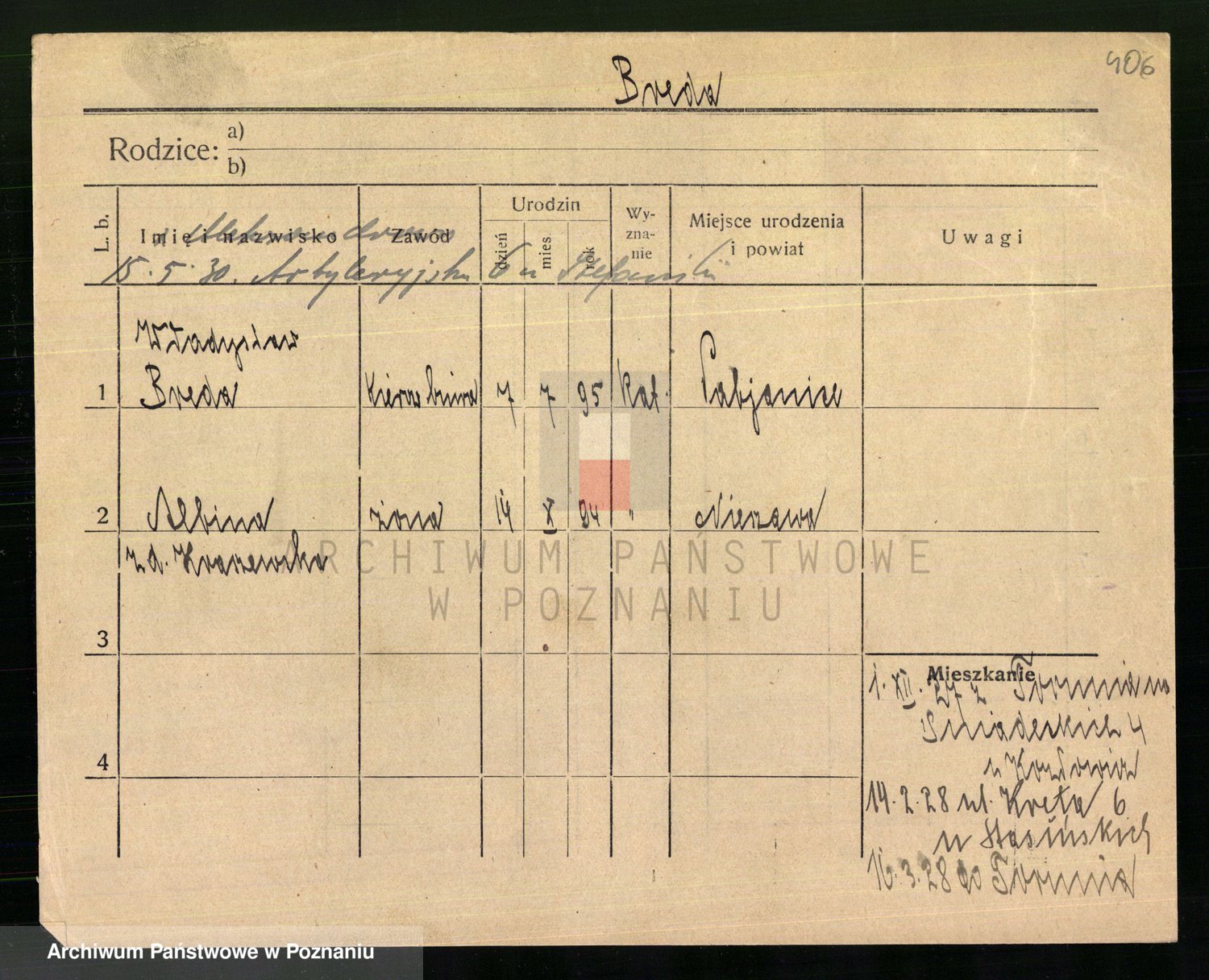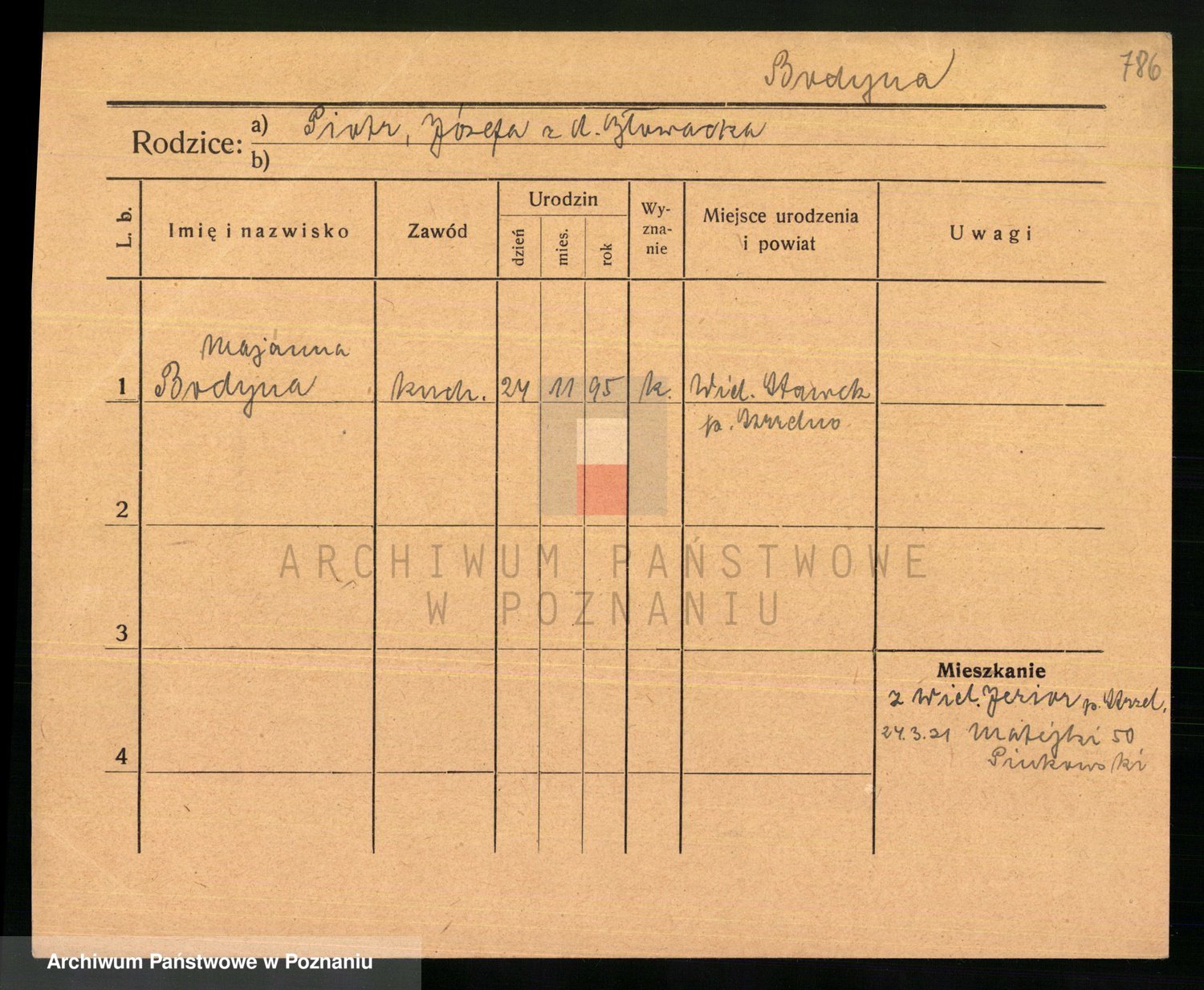Podgląd karty osobowej dostępny jest po kliknięciu na nazwisko lub ikonkę karty. Można dokonywać powiększenia (ikony na górze) lub przechodzić między kolejnymi skanami (strzałki po bokach).