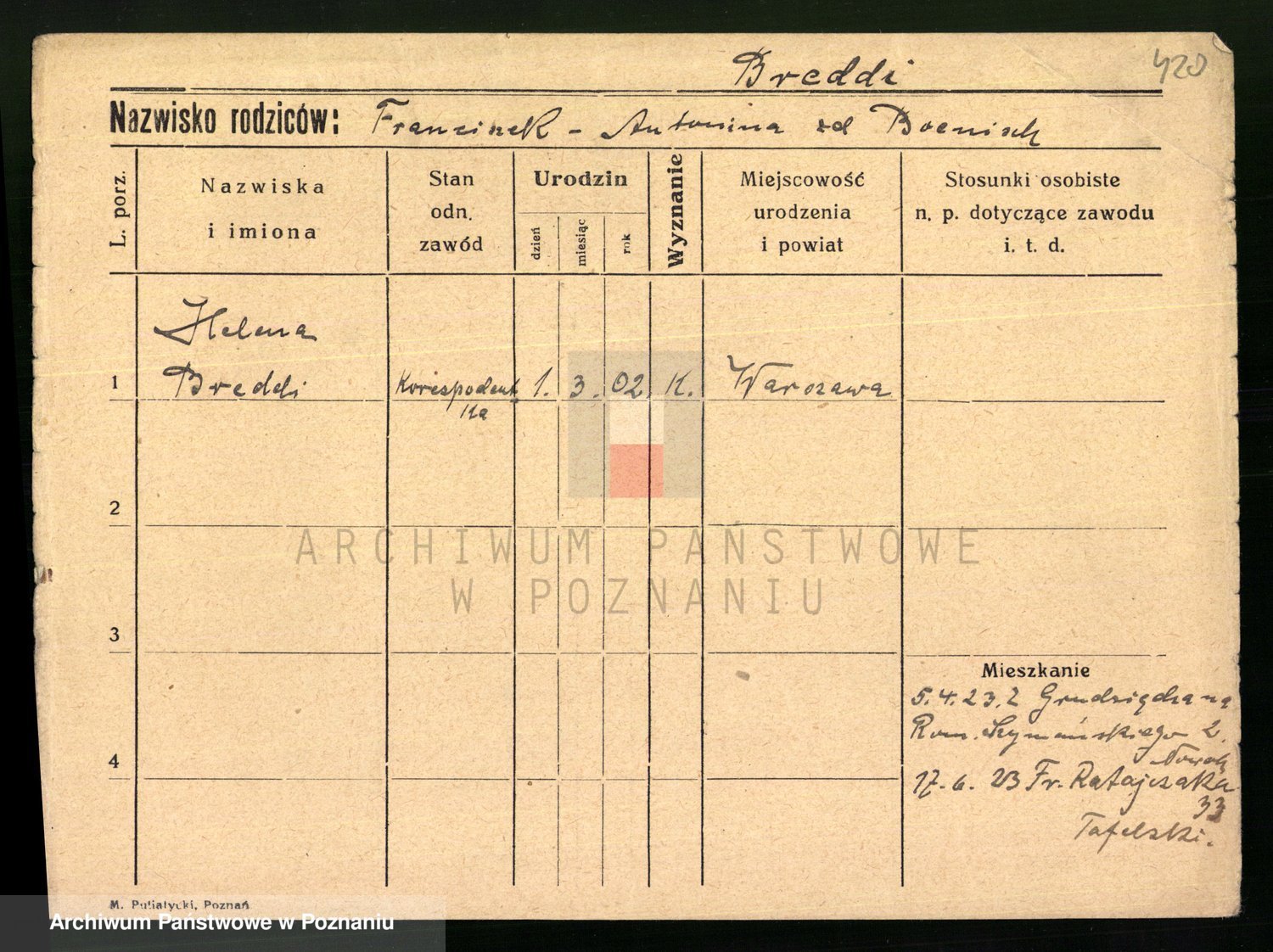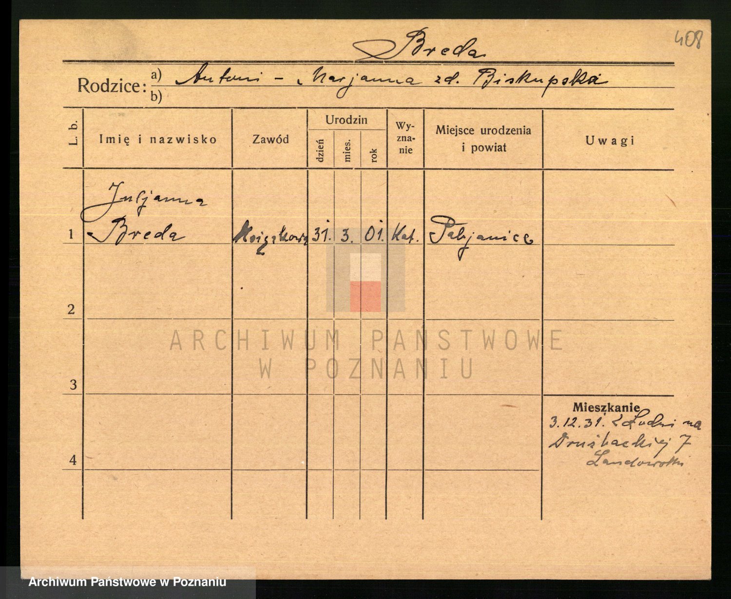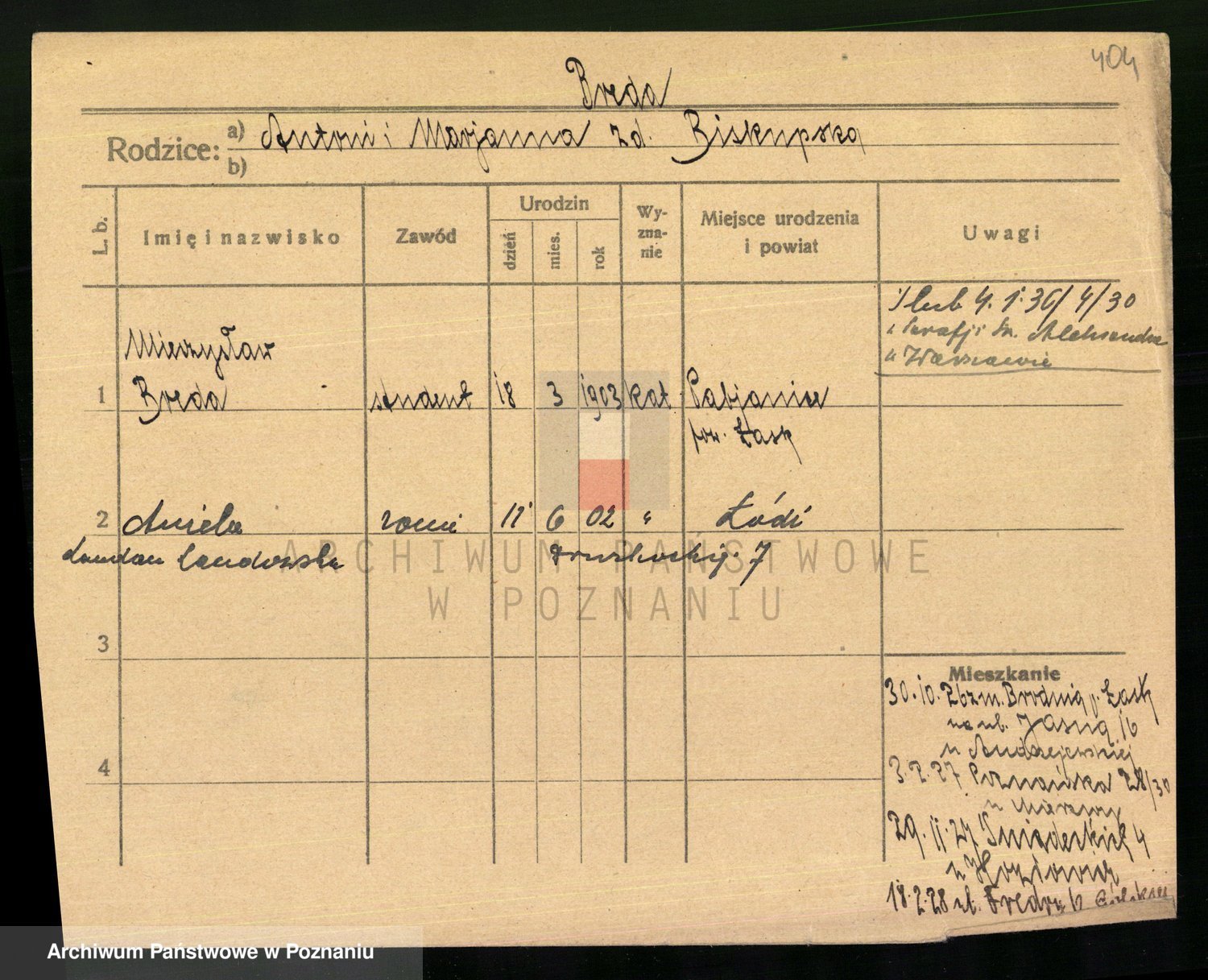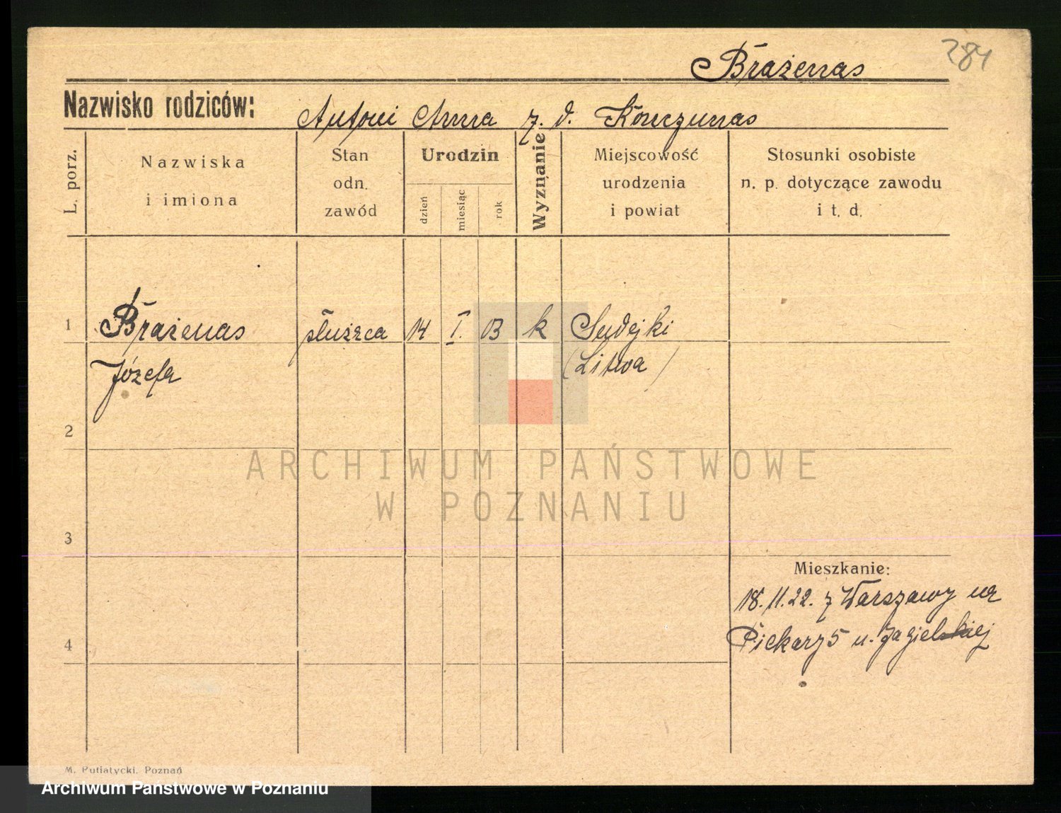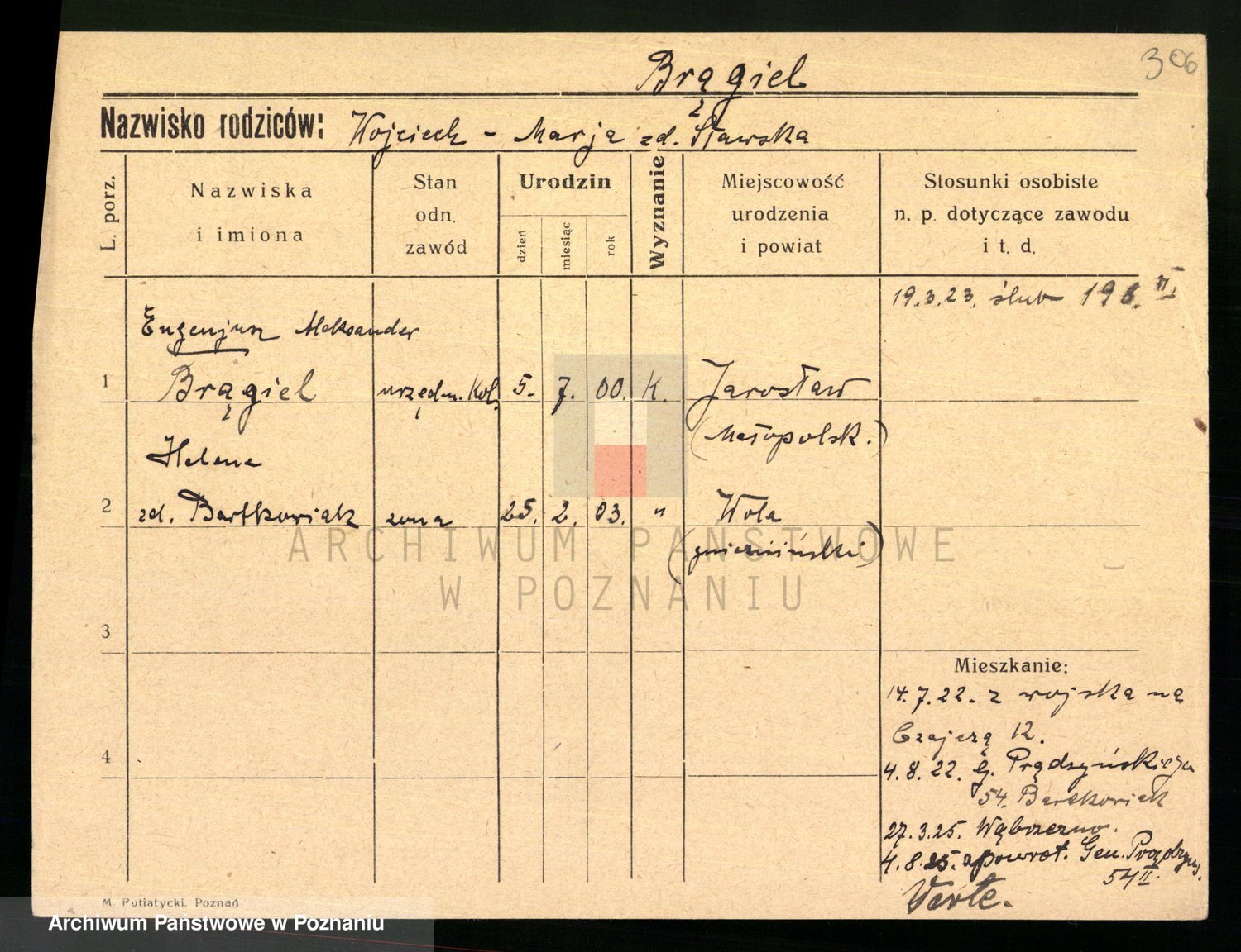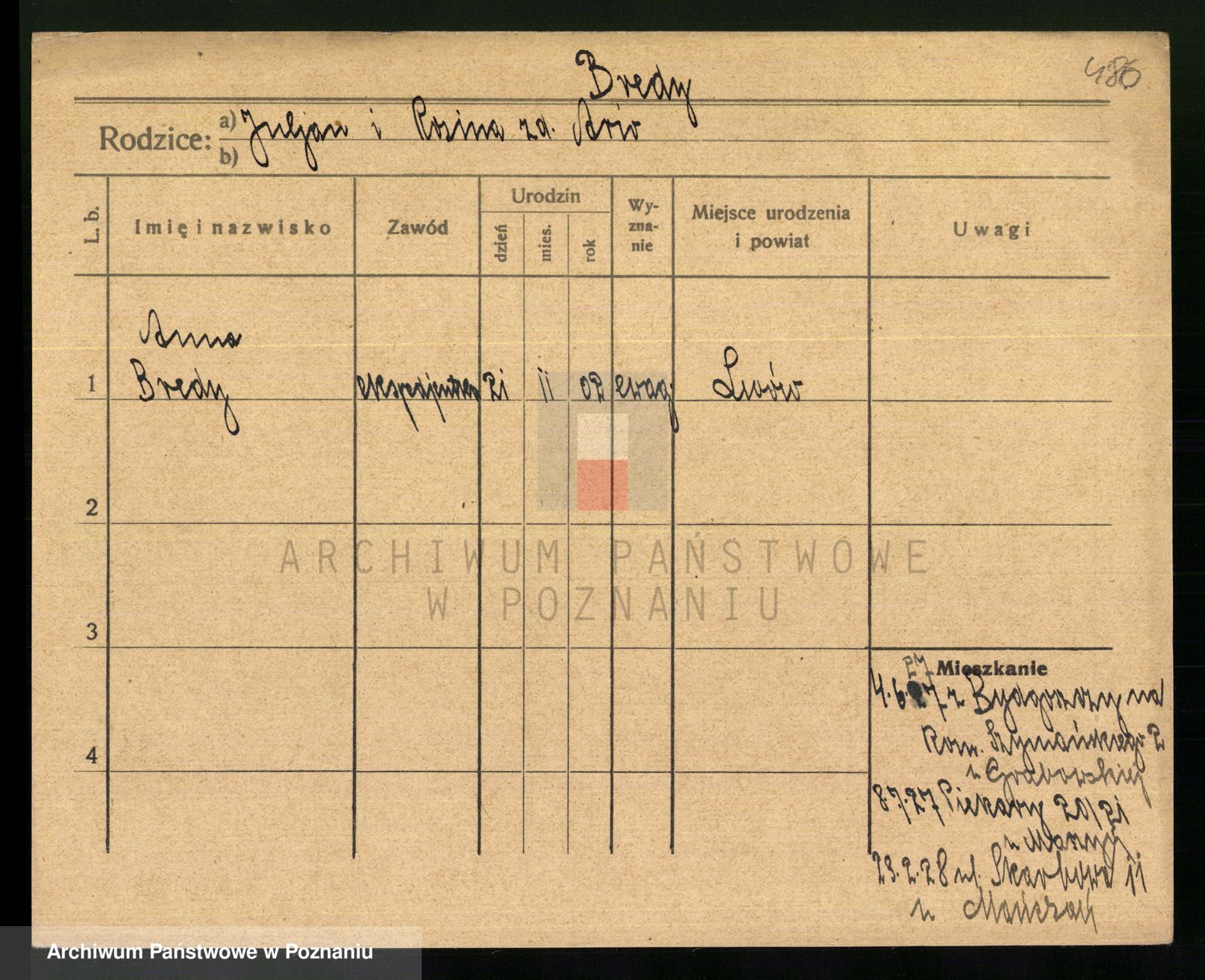 Podgląd karty osobowej dostępny jest po kliknięciu na nazwisko lub ikonkę karty. Można dokonywać powiększenia (ikony na górze) lub przechodzić między kolejnymi skanami (strzałki po bokach).