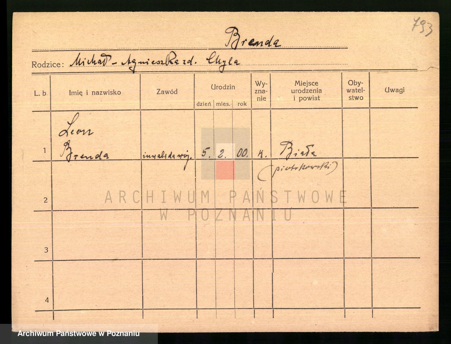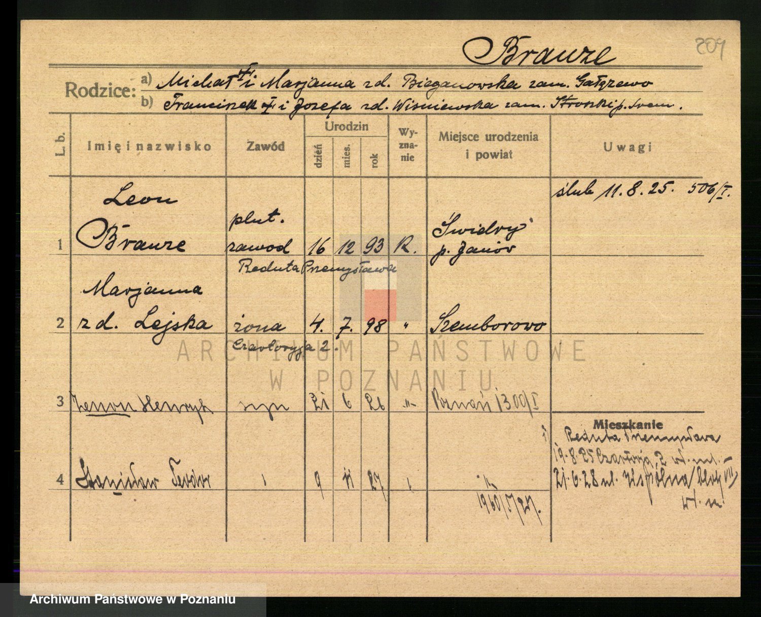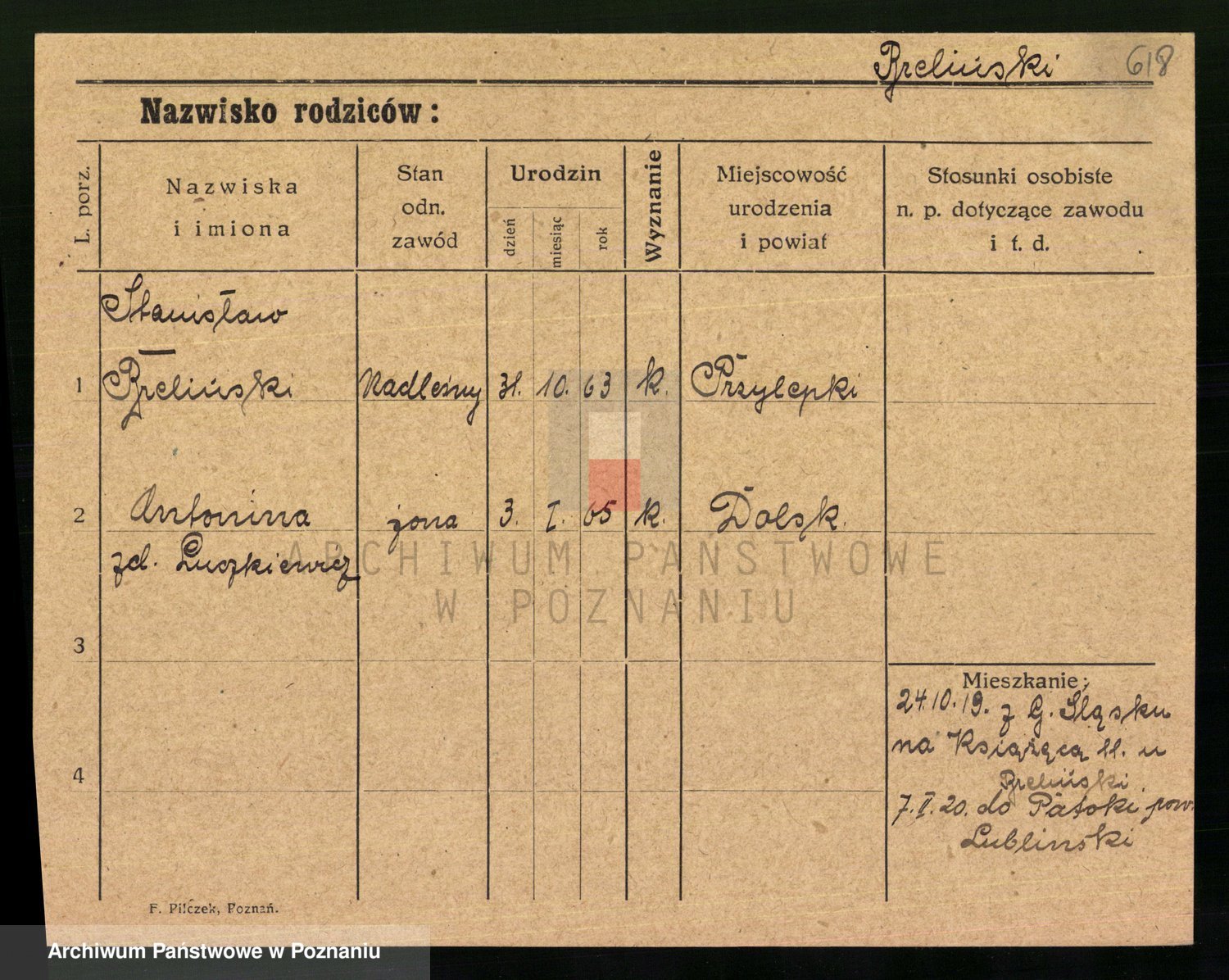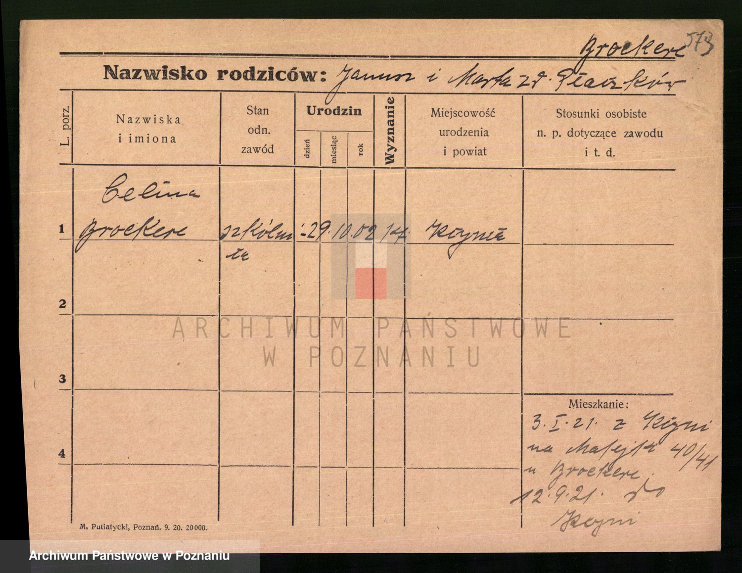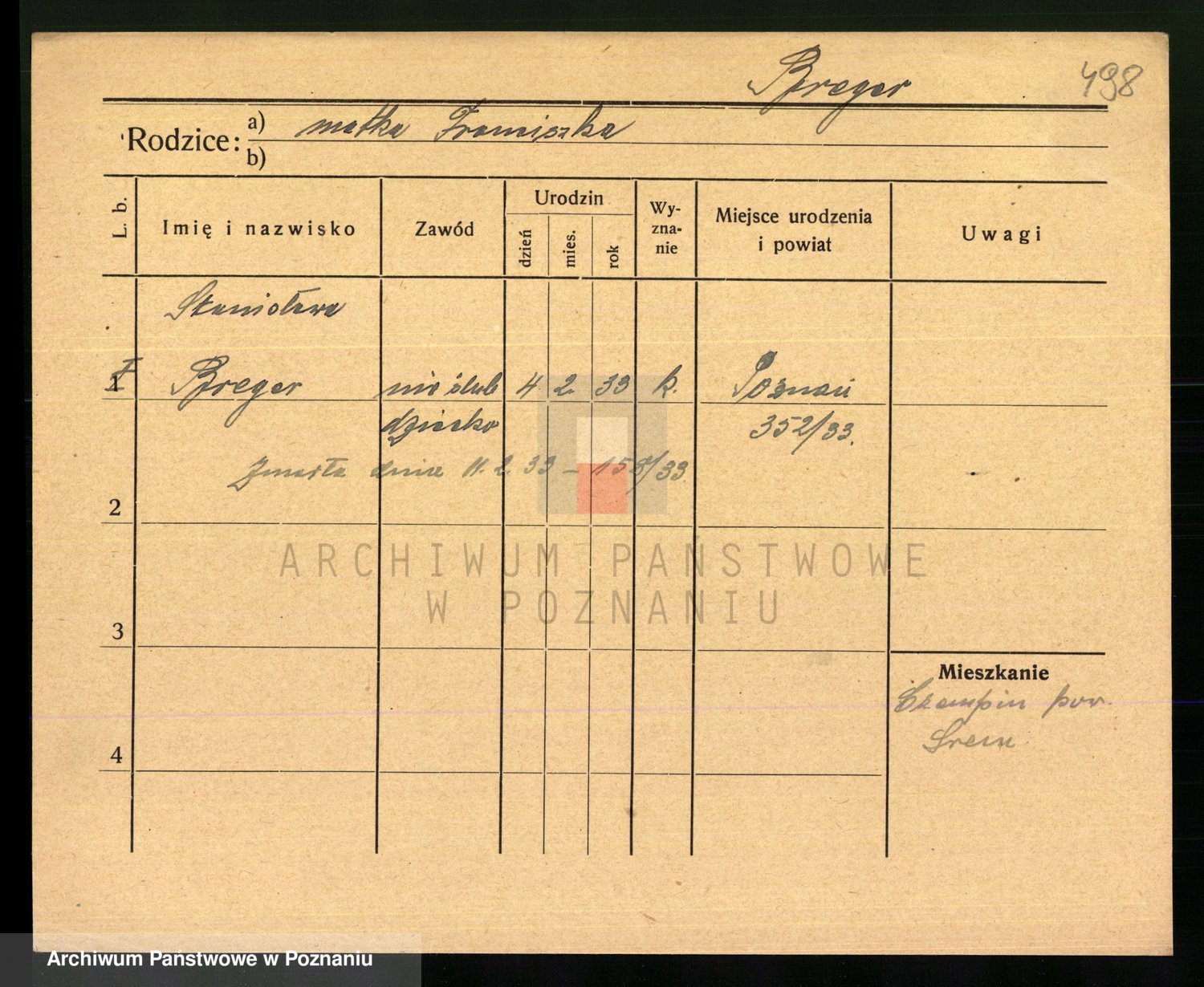 Podgląd karty osobowej dostępny jest po kliknięciu na nazwisko lub ikonkę karty. Można dokonywać powiększenia (ikony na górze) lub przechodzić między kolejnymi skanami (strzałki po bokach).