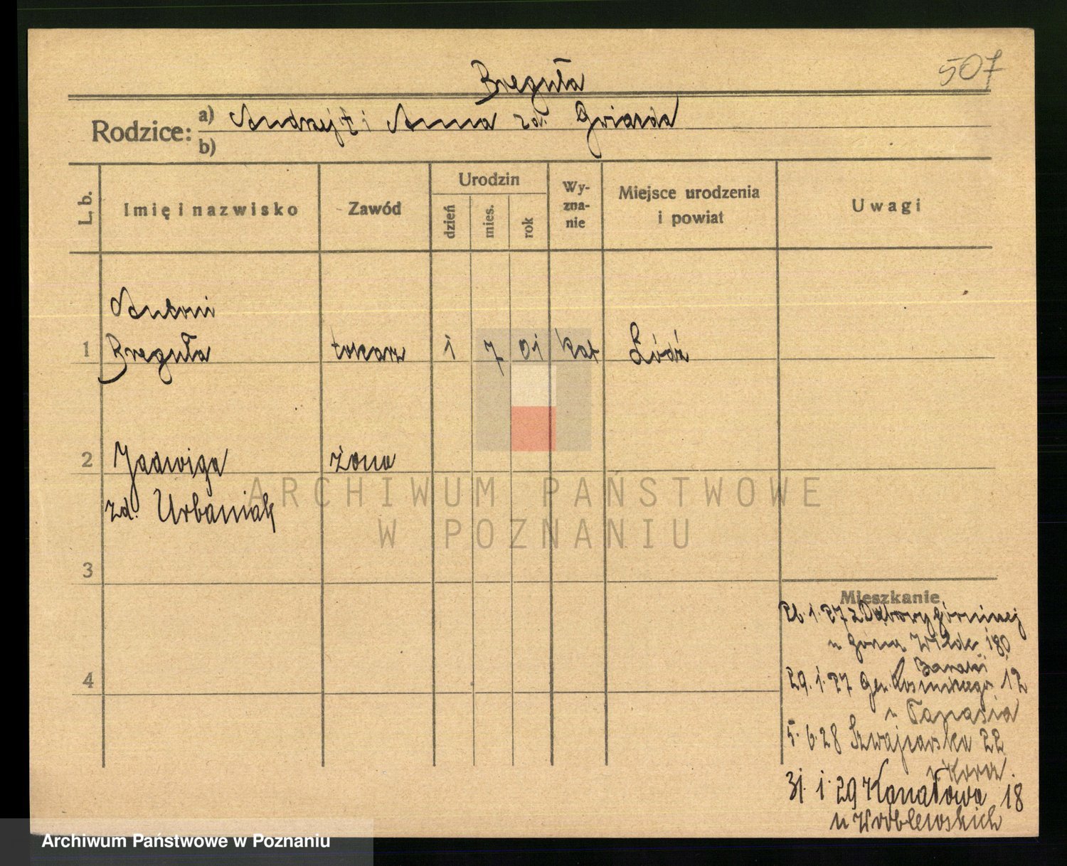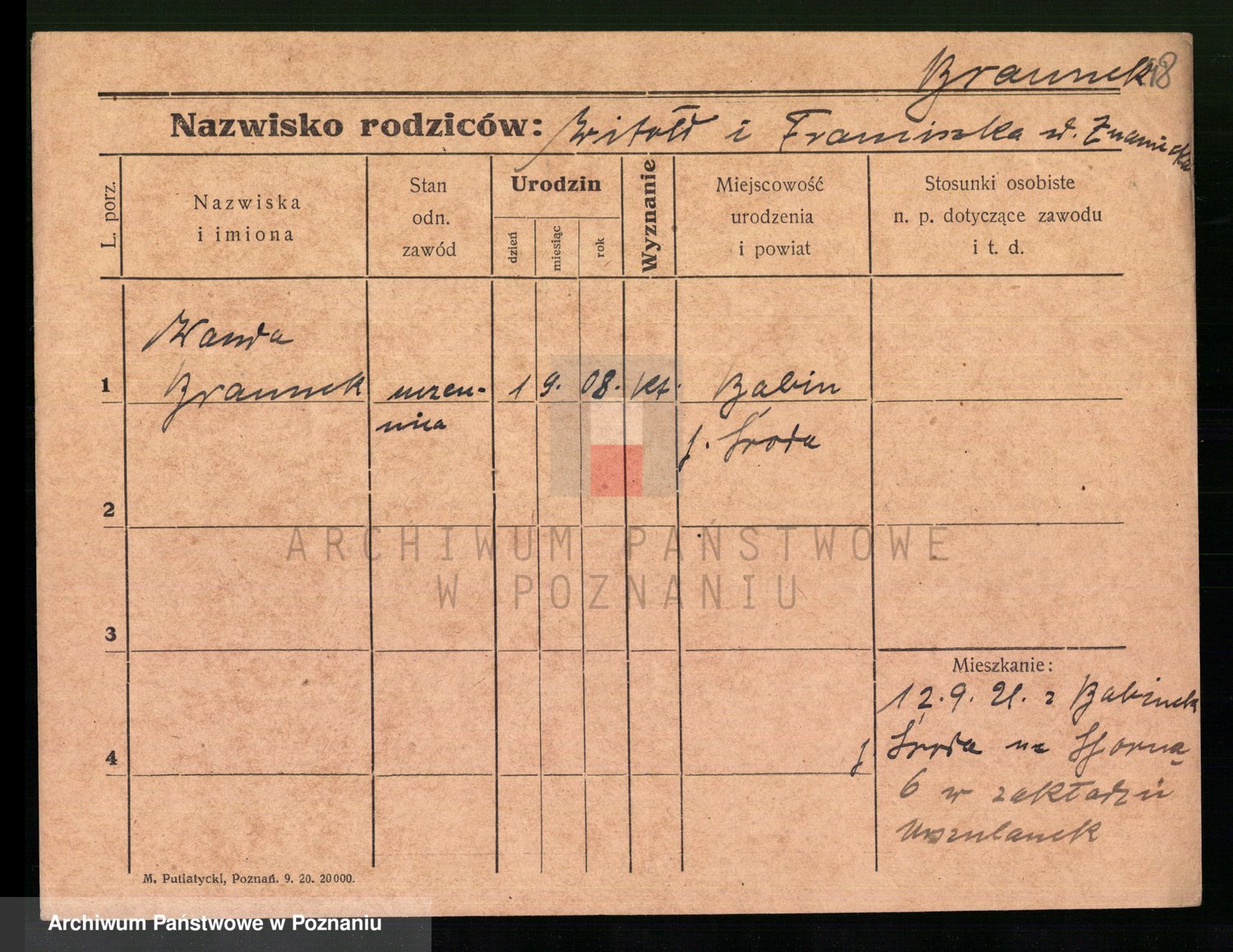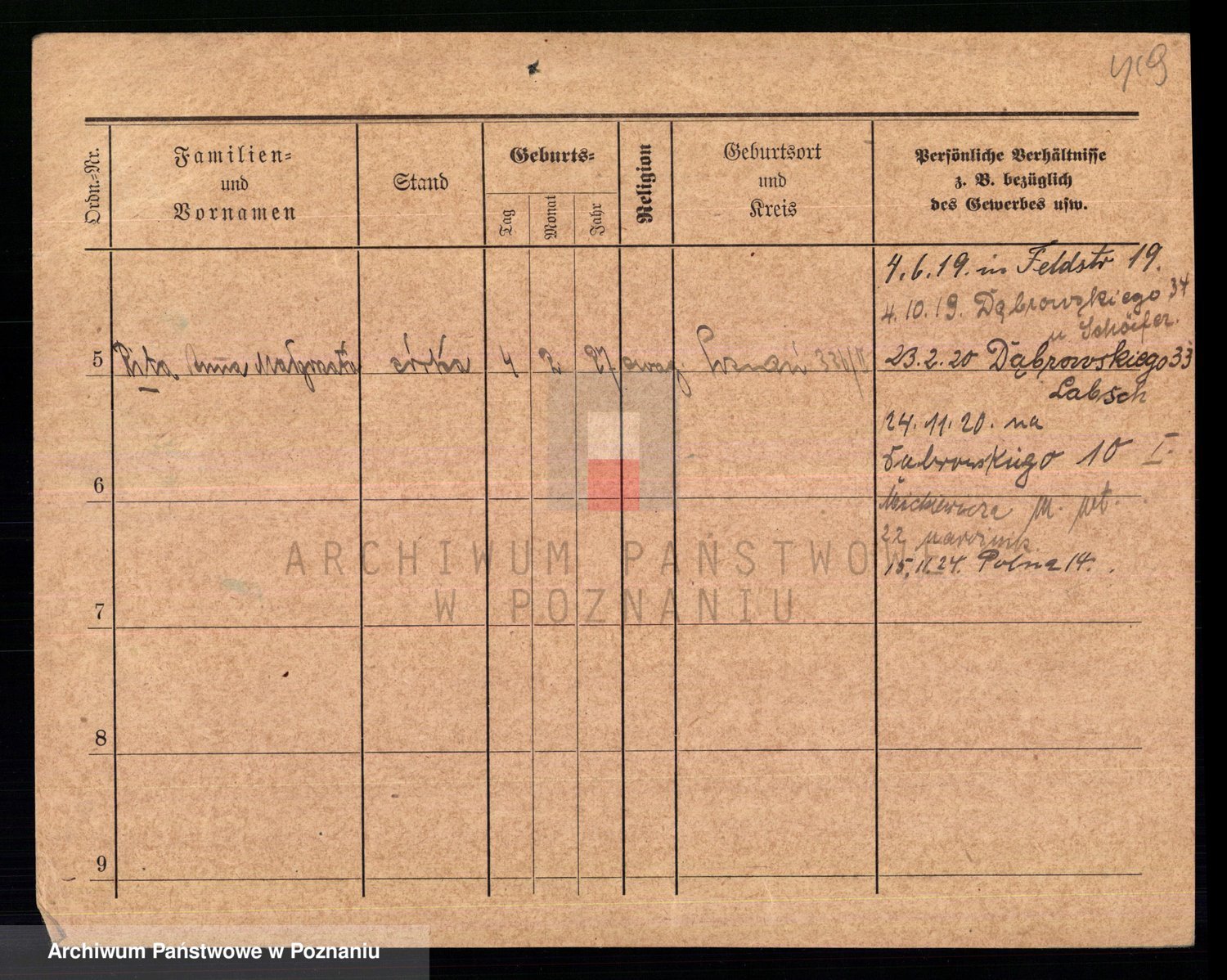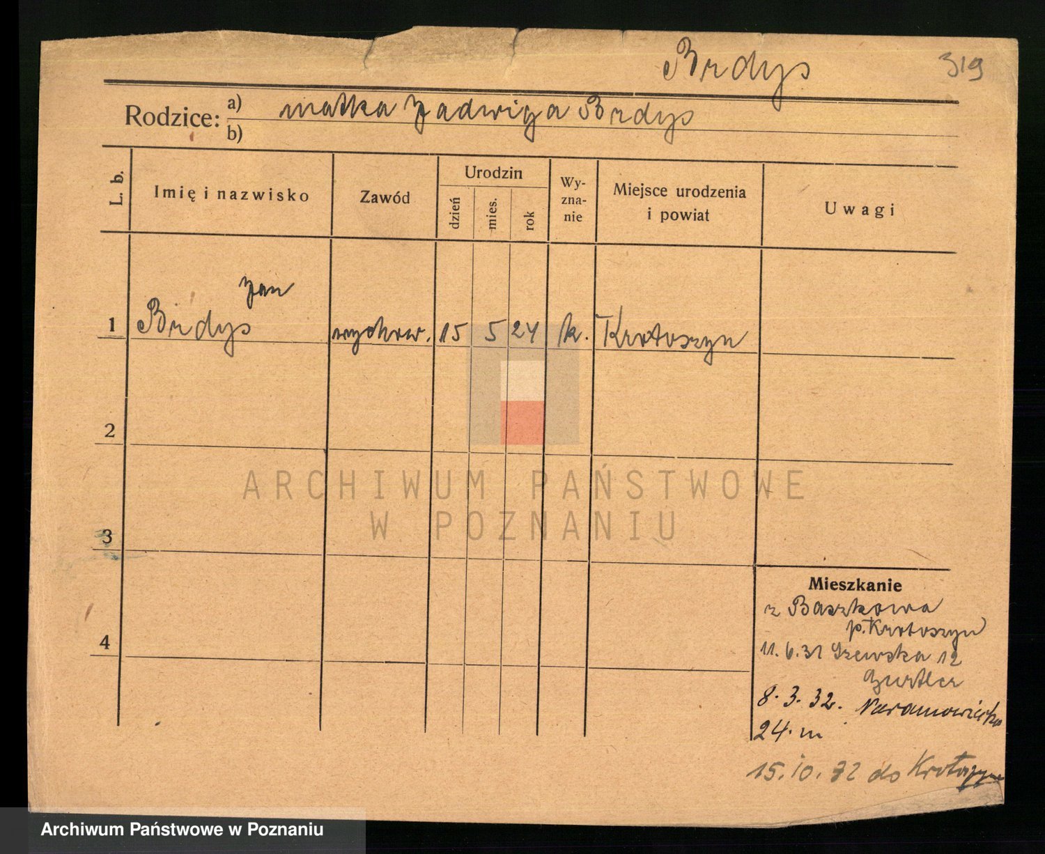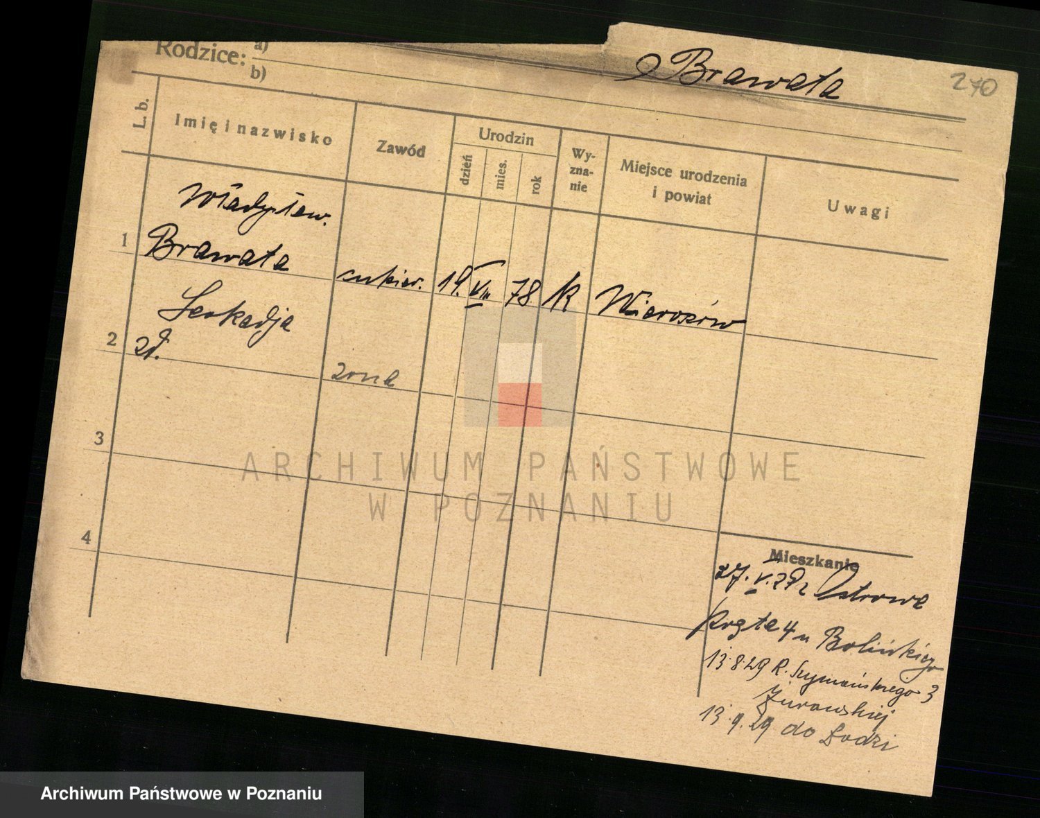 Podgląd karty osobowej dostępny jest po kliknięciu na nazwisko lub ikonkę karty. Można dokonywać powiększenia (ikony na górze) lub przechodzić między kolejnymi skanami (strzałki po bokach).