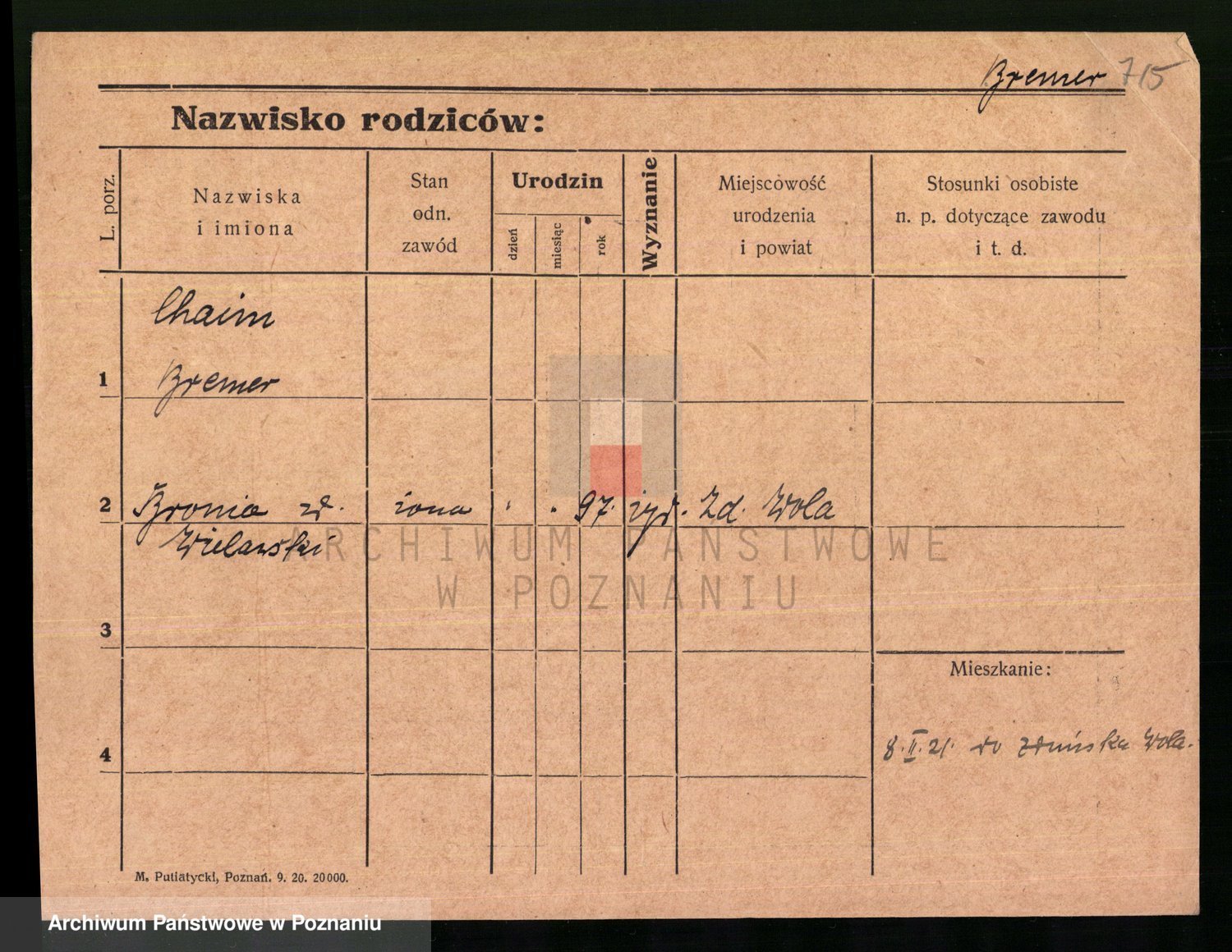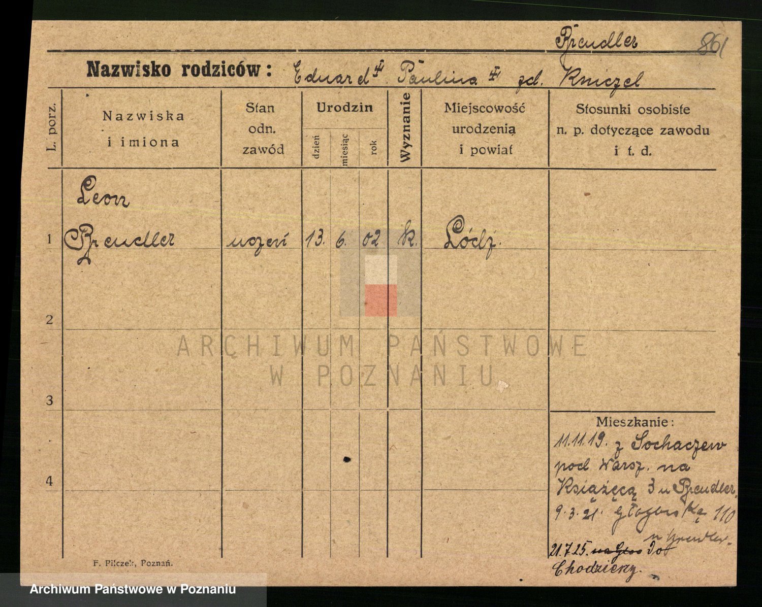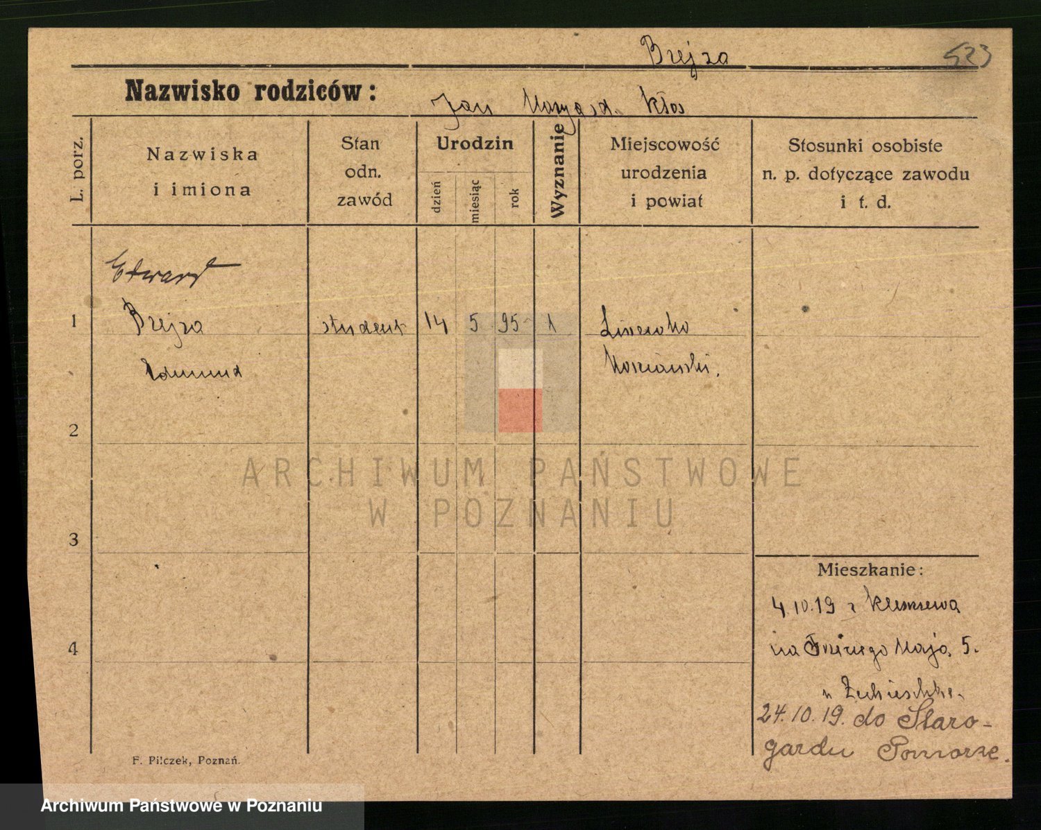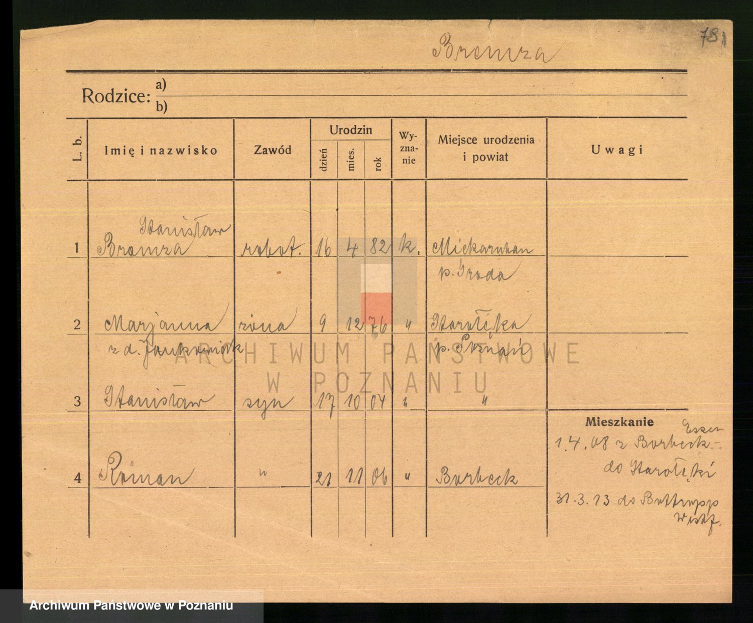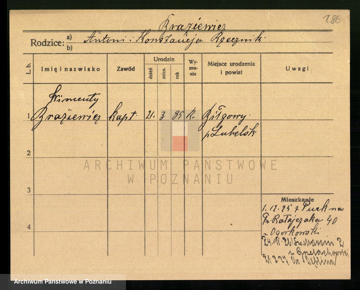 Podgląd karty osobowej dostępny jest po kliknięciu na nazwisko lub ikonkę karty. Można dokonywać powiększenia (ikony na górze) lub przechodzić między kolejnymi skanami (strzałki po bokach).