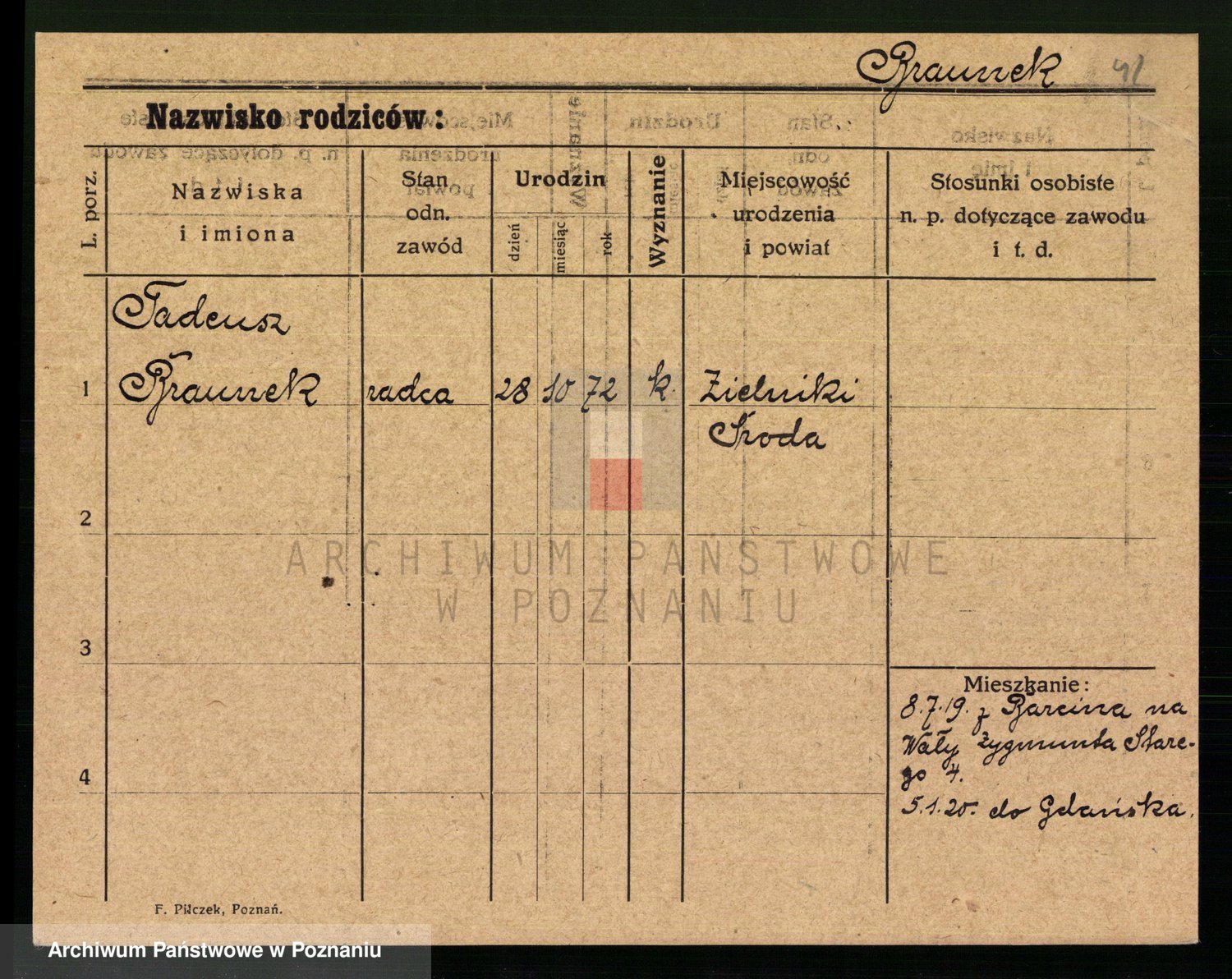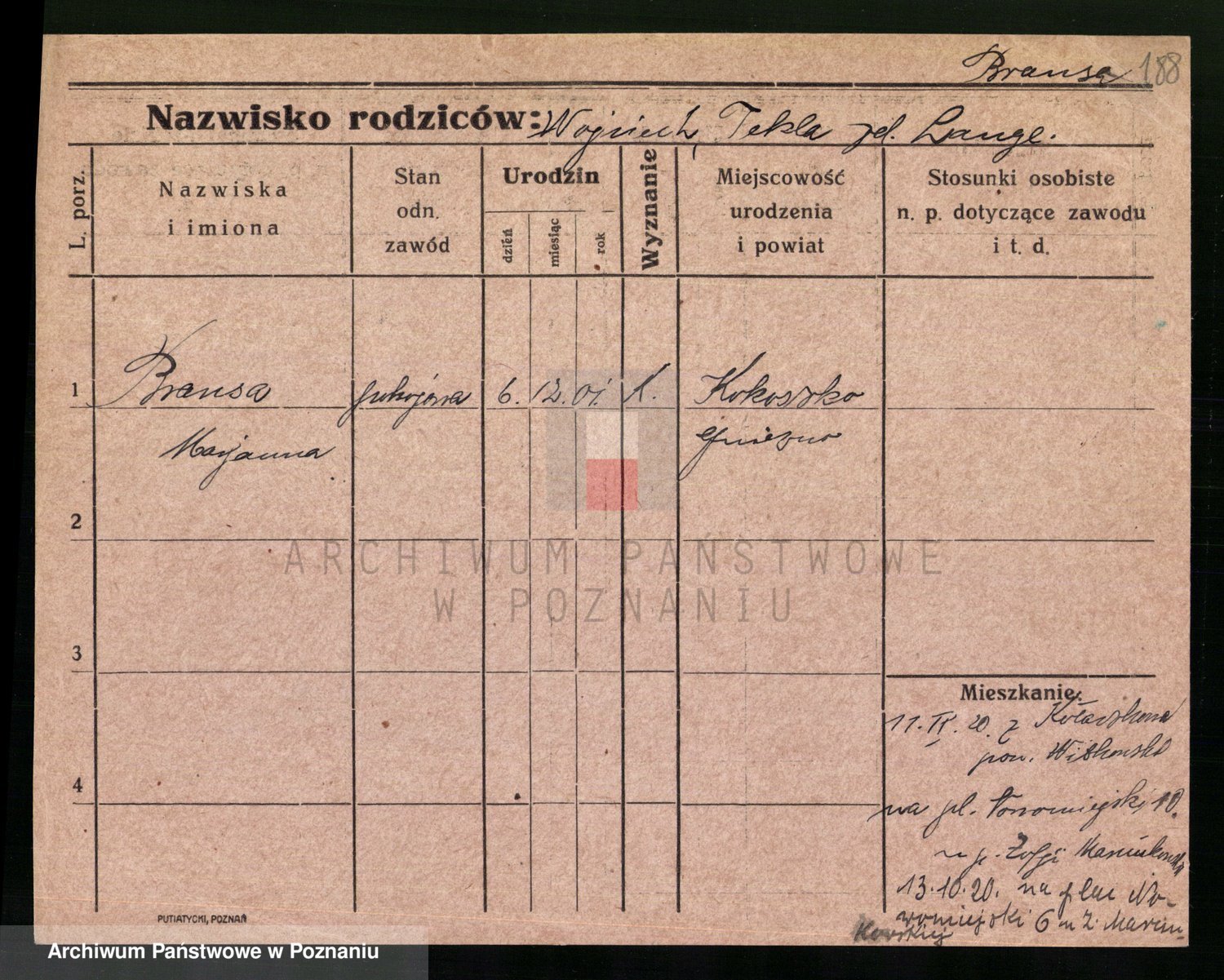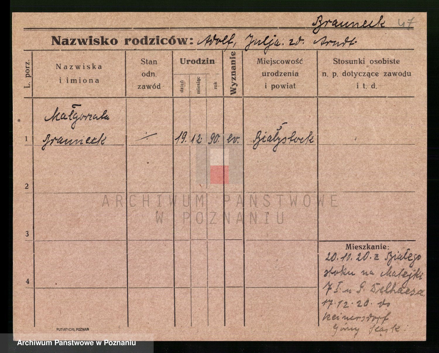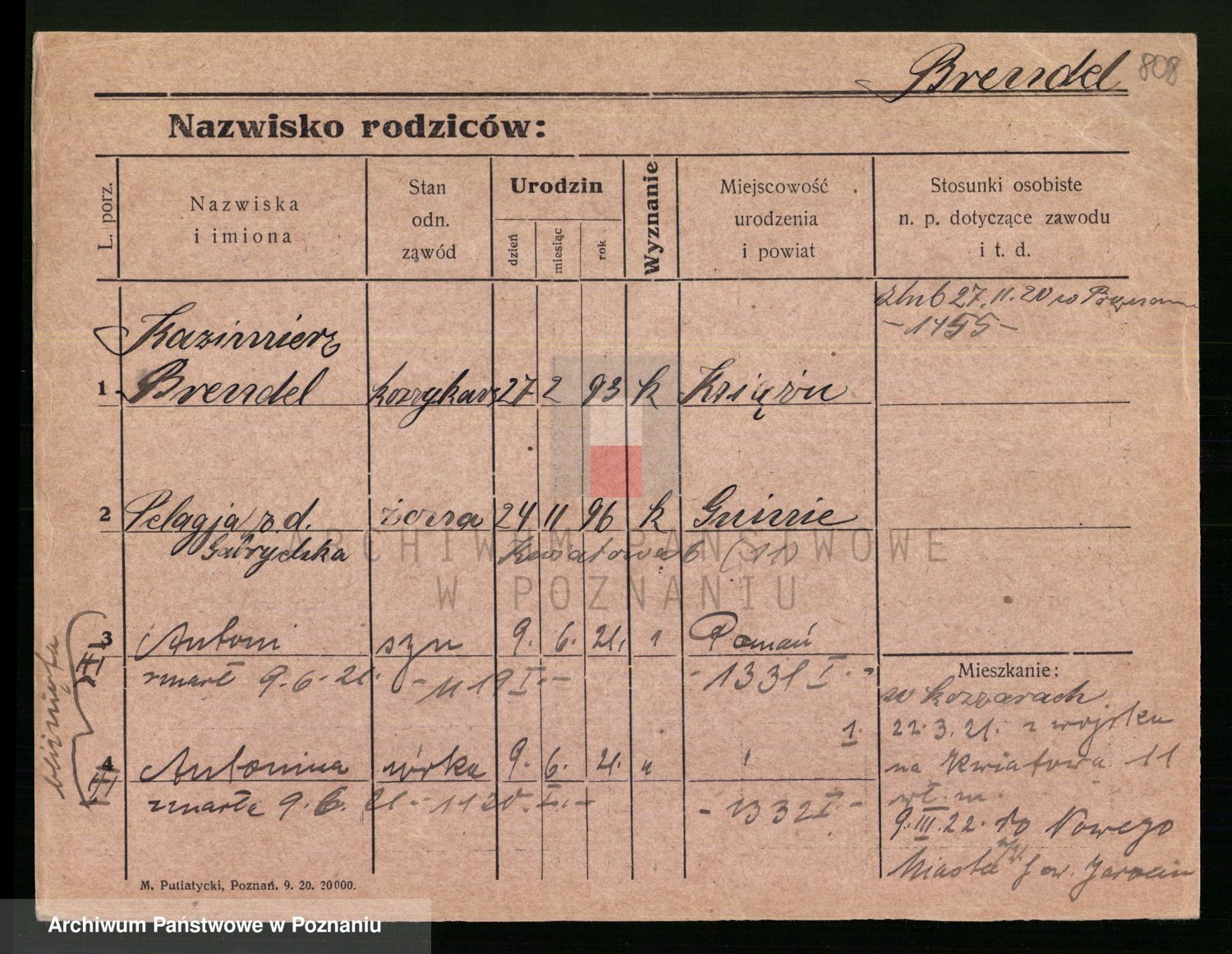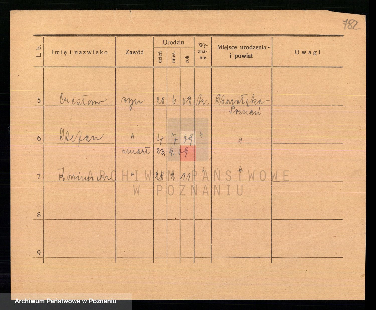 Podgląd karty osobowej dostępny jest po kliknięciu na nazwisko lub ikonkę karty. Można dokonywać powiększenia (ikony na górze) lub przechodzić między kolejnymi skanami (strzałki po bokach).