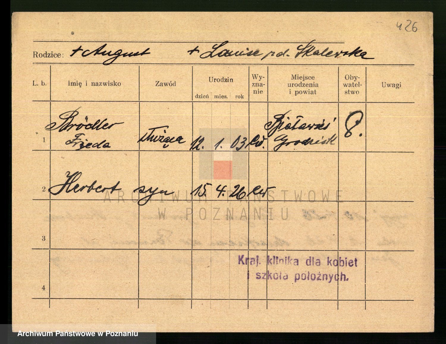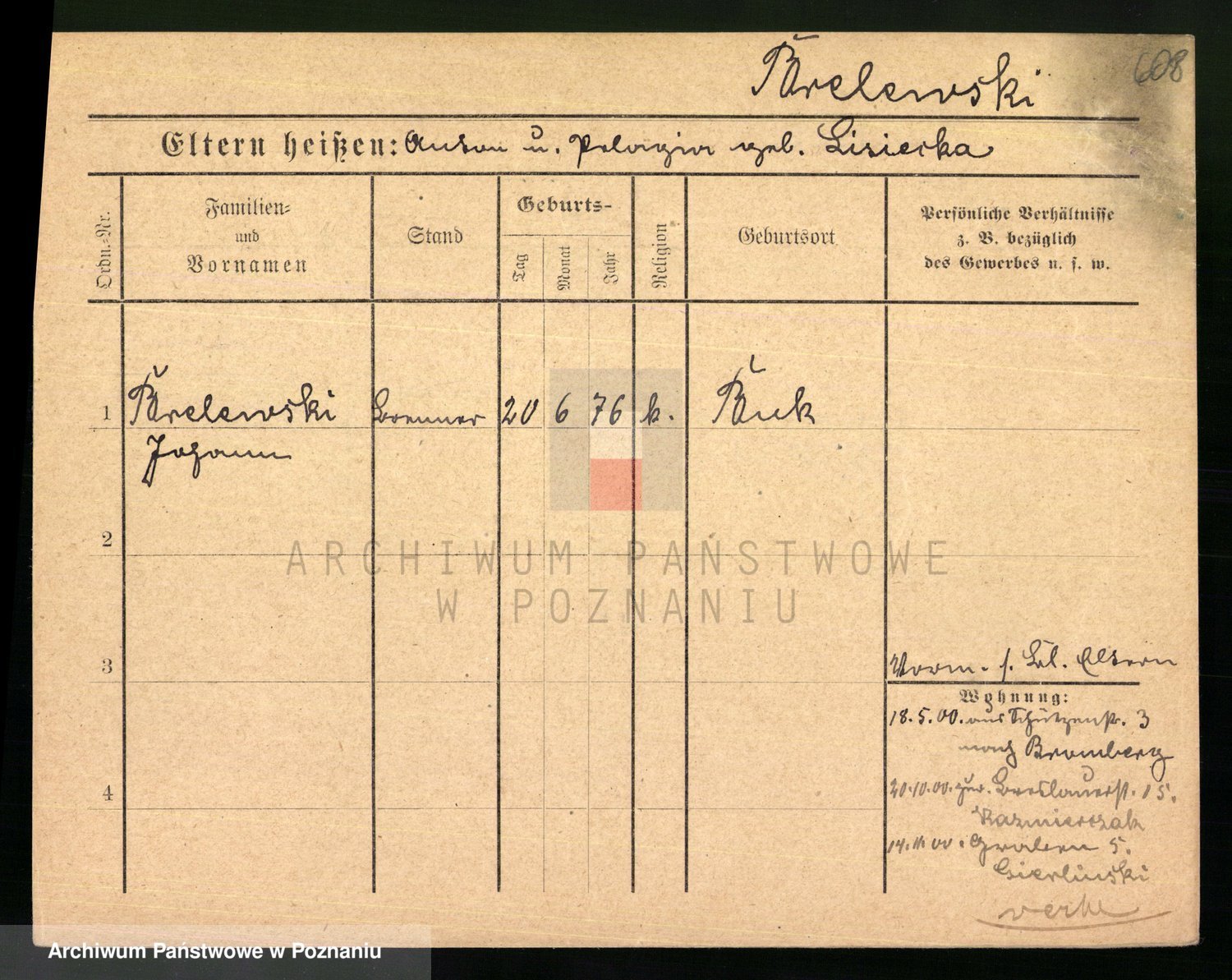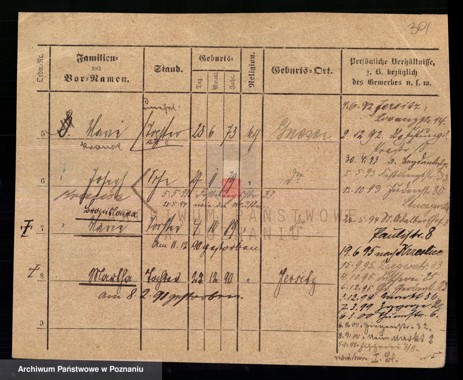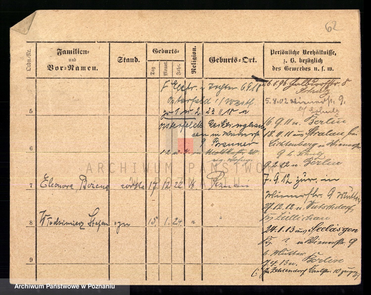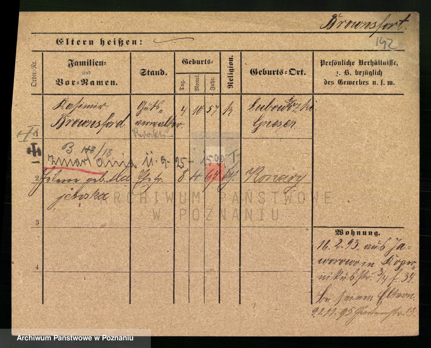 Podgląd karty osobowej dostępny jest po kliknięciu na nazwisko lub ikonkę karty. Można dokonywać powiększenia (ikony na górze) lub przechodzić między kolejnymi skanami (strzałki po bokach).