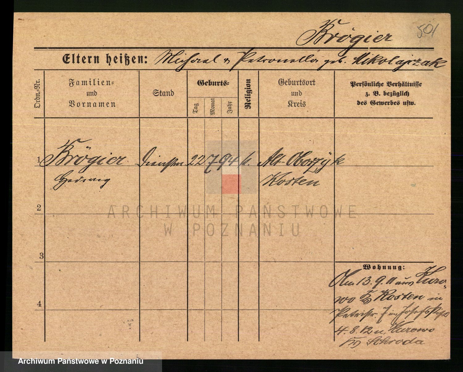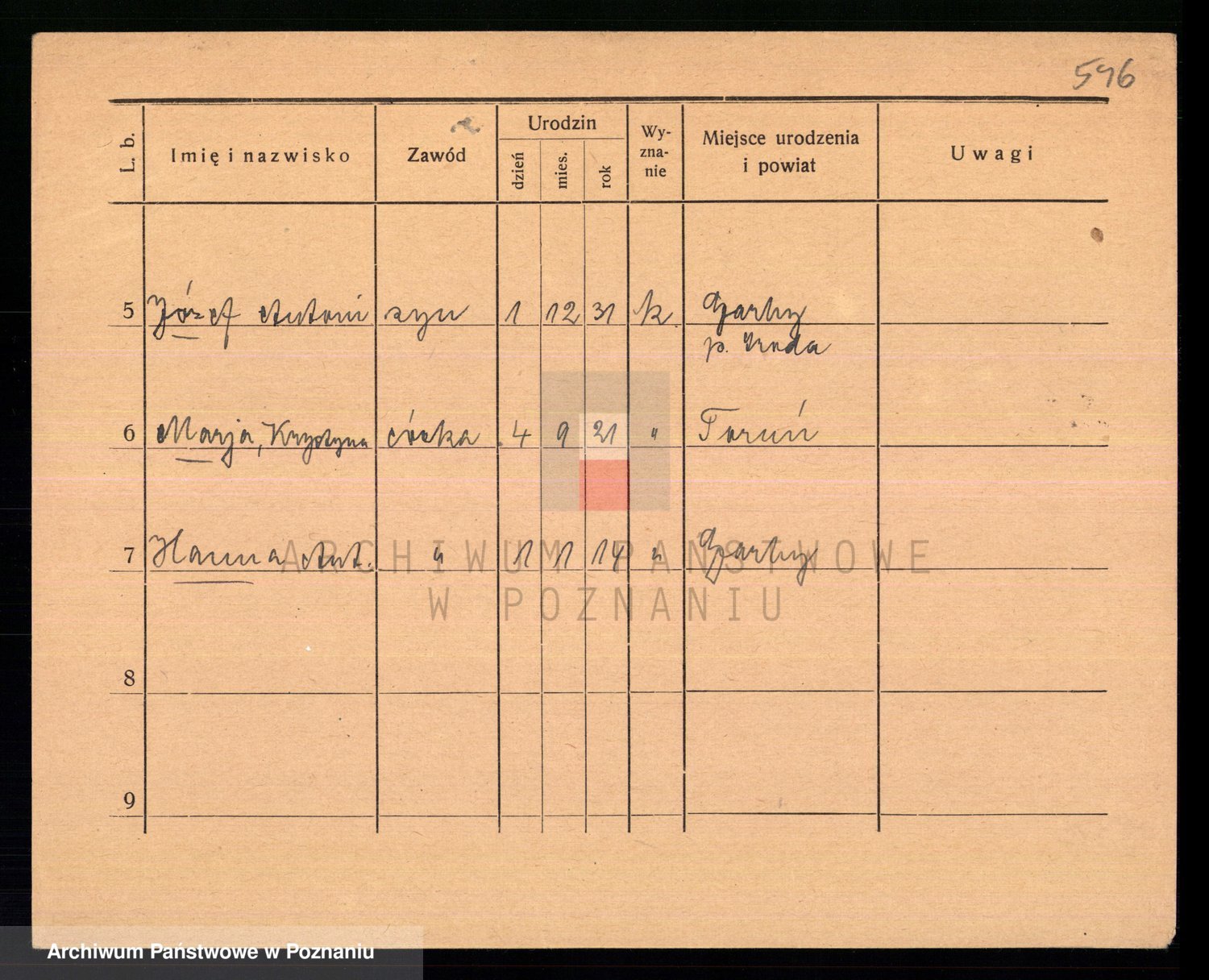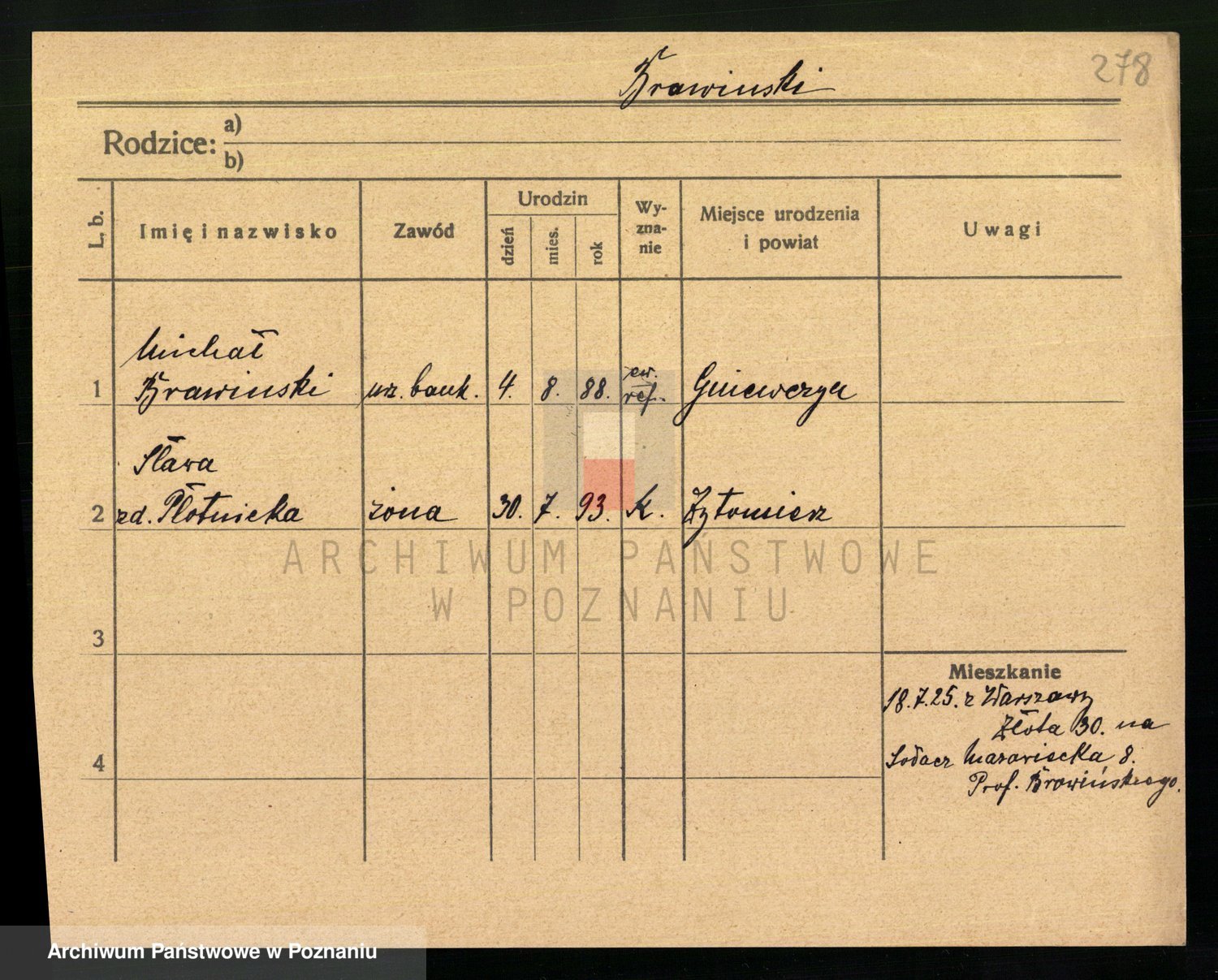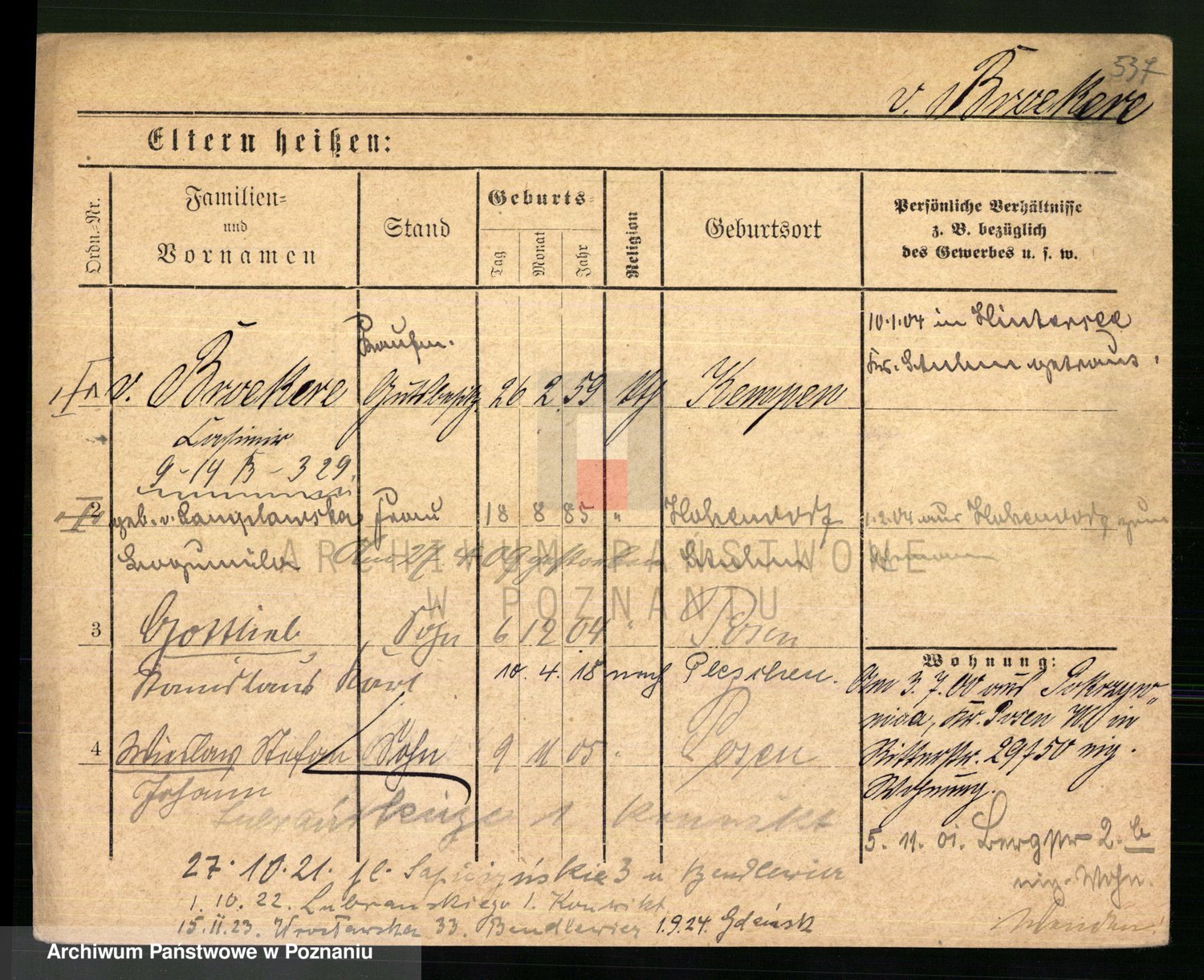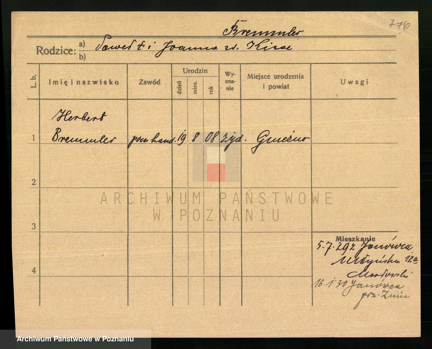 Podgląd karty osobowej dostępny jest po kliknięciu na nazwisko lub ikonkę karty. Można dokonywać powiększenia (ikony na górze) lub przechodzić między kolejnymi skanami (strzałki po bokach).