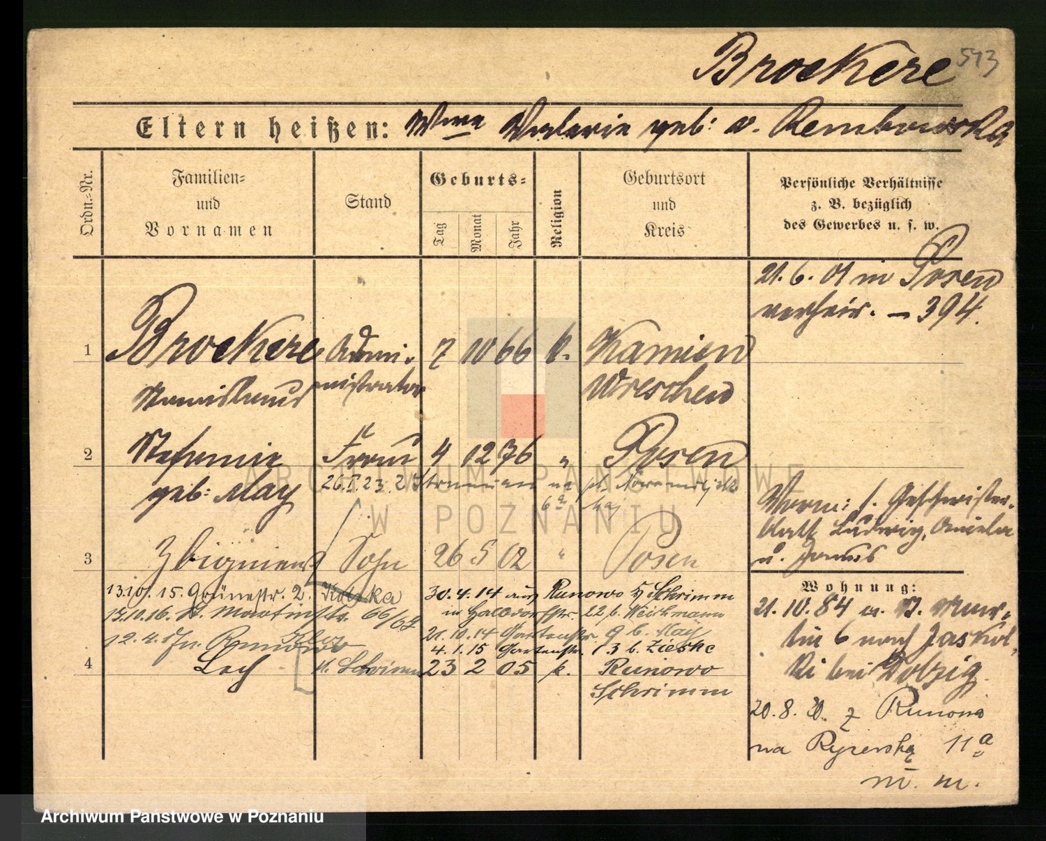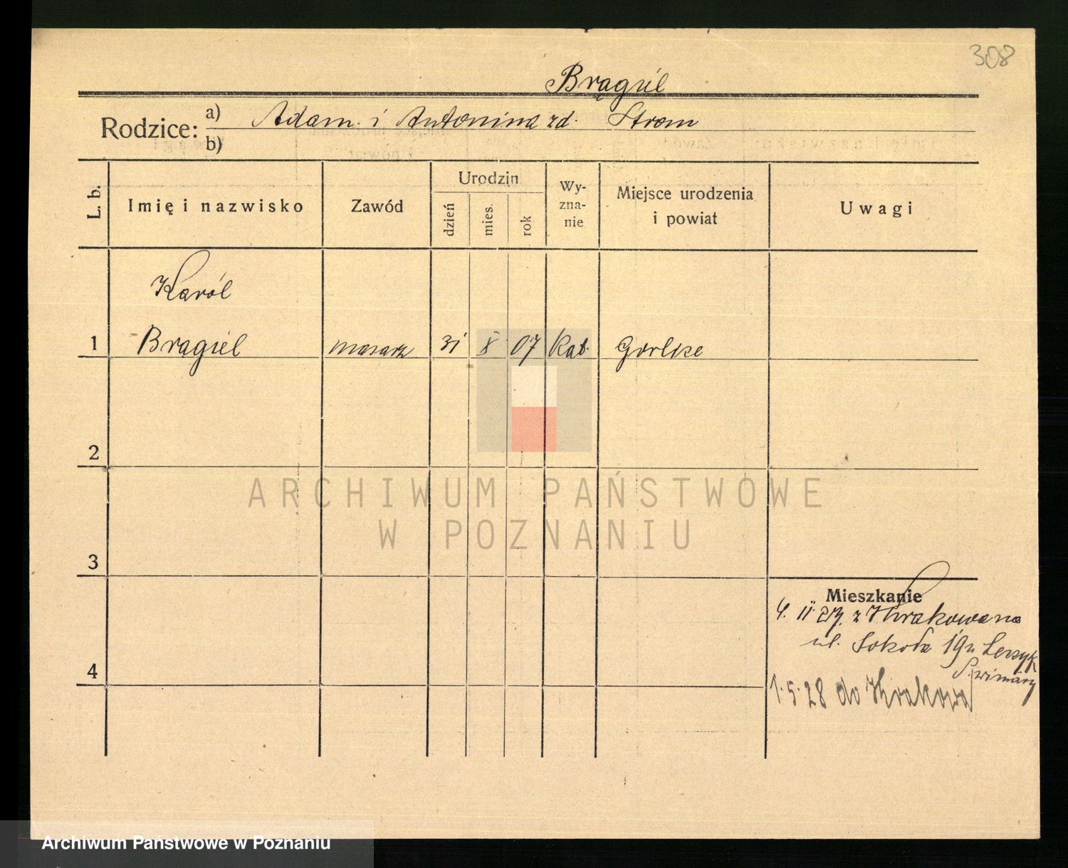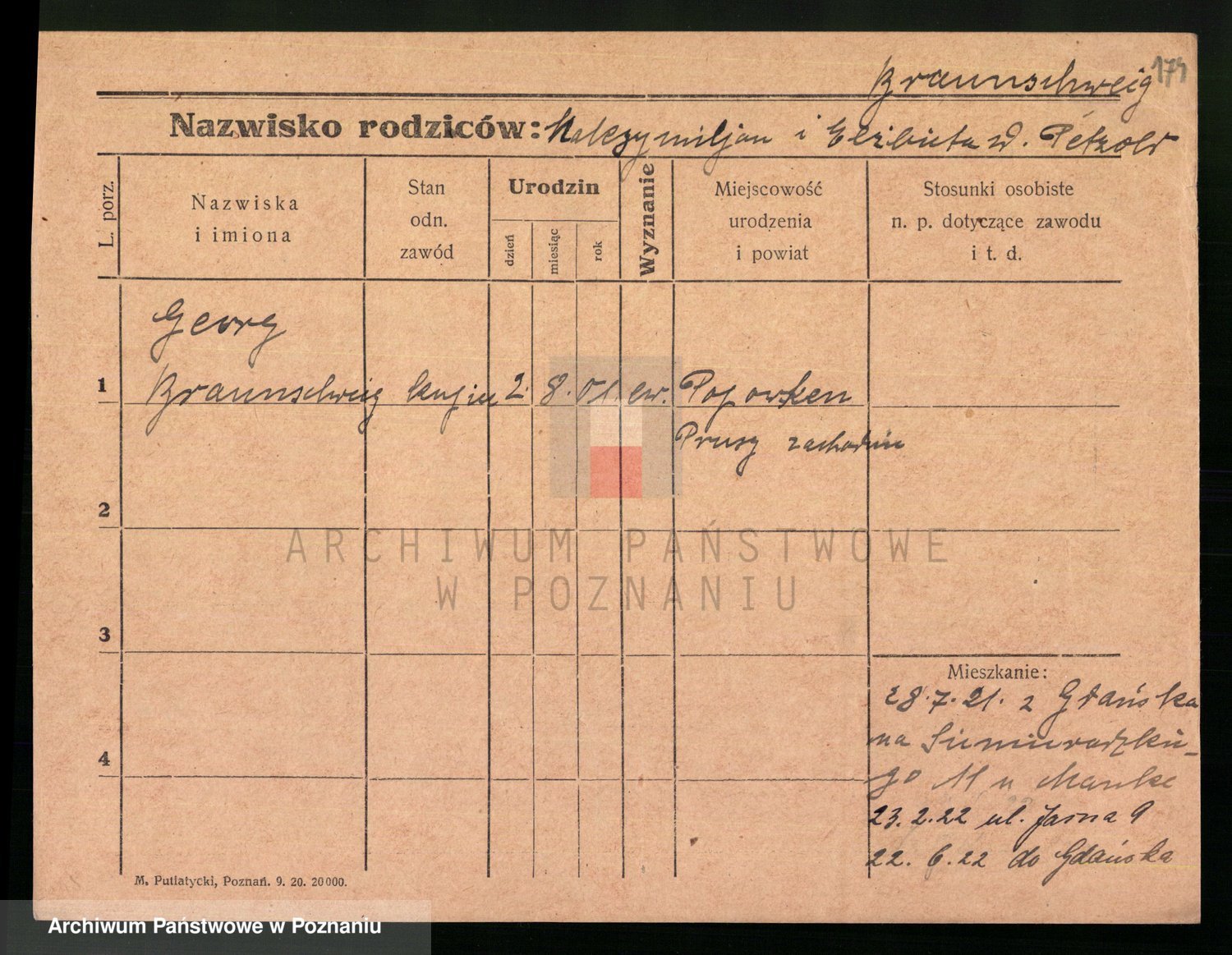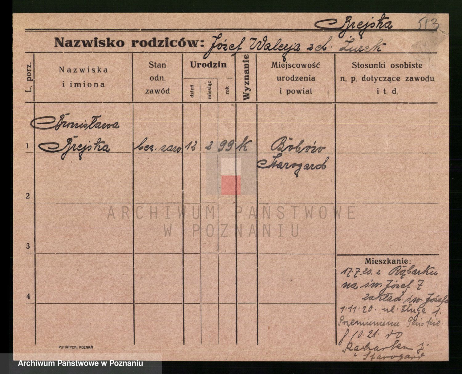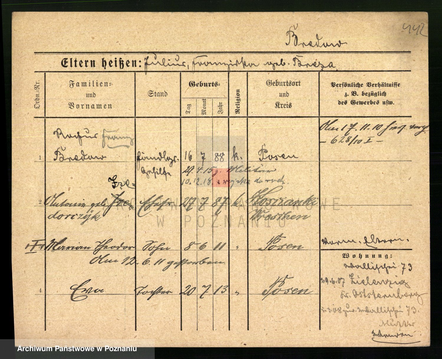 Podgląd karty osobowej dostępny jest po kliknięciu na nazwisko lub ikonkę karty. Można dokonywać powiększenia (ikony na górze) lub przechodzić między kolejnymi skanami (strzałki po bokach).