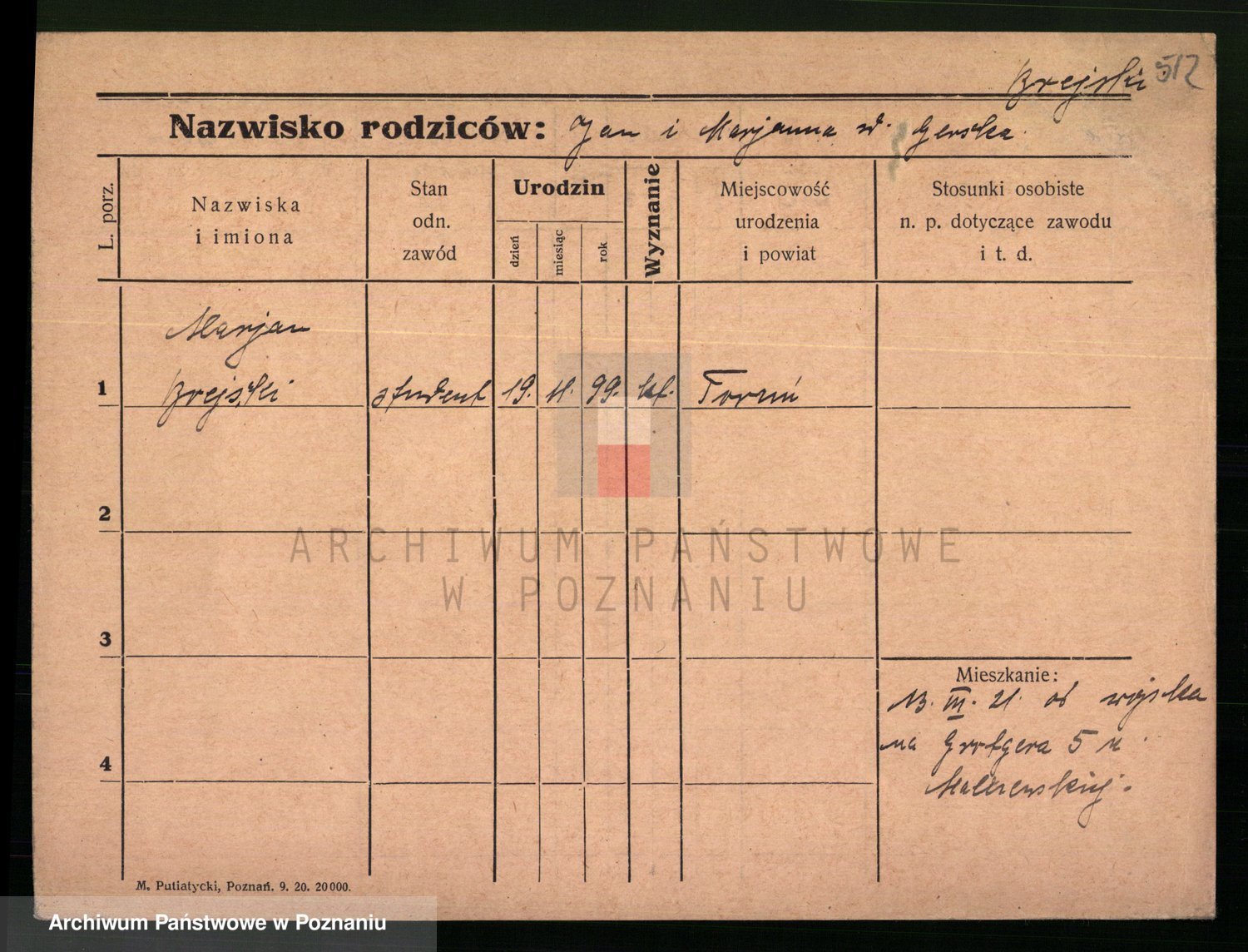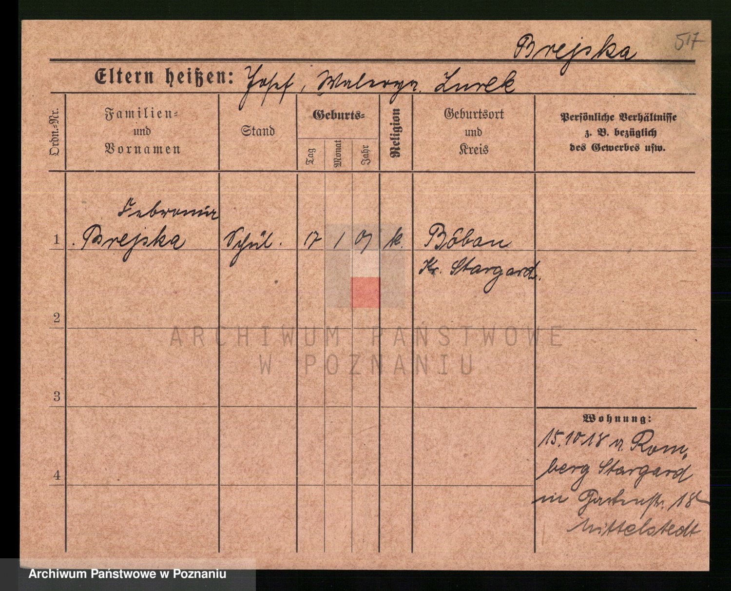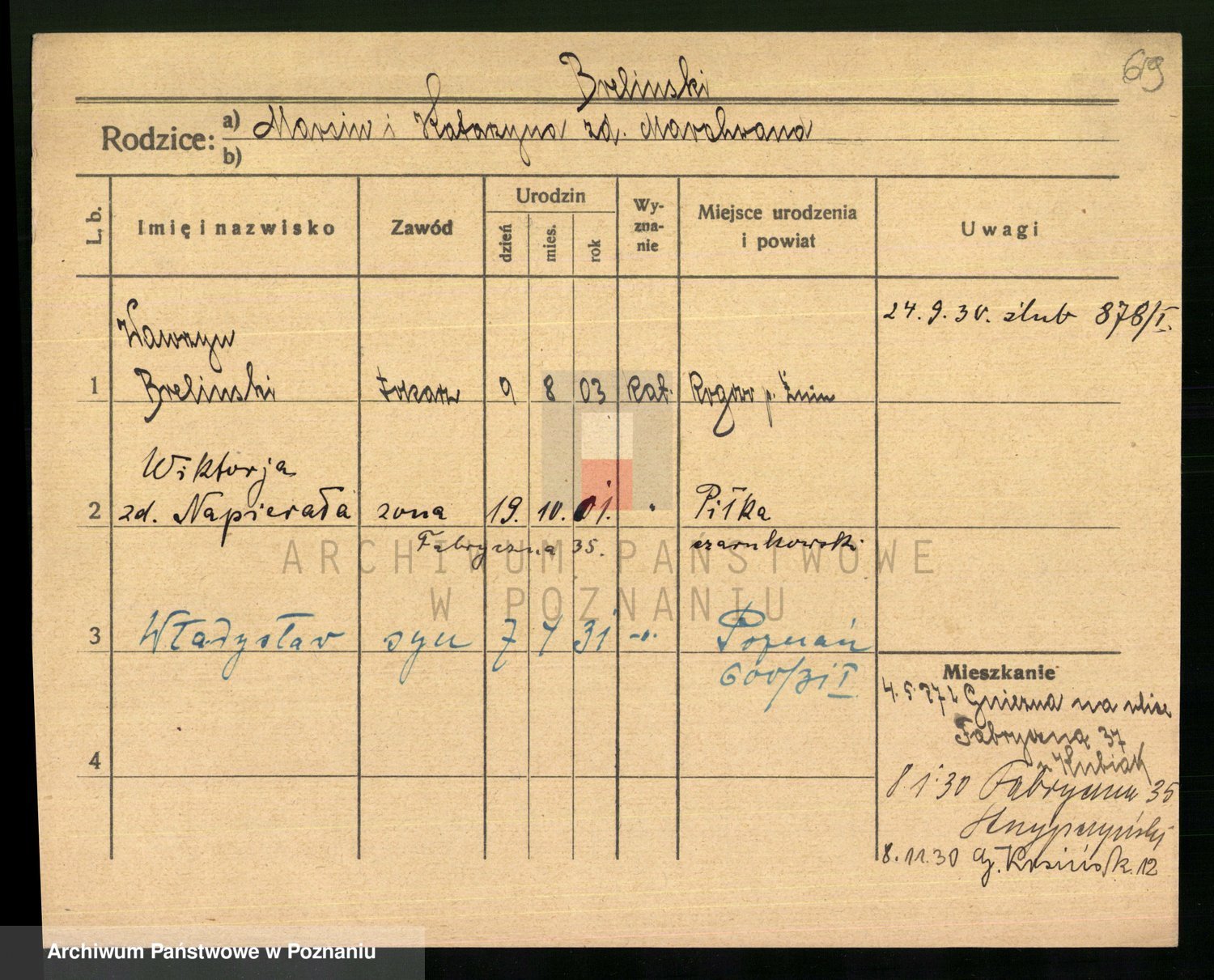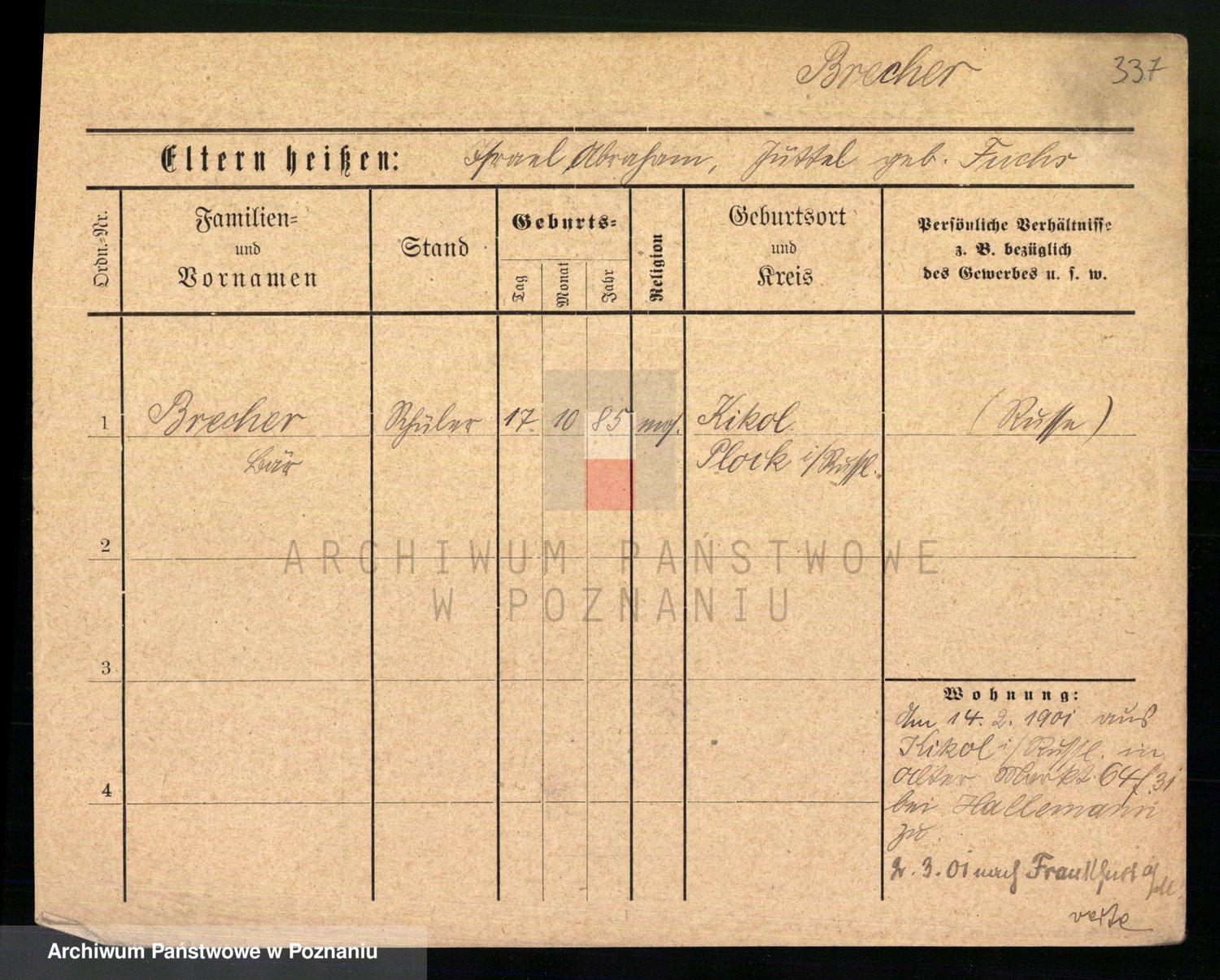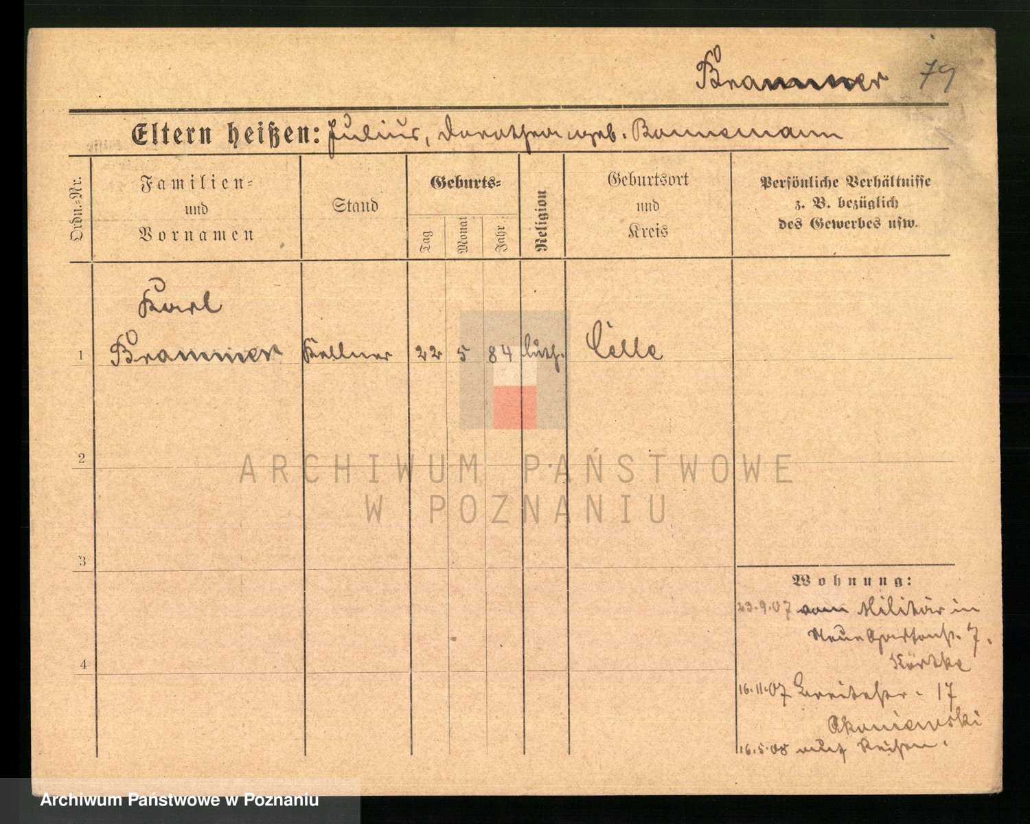 Podgląd karty osobowej dostępny jest po kliknięciu na nazwisko lub ikonkę karty. Można dokonywać powiększenia (ikony na górze) lub przechodzić między kolejnymi skanami (strzałki po bokach).