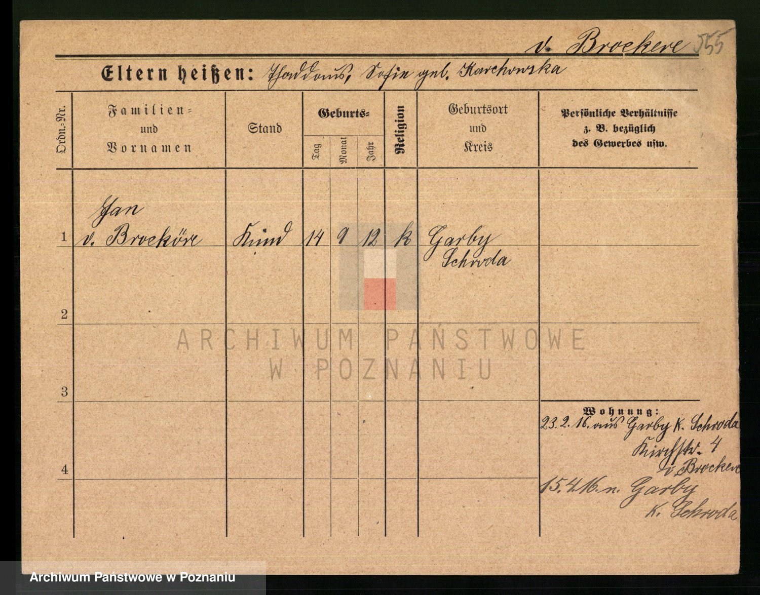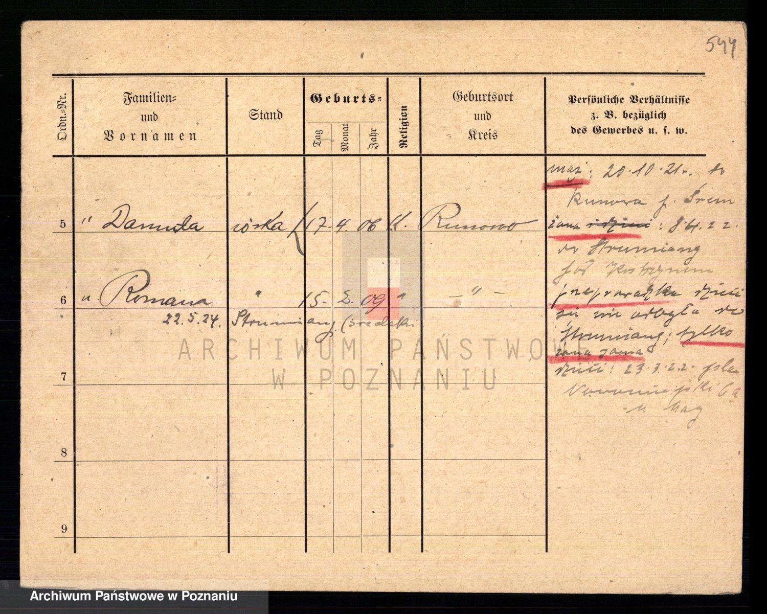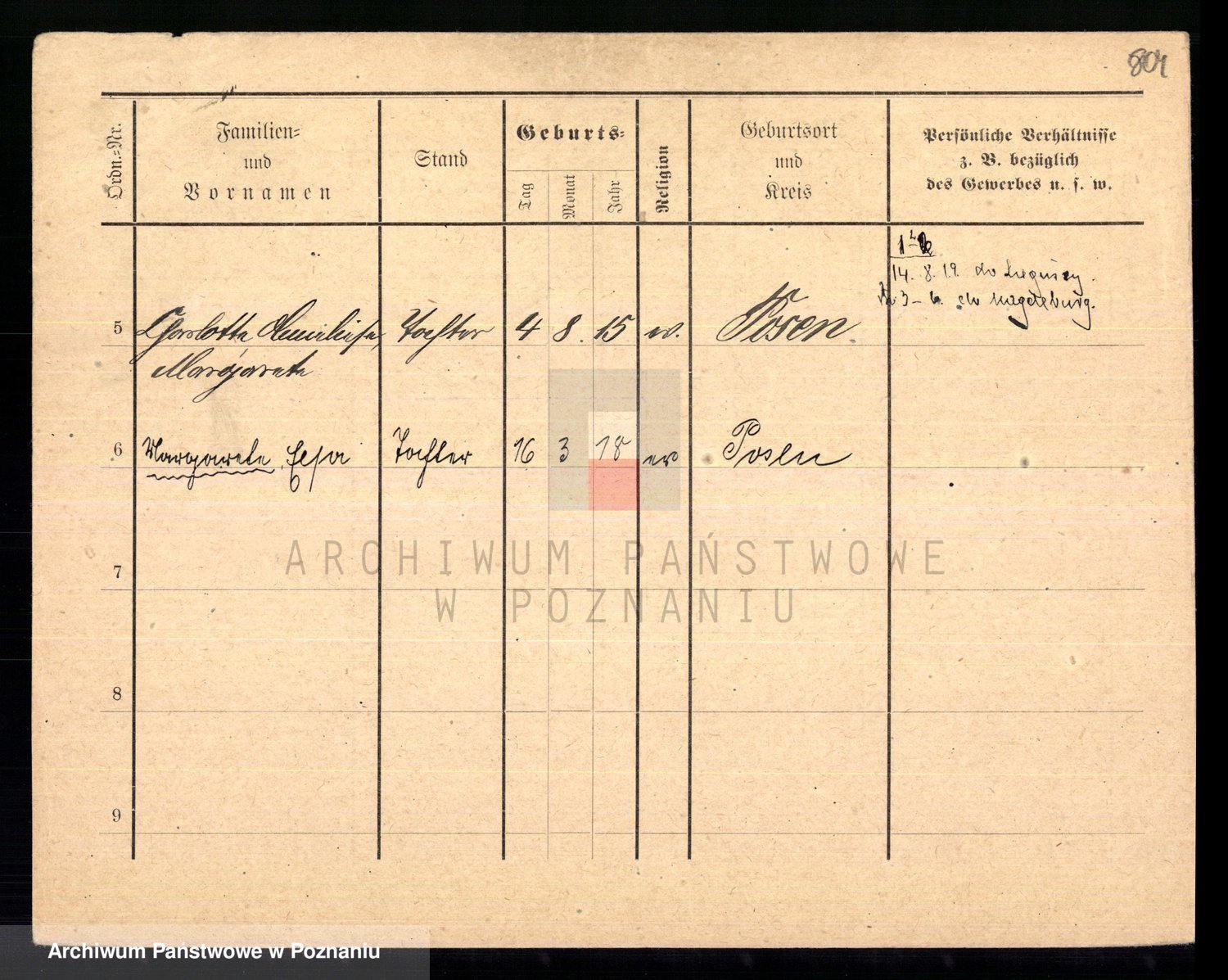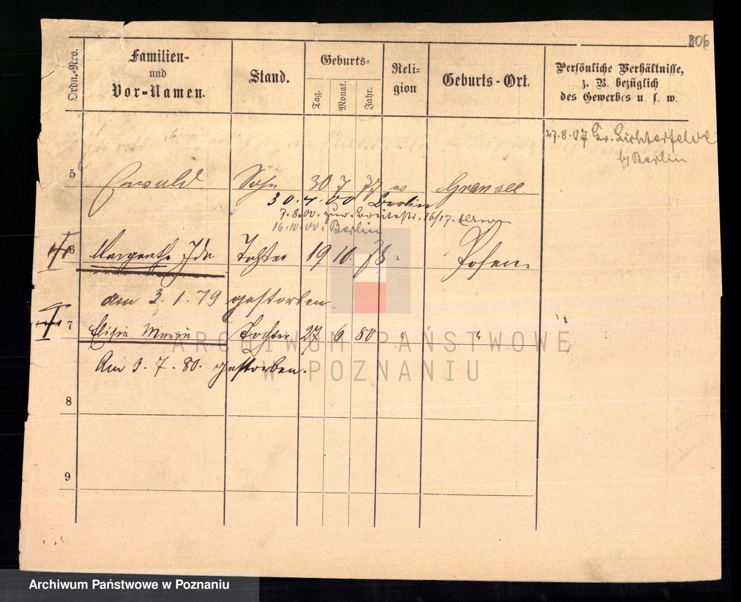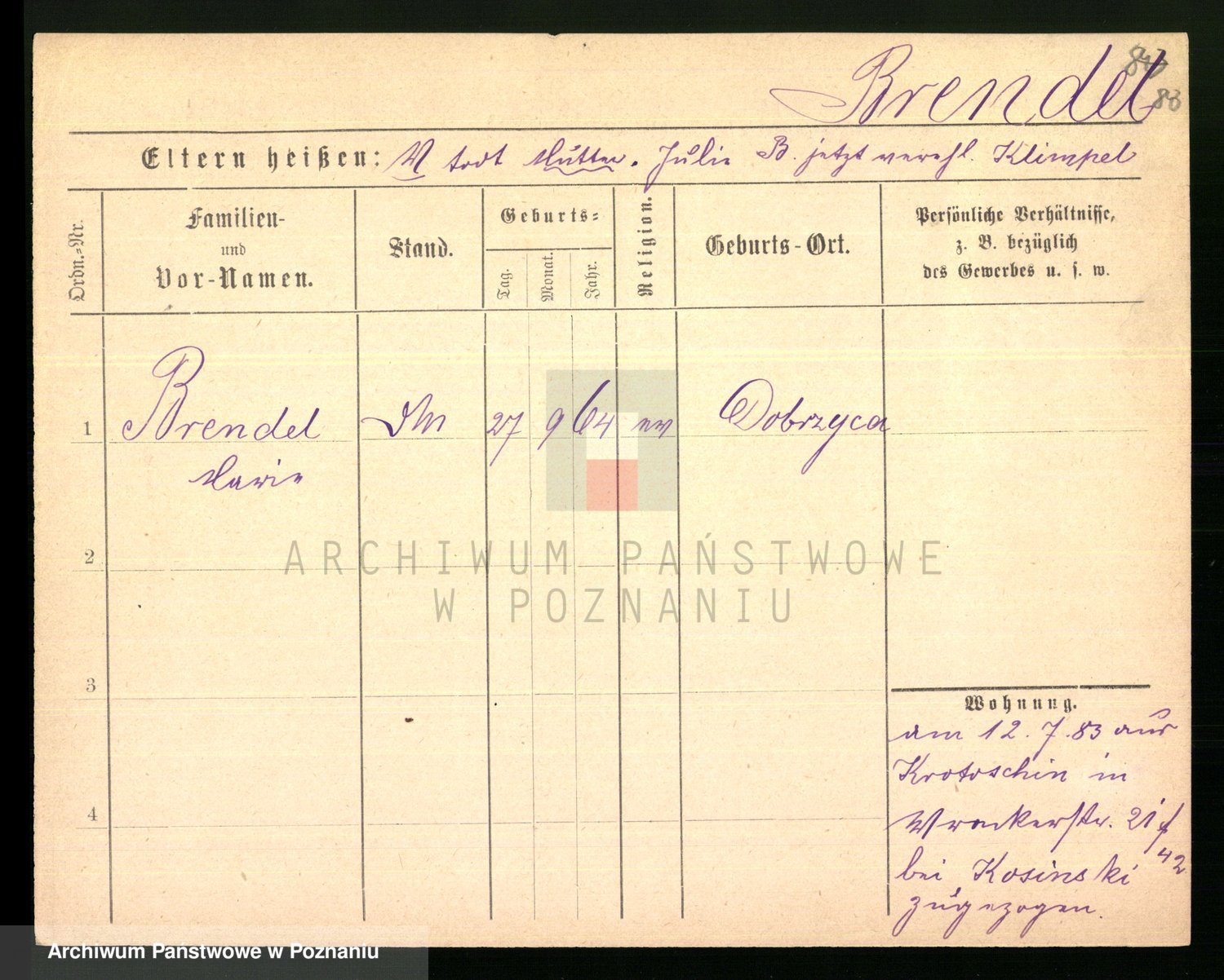 Podgląd karty osobowej dostępny jest po kliknięciu na nazwisko lub ikonkę karty. Można dokonywać powiększenia (ikony na górze) lub przechodzić między kolejnymi skanami (strzałki po bokach).