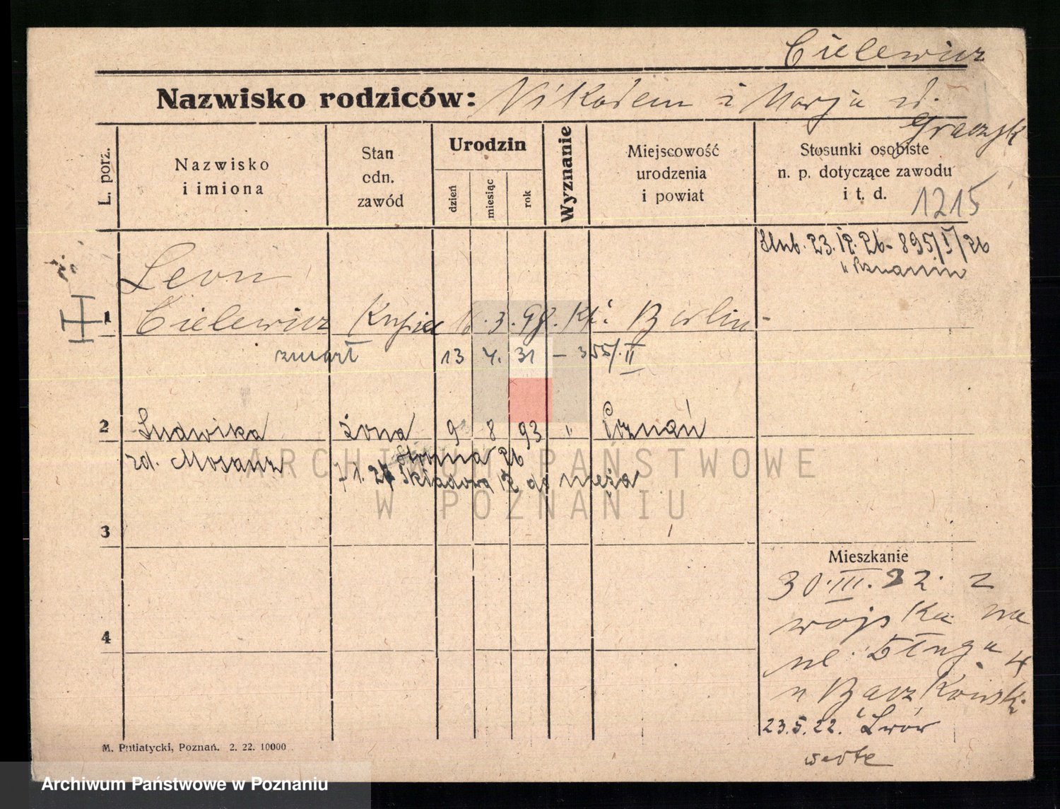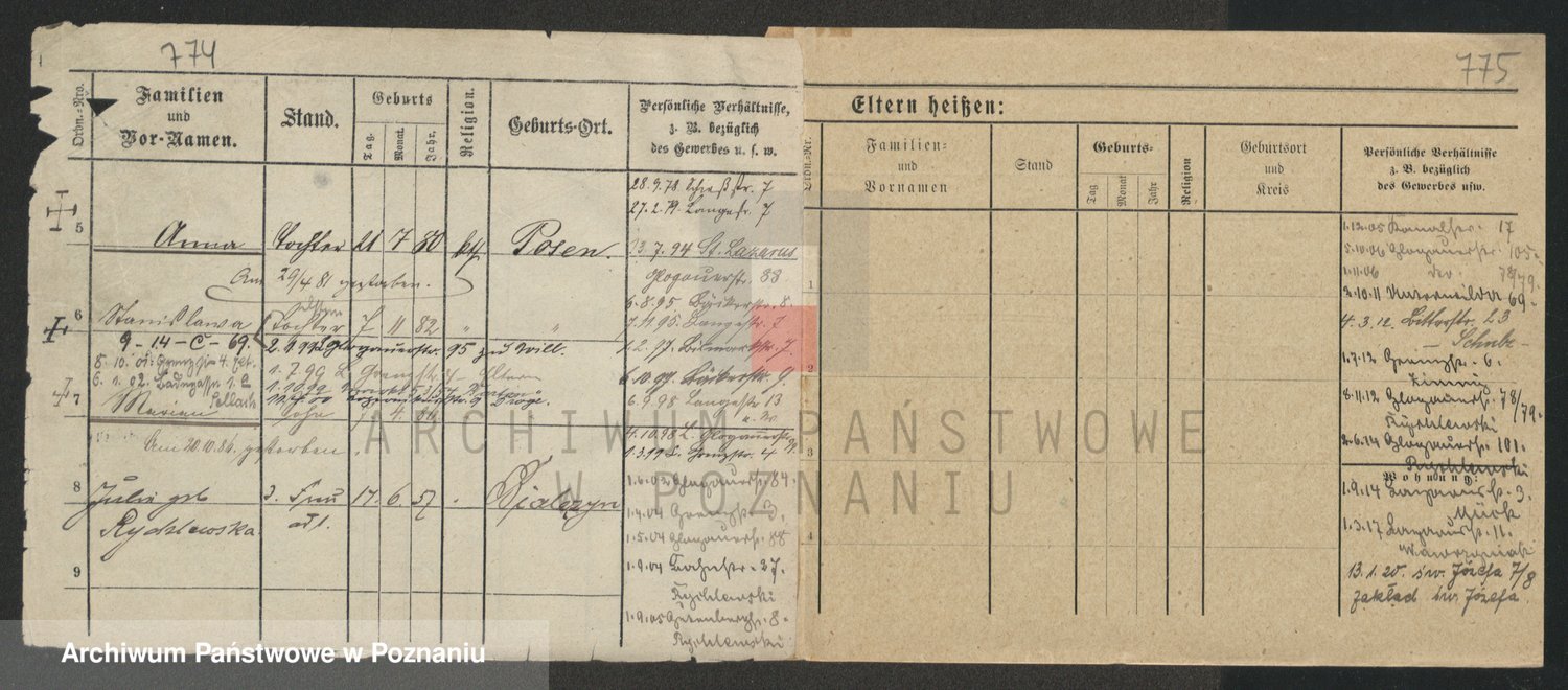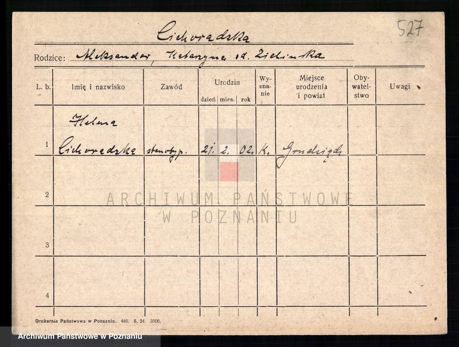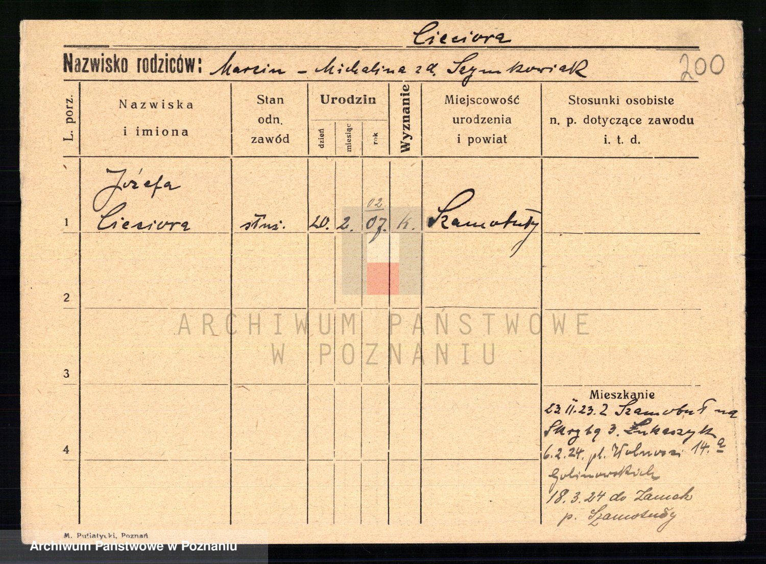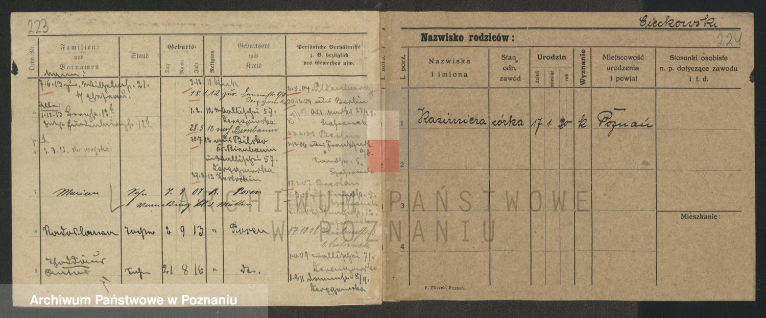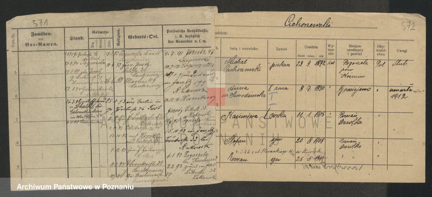 Podgląd karty osobowej dostępny jest po kliknięciu na nazwisko lub ikonkę karty. Można dokonywać powiększenia (ikony na górze) lub przechodzić między kolejnymi skanami (strzałki po bokach).