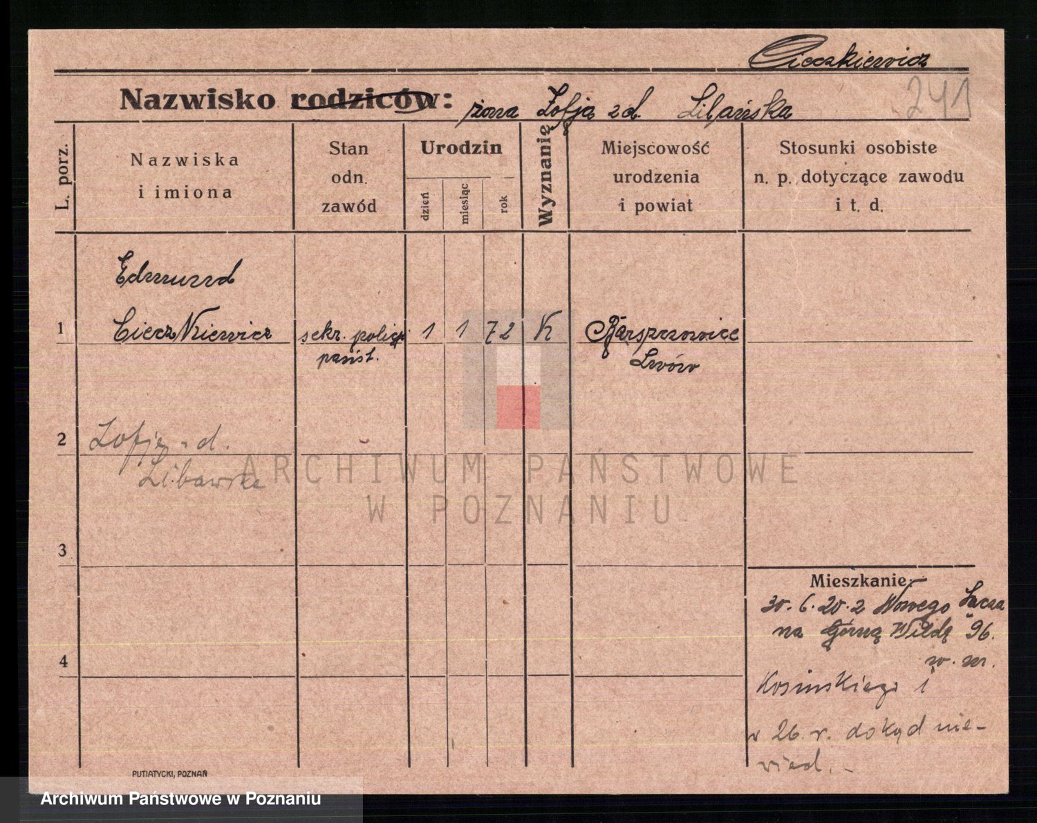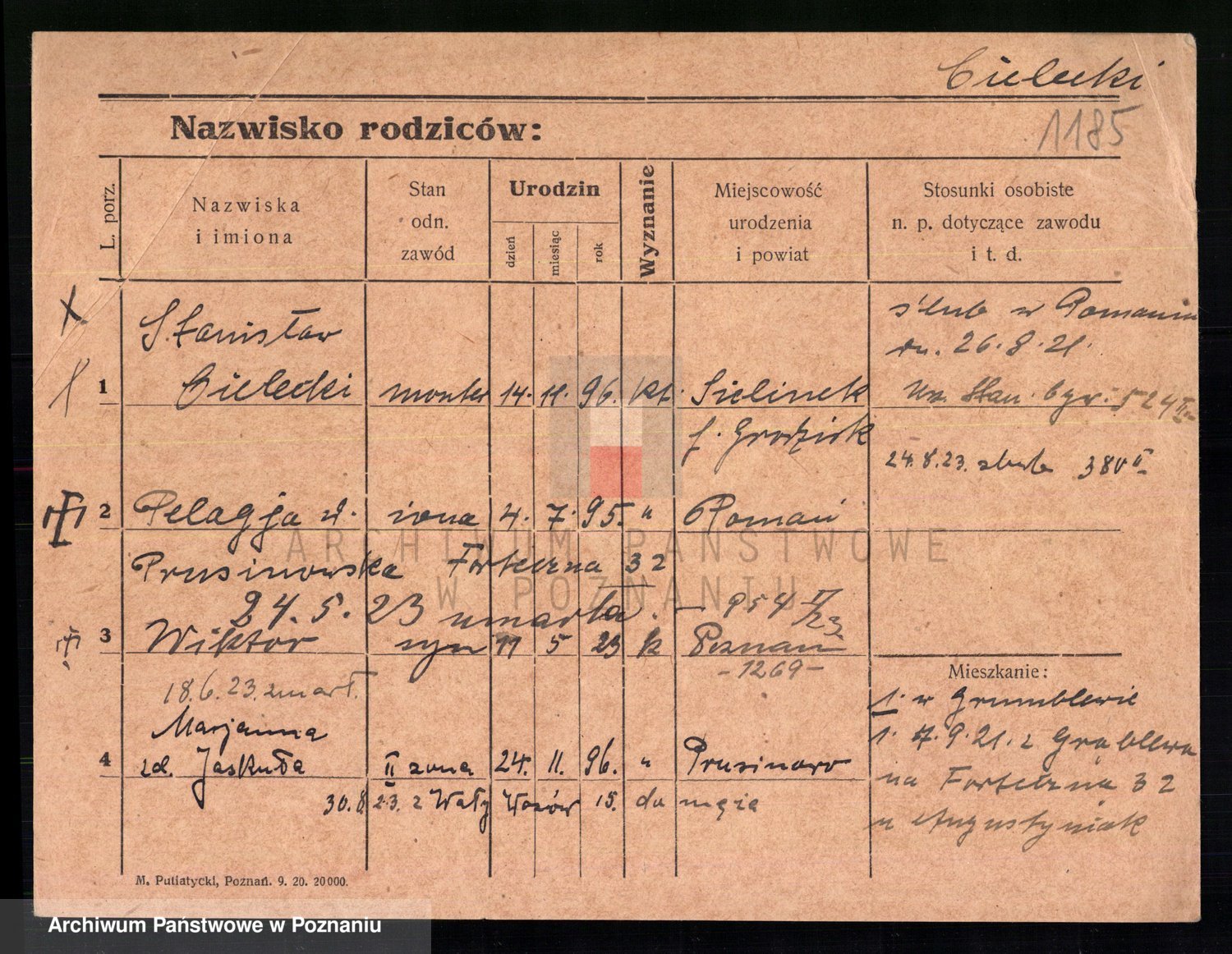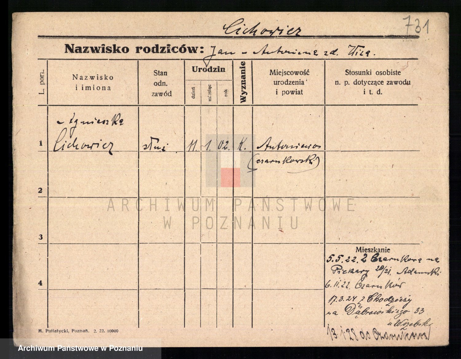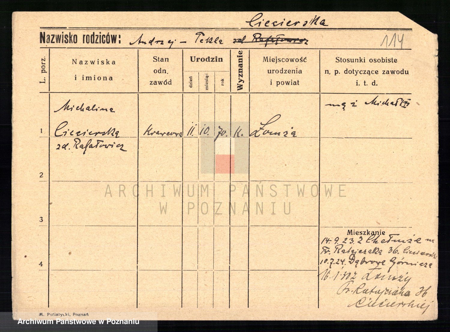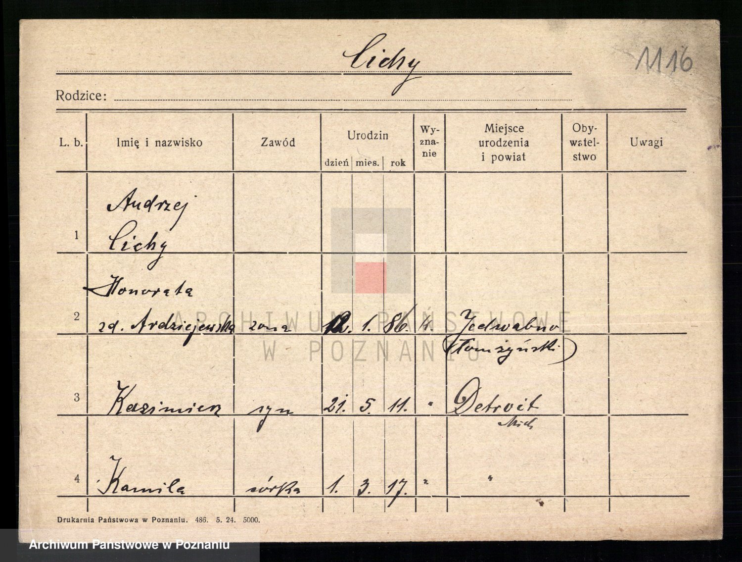 Podgląd karty osobowej dostępny jest po kliknięciu na nazwisko lub ikonkę karty. Można dokonywać powiększenia (ikony na górze) lub przechodzić między kolejnymi skanami (strzałki po bokach).