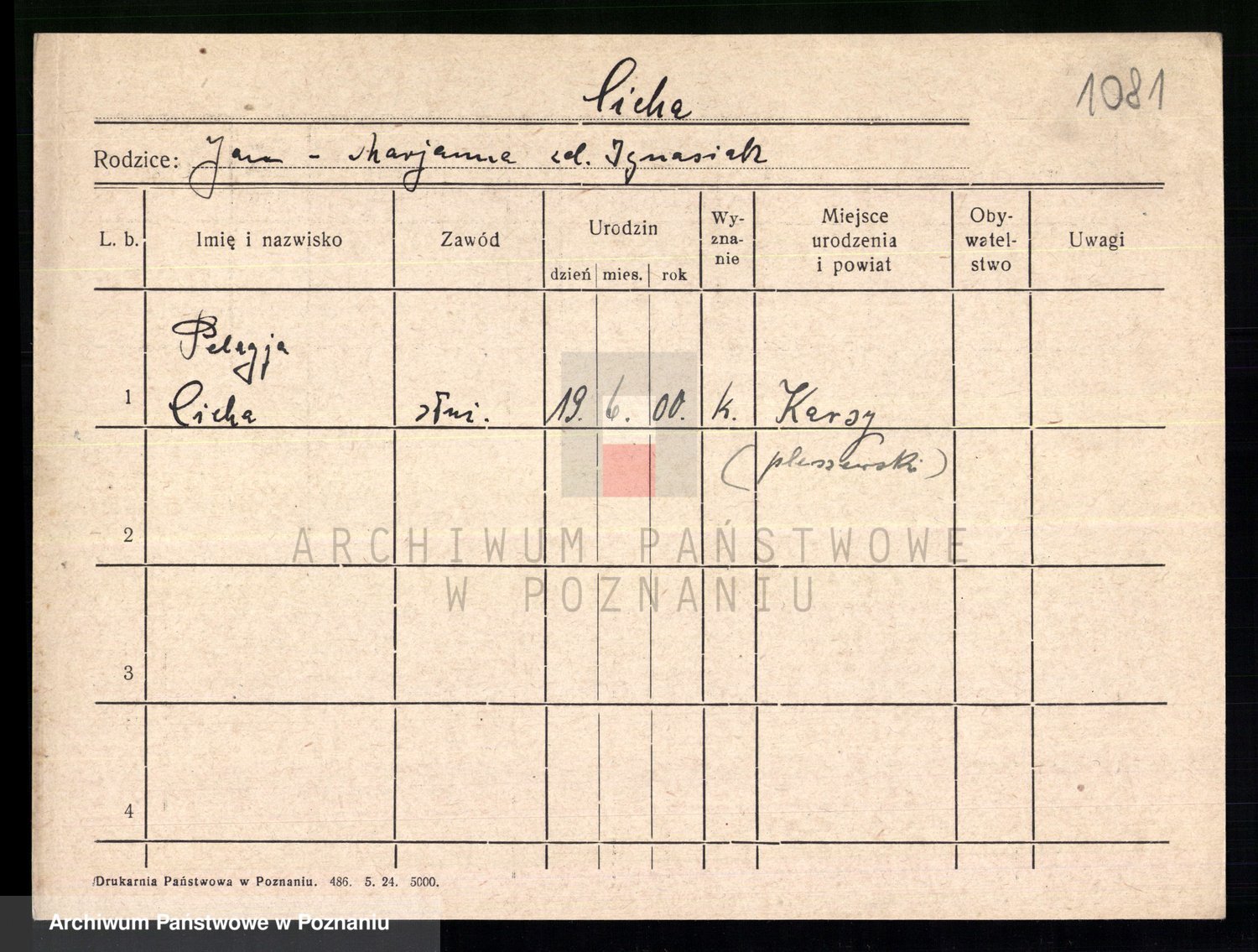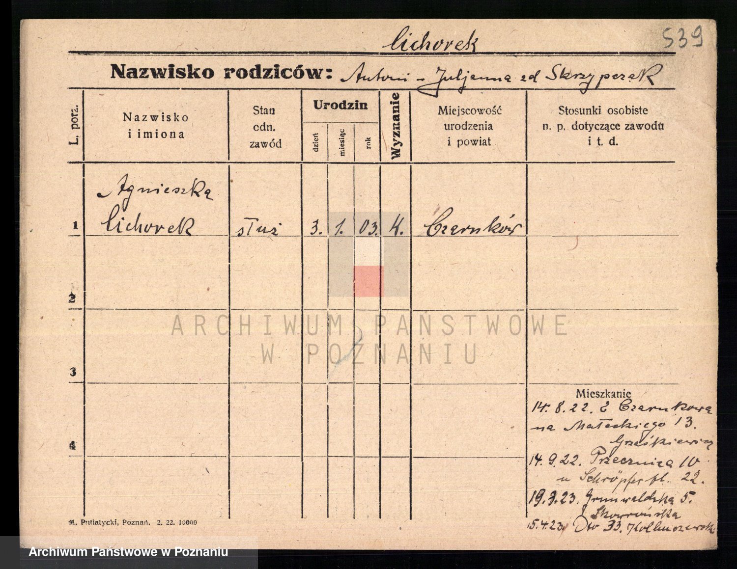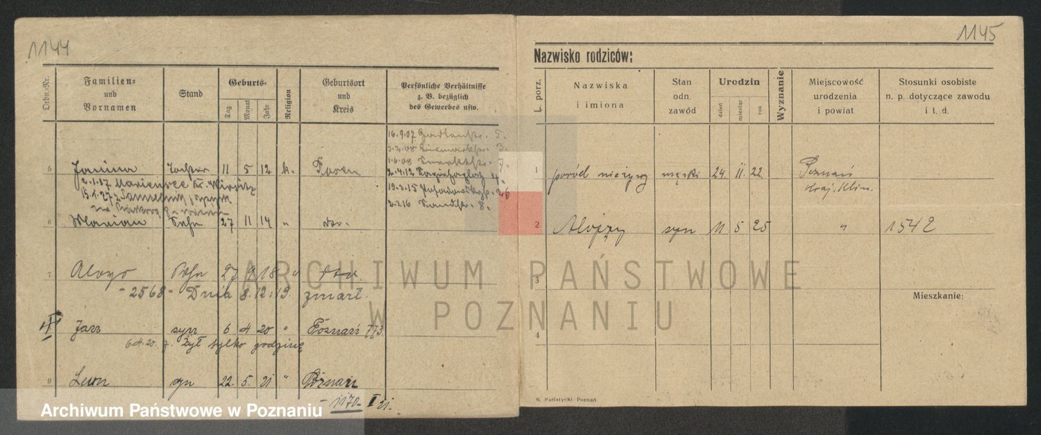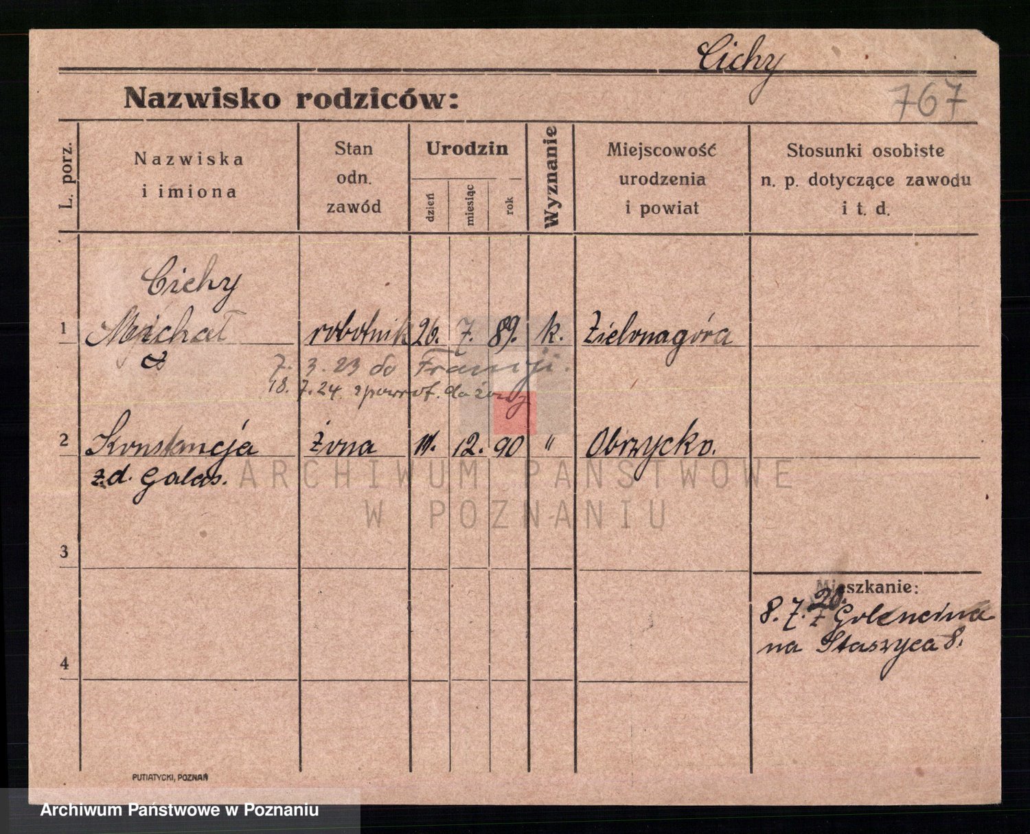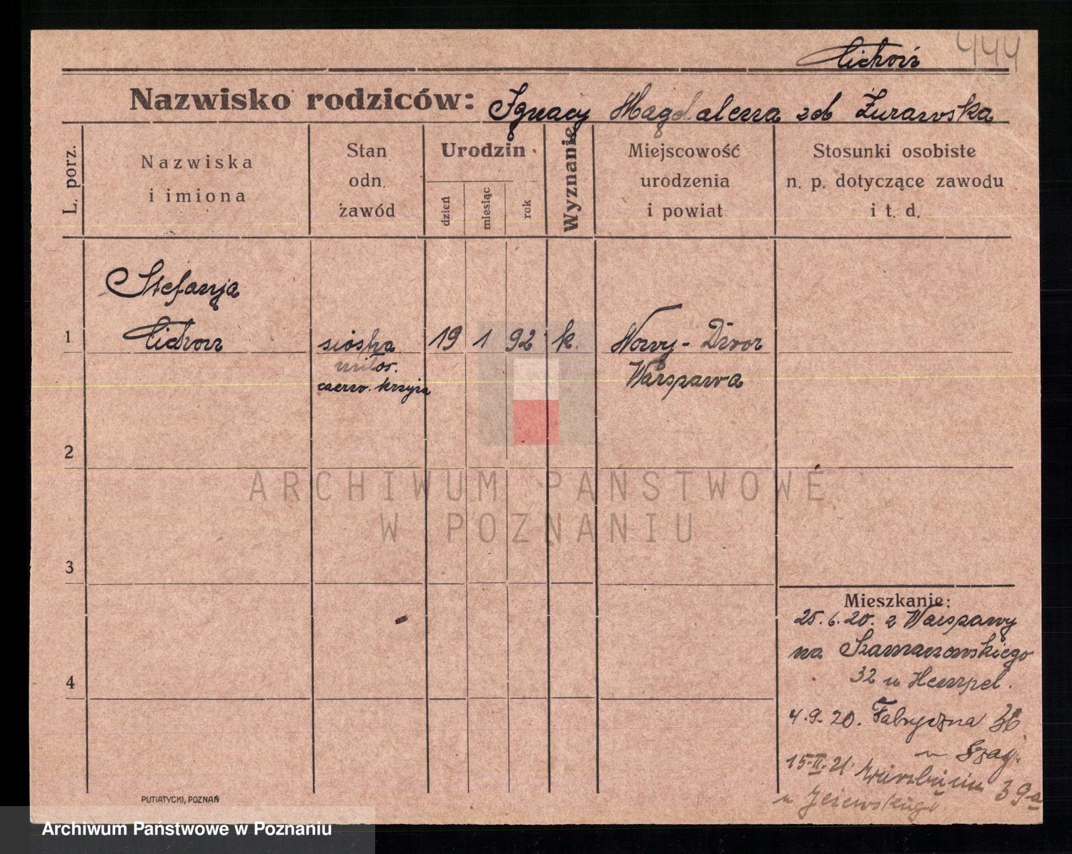 Podgląd karty osobowej dostępny jest po kliknięciu na nazwisko lub ikonkę karty. Można dokonywać powiększenia (ikony na górze) lub przechodzić między kolejnymi skanami (strzałki po bokach).