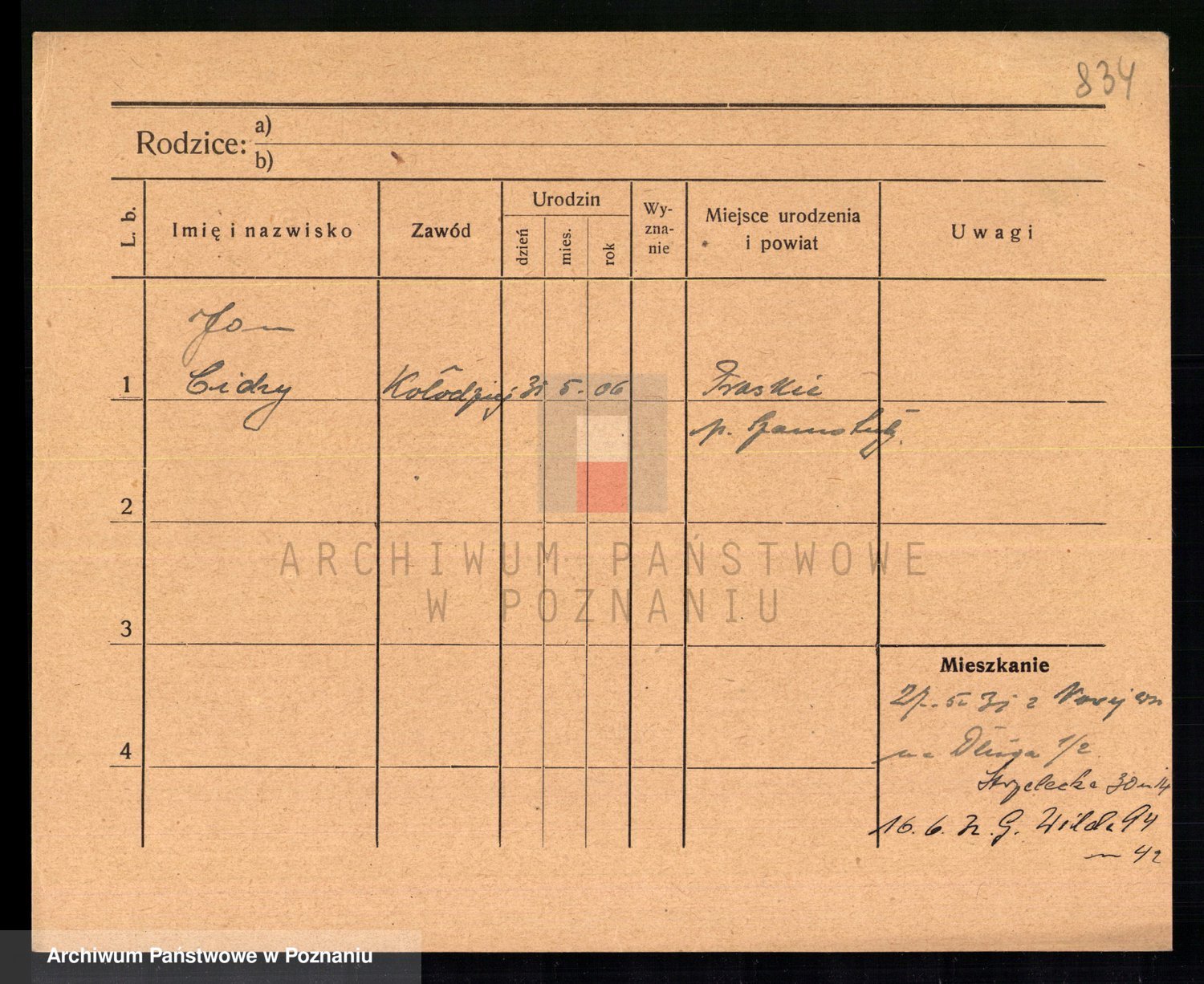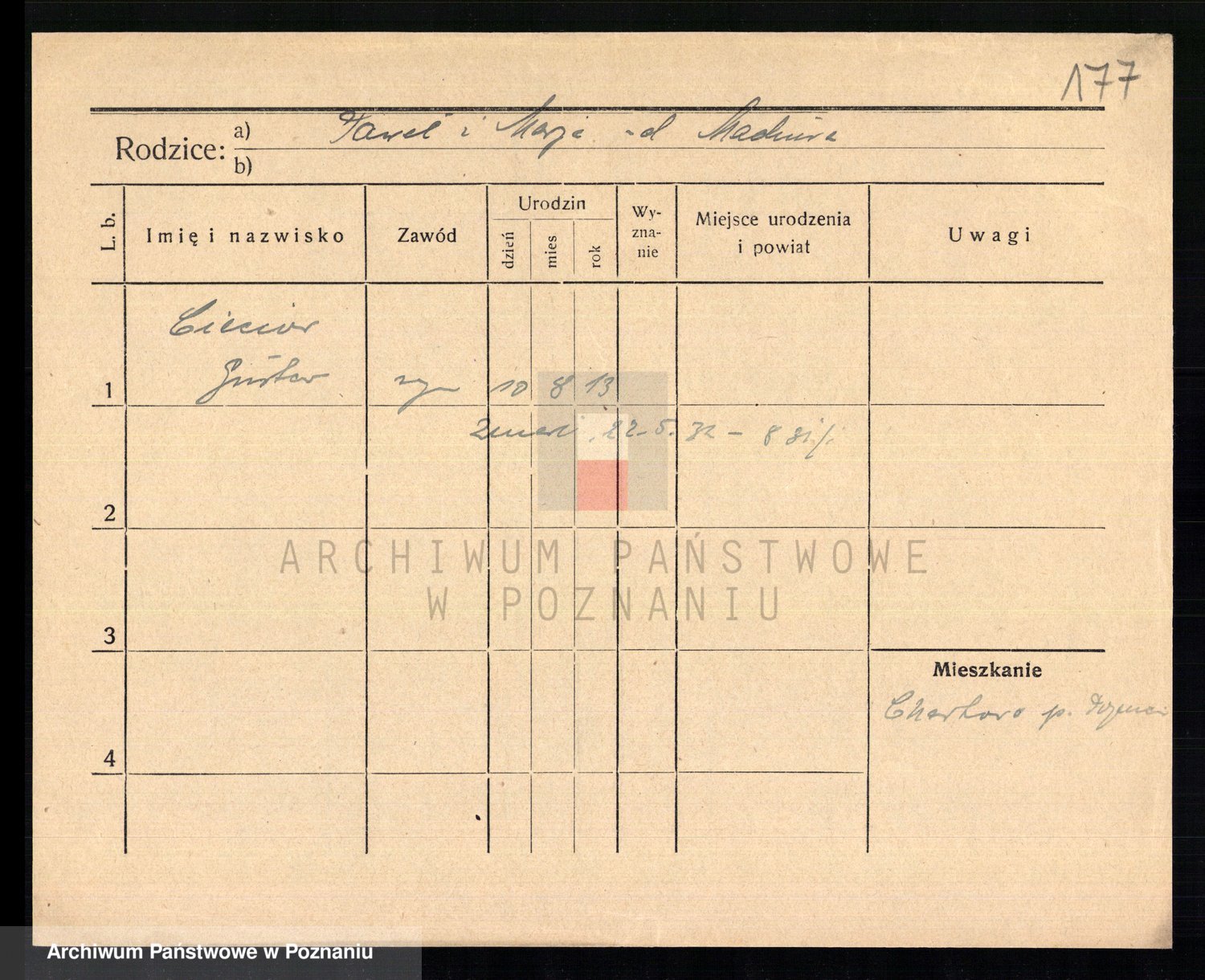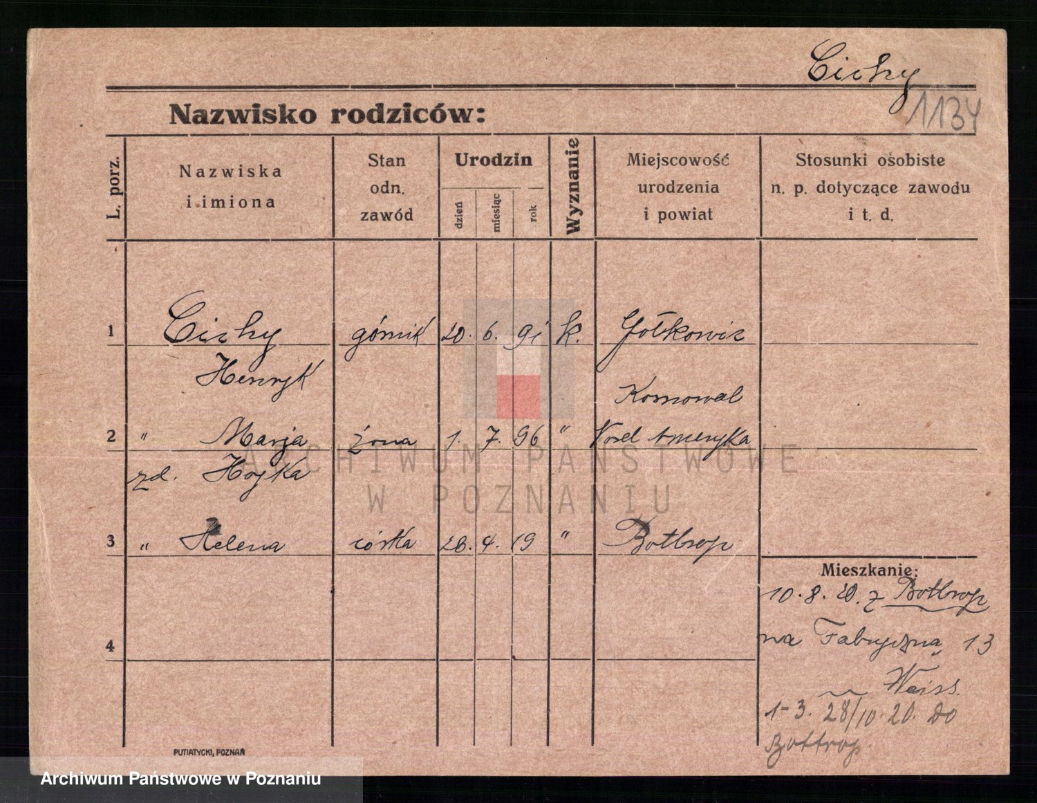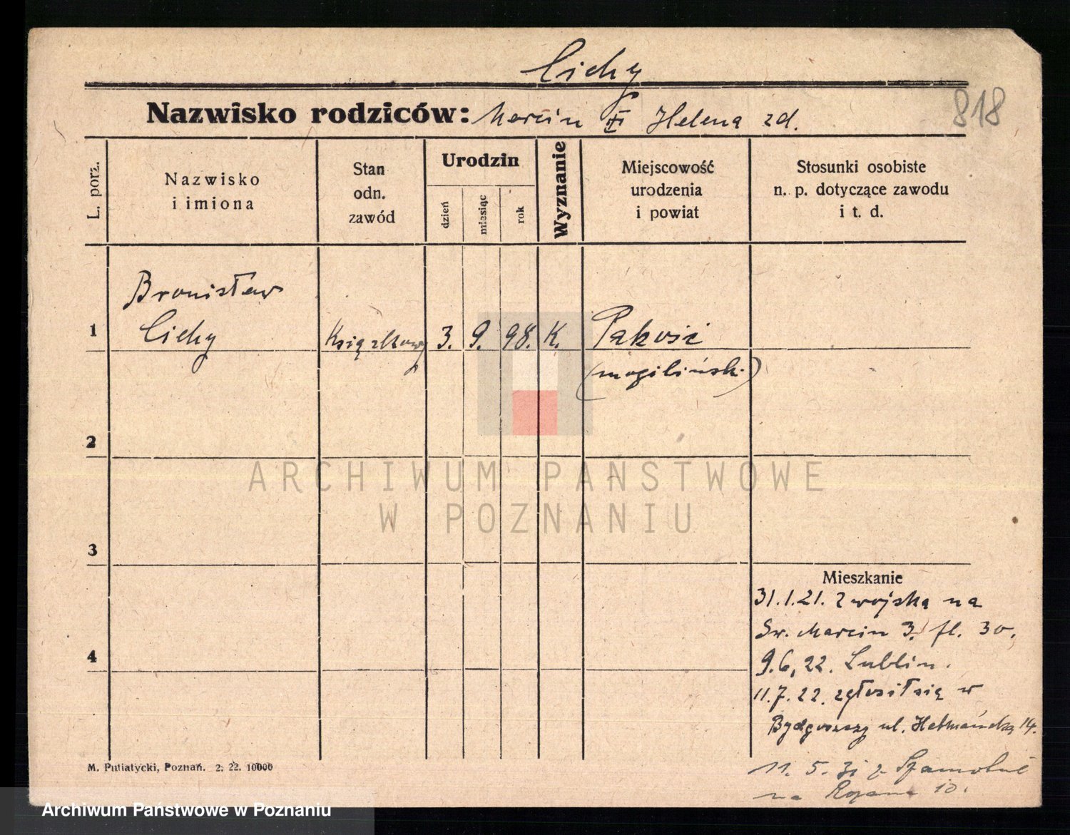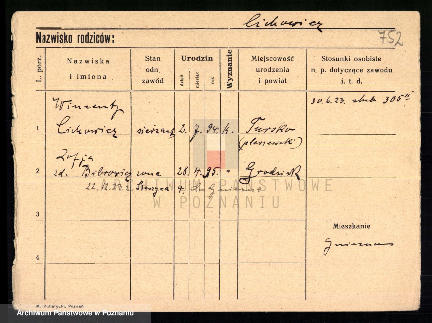 Podgląd karty osobowej dostępny jest po kliknięciu na nazwisko lub ikonkę karty. Można dokonywać powiększenia (ikony na górze) lub przechodzić między kolejnymi skanami (strzałki po bokach).