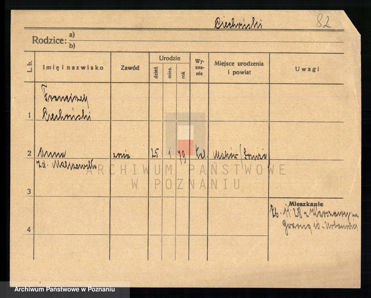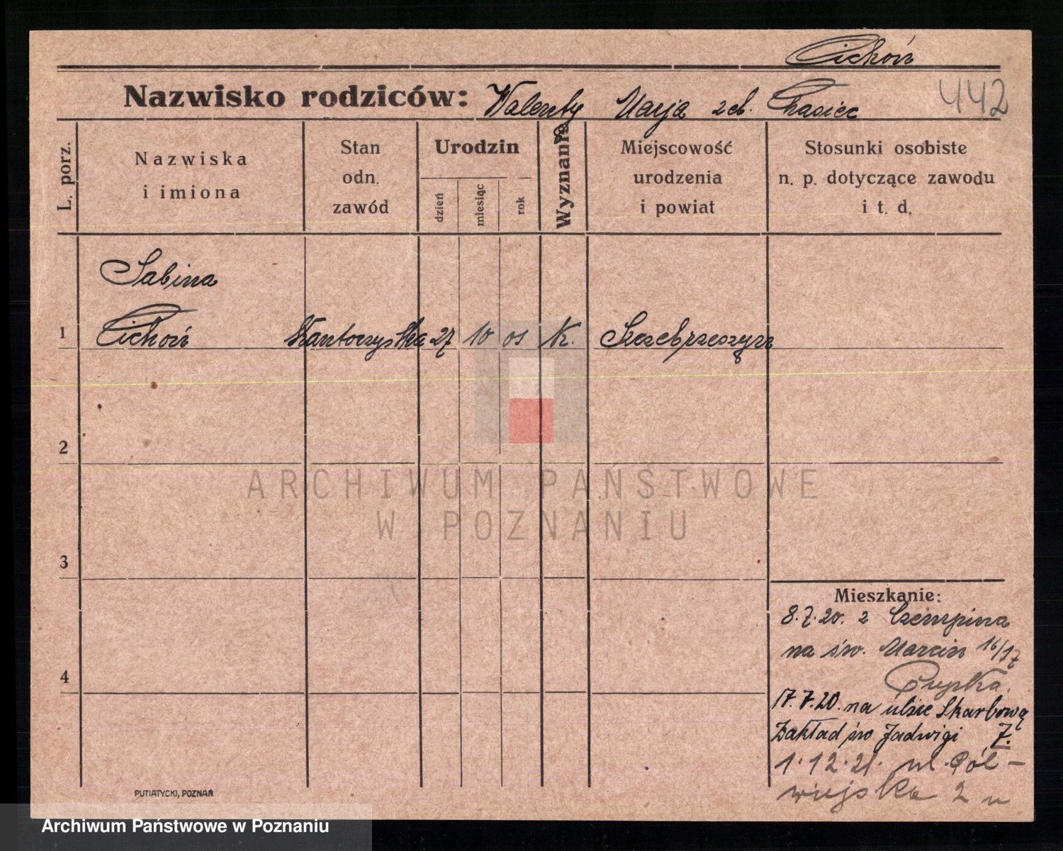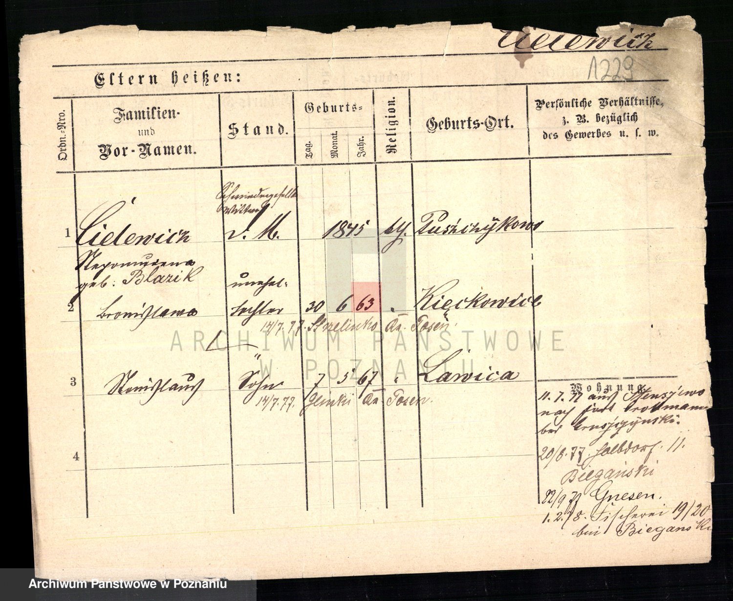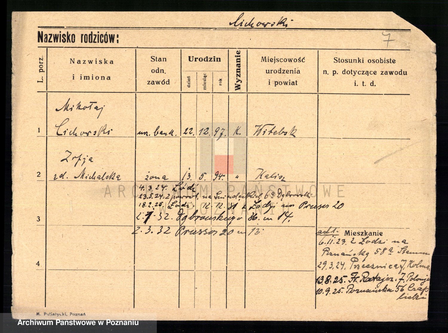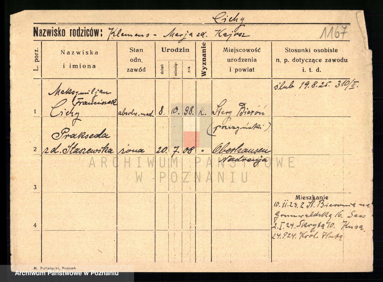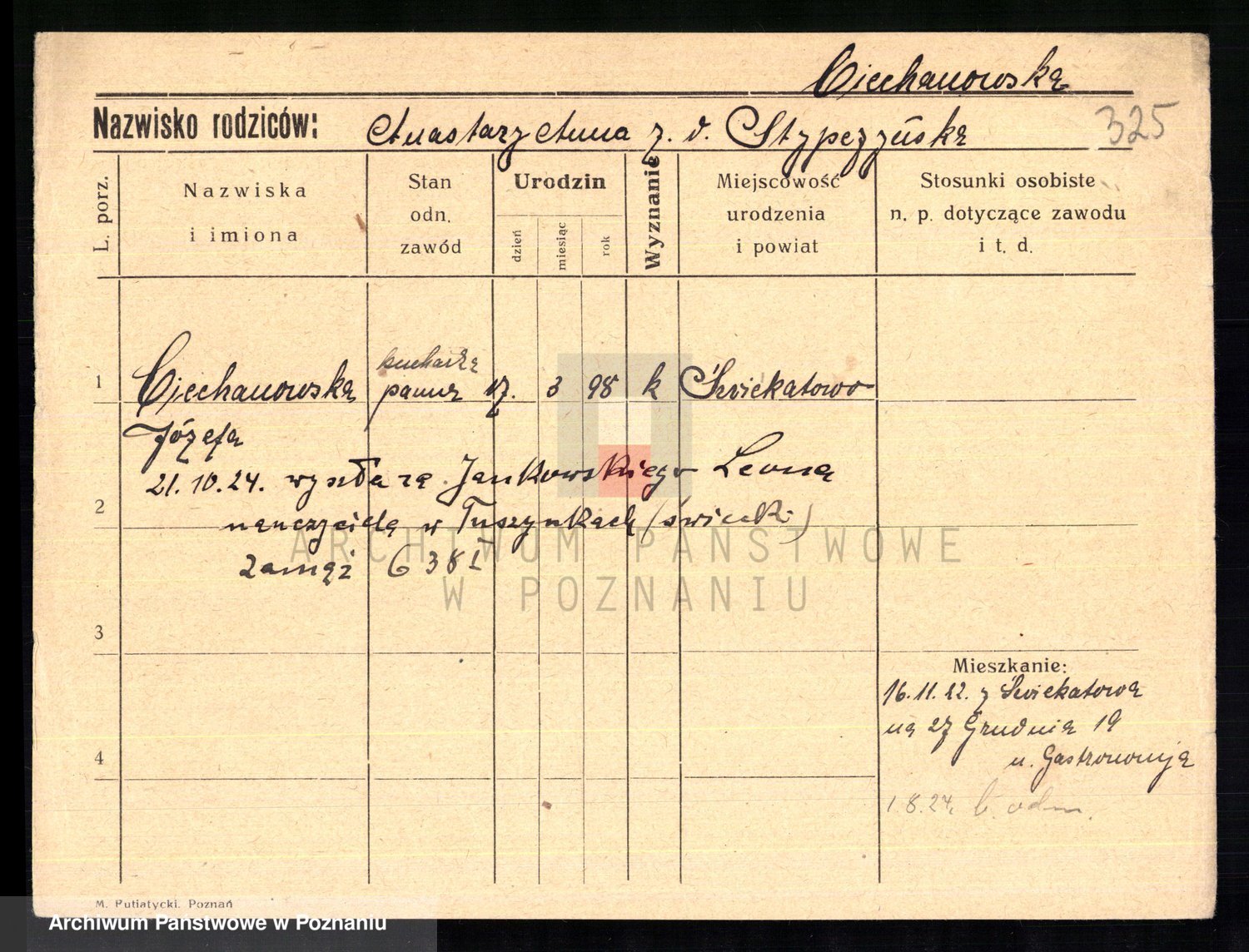 Podgląd karty osobowej dostępny jest po kliknięciu na nazwisko lub ikonkę karty. Można dokonywać powiększenia (ikony na górze) lub przechodzić między kolejnymi skanami (strzałki po bokach).